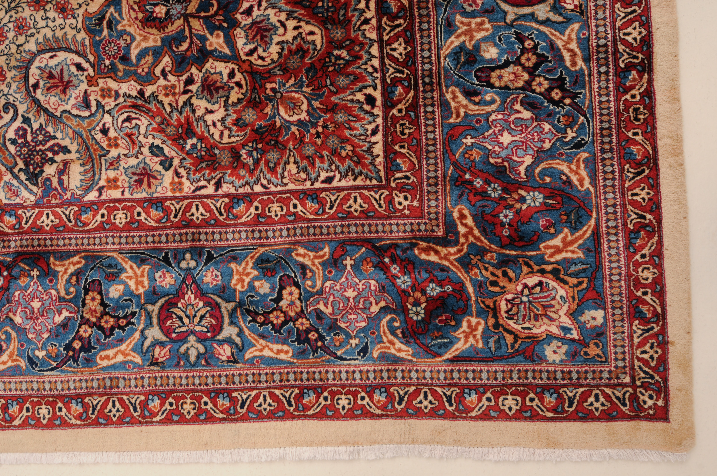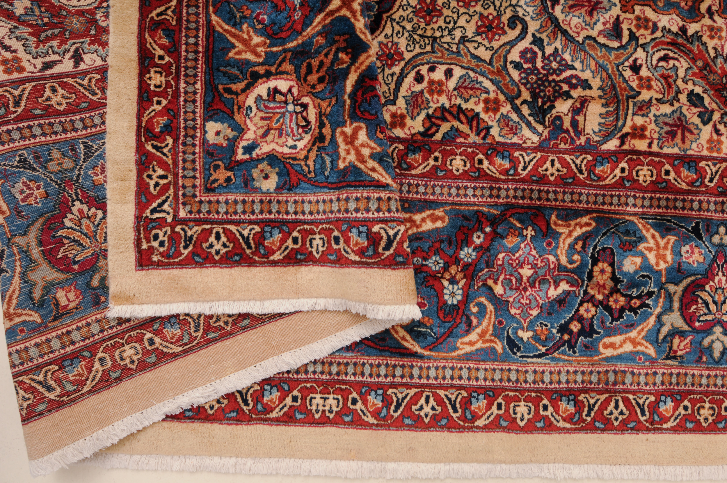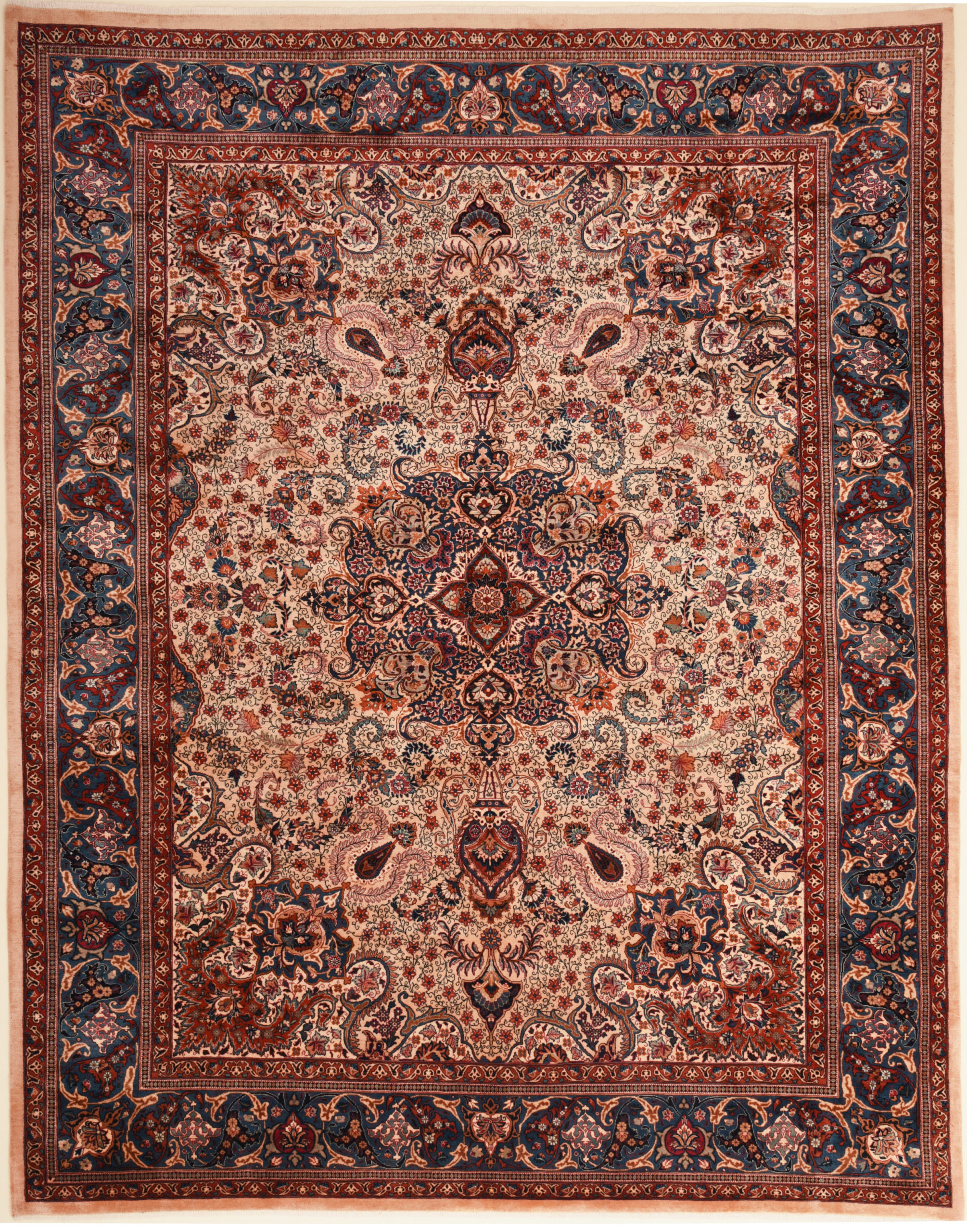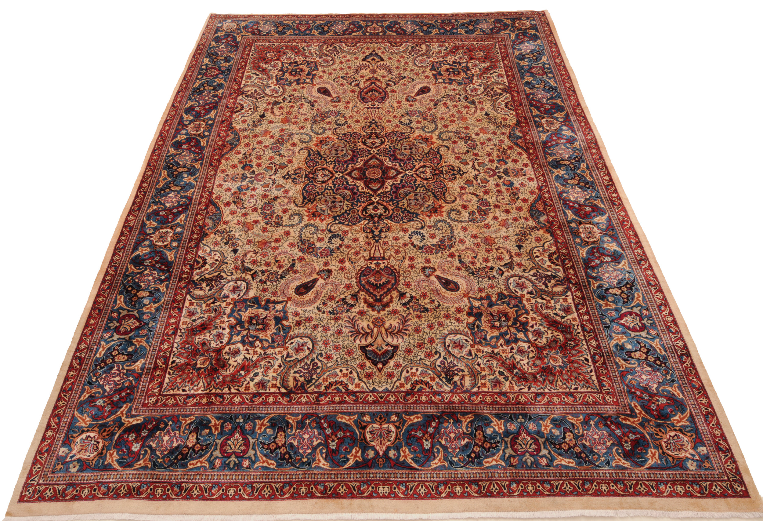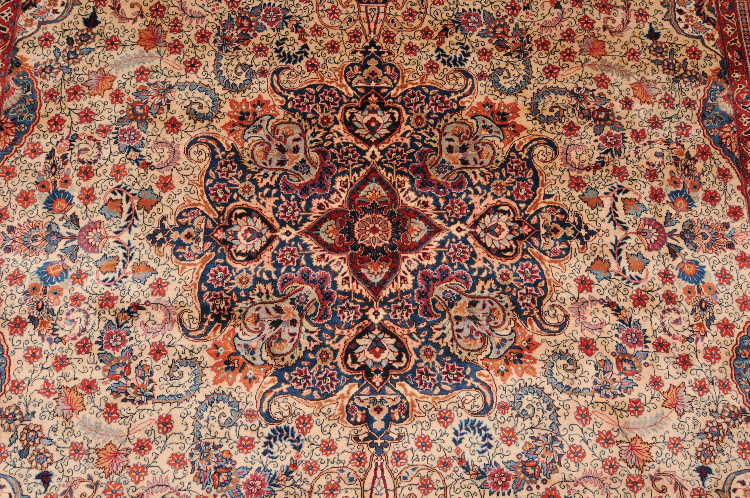 This Persian Rug is Hand Knotted with 100% Wool Pile and Cotton Foundation. This Rug has a Floral Design and its Main colors are Beige, Orange, Blue.