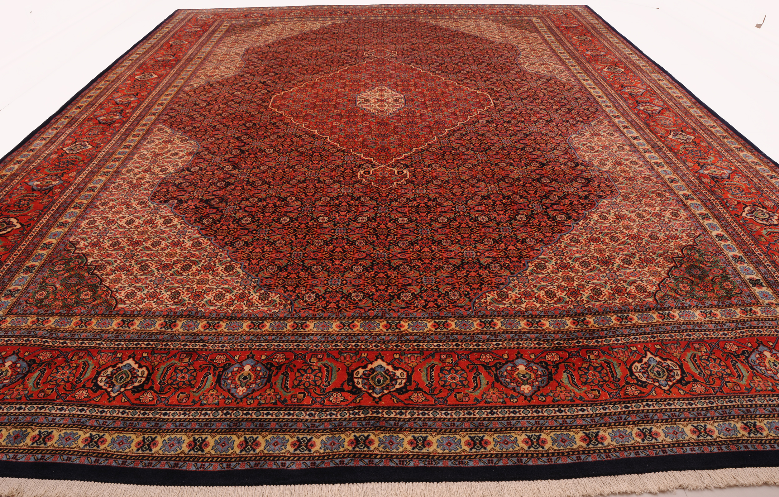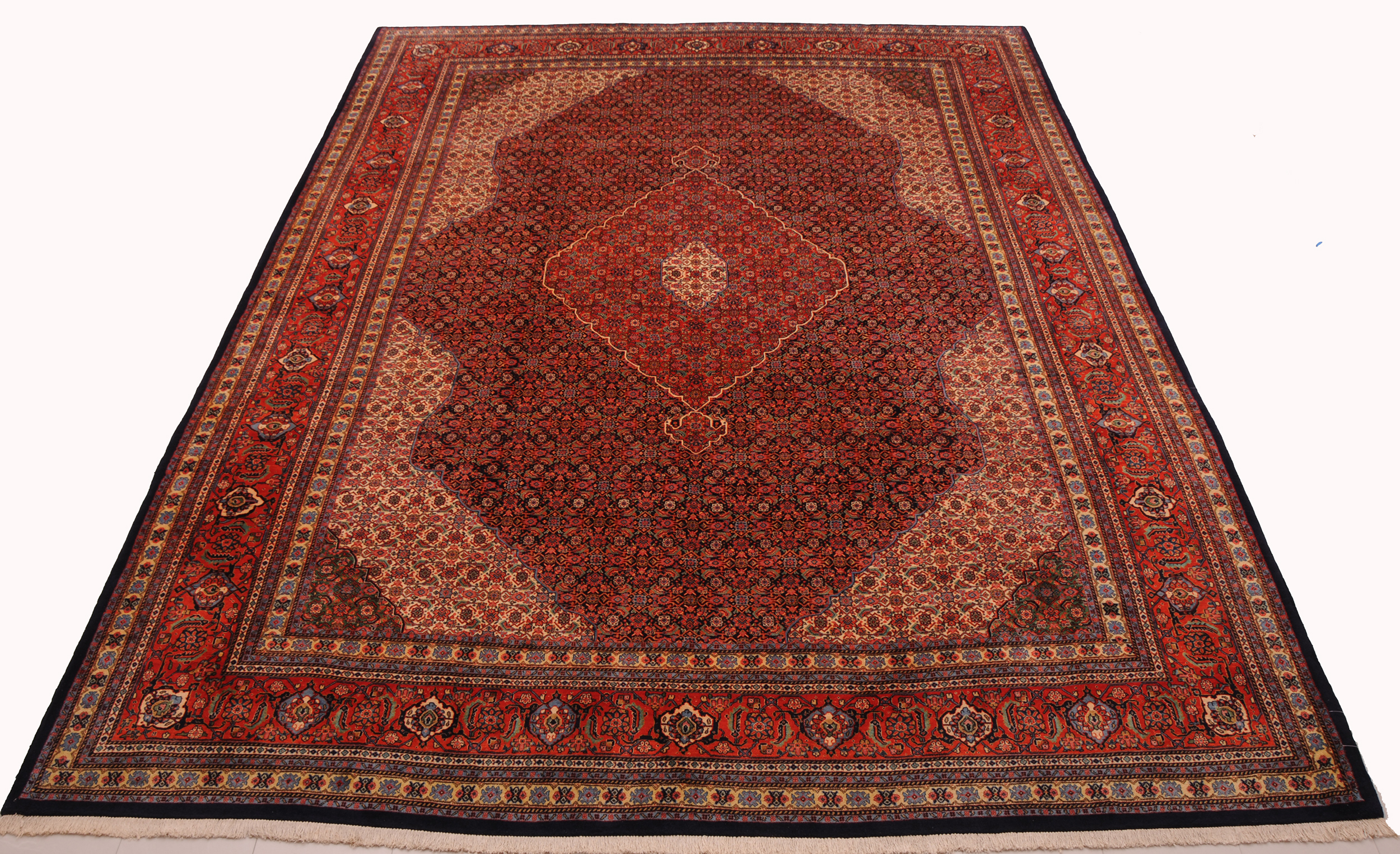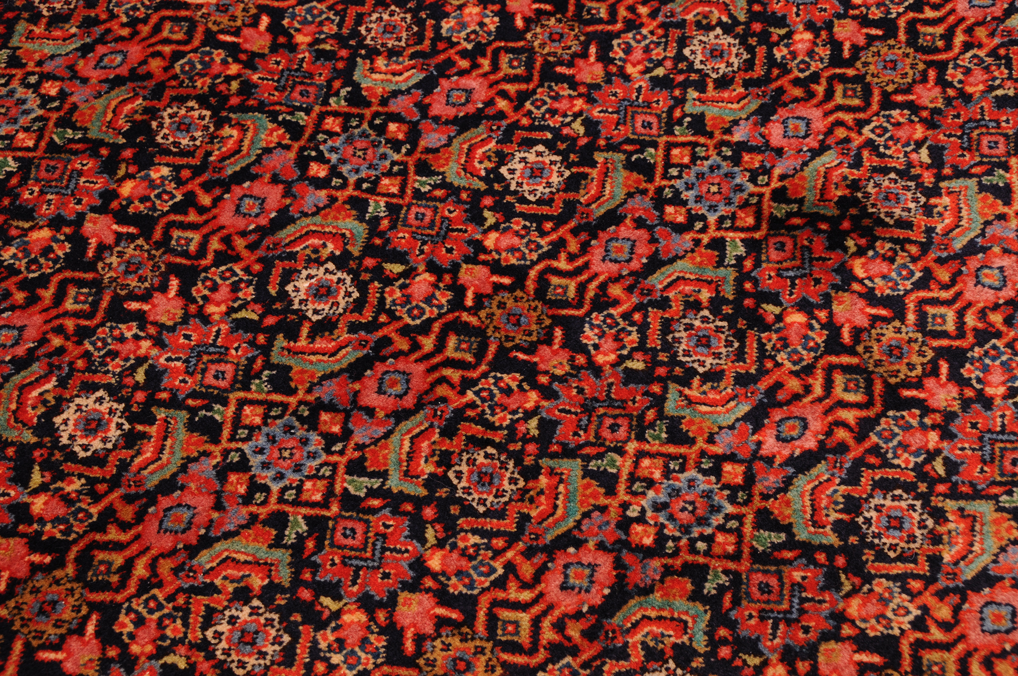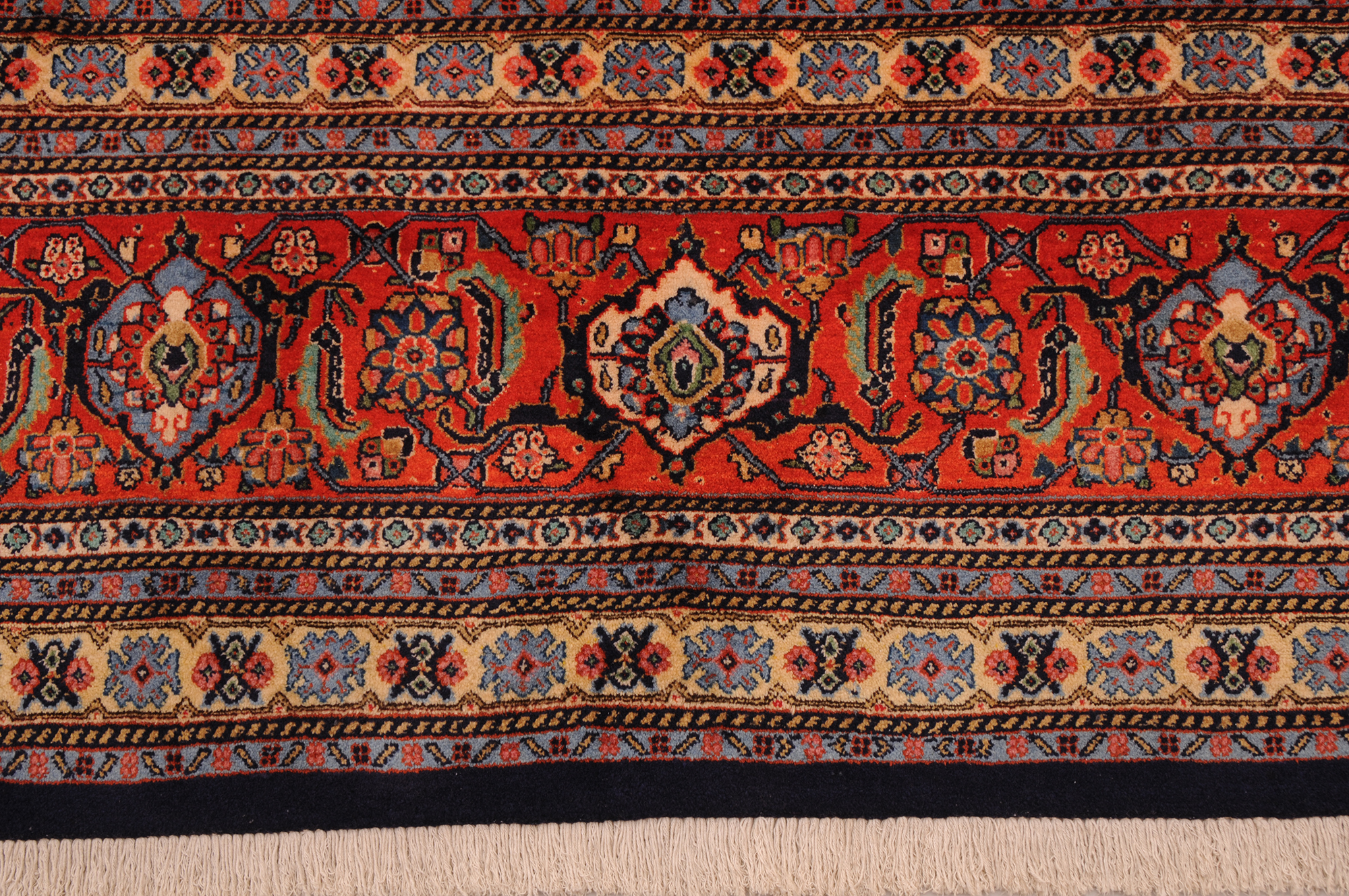 This Persian Rug is Hand Knotted with 100% Wool Pile and Cotton Foundation. This Rug has a HERATI Design and its Main colors are Navy, Red, and Beige.