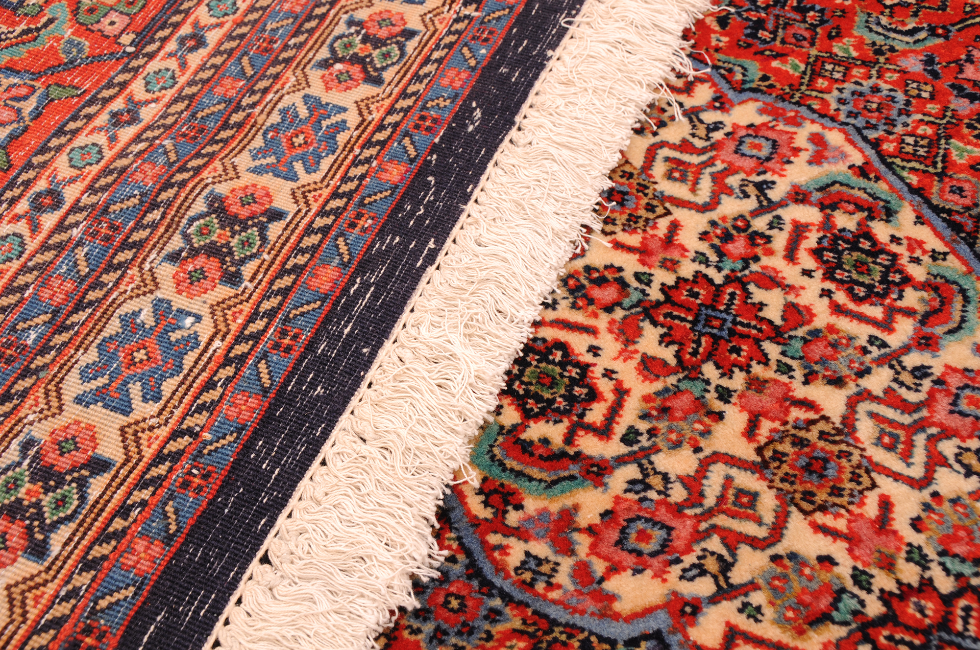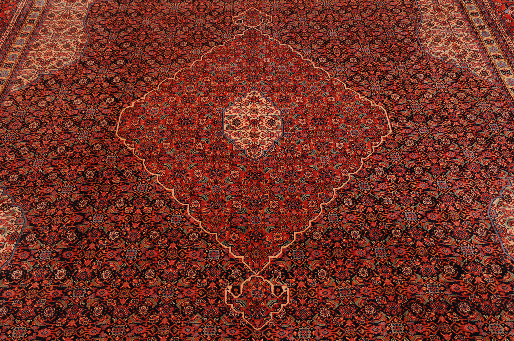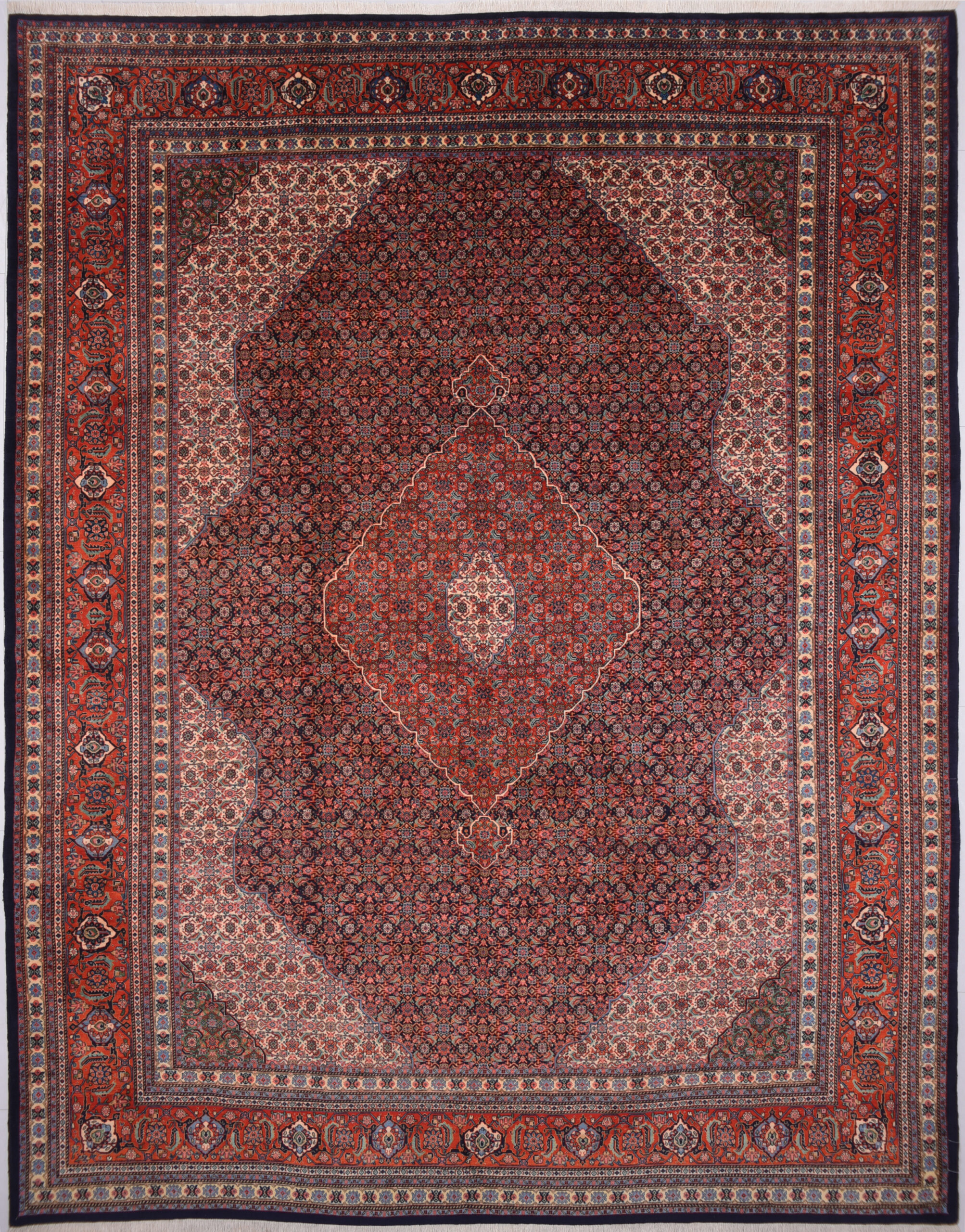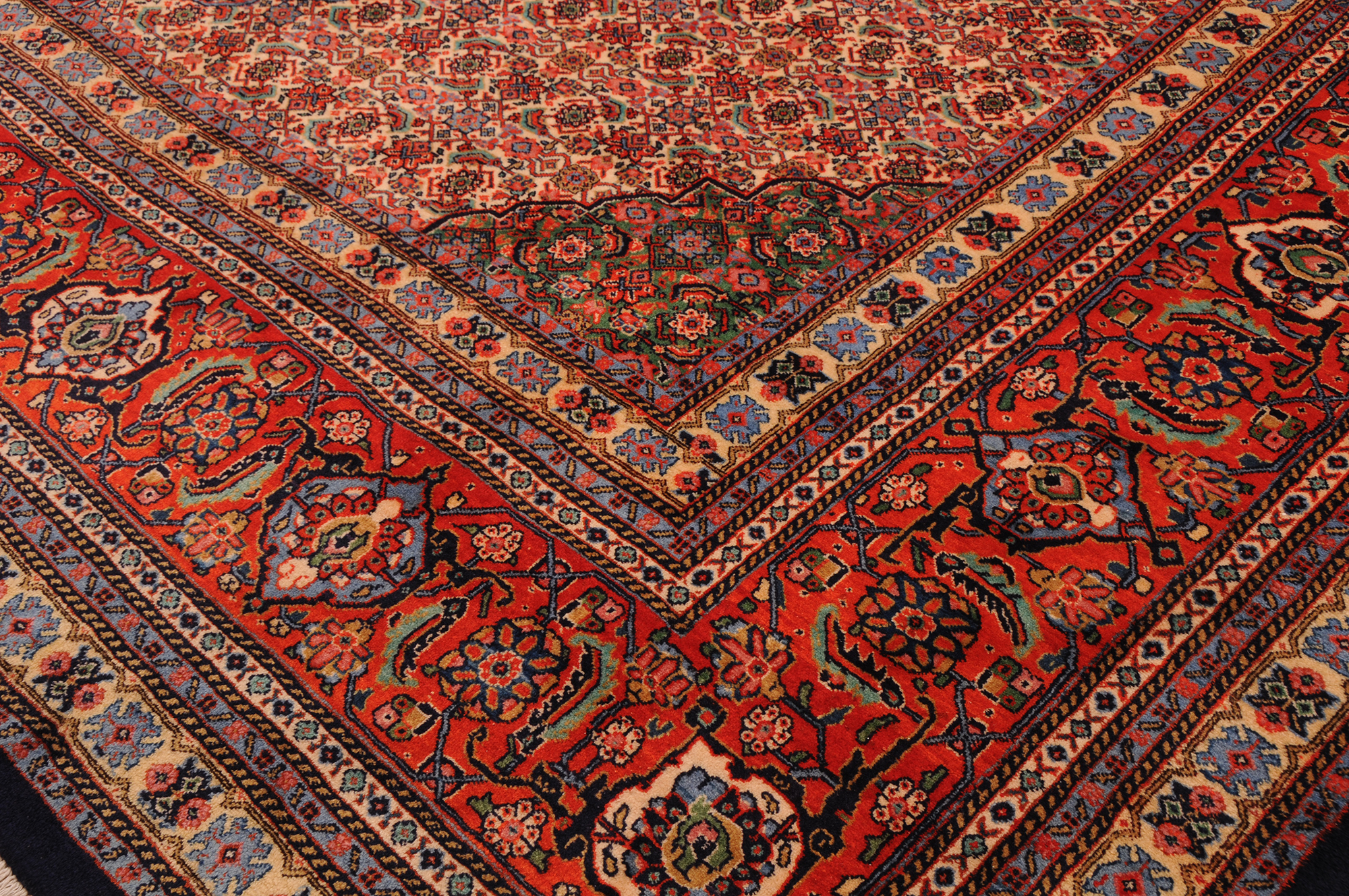 This Persian Rug is Hand Knotted with 100% Wool Pile and Cotton Foundation. This Rug has a HERATI Design and its Main colors are Navy, Red, and Beige.