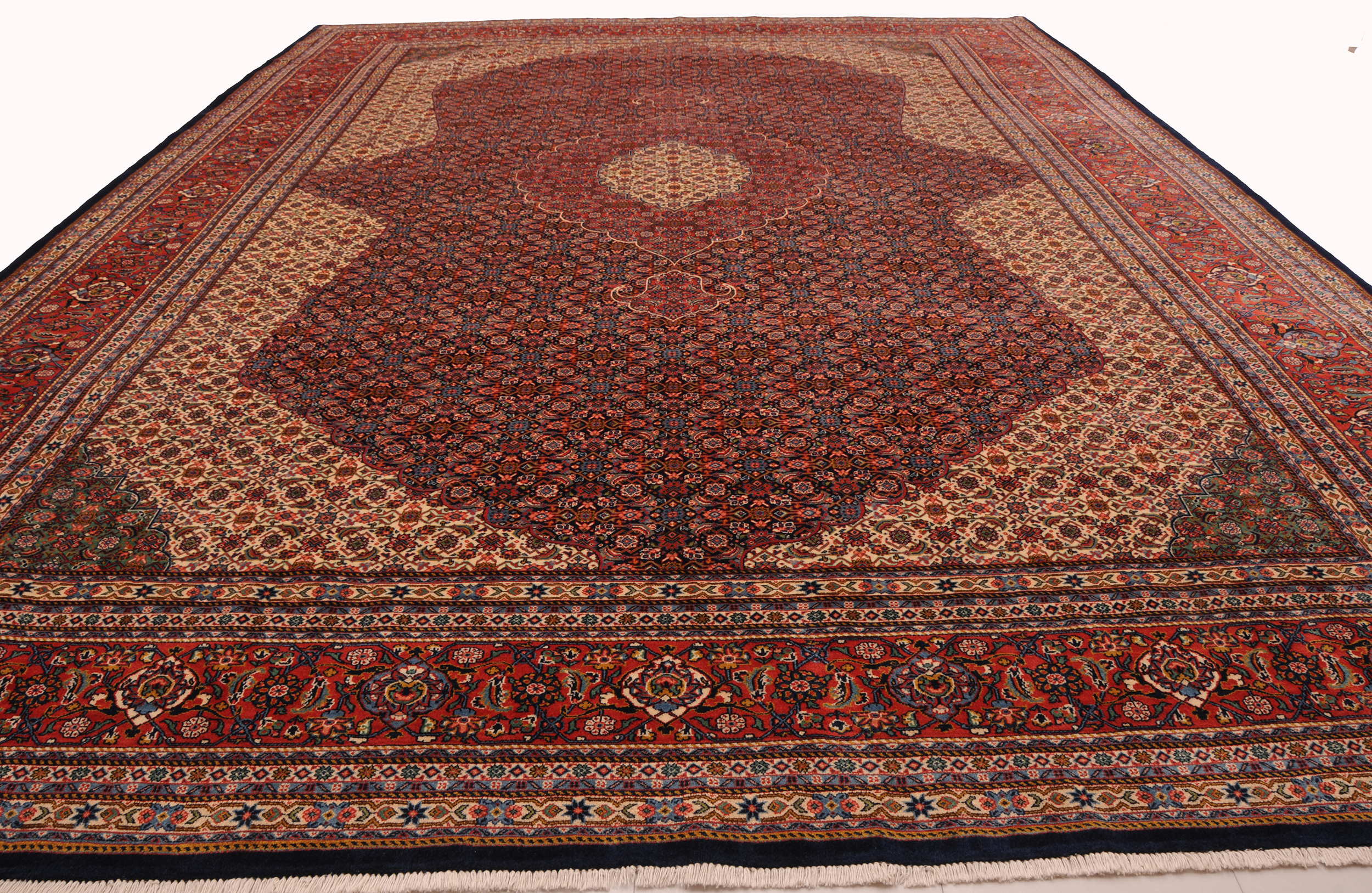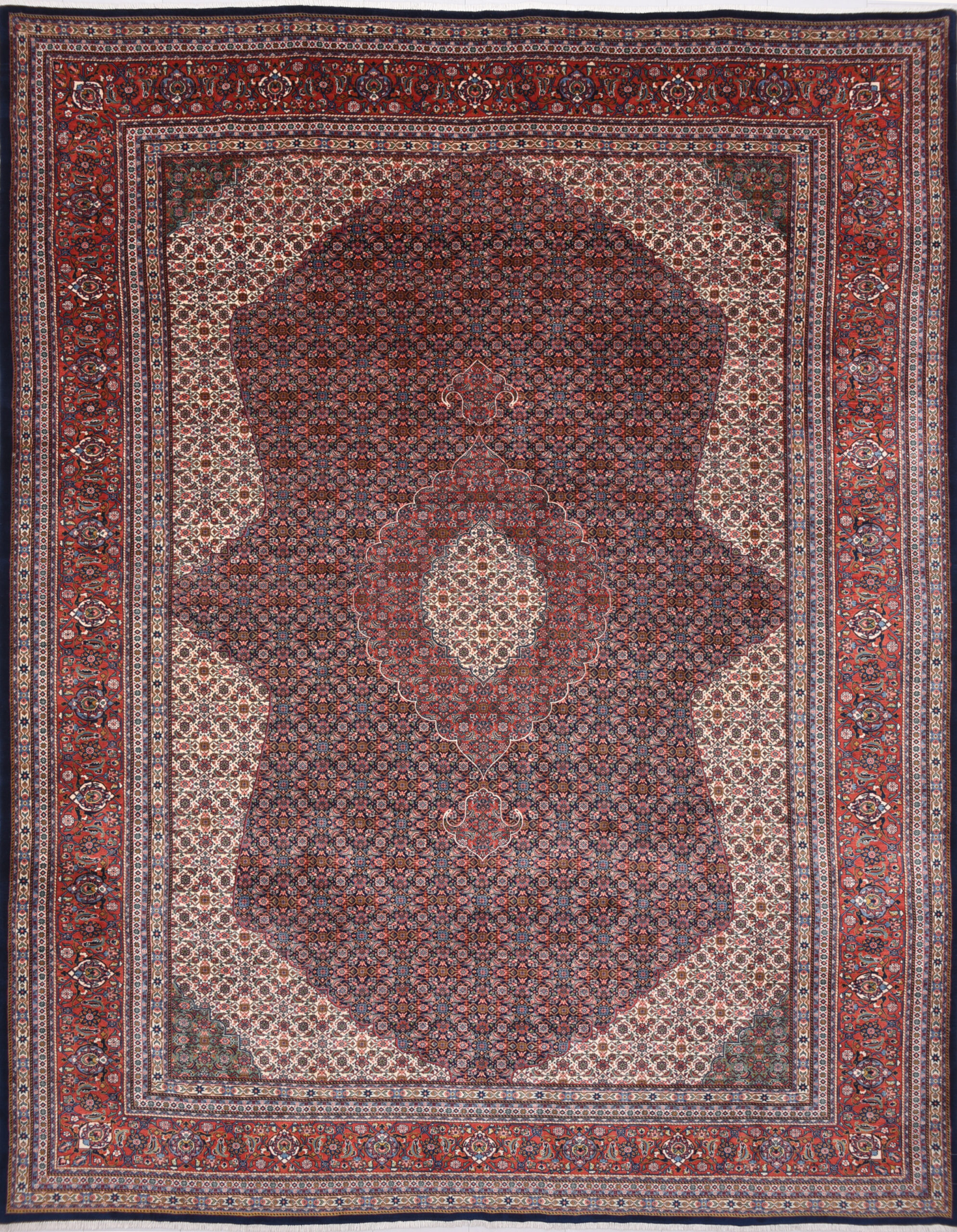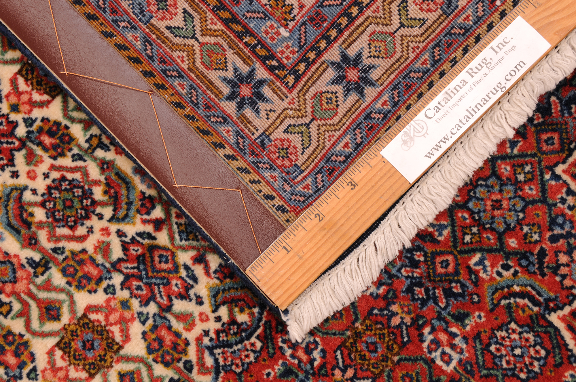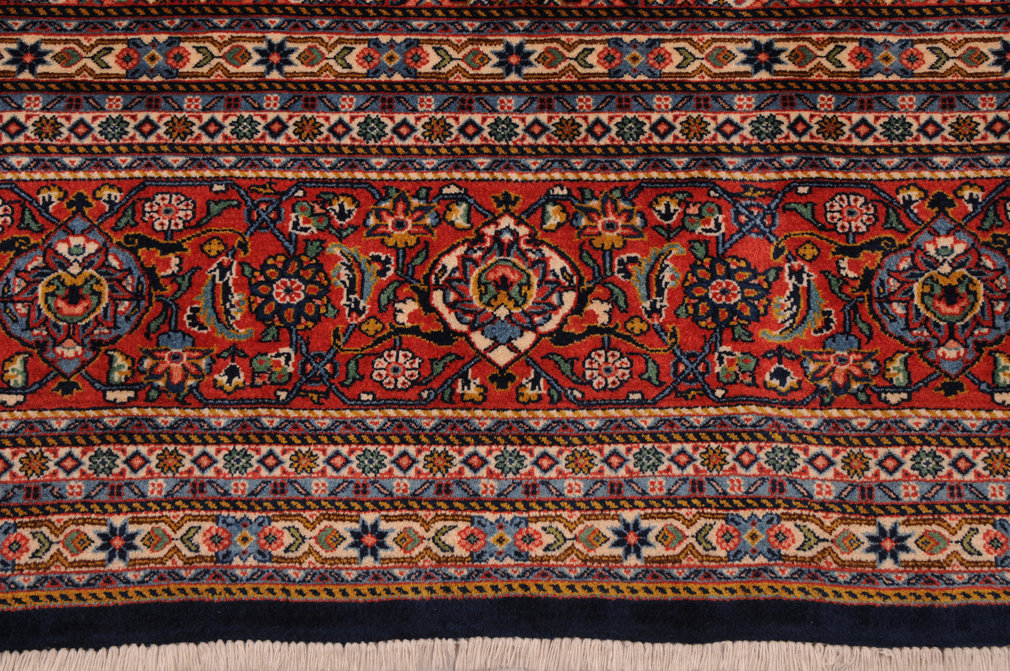 This Persian Rug is Hand Knotted with 100% Wool Pile and Cotton Foundation. This Rug has a HERATI Design and its Main colors are Navy, Cream, and Red.