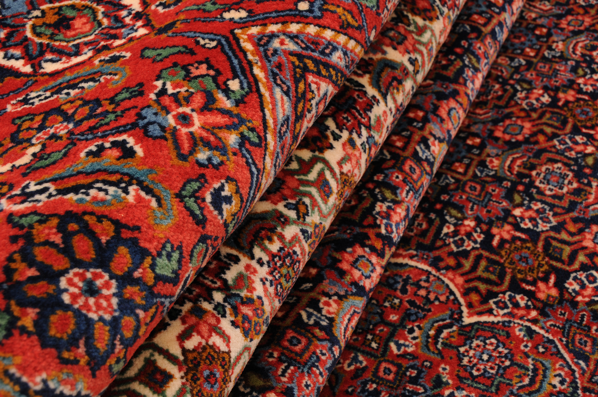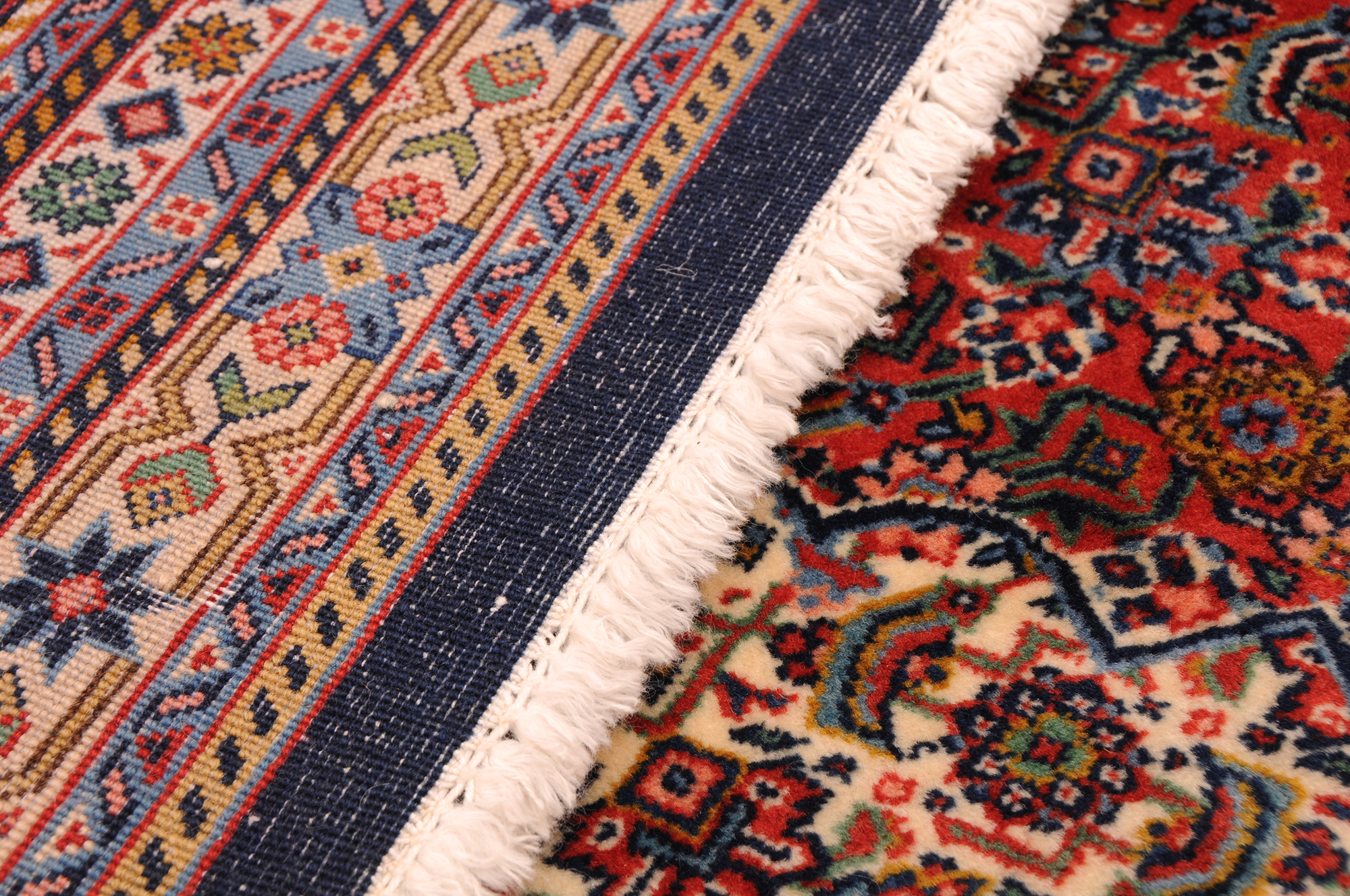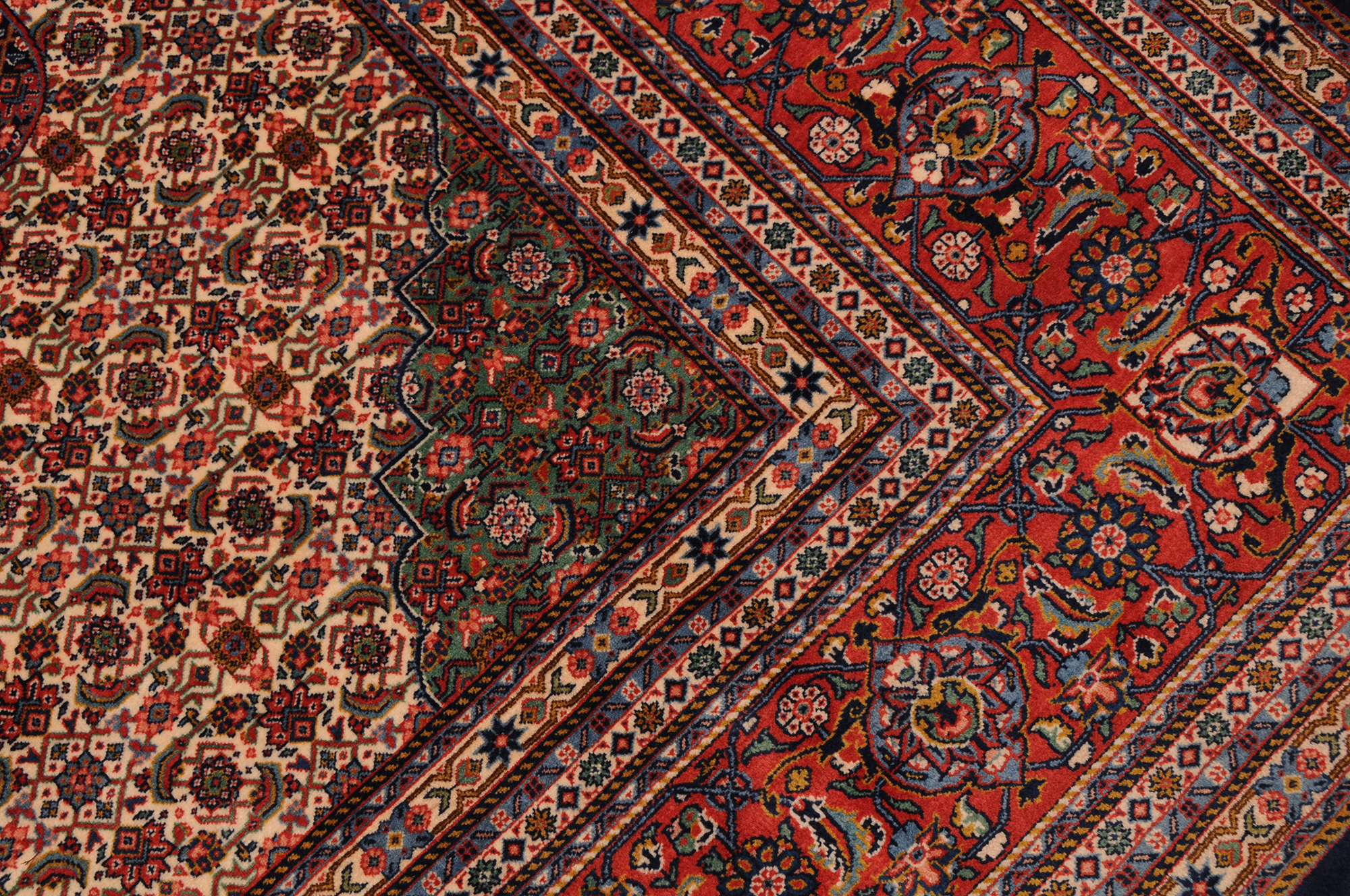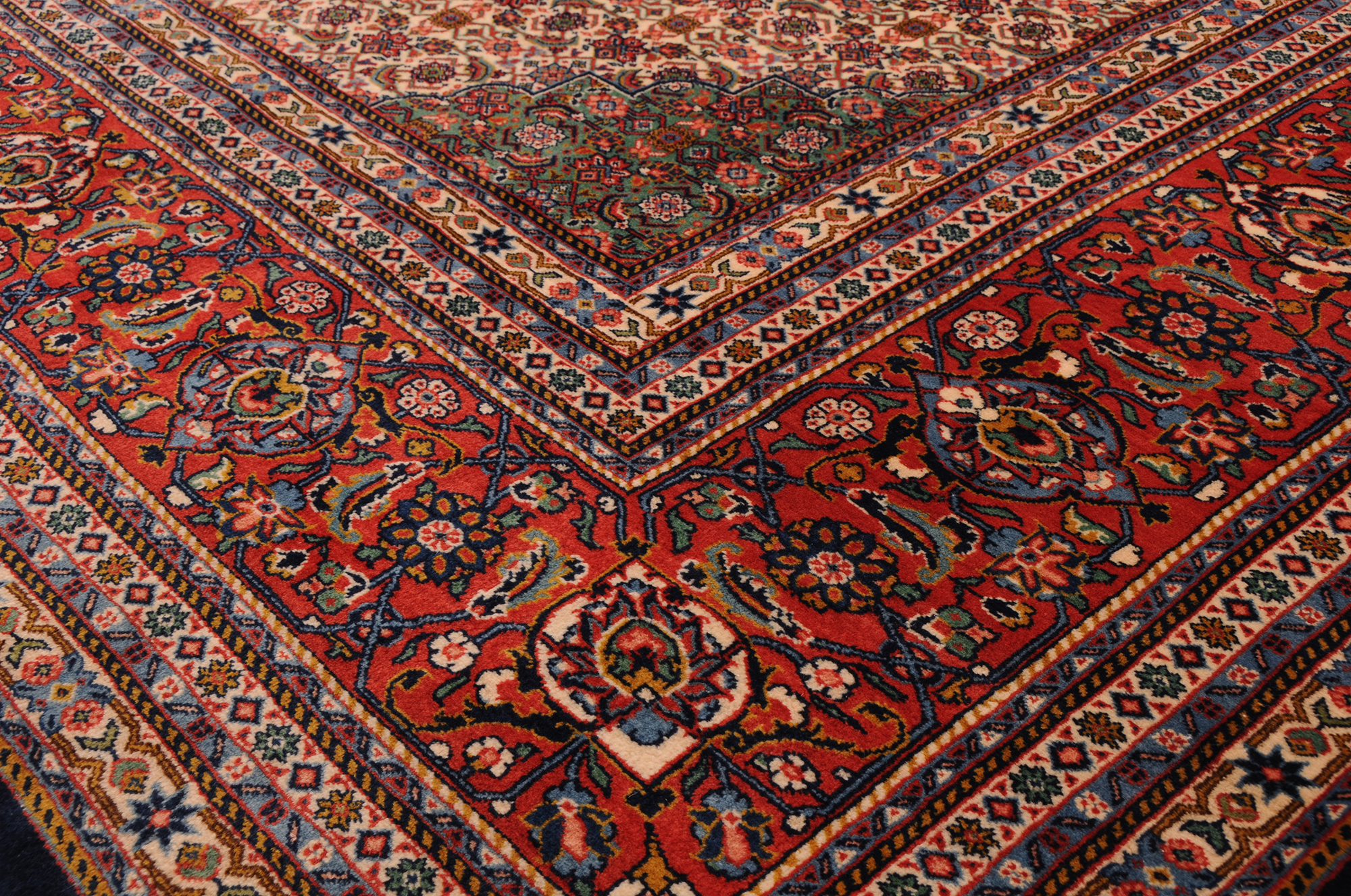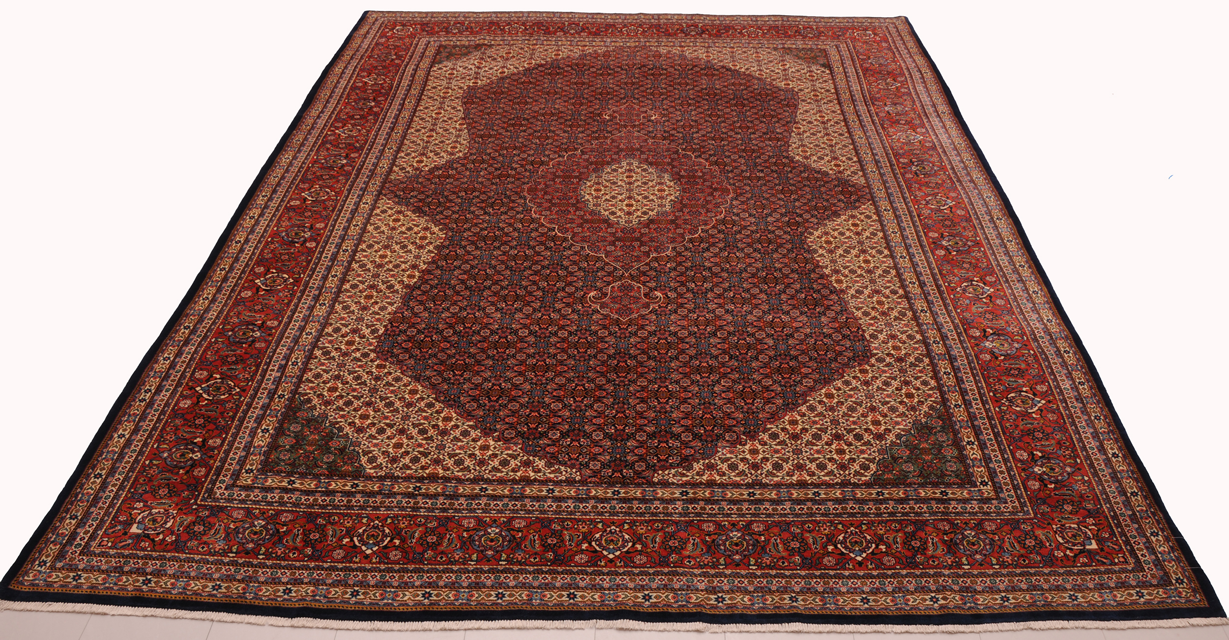 This Persian Rug is Hand Knotted with 100% Wool Pile and Cotton Foundation. This Rug has a HERATI Design and its Main colors are Navy, Cream, and Red.