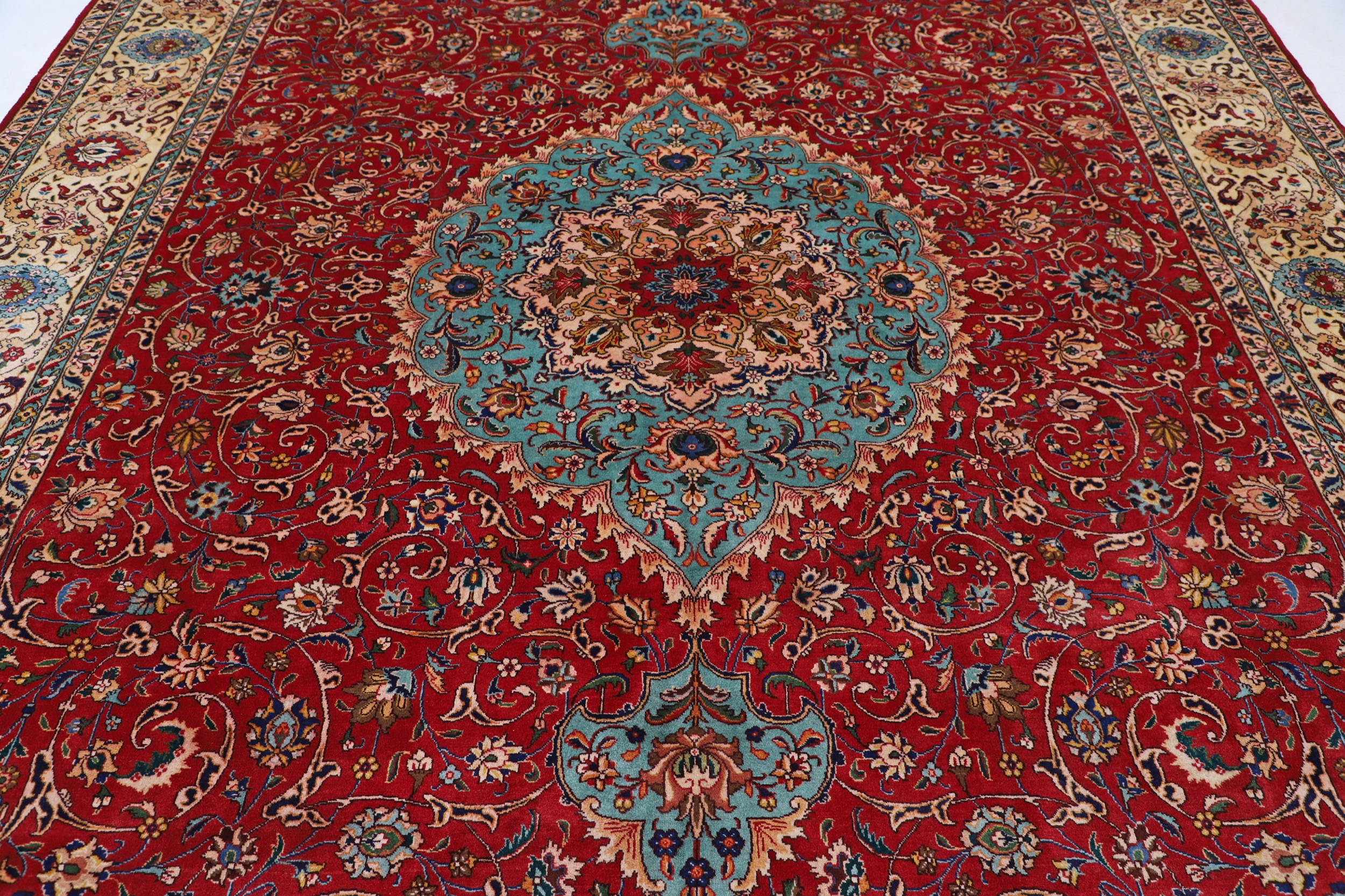 Hand Knotted Tabriz Persian Rug: This beautiful rug measures 10′ x 13’3″ and has an aged appearance of 30-40 years. Featuring a stunning red and beige floral design, it is meticulously crafted with a density of approximately 225 knots per square inch. Made from 100% wool and cotton, this rug has a medium pile height ranging from 1/3″ to 3/8″. Perfect for adding warmth and elegance to any space.