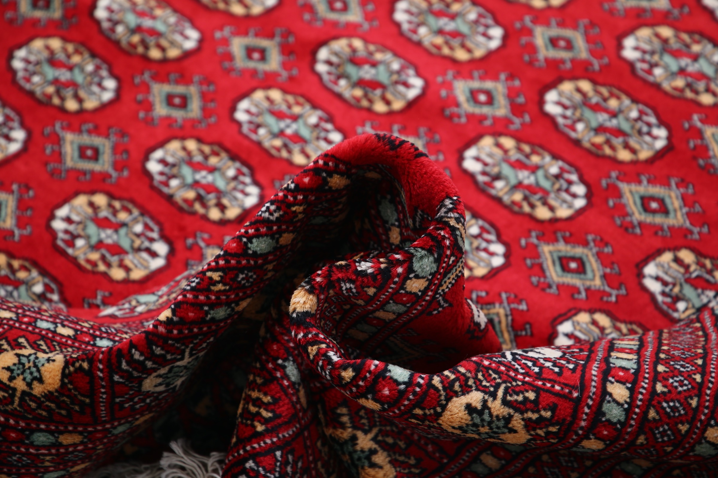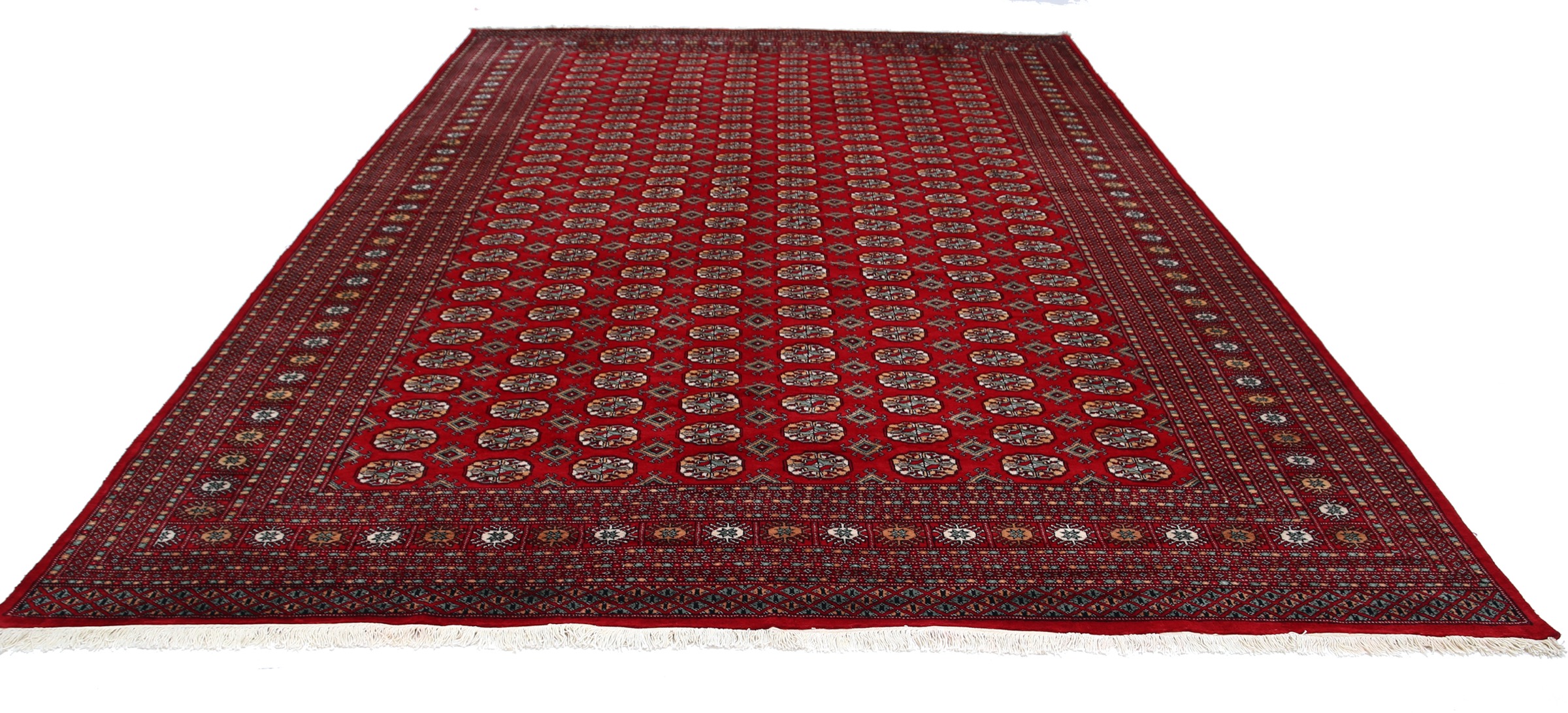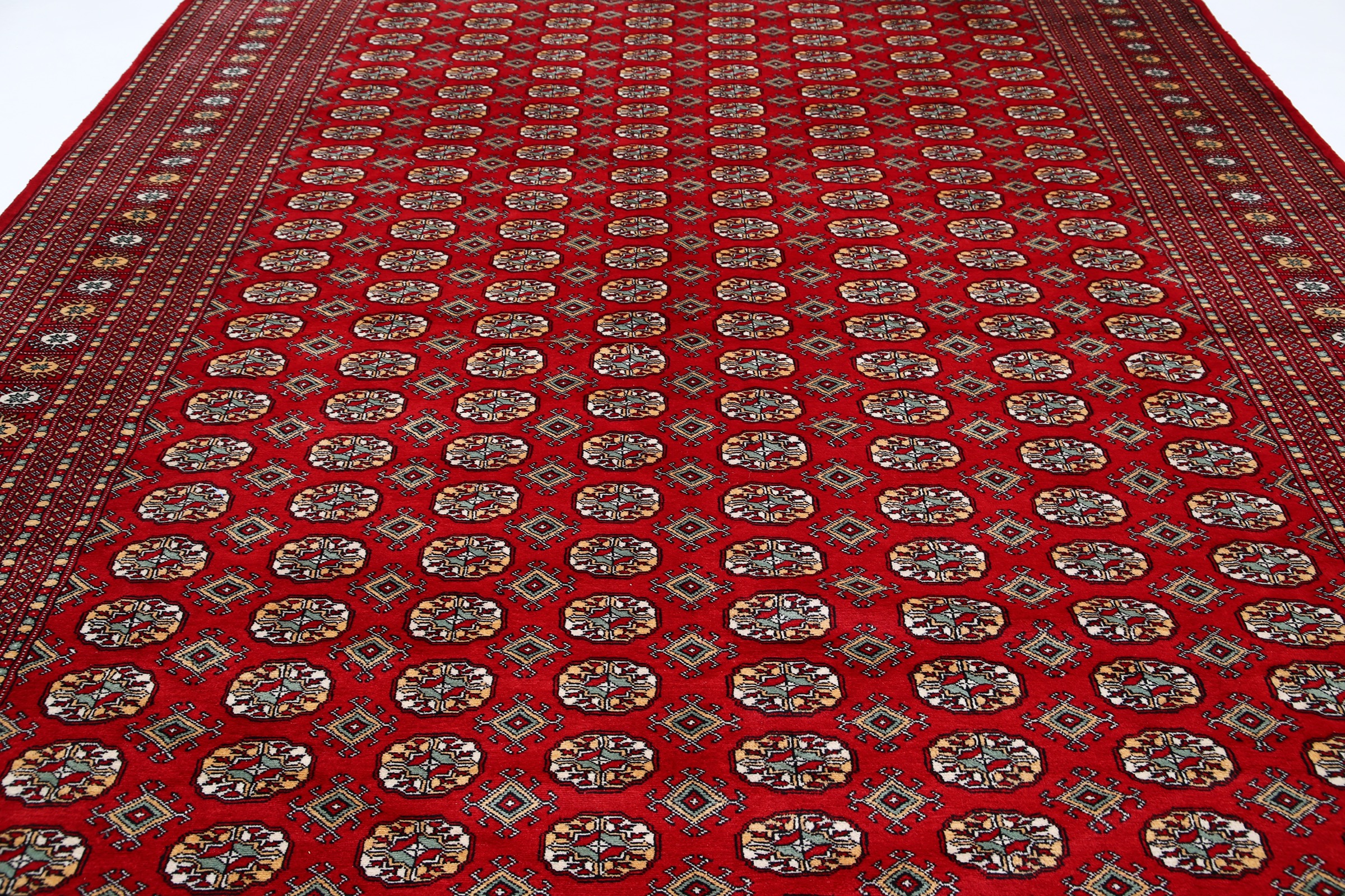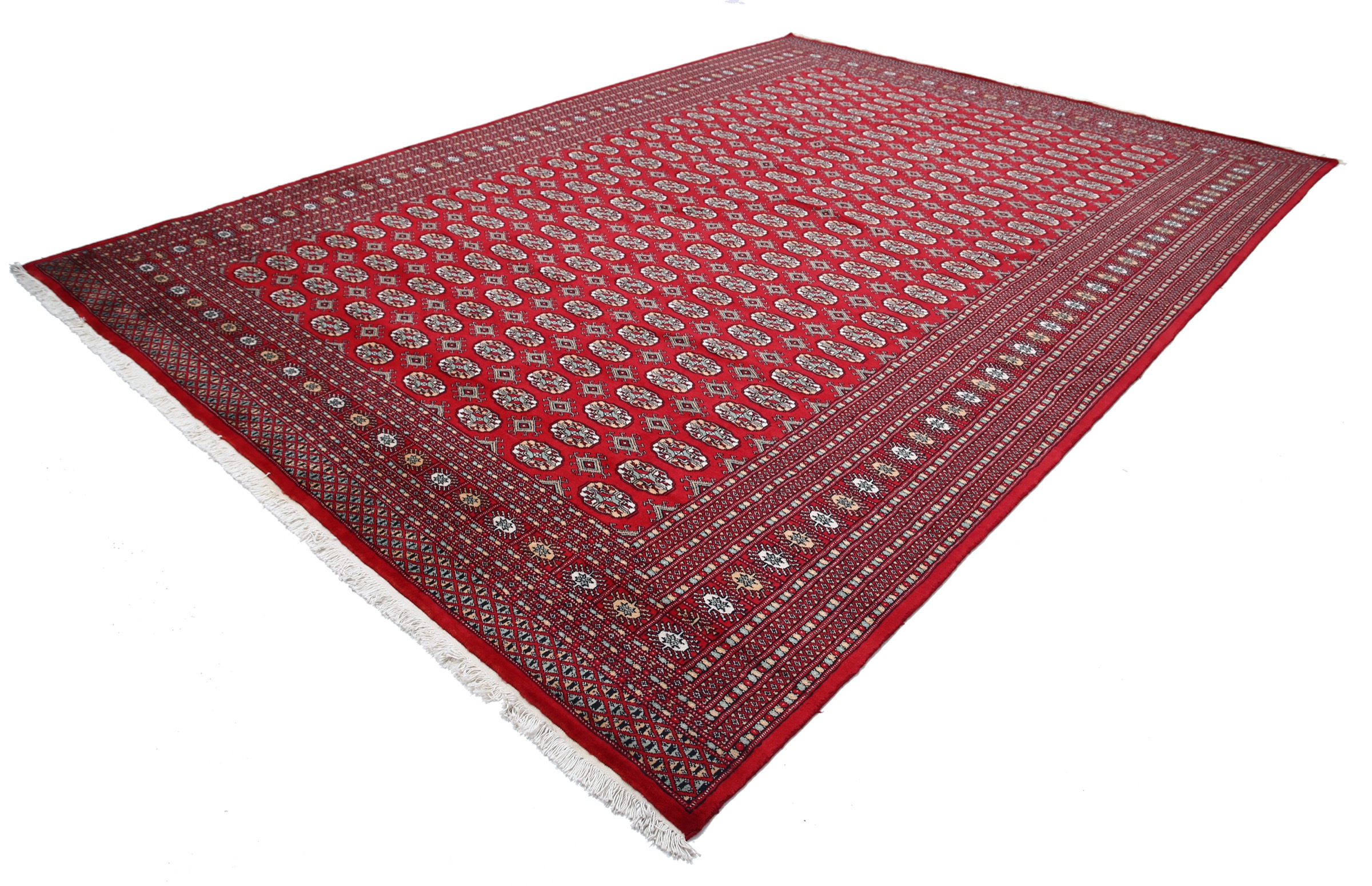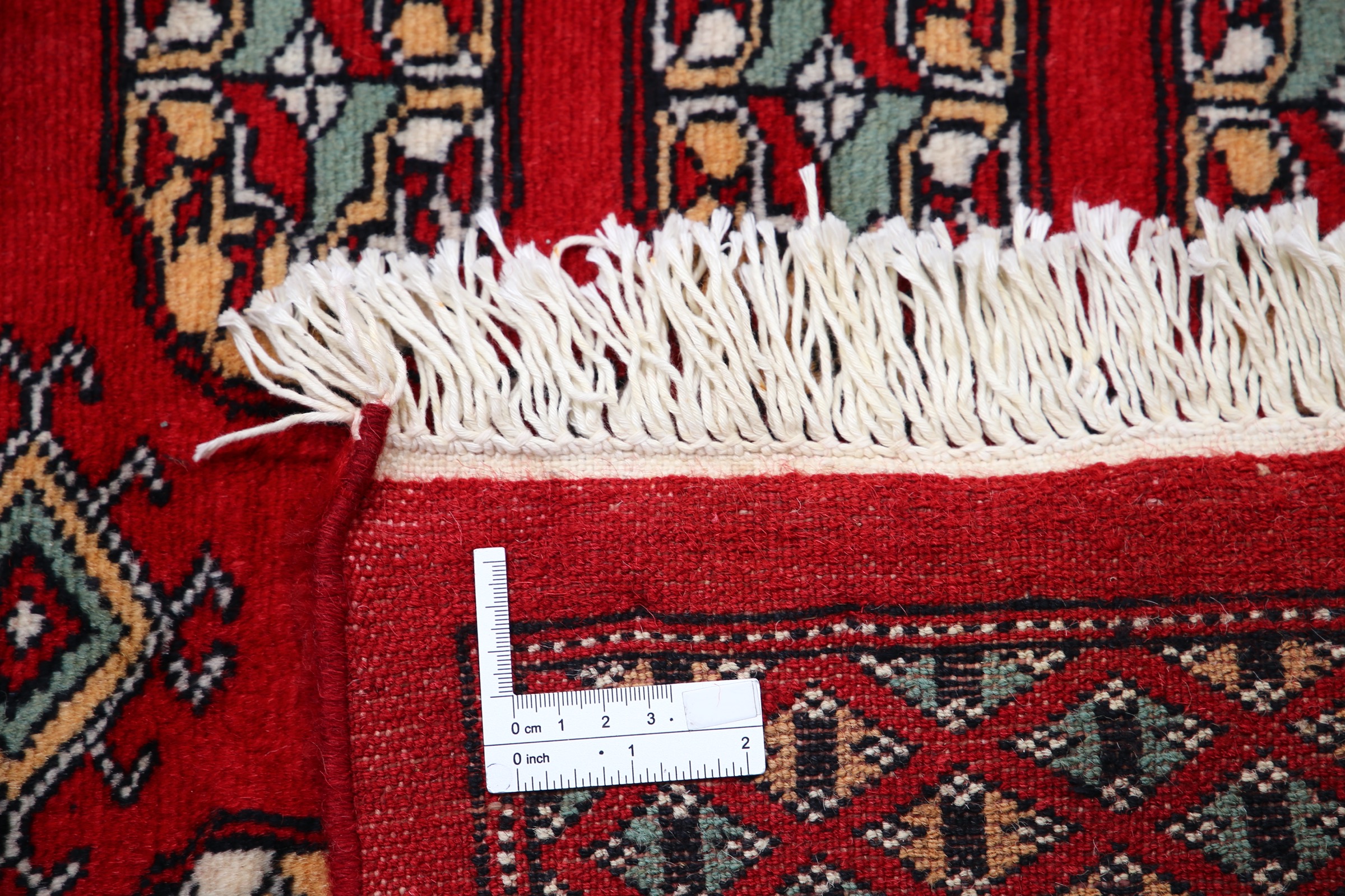 This Bokhara has a Red field with Red border. Made with 100% Wool pile. Allover design with Approx. 196 KPSI