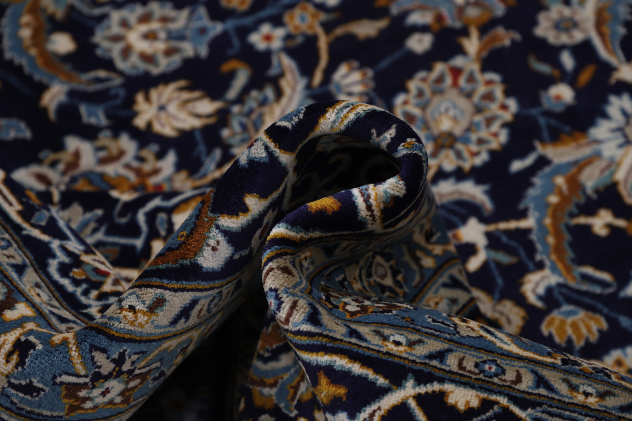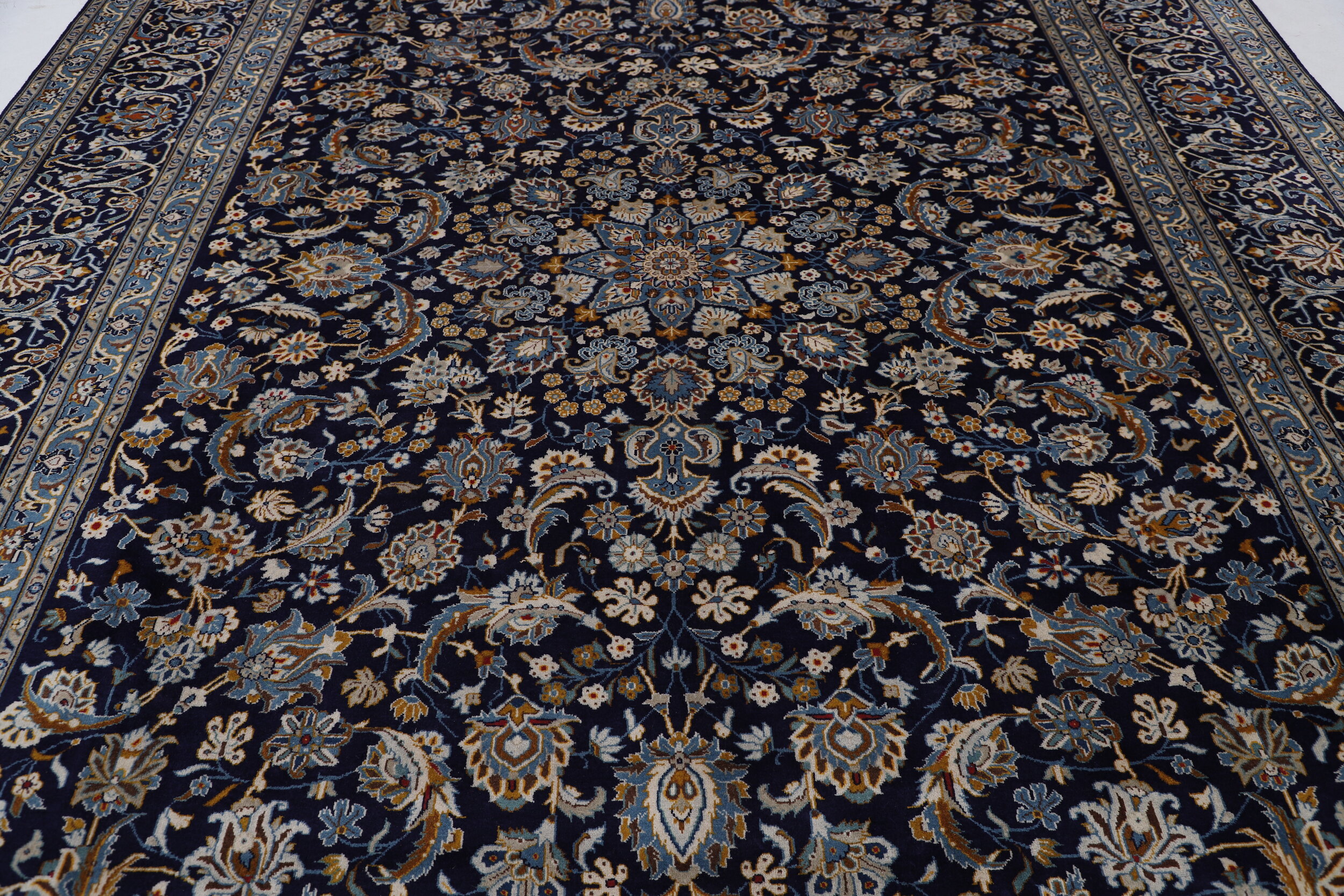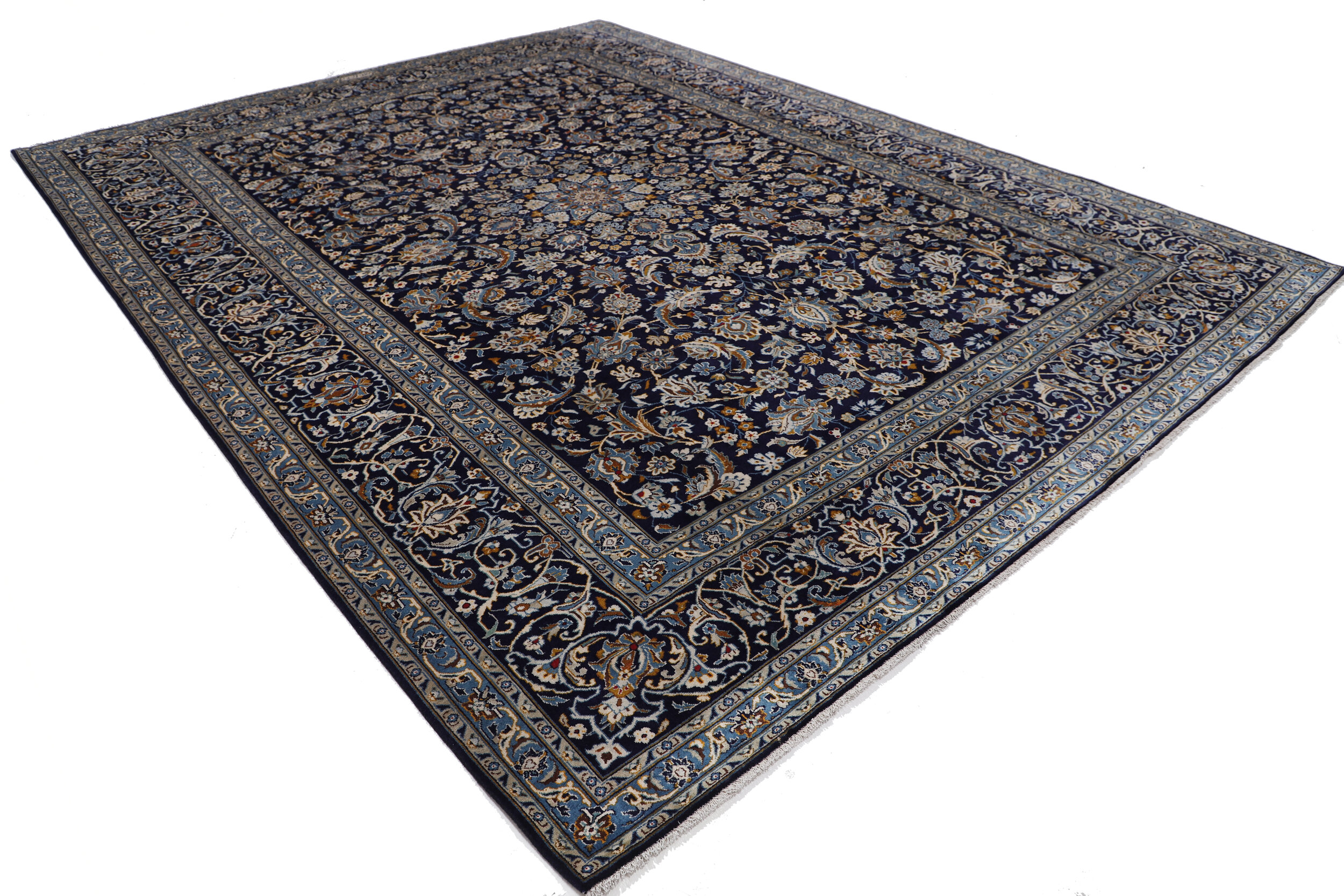 This Hand Knotted Kashan rug measures 10’2″ x 13’5″ and features an aged (30-40 years) Blue and beige floral design. With an approximate knot count of 169 KPSI, this rug is made using 100% wool and cotton materials, and has a high pile height ranging from 1/2″ to 5’8″. This rug is perfect for adding warmth and texture to any living space or bedroom.