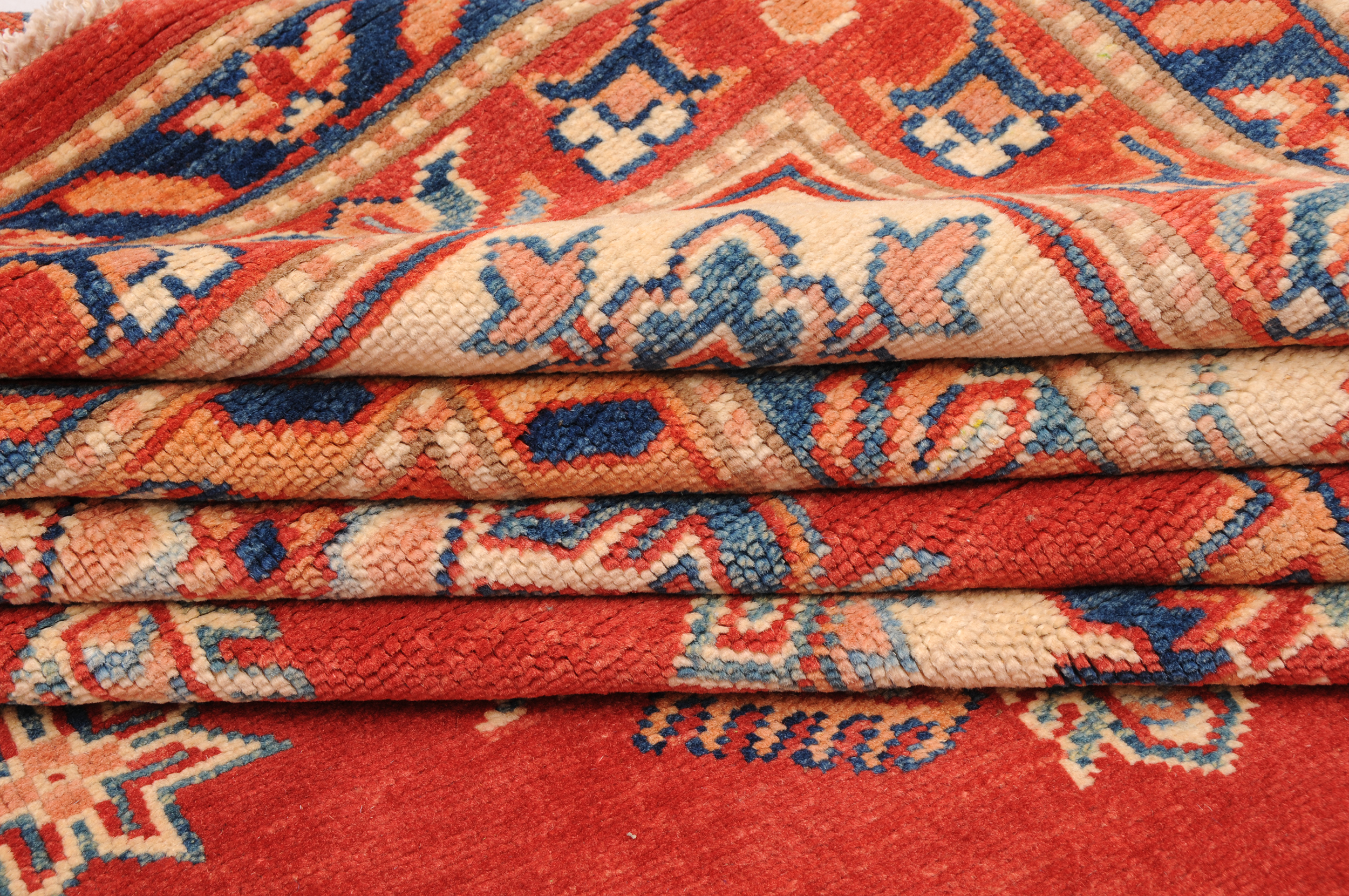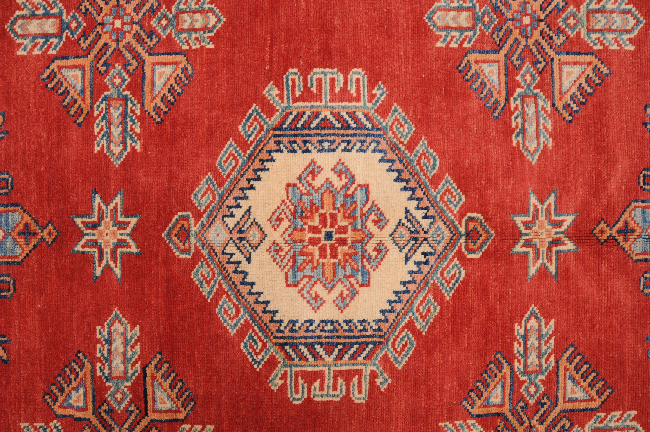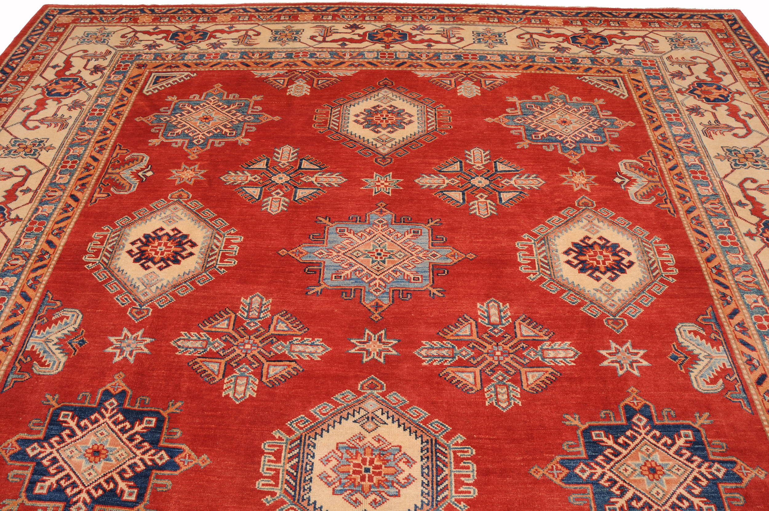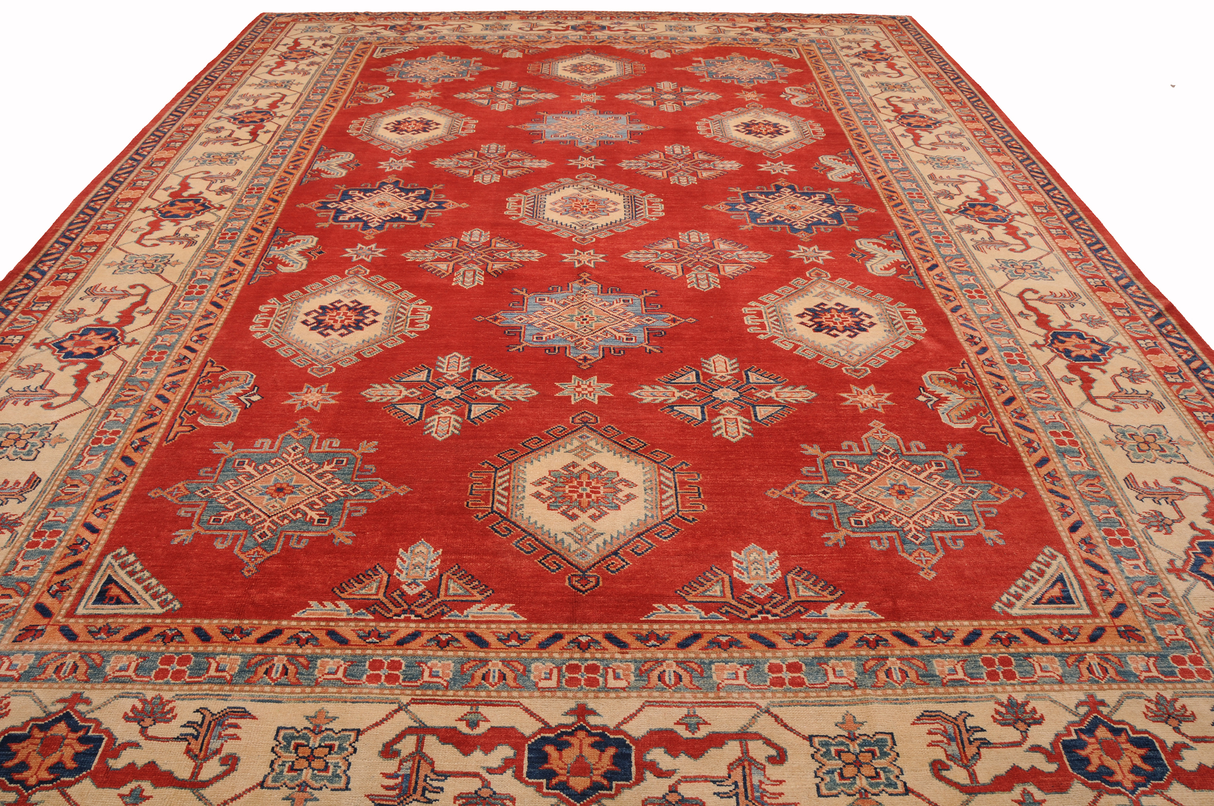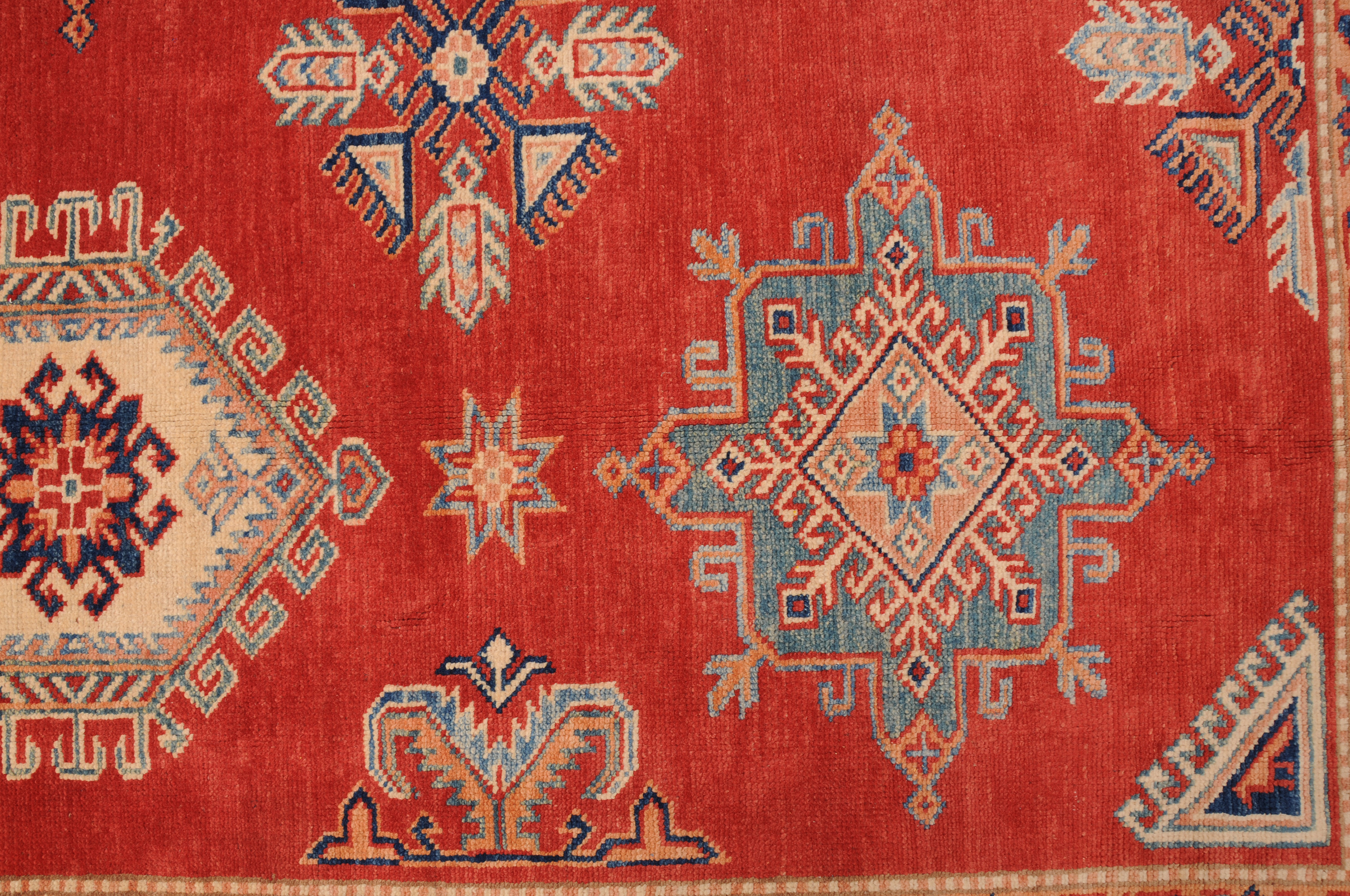 Introducing the Kazak Oriental Rug,  craftsmanship. Hand-knotted with precision, this 10’5″ x 13’8″‘ rug features a stunning Red and beige geometric design. With approximately 120 knots per square inch (KPSI), it showcases the intricate detailing in every thread. Made from 100% wool and cotton, this rug has a low to medium pile height of 1/4″ to 1/3″, providing a comfortable feel underfoot. Excellent in quality and washed to perfection, this Kazak Oriental Rug is a timeless addition to any space.