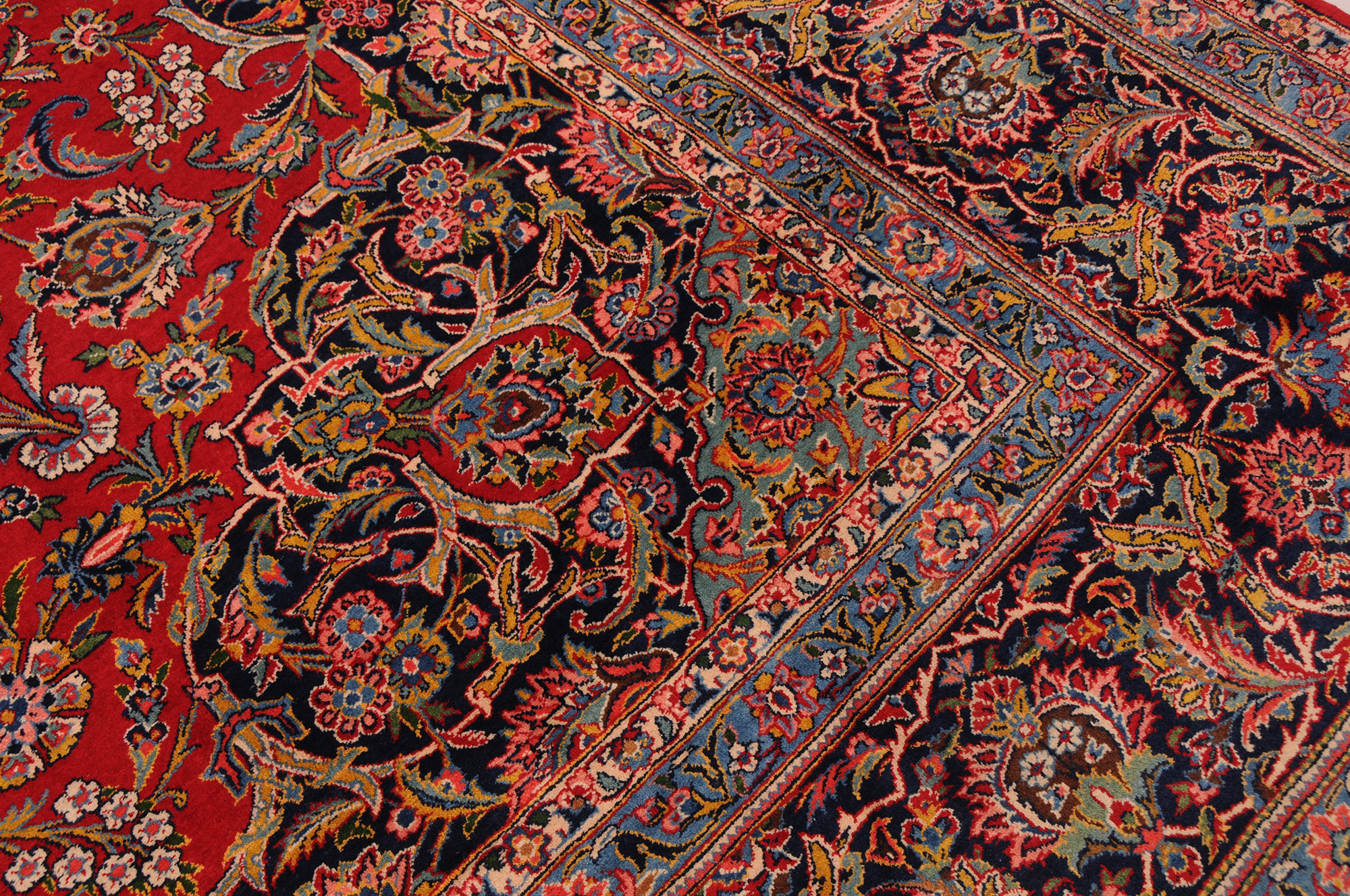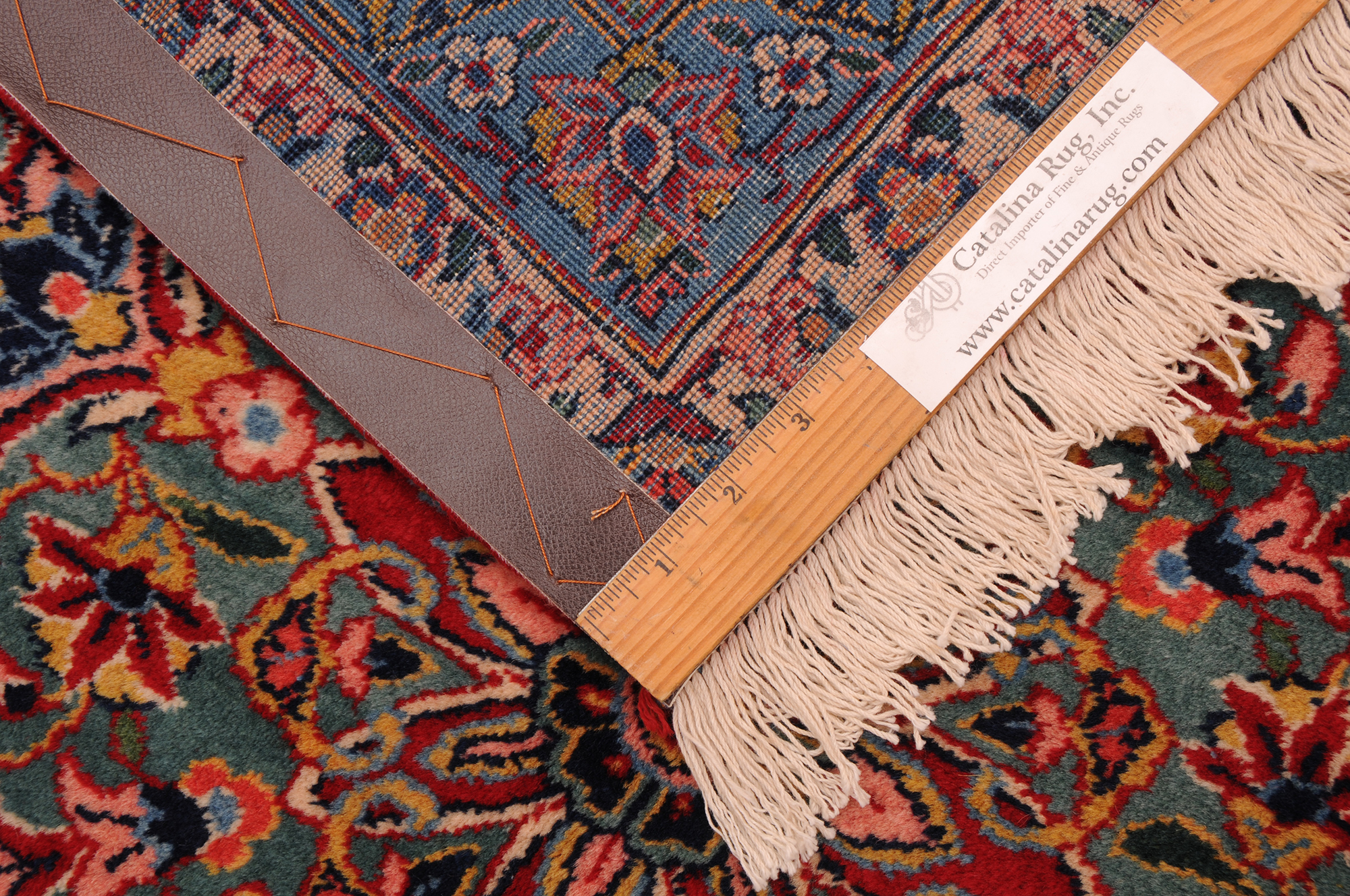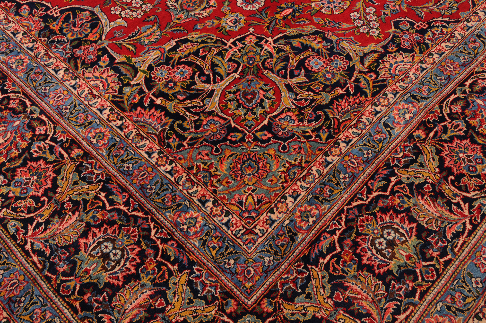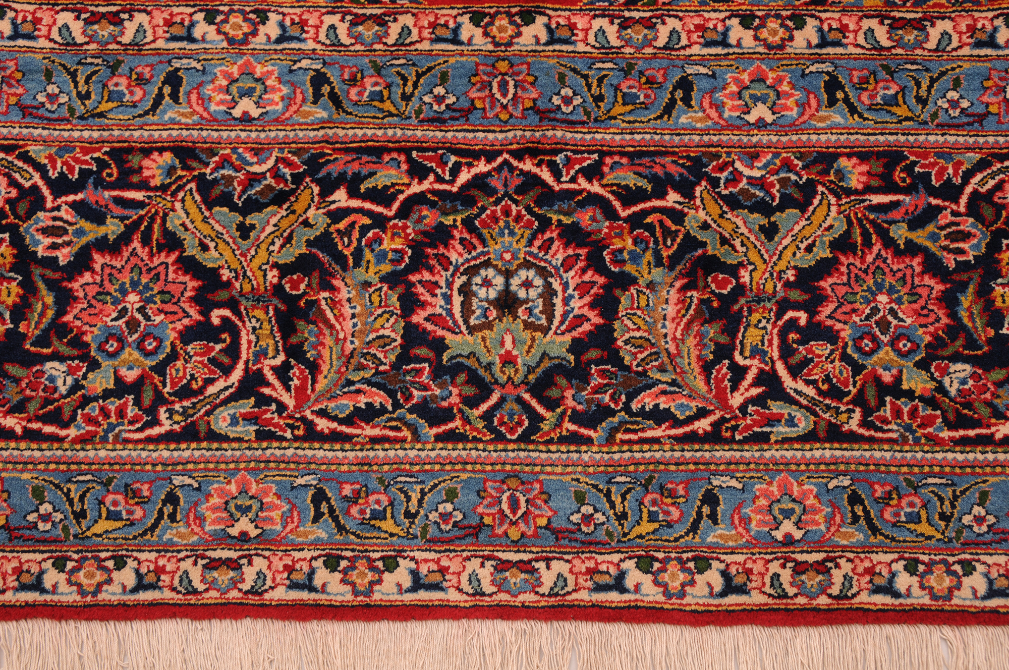 You are looking at a 60-70-year-old, Persian Kashan rug measuring 10’8″ x 13’7″ with an exquisite floral design. It is made of 100% wool pile with a cotton foundation that is incredibly soft to the touch. The colors are stunning, with the beautiful colors of blue, red, peach, green, and brown. With the intricateness of the design, it took approximately 722 days to knot this masterpiece at approx. 361 KPSI.