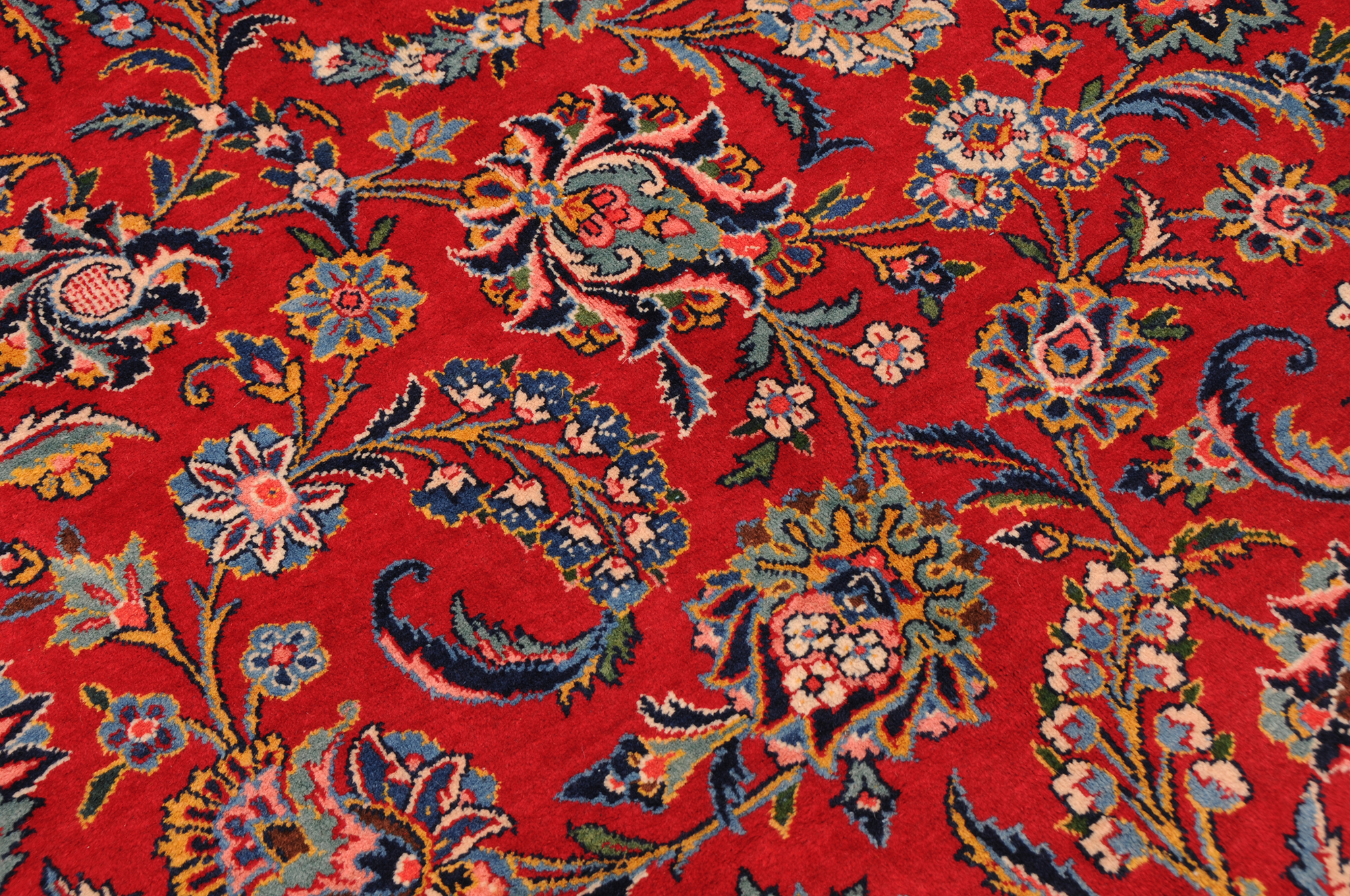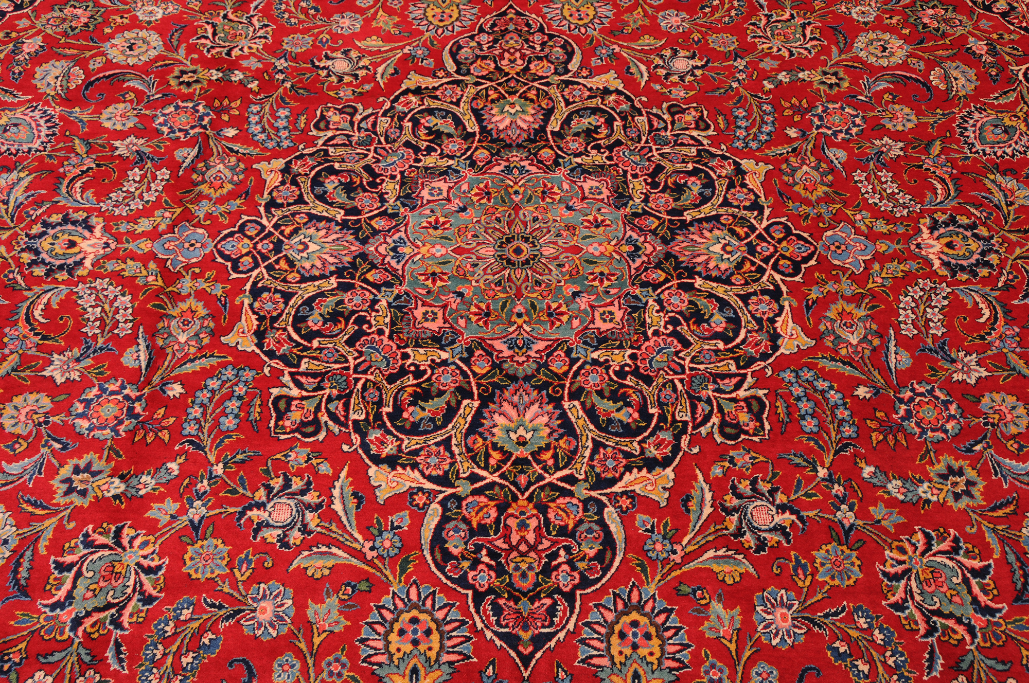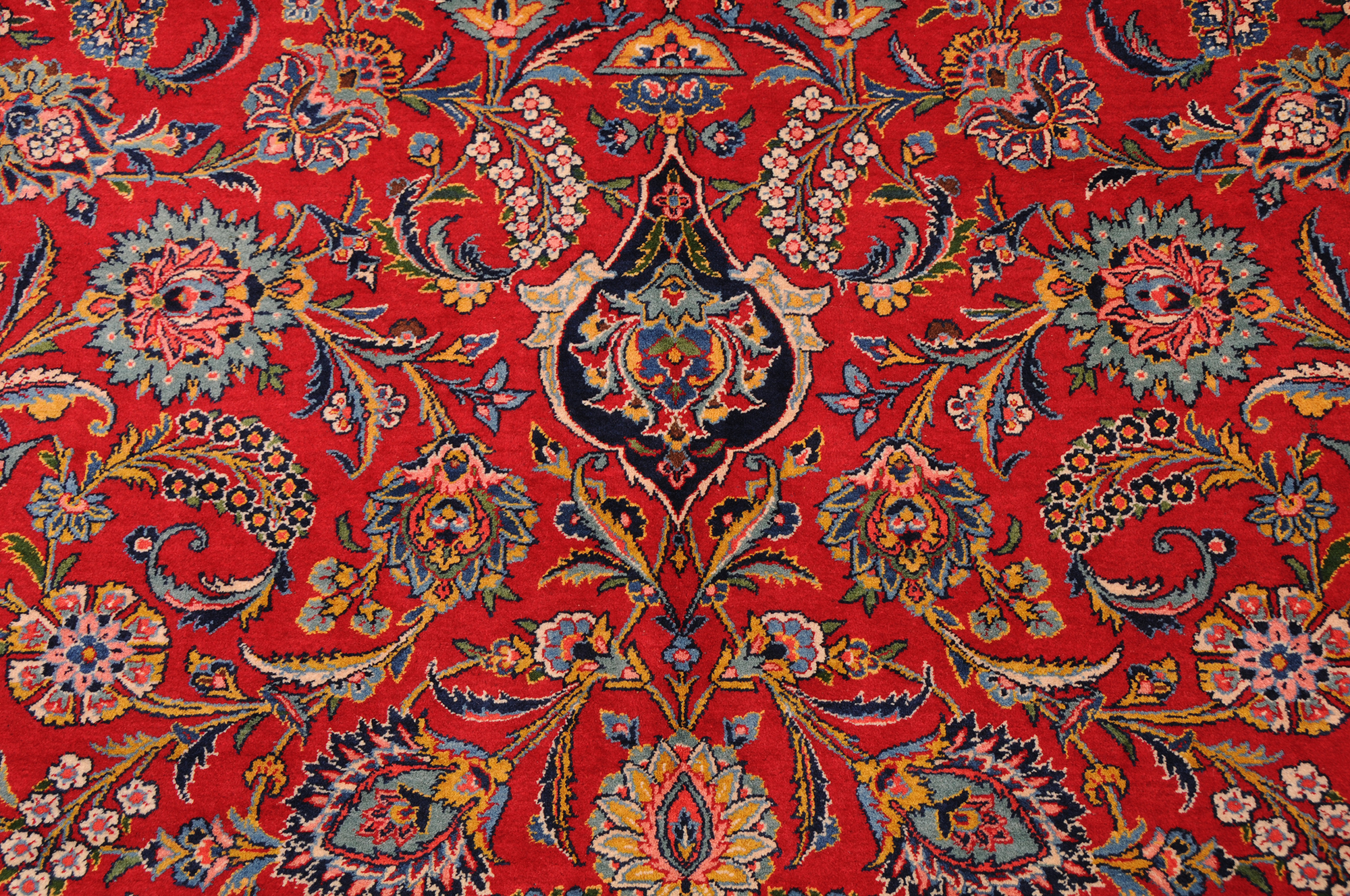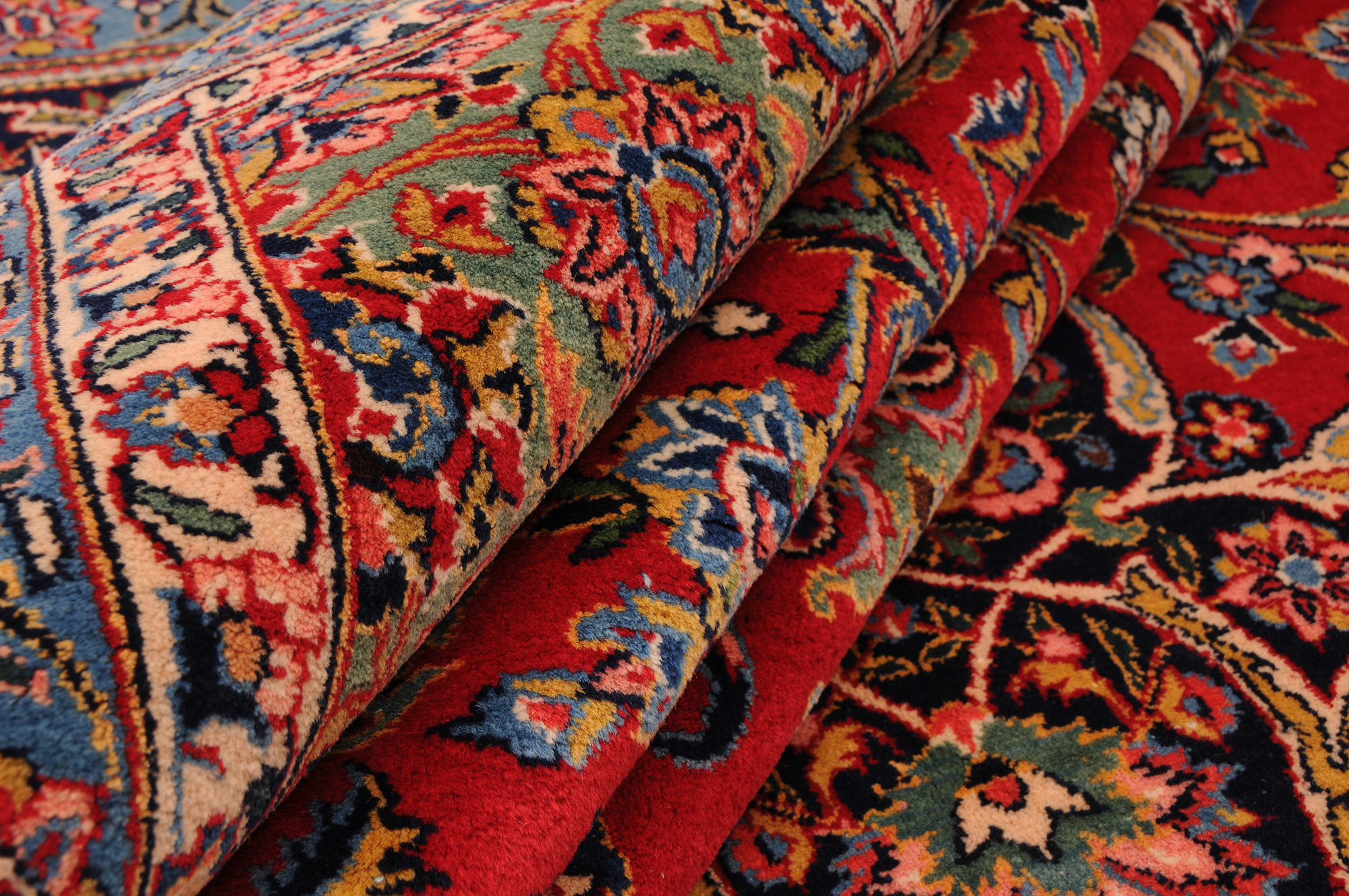You are looking at a 60-70-year-old, Persian Kashan rug measuring 10’8″ x 13’7″ with an exquisite floral design. It is made of 100% wool pile with a cotton foundation that is incredibly soft to the touch. The colors are stunning, with the beautiful colors of blue, red, peach, green, and brown. With the intricateness of the design, it took approximately 722 days to knot this masterpiece at approx. 361 KPSI.