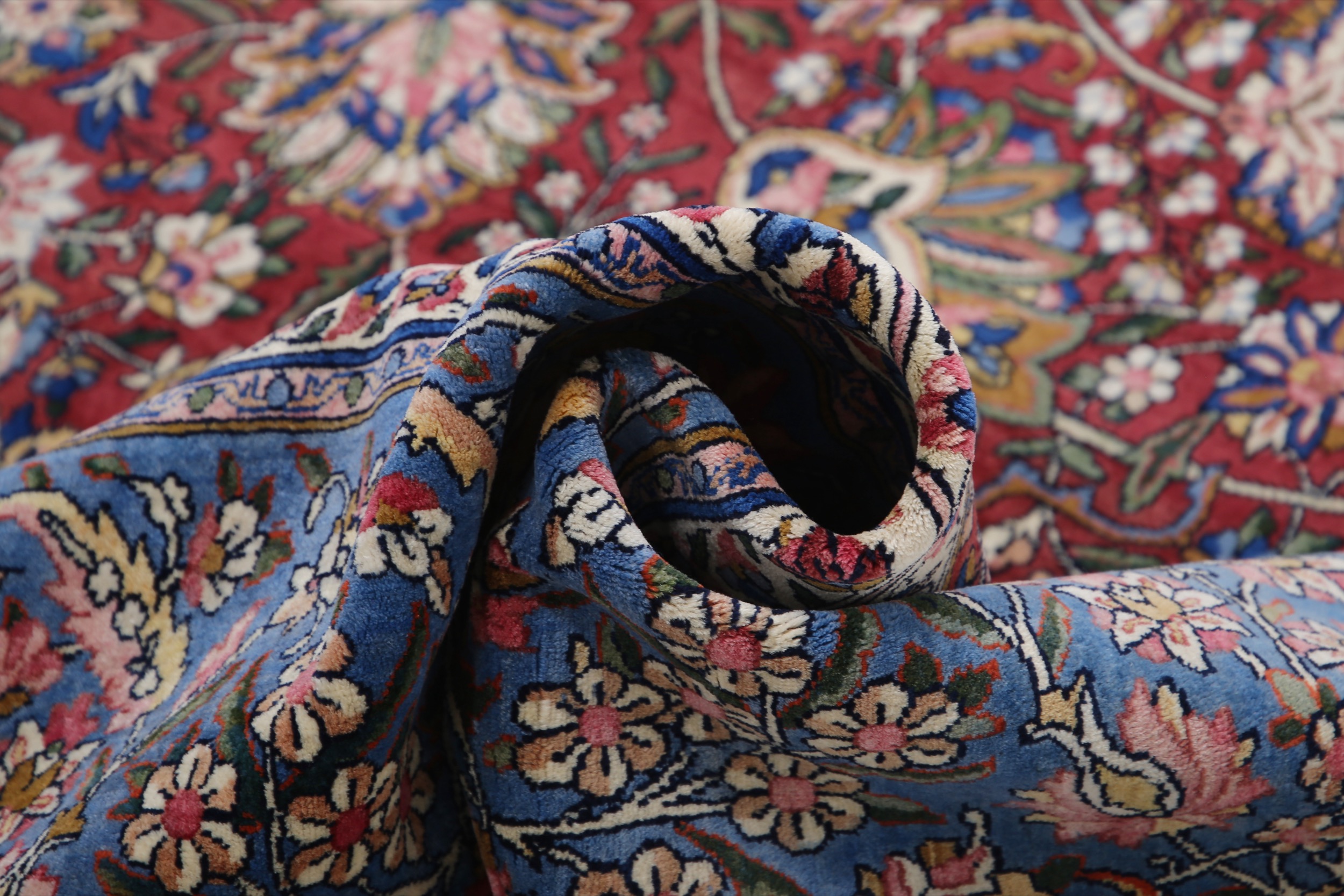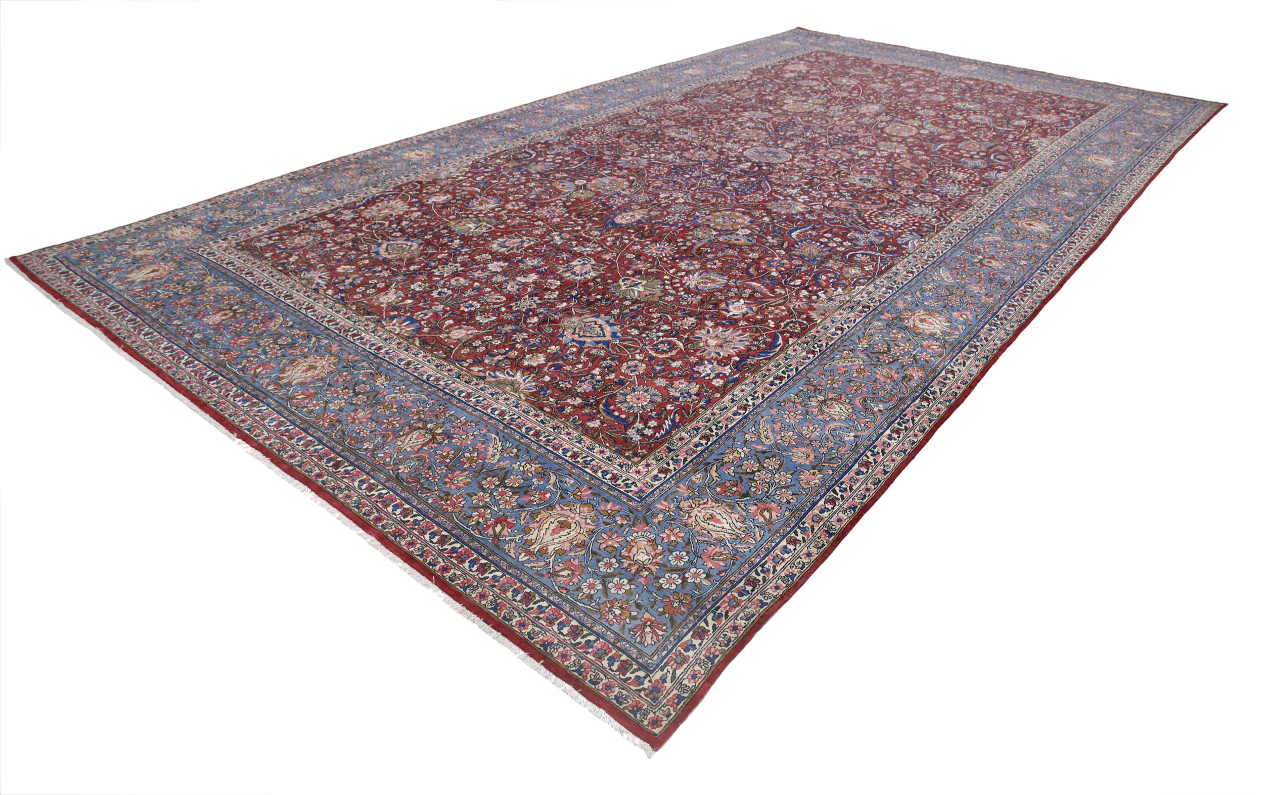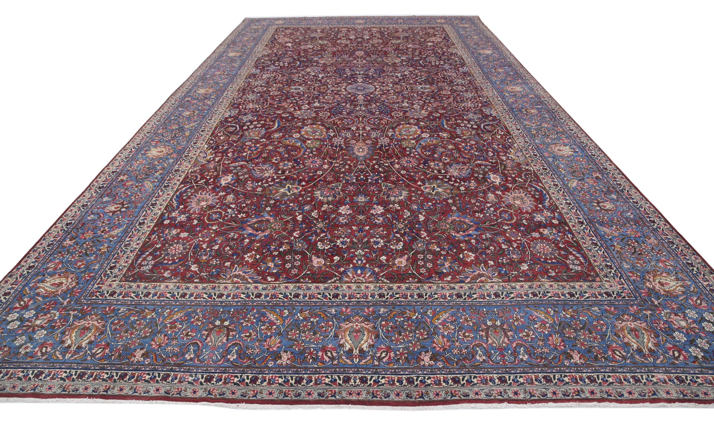 This 10’8″ x 20’2″ Kerman rug, hand-knotted in Persian, features a floral design. It is woven with Approx.400 KPS, showcasing a field in Red and a Blue border. The rug has a Medium Pile and a 100% Wool pile, and is in excellent condition.