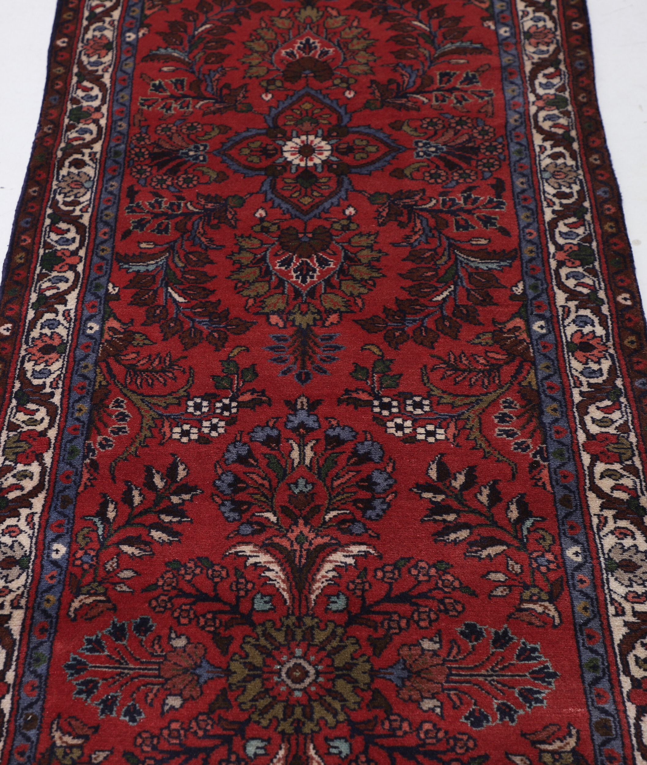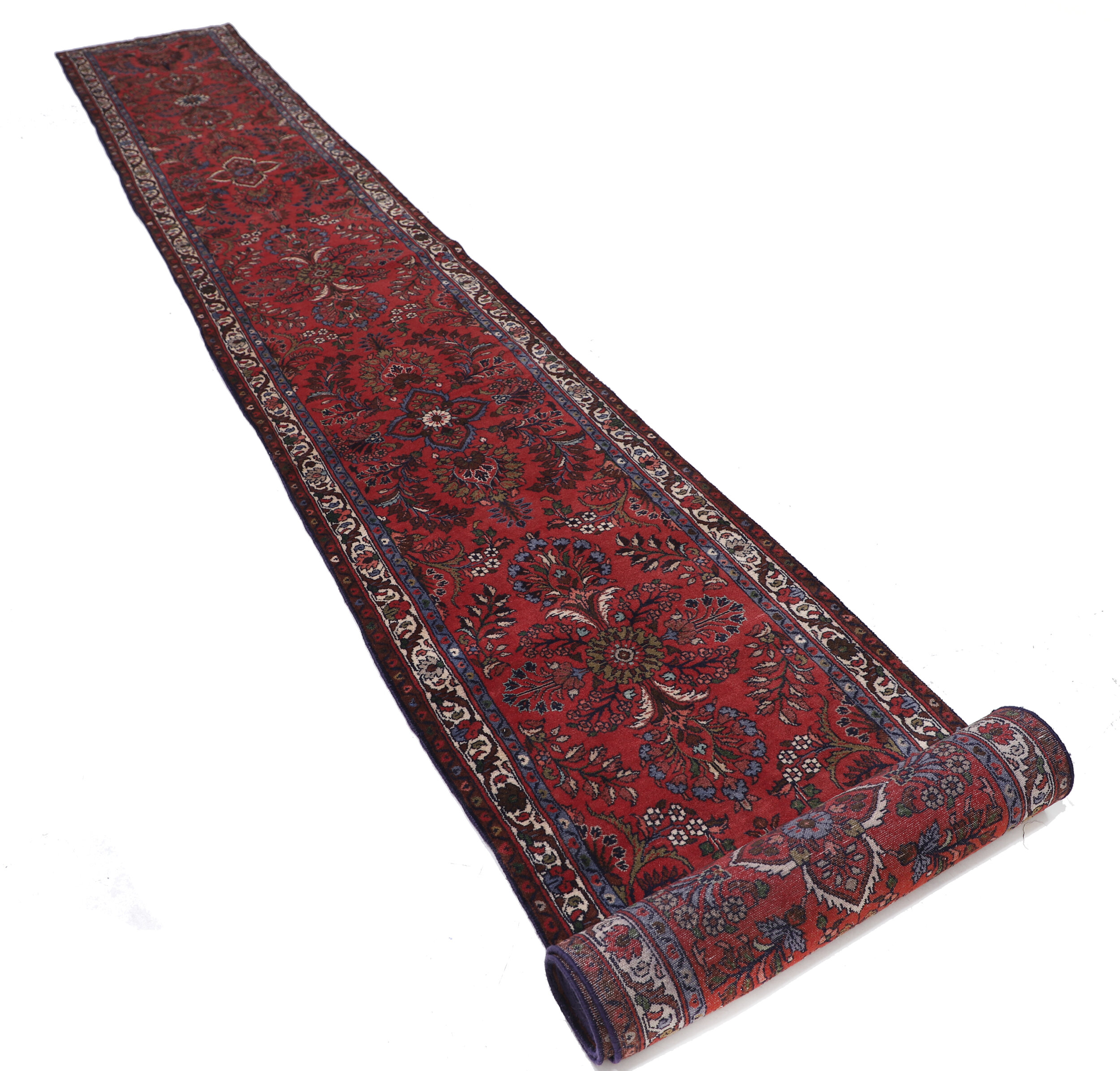Handcrafted with care, this exquisite Persian rug showcases timeless elegance. Measuring 2’10” x 22’6″ and featuring a striking Red and Beige Floral design, it effortlessly adds a touch of sophistication to any space. With an approximate 196 knots per square inch, this hand-knotted rug is a testament to the skill and artistry of its creators. Made from 100% wool and cotton, it boasts a medium pile height of 1/3″-3/8″, ensuring both comfort and durability. This aged rug, with 10-20 years of history, is a true masterpiece that will transform any Hallway into a luxurious haven.