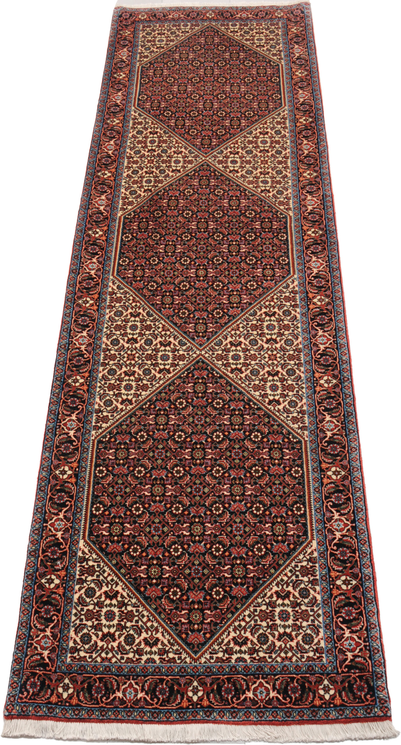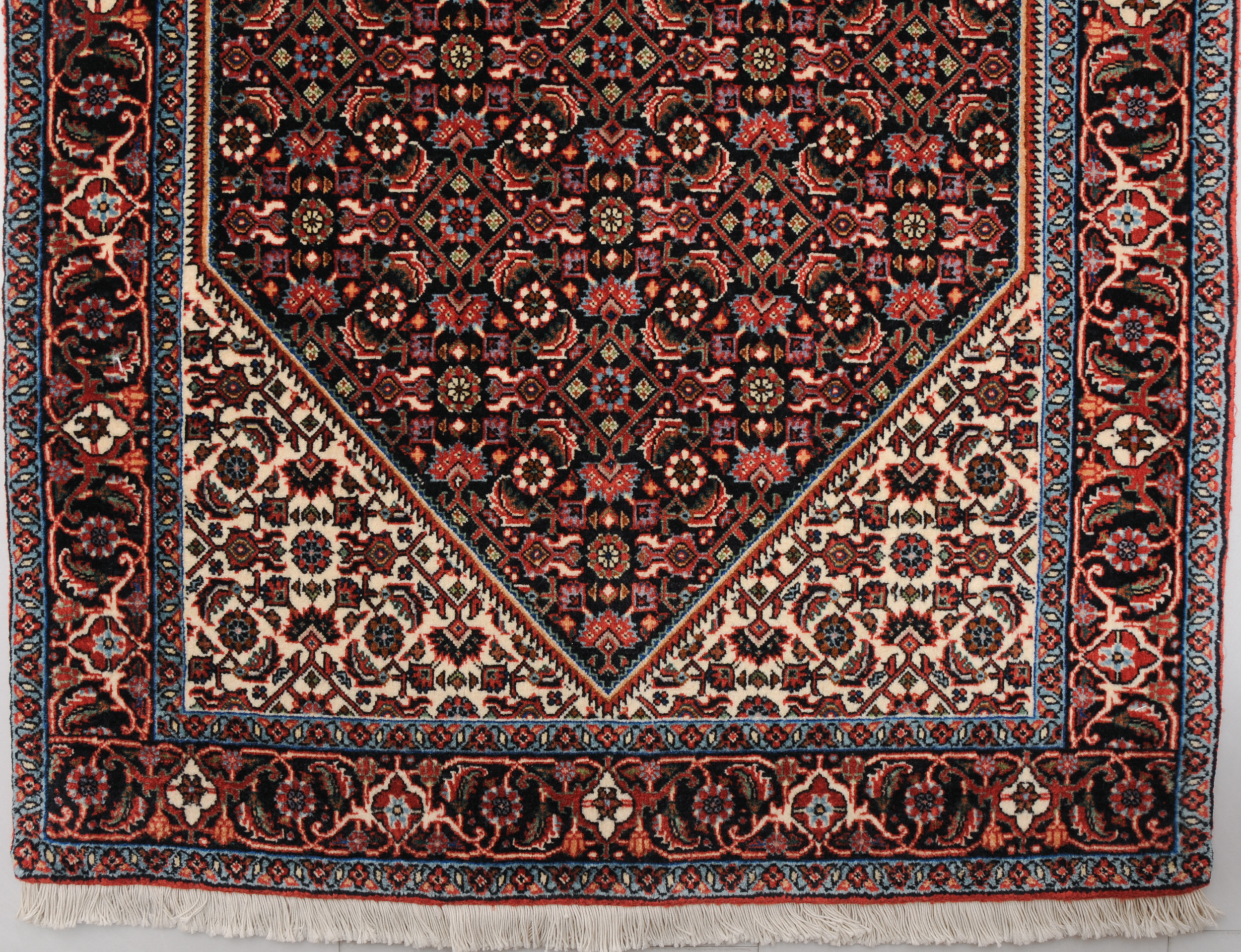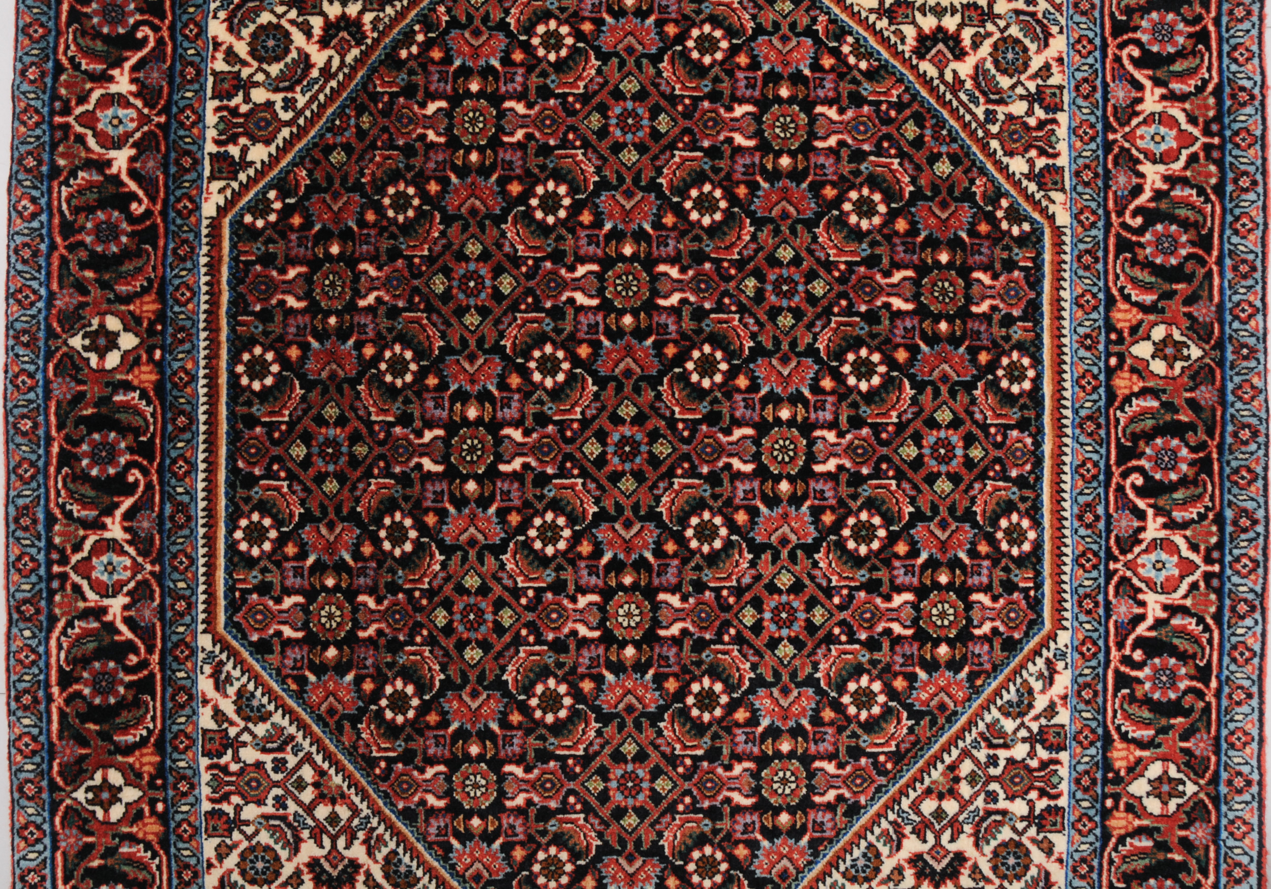 This Bijar rug has a Beige field with a Blue border, featuring a Herati design. Made with 100% Wool with Cotton foundation. It has knot density of 289 kpsi.