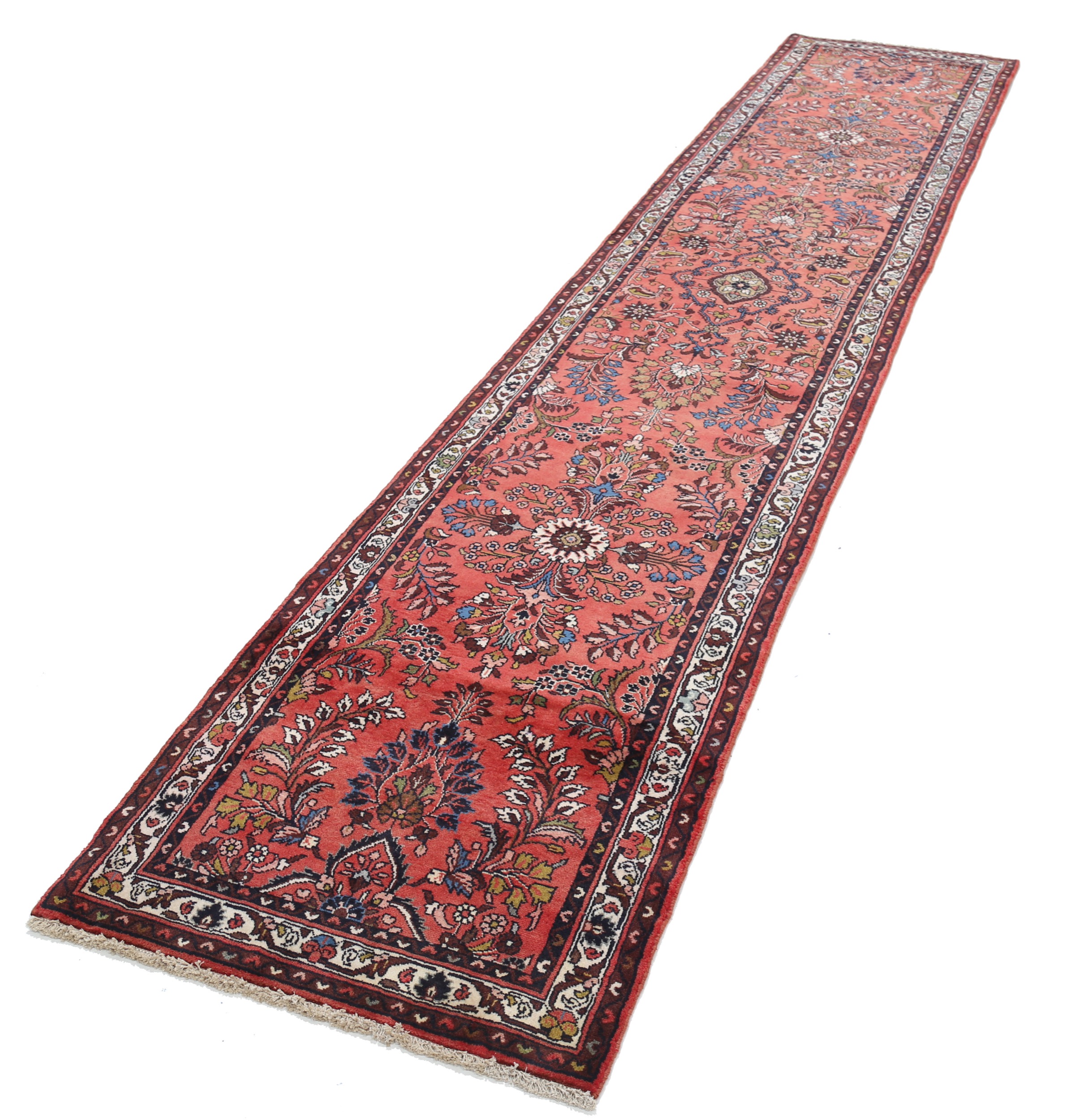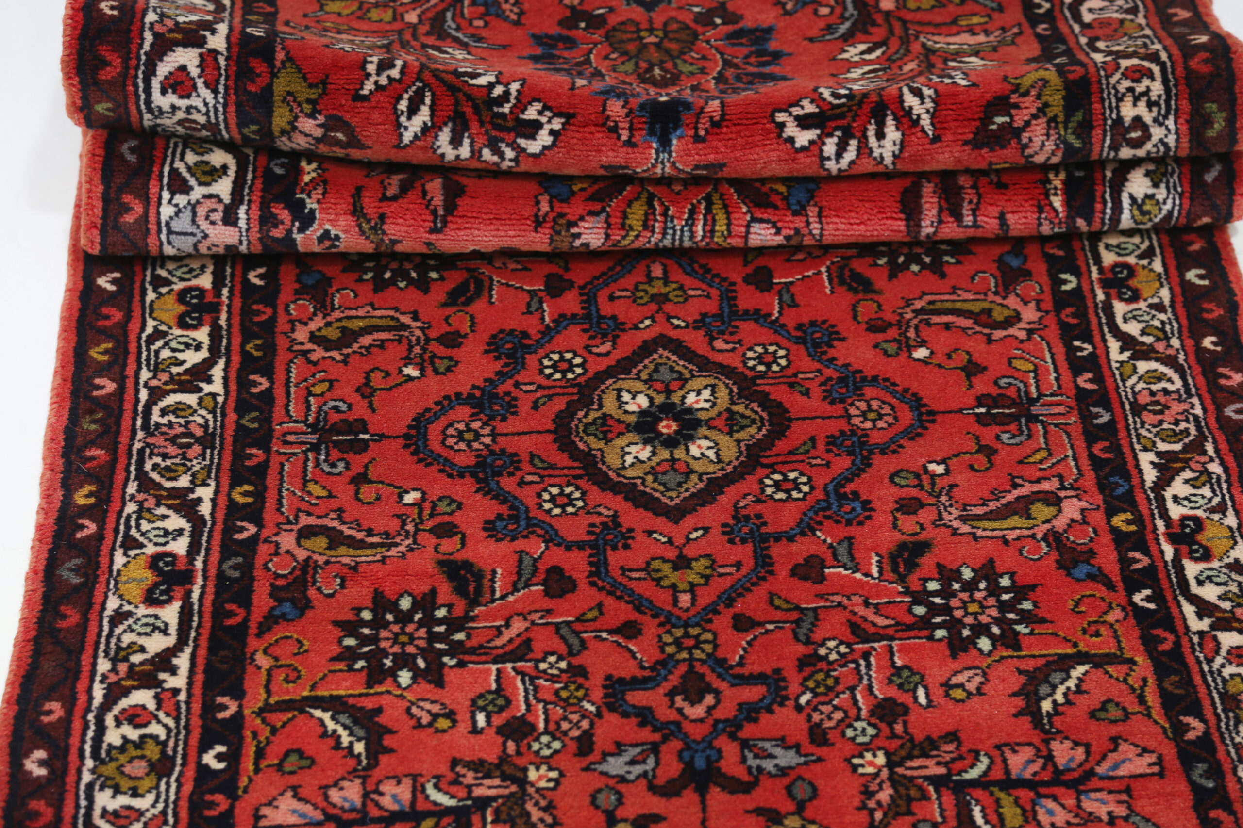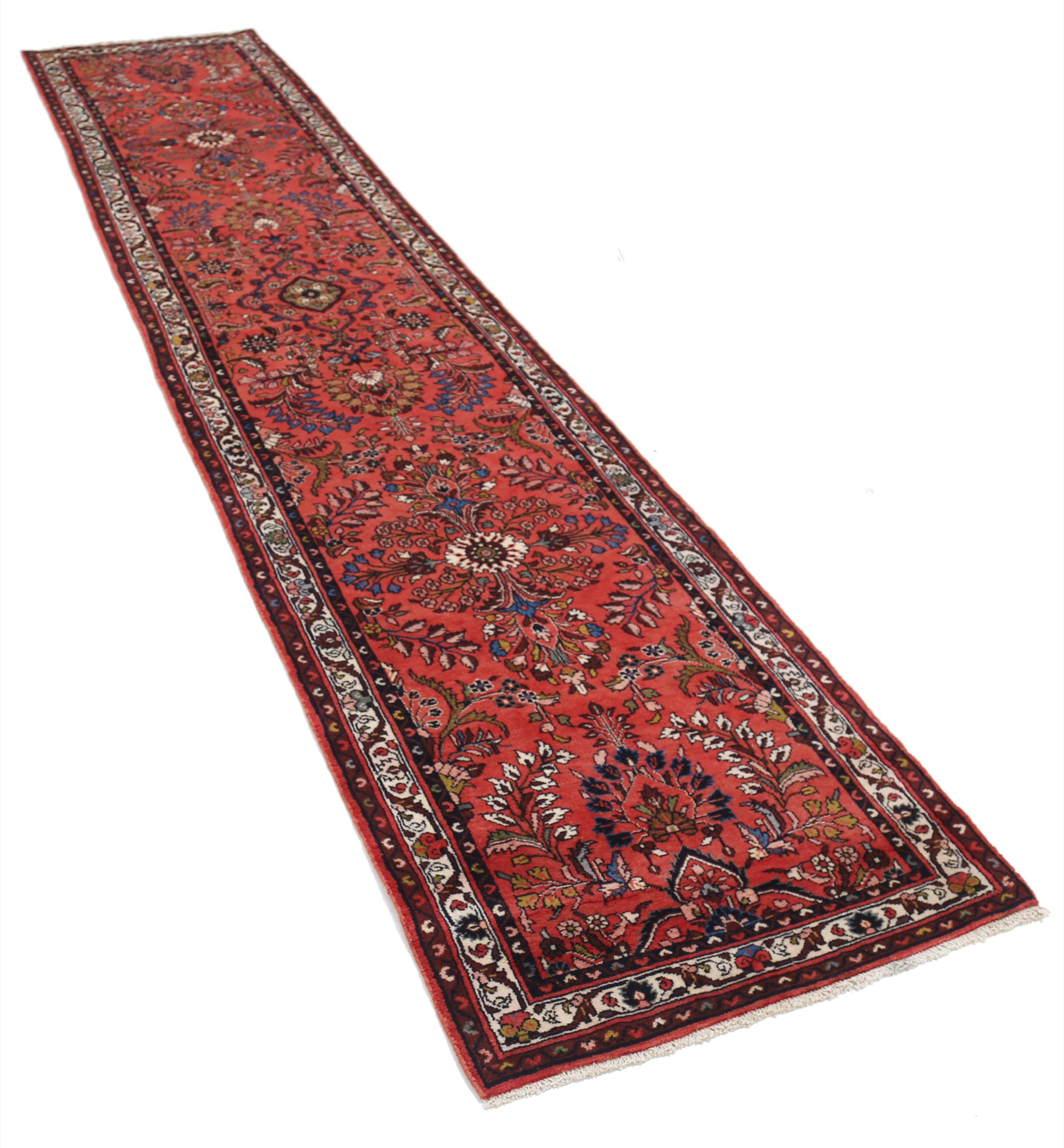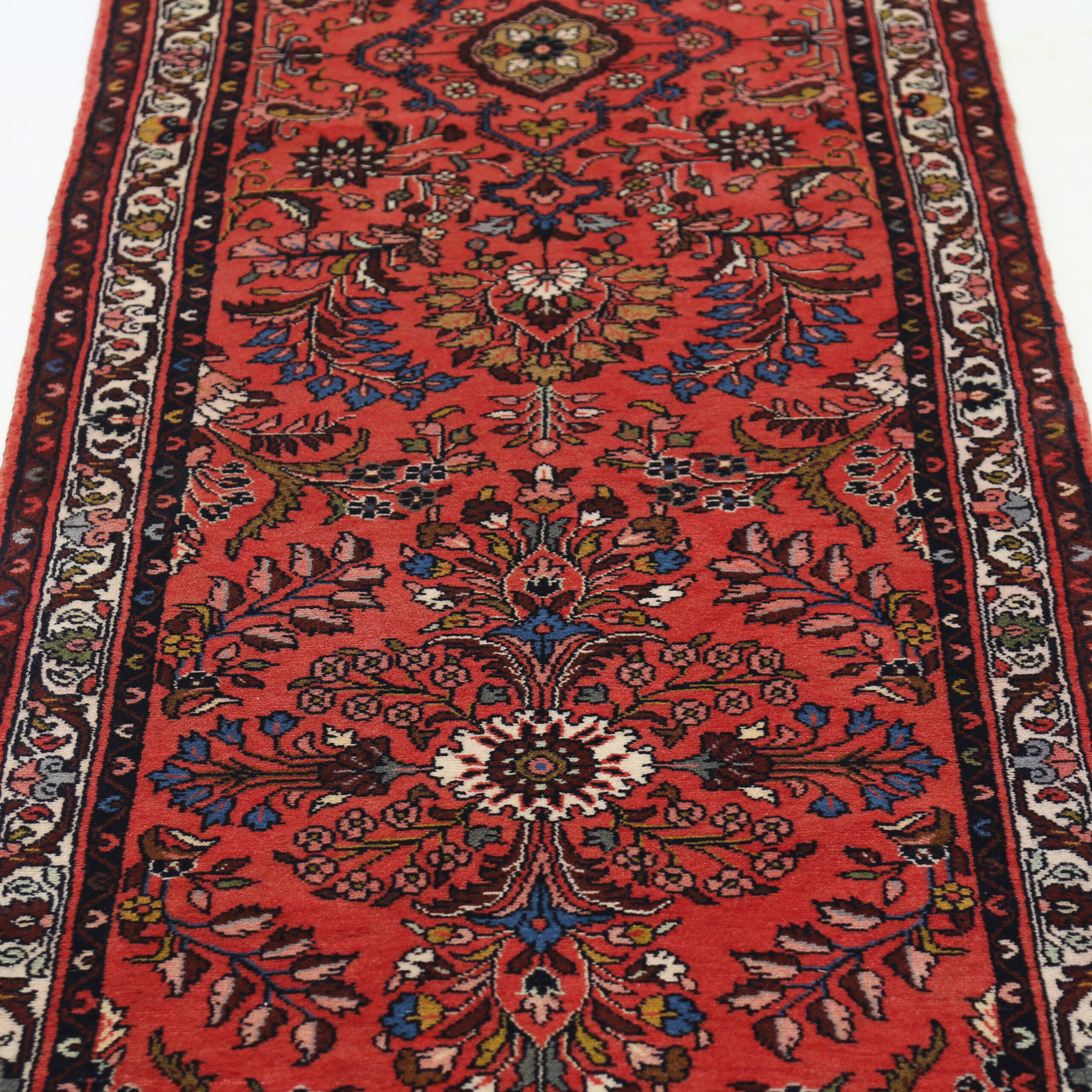 This Mehraban Persian rug, measuring 2’6″ x 12’6″, features a beautiful floral design in beige, blue, green, and yellow. Made of 100% wool with a medium pile height of 1/3″-3/8″, it has an approximate knot density of 196 KPSI. Perfect for adding a touch of elegance to any space.