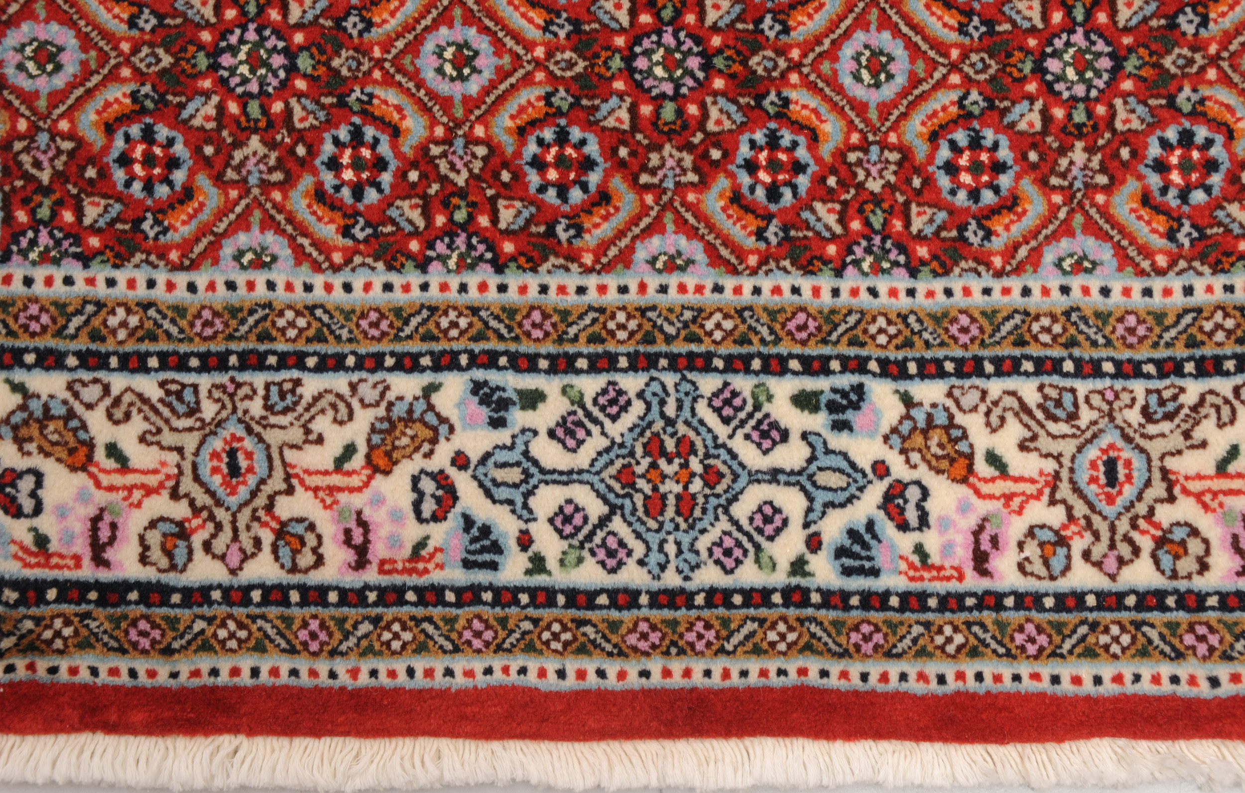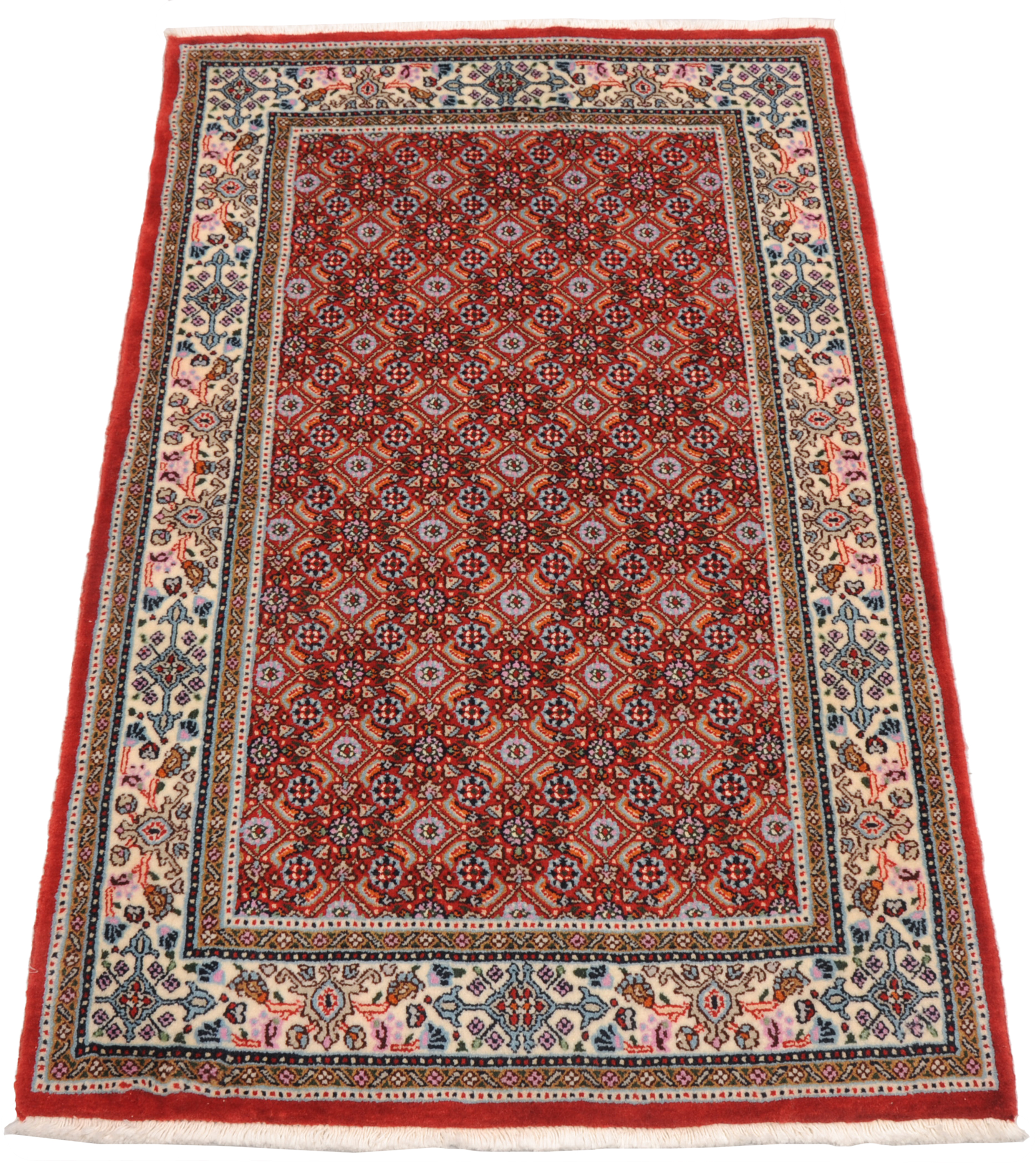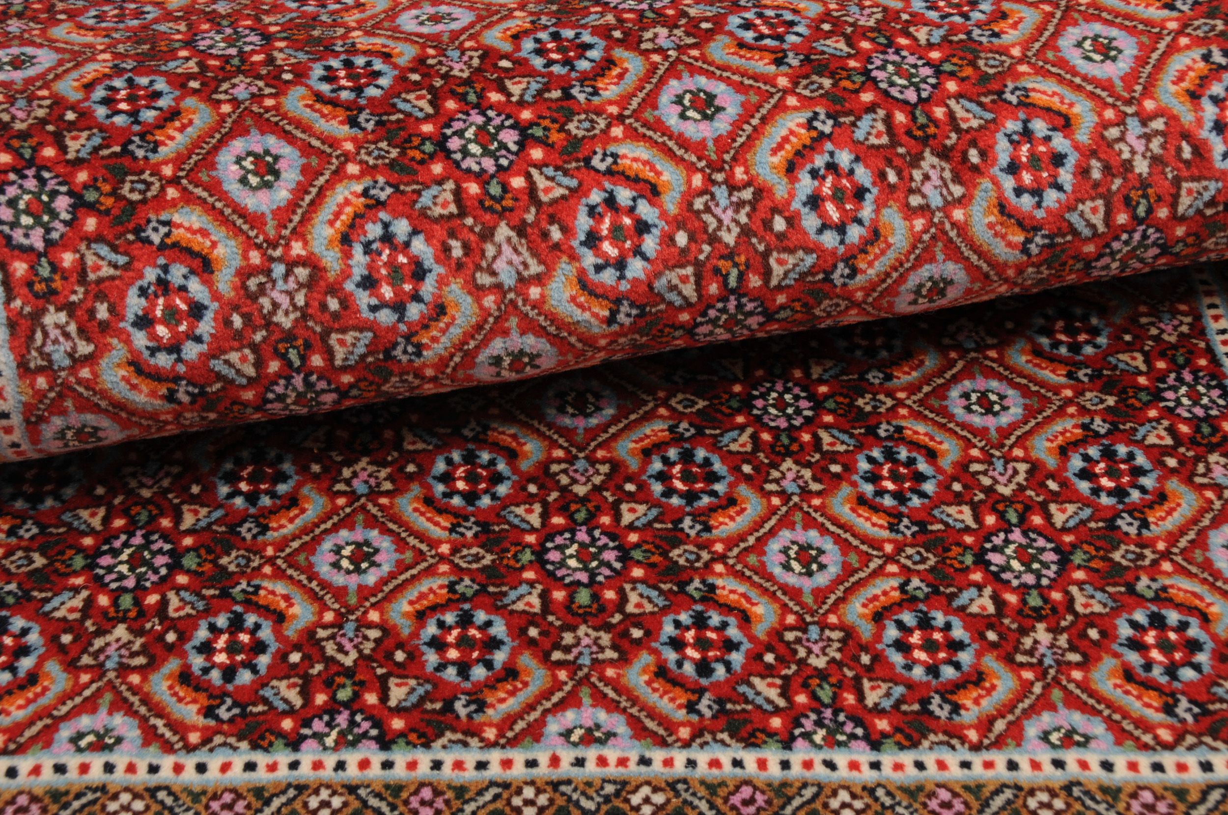 This Moud Mashad rug has Made with Wool and silk with a Cotton foundation. The design is Herati the field color is Red and the border is Beige. It has a knot density of 256 kpsi.
