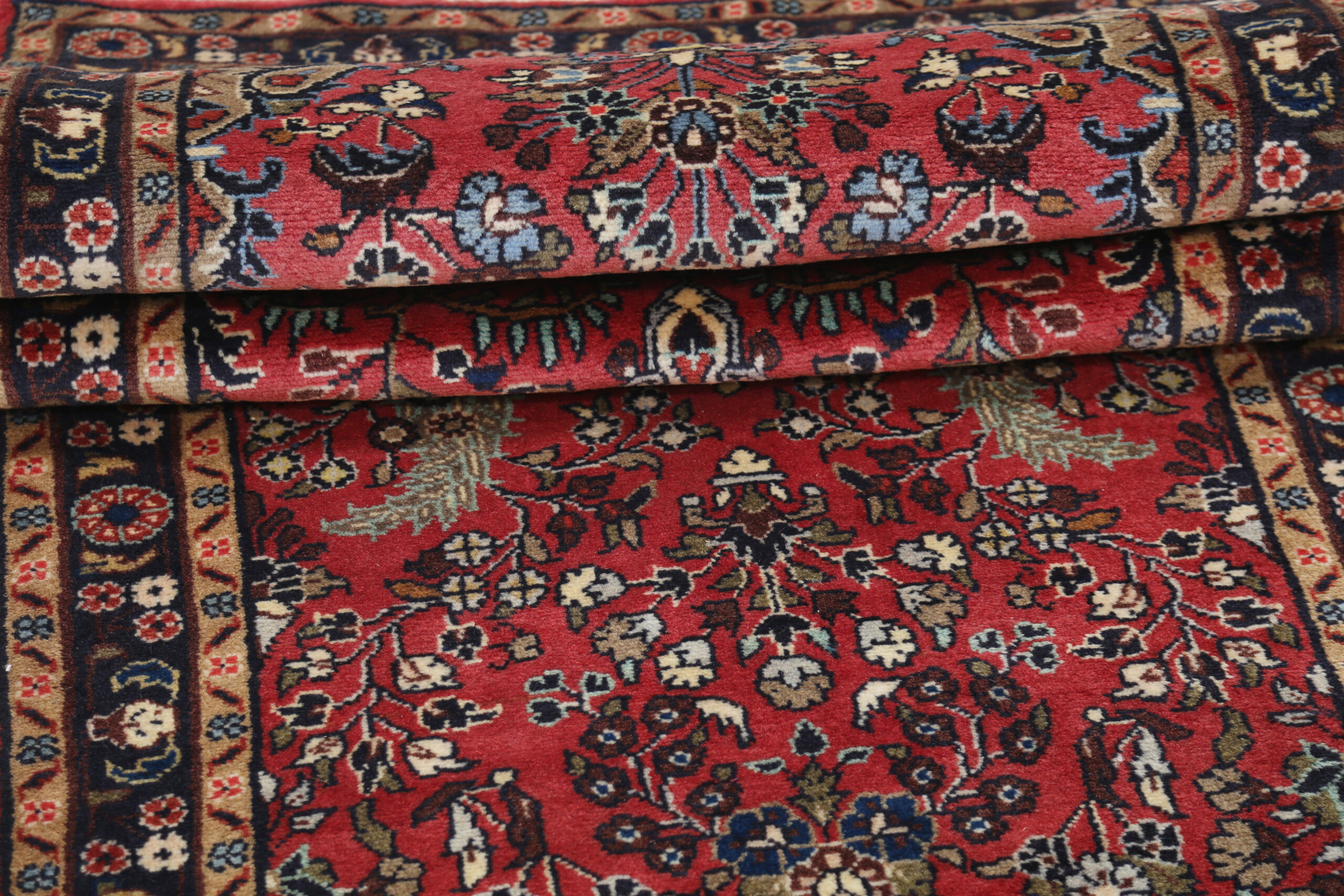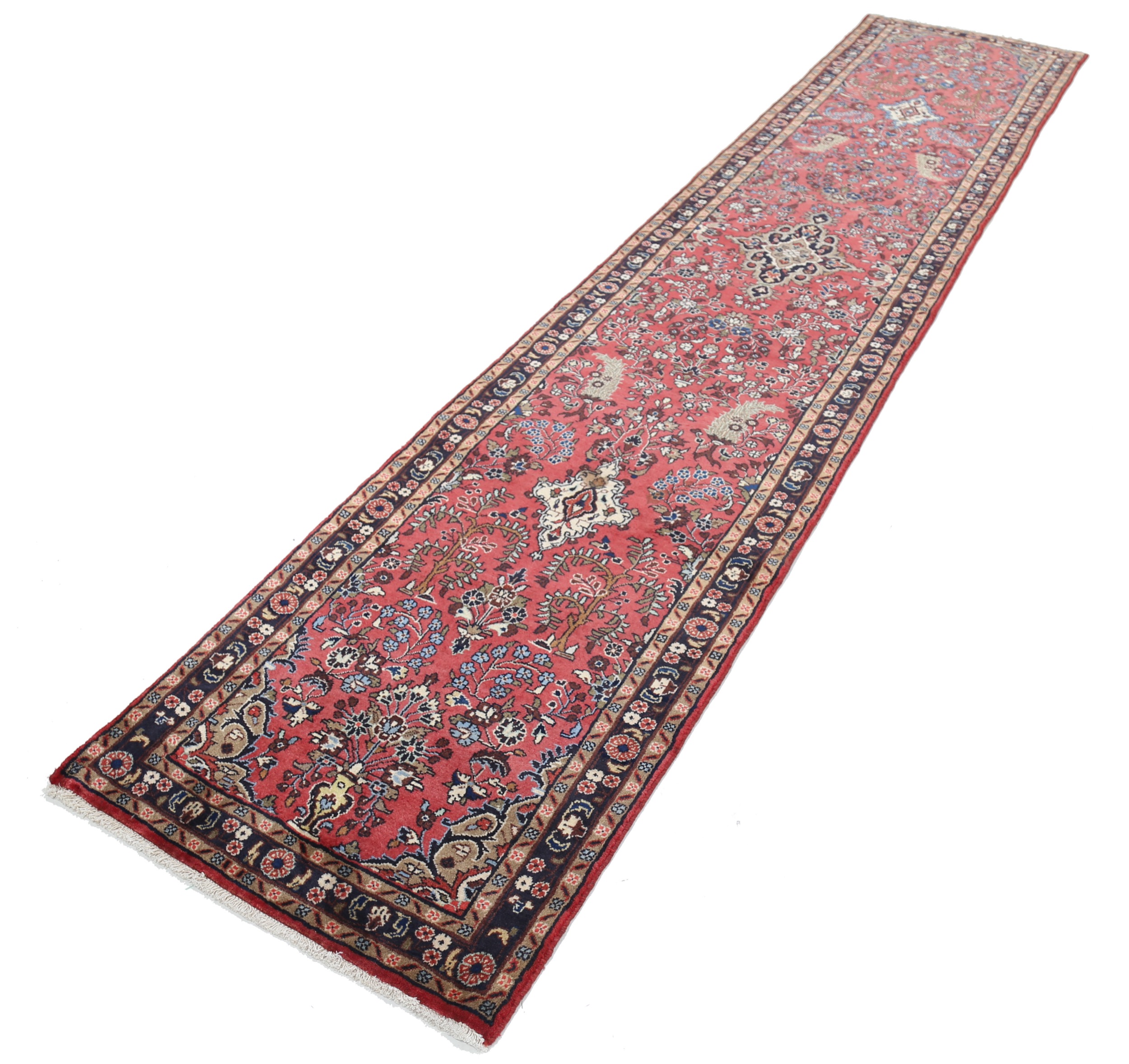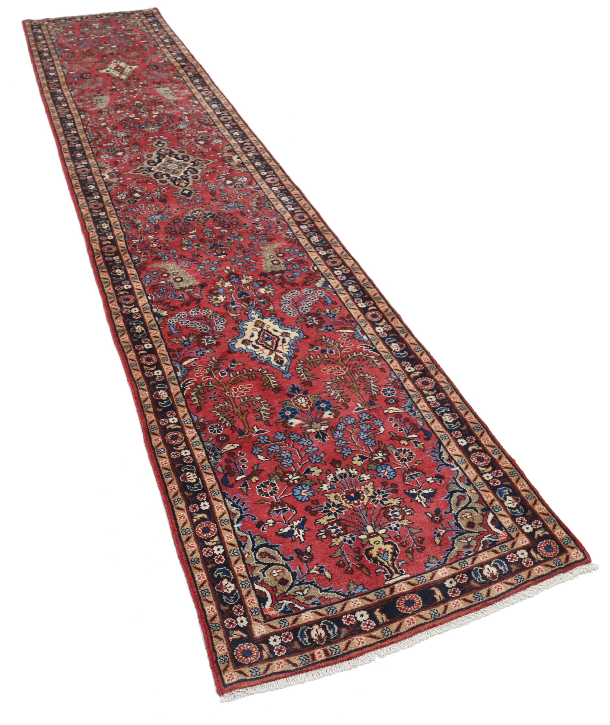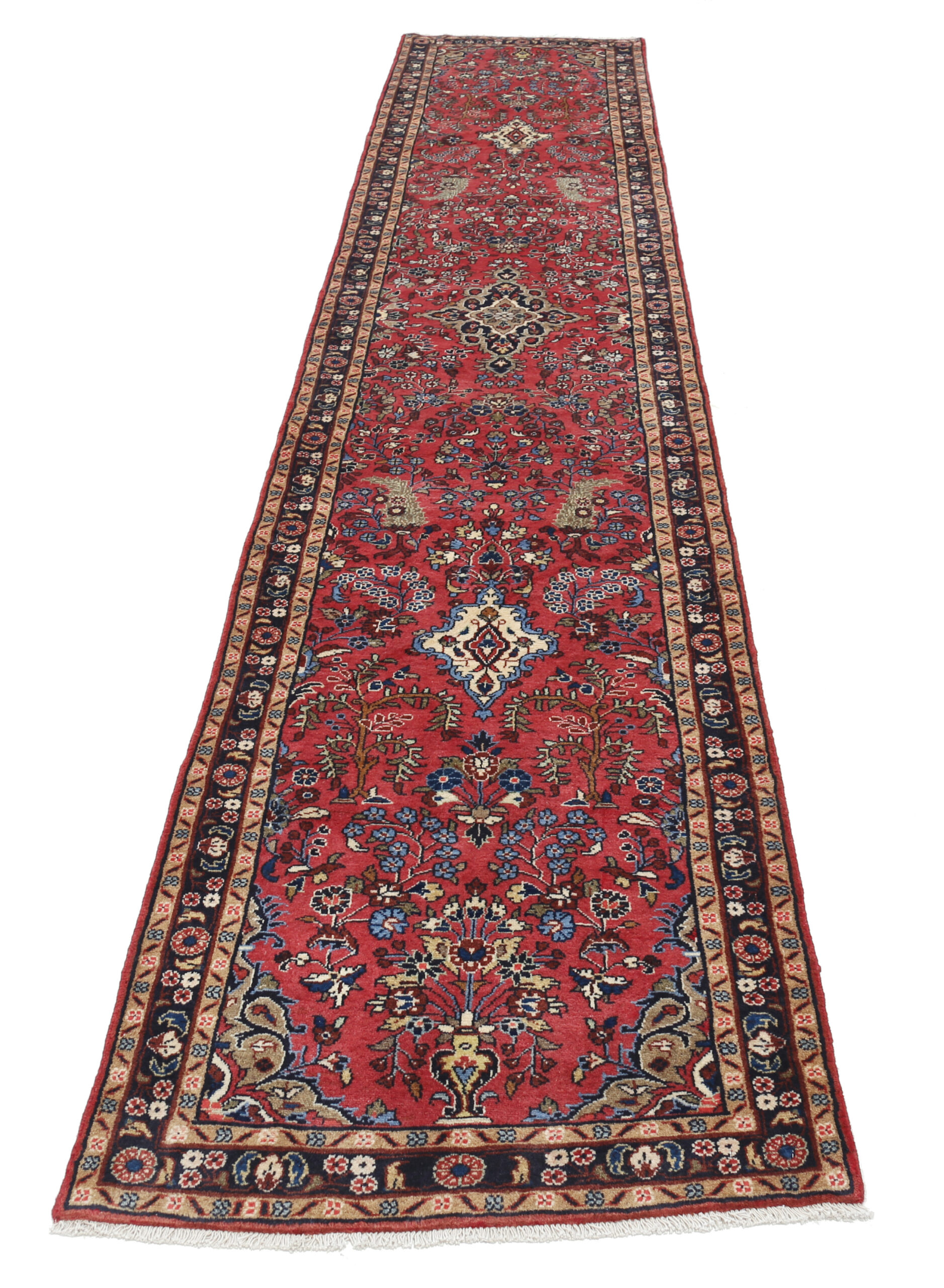 This New Persian Mehraban rug features a beautiful blue and beige color combination with hints of brown, green, and red. Made from 100% wool, it has a medium pile height of 1/3″-3/8″ and a knot density of approximately 196 KPSI. Perfect for adding a touch of elegance to any space. Size: 2’7″ x 12’10”.