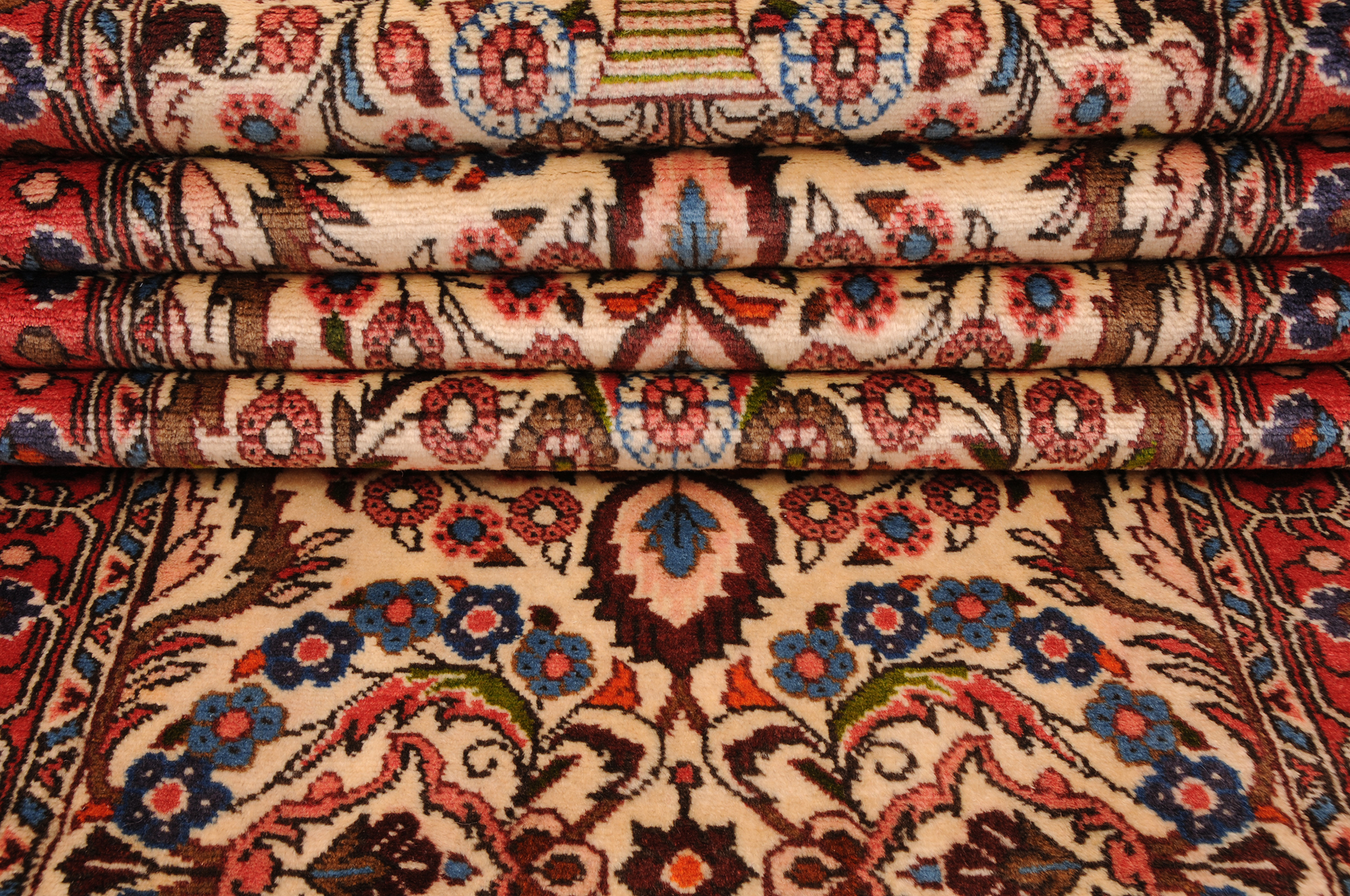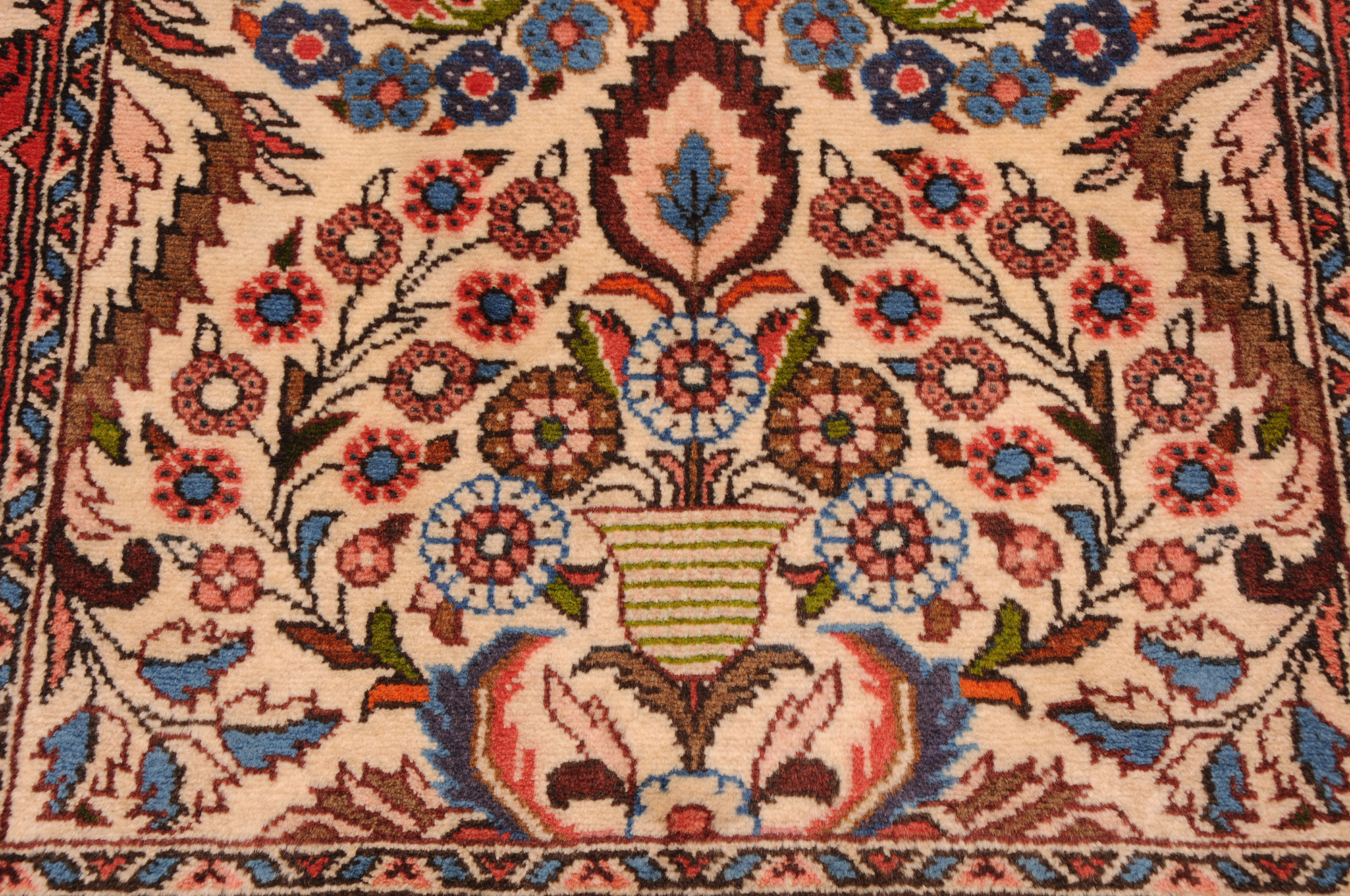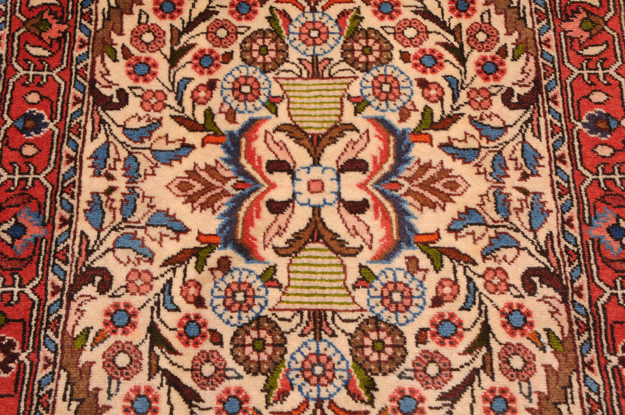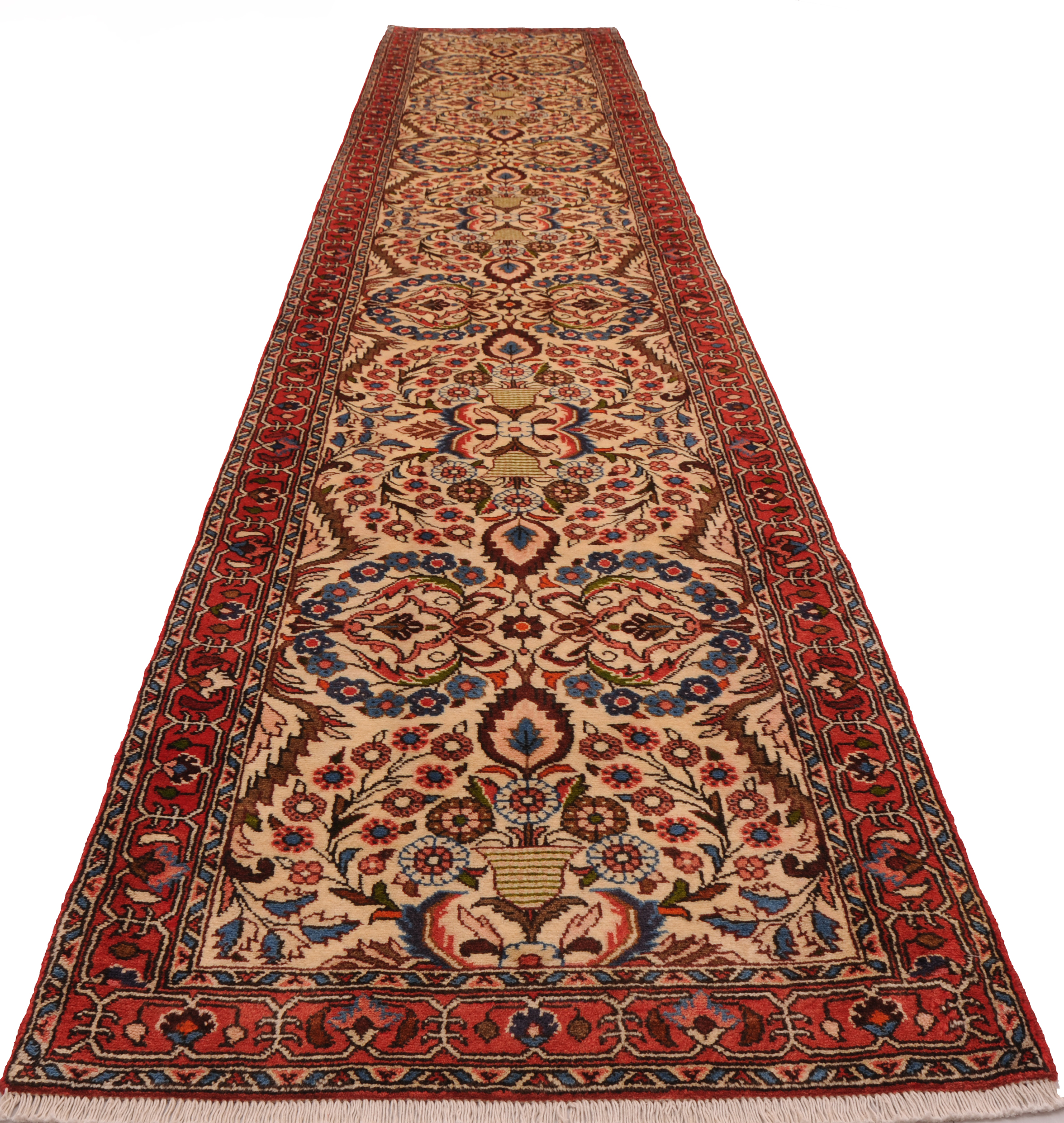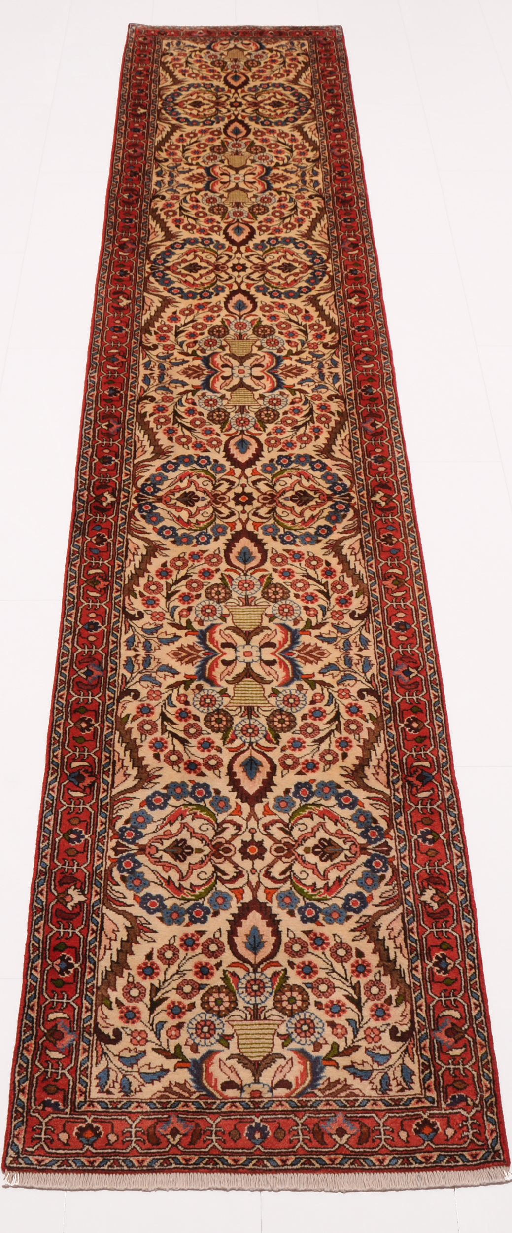 This Mehraban Persian rug, measuring 2’7″ x 13’9″, features a beautiful floral design in red, blue, brown, and green. Made from 100% wool with a medium pile height of 1/3″-3/8″, it has an approximate knot density of 196 KPSI. Perfect for adding a touch of elegance to any space.