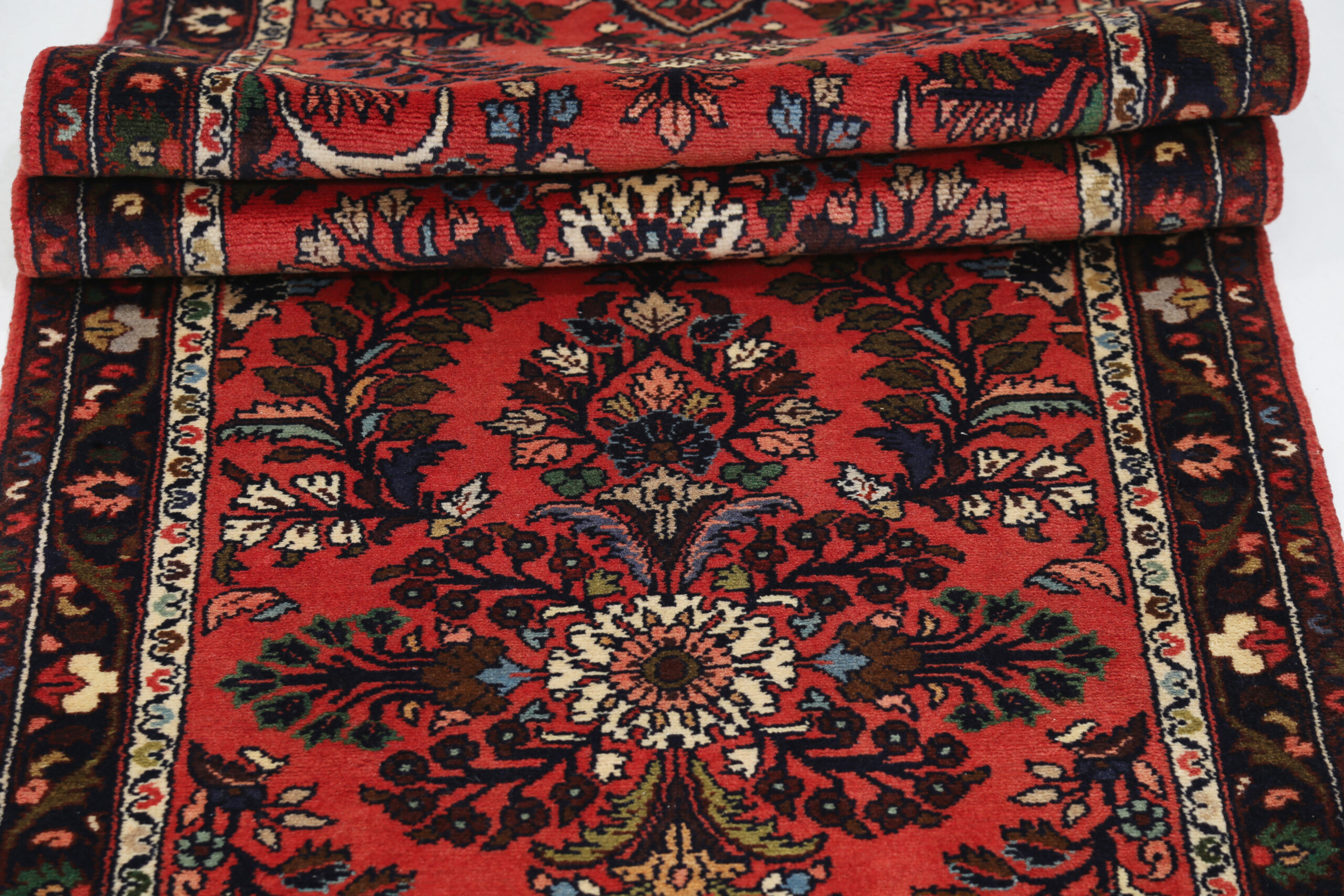This Mehraban Persian rug, measuring 2’7″ x 16’3″, features a beautiful floral design in blue, beige, green, and black. Made from 100% wool with a medium pile height of 1/3″-3/8″, it has an approximate knot density of 196 KPSI. Perfect for adding a touch of elegance to any space.