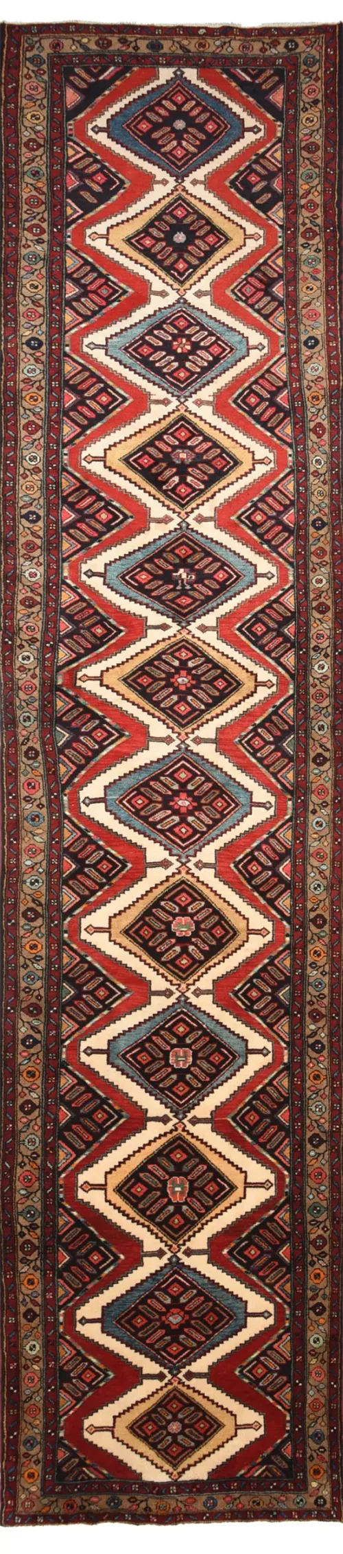 Measuring 3′ x 18’, it is beautifully patterned in beige, blue, brown, gray, and green, forming an enchanting Herati design. Made from all-natural materials – silk and wool pile, cotton foundation, and natural dyes, it took approximately 396 days of intricate hand knotting with a knot density of approx. 324 KPSI.
