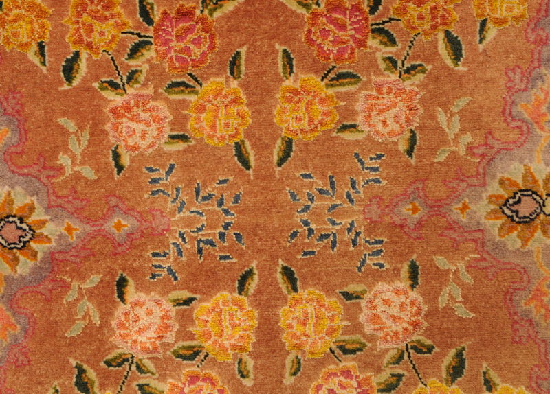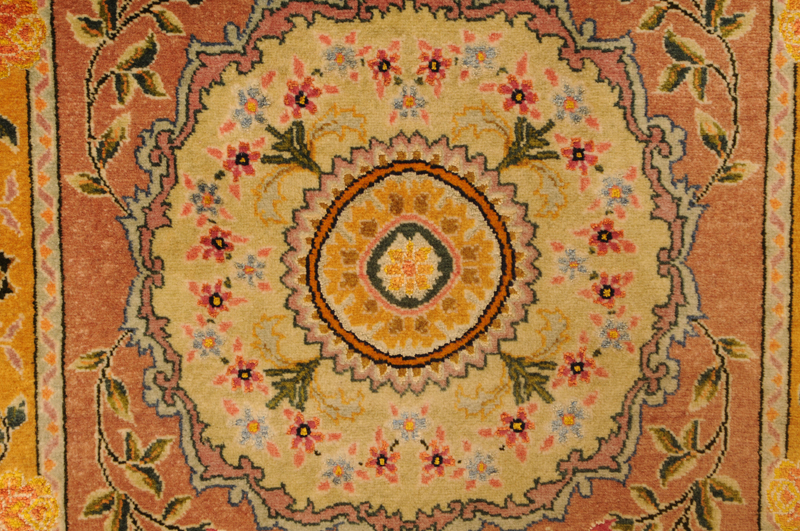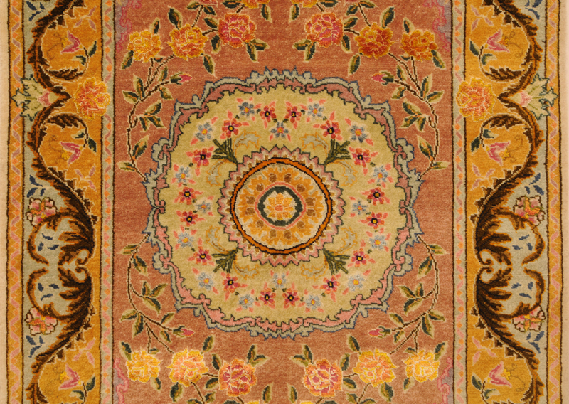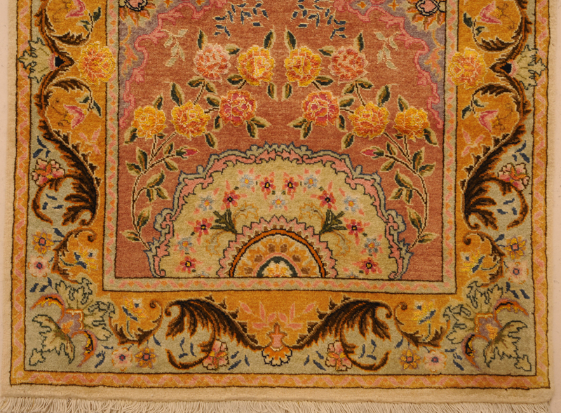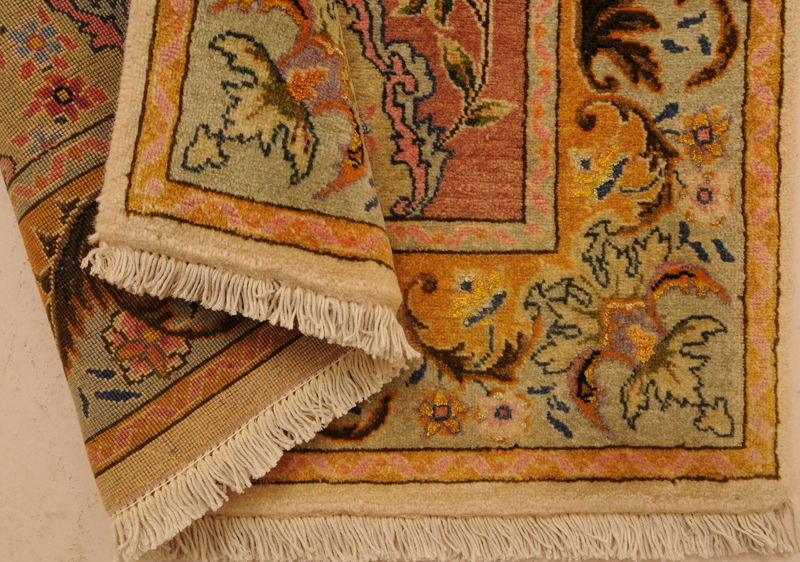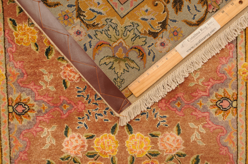 It features an exquisite floral design predominantly in shades of gold, green, peach, beige, and blue. You can see the dedication of Tabriz weavers in every inch of this rug, from the pattern to the handspun fibers to the knot density, which is an impressive 324 KPSI handknotting at approximately 374 days. It’s truly a work of art – and you’ll be proud to own one.