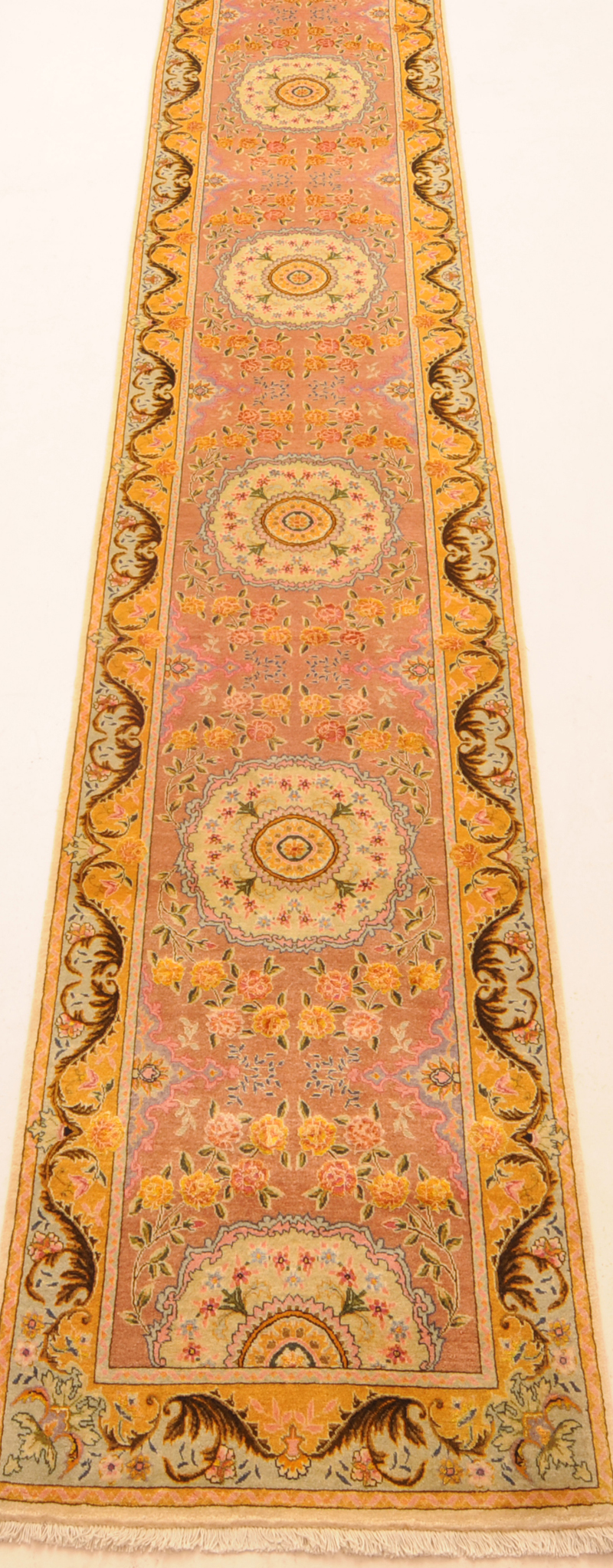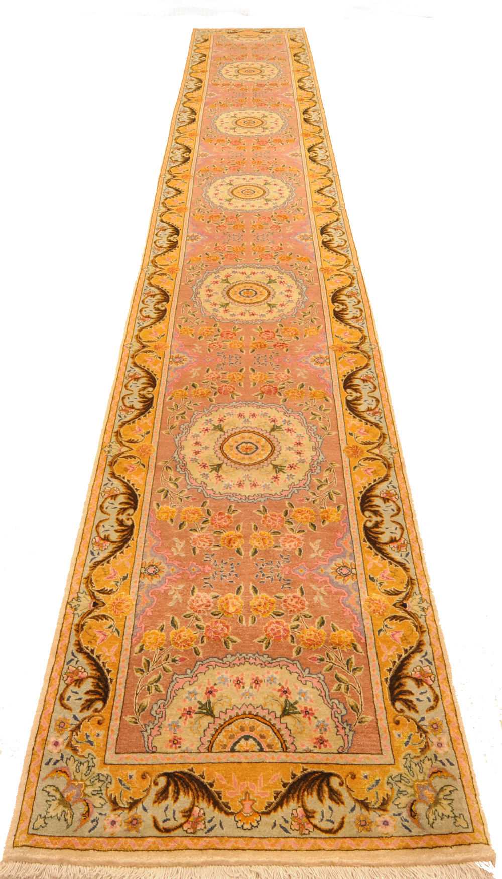 This 2’9″ x 17’6″ Persian Tabriz runner rug is hand-knotted with 100% handspun wool and silk pile, and all-natural dyes.
