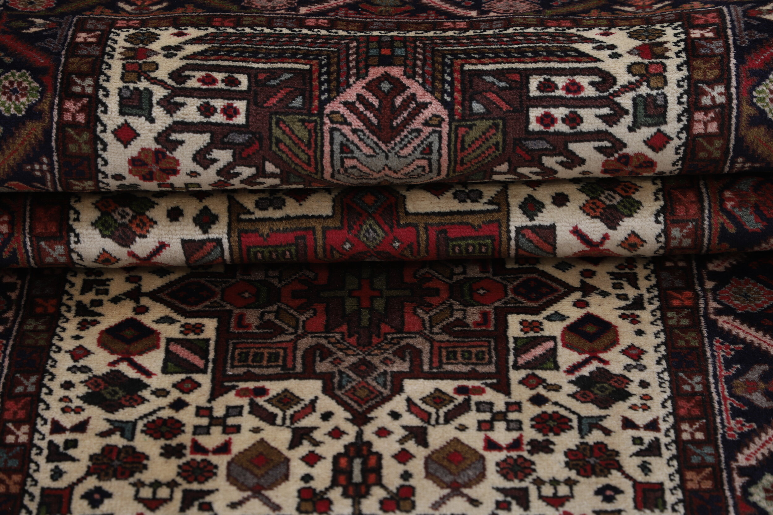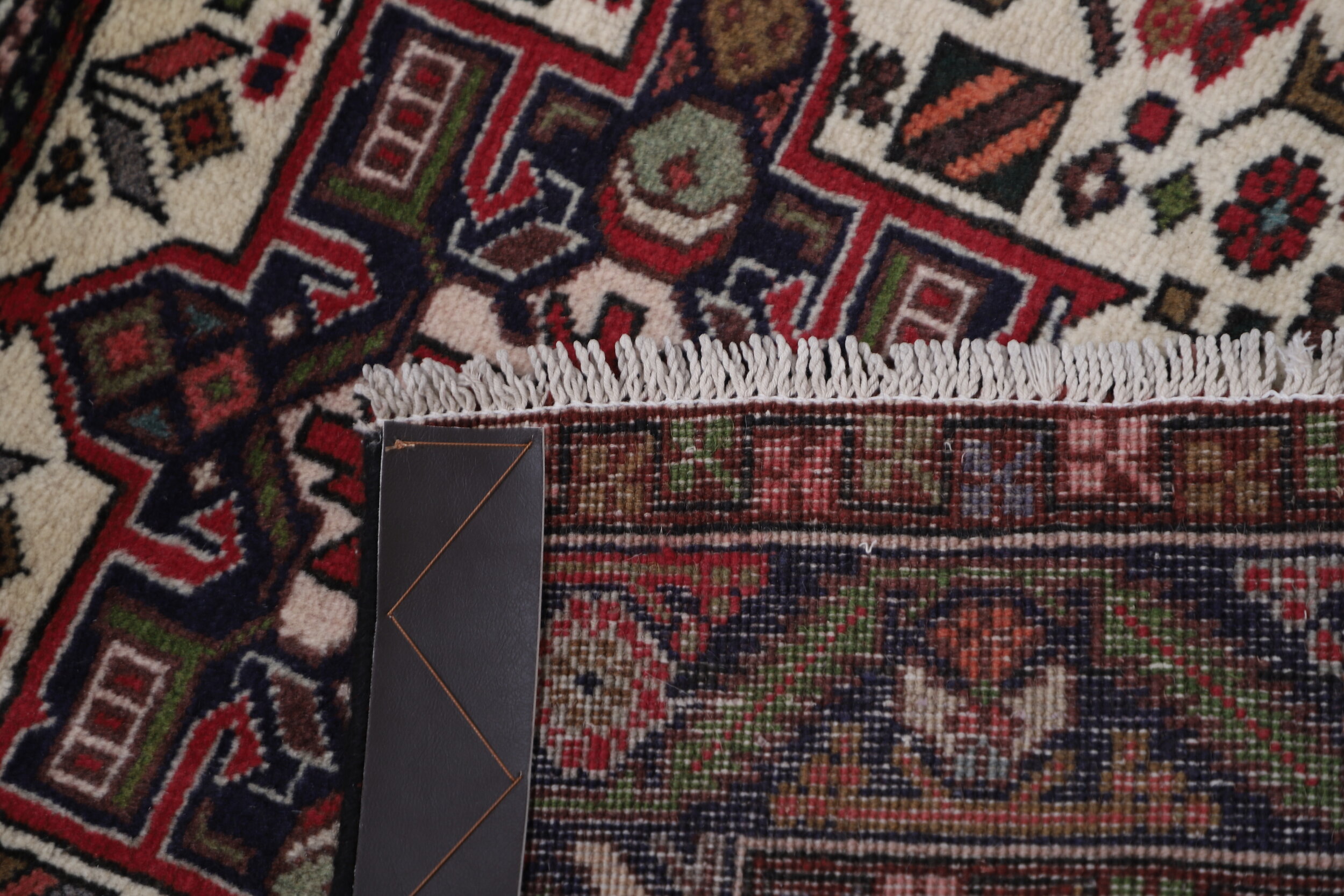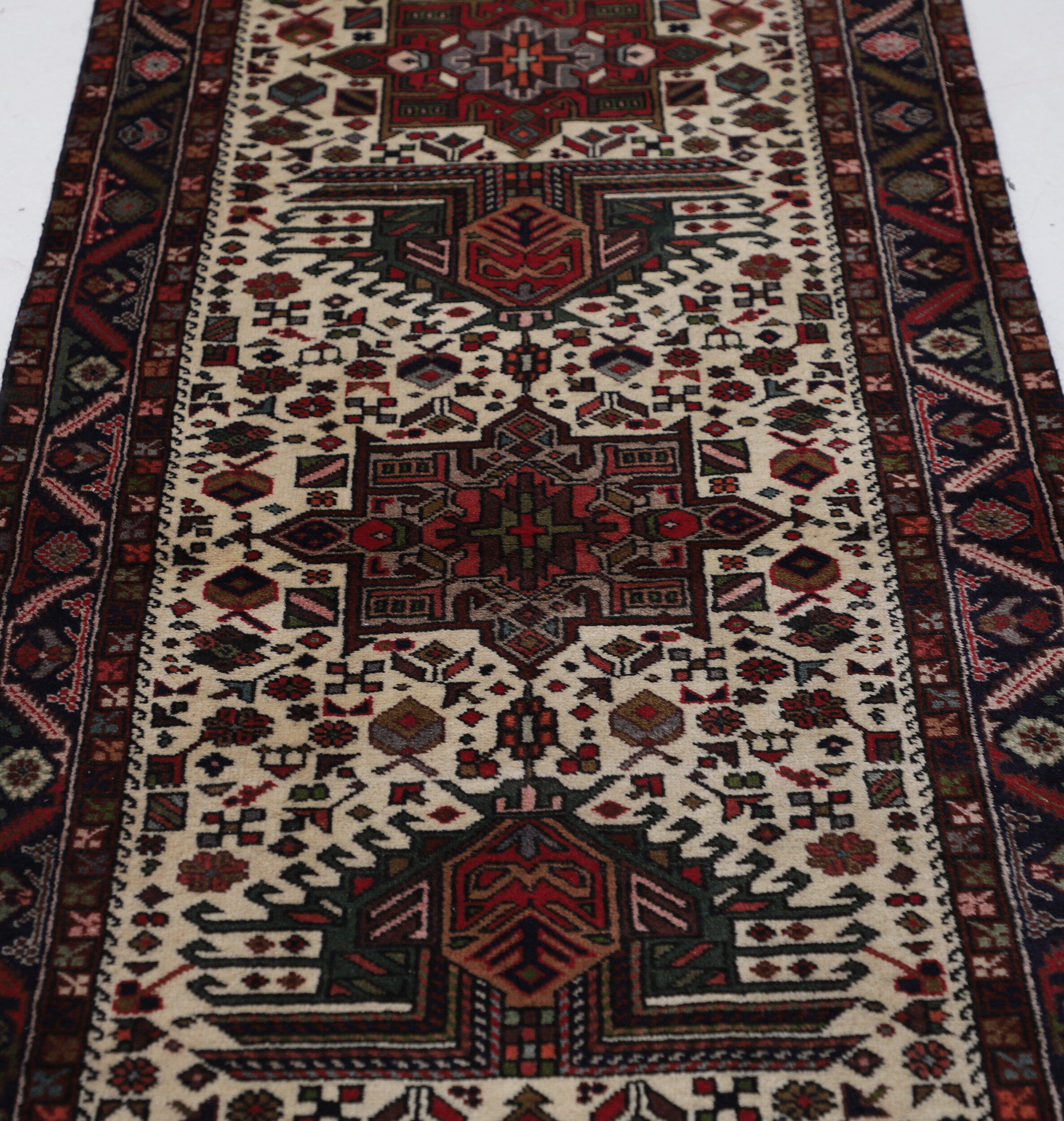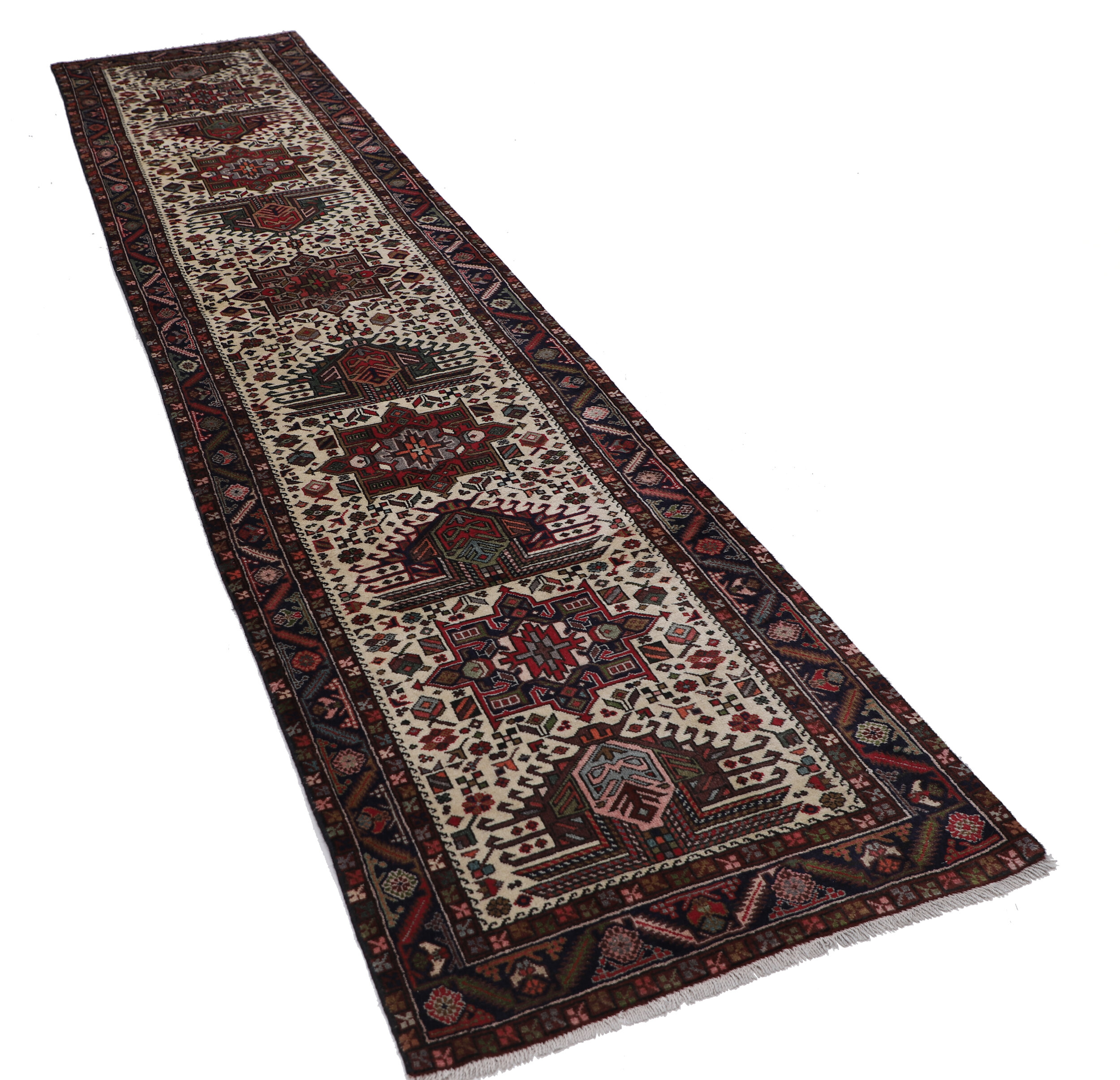 Hand Knotted Karaja Persian Rug: This exquisite rug measures 3′ x 12’10” and has a charming aged appearance, between 10-20 years old. The vibrant color combination of beige, red, and blue creates a captivating all-over design. With an approximate knot count of 156 KPSI, this rug is meticulously crafted using 100% wool on a cotton foundation. It features a medium pile height, ranging from 1/3″ to 3/8″, ensuring both comfort and durability. Add a touch of elegance to any space with this timeless and beautifully handcrafted Persian rug.