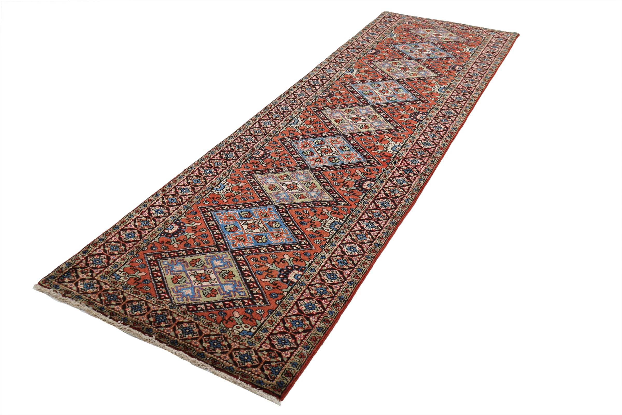 This Tabriz rug has a Orange field with a Blue border, featuring a Geometrical design. Made with 100% Wool with Cotton foundation. It has knot density of 196 kpsi.