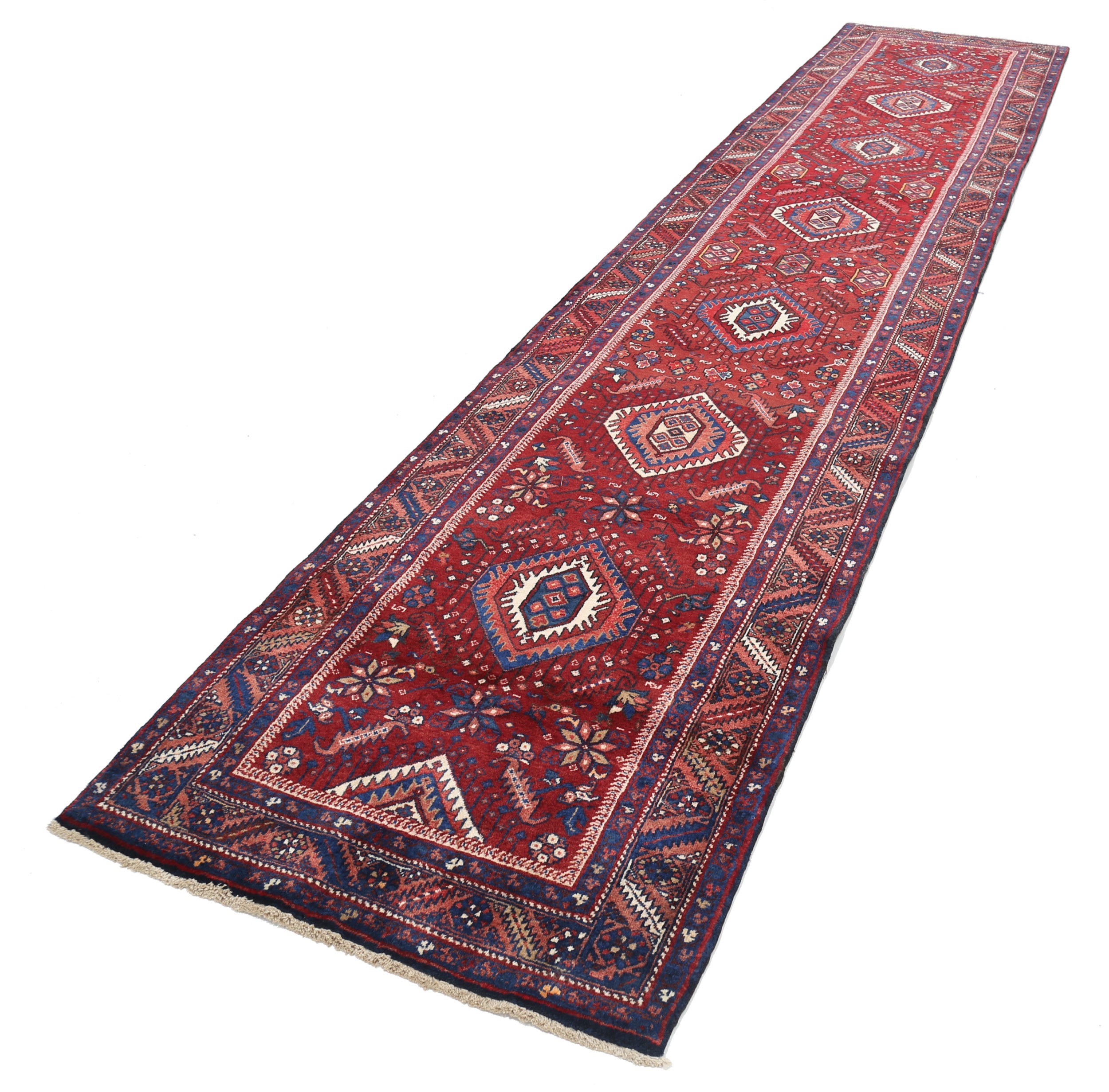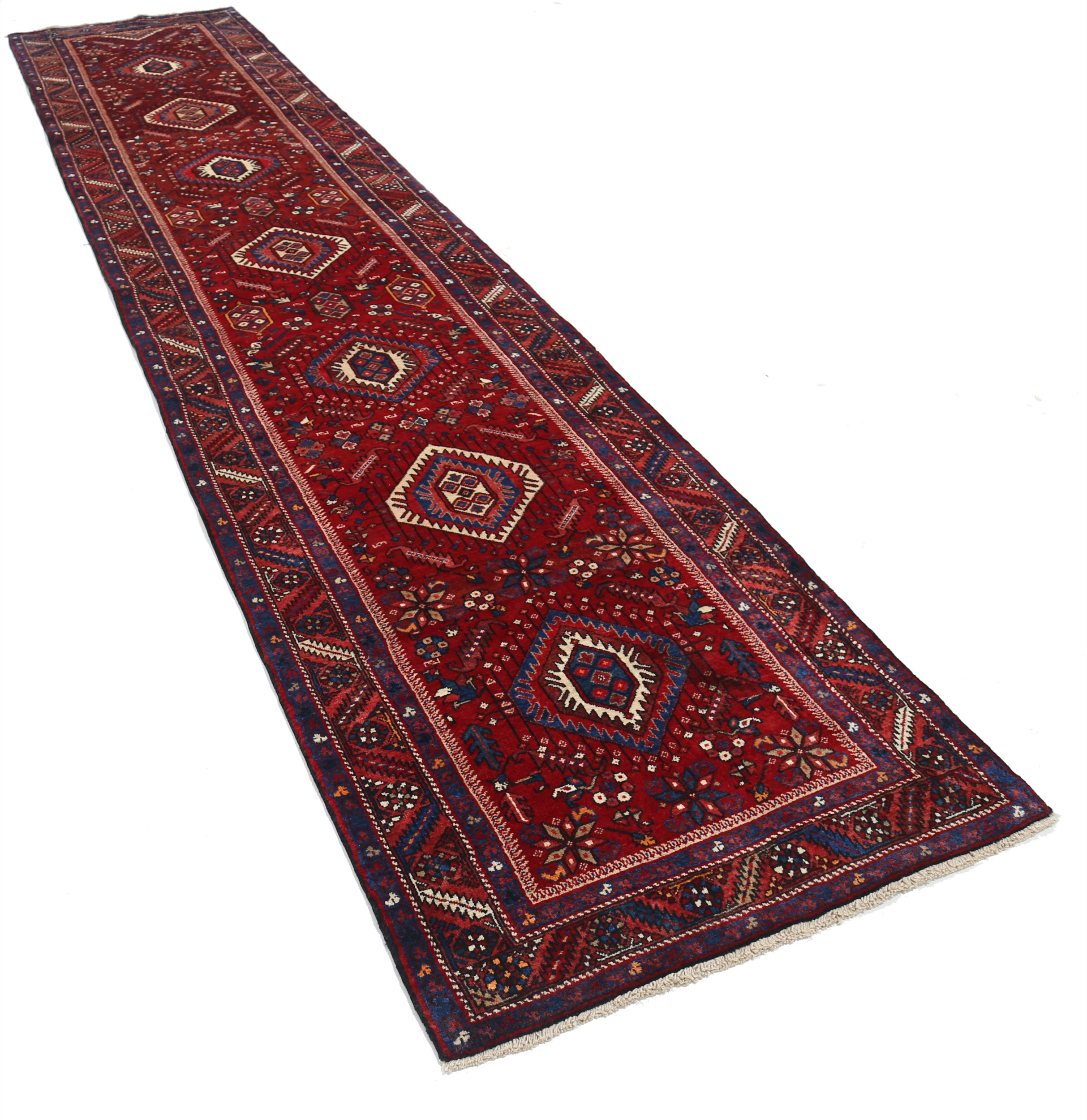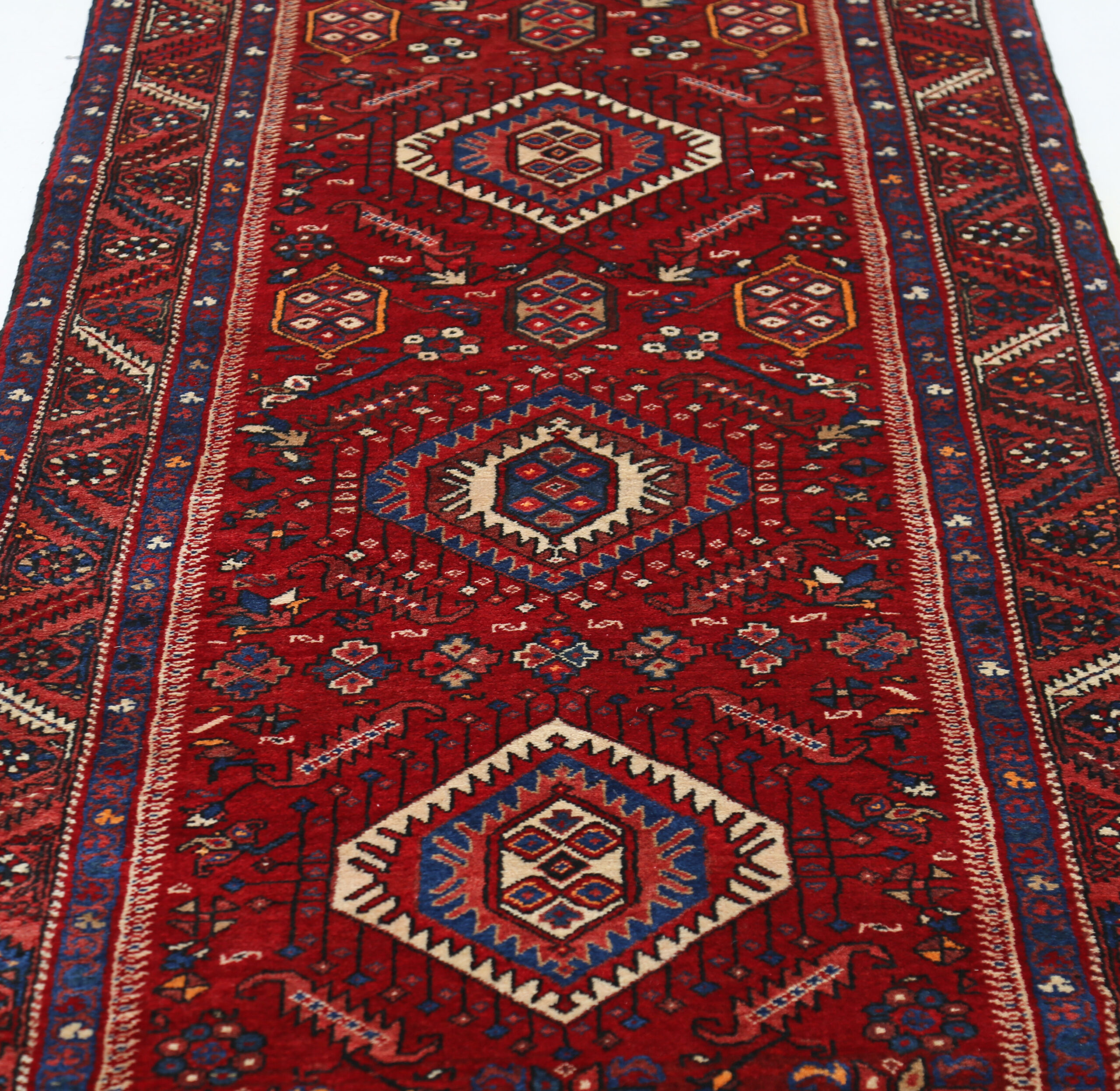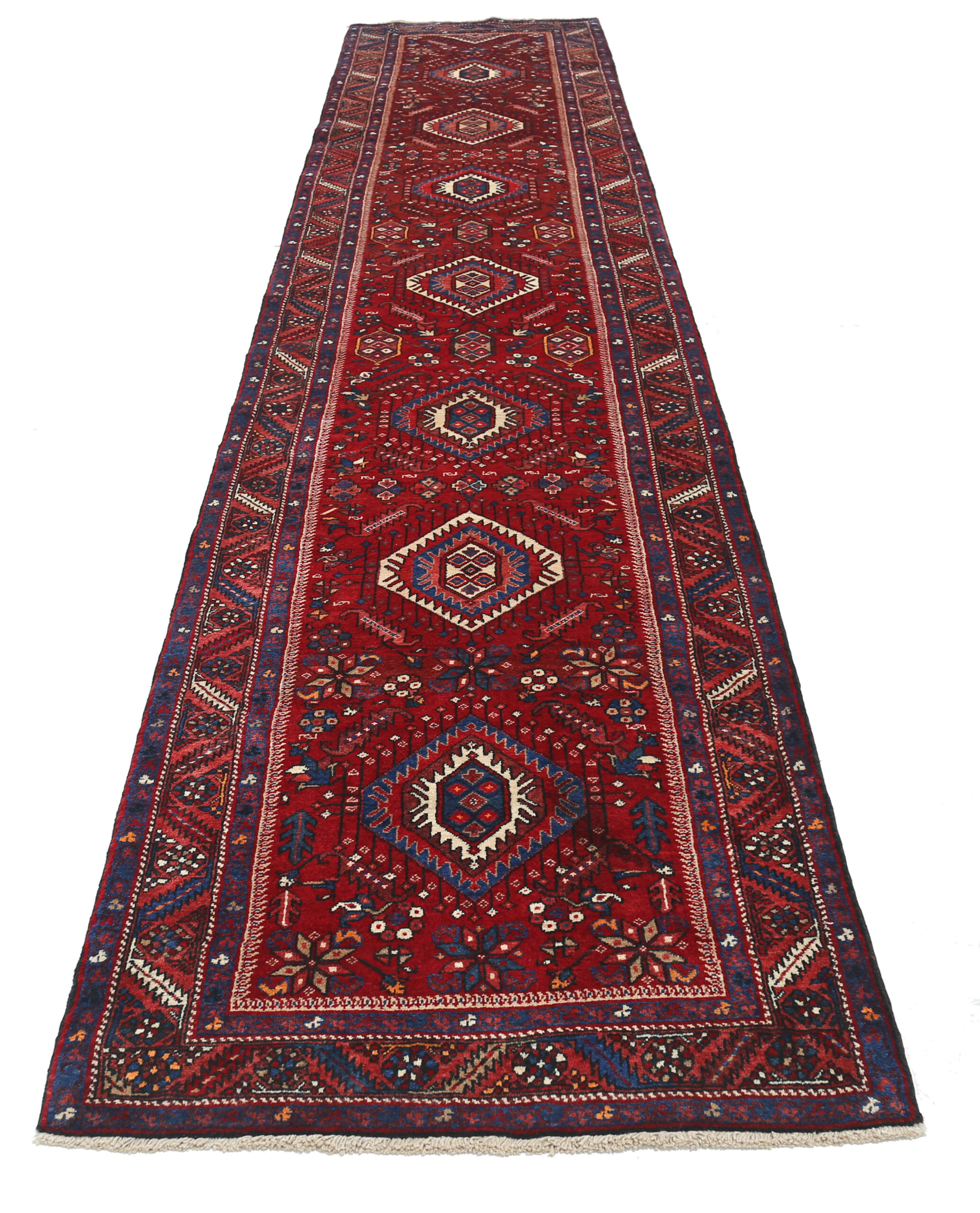 This Persian rug is a stunning piece with a rich history. Aged 40-50 years, it features a beautiful peach color with beige, blue, and brown accents. Made of 100% wool with a medium pile, it has a knot density of approximately 120 KPSI. Measuring 3’3″ x 15’2″, it is perfect for adding warmth and style to any space.
