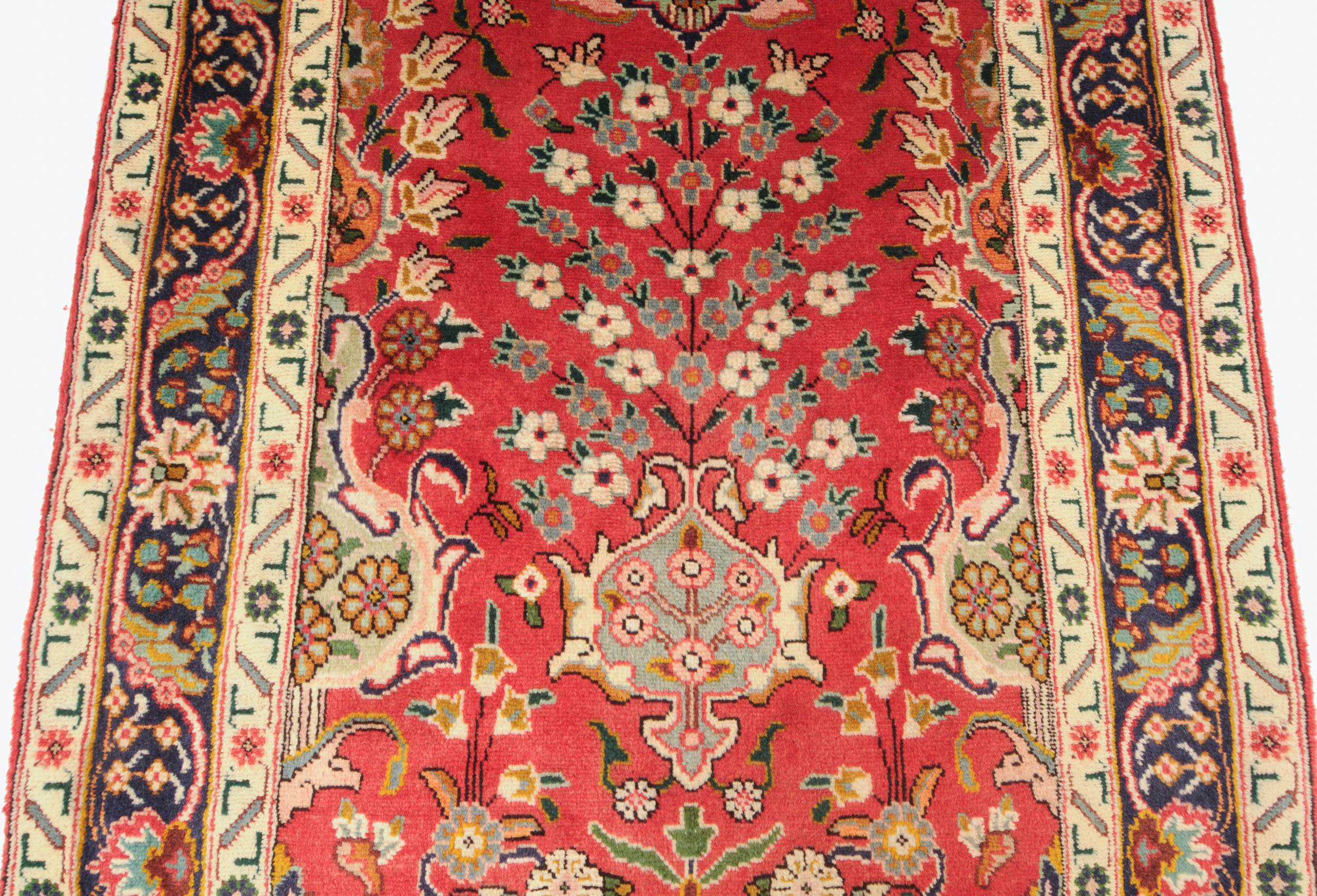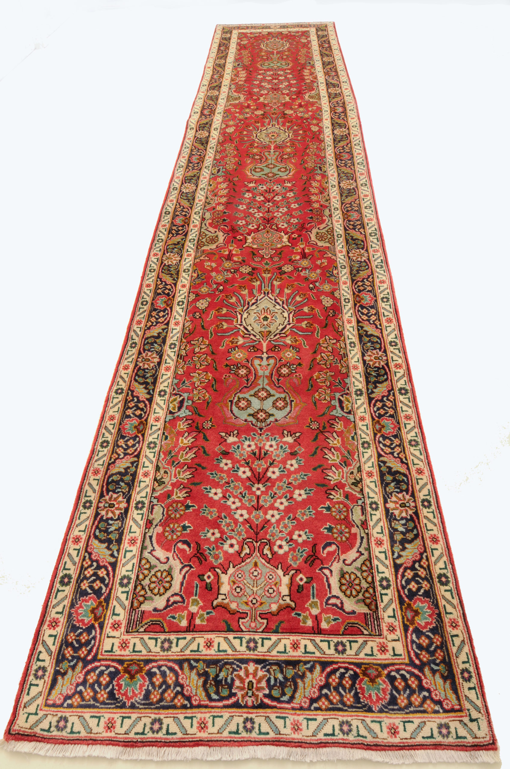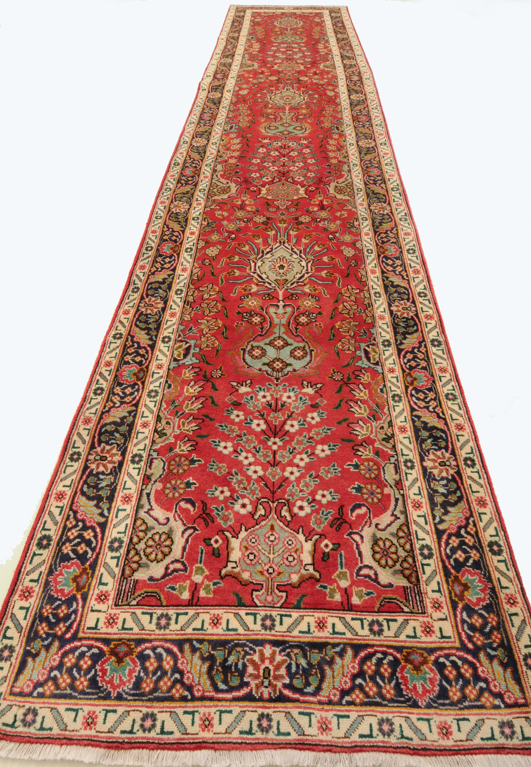 This Tabriz runner speaks of beauty with its stunning beige, blue, peach, green, brown, and red palette. With a 1/2″-5/8″ wool pile thickness, this runner rug offers a softer cushion for you to walk on your entryway or the bedroom.