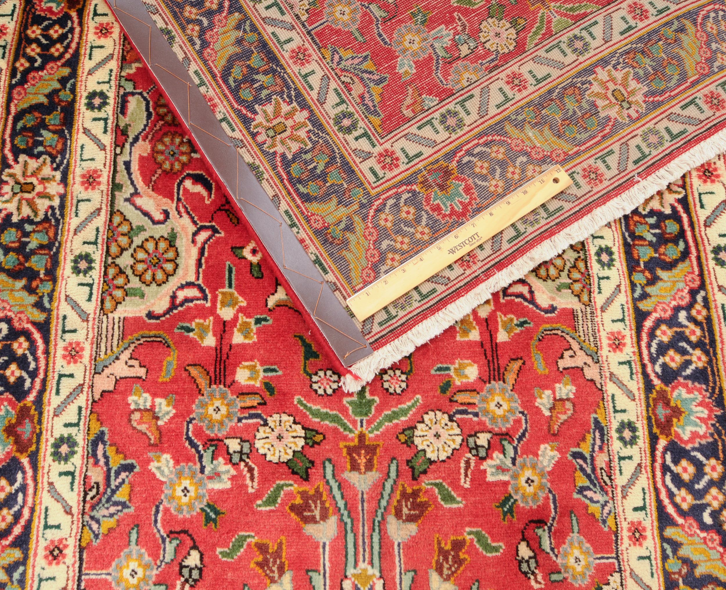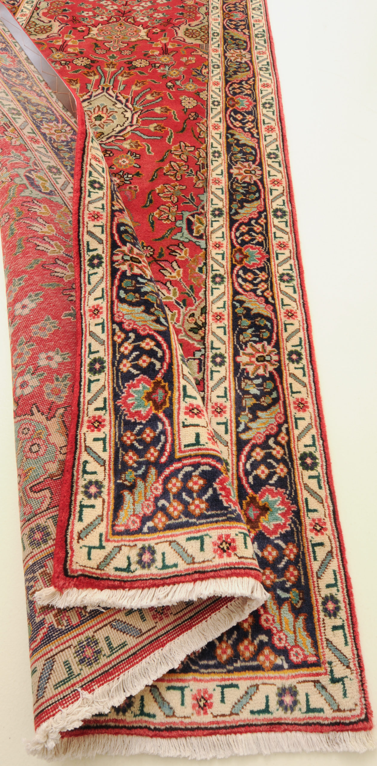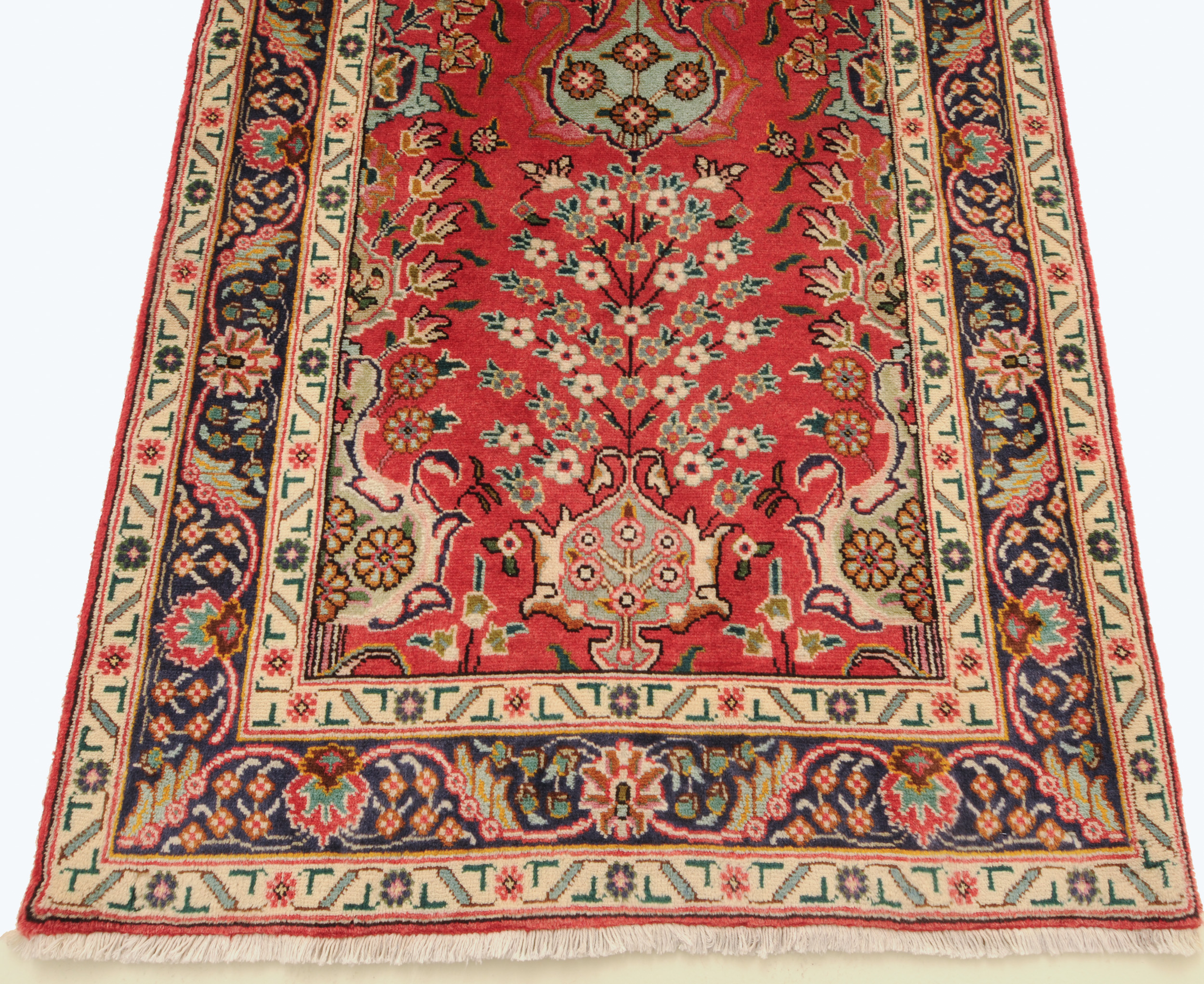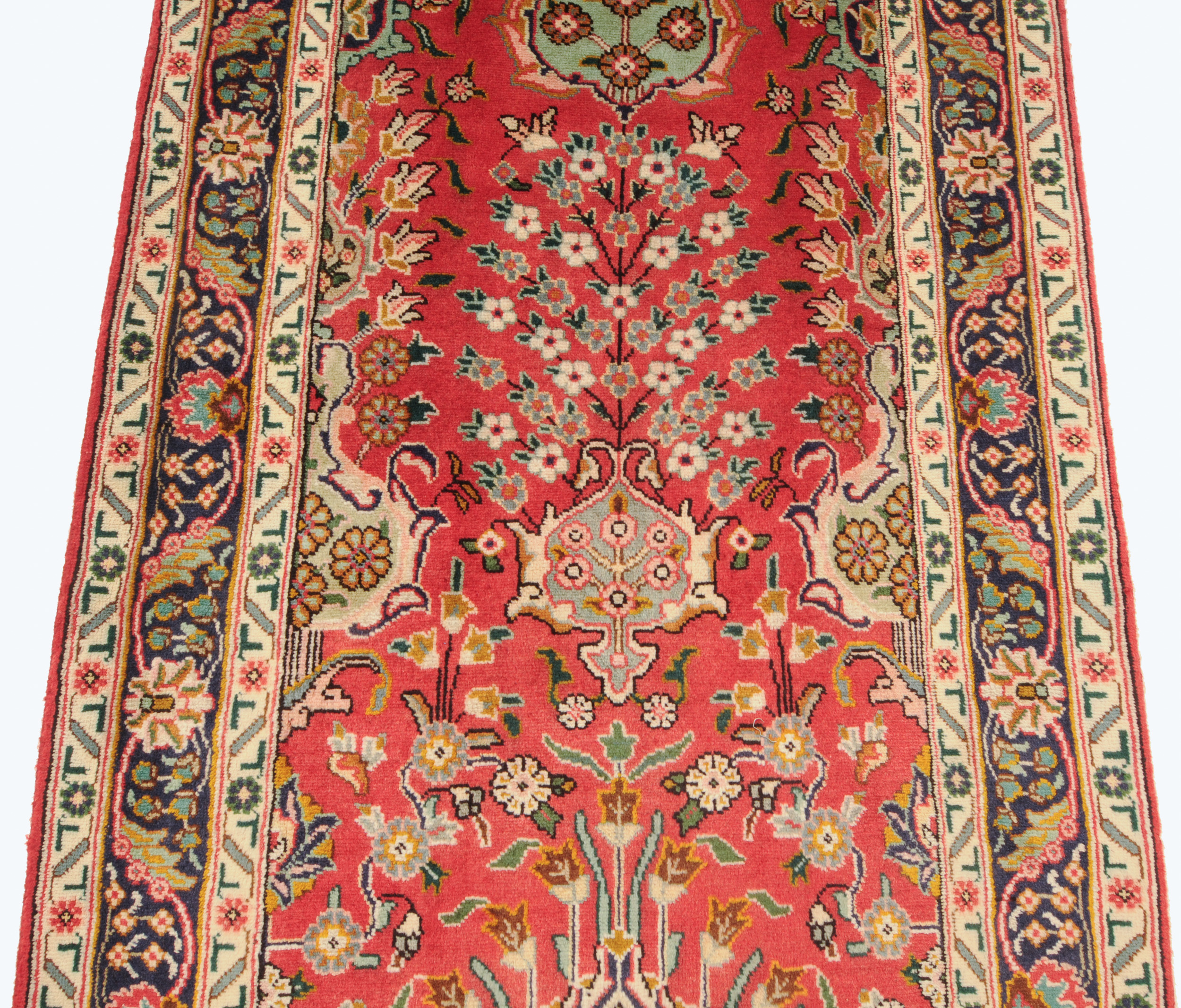 This Tabriz runner speaks of beauty with its stunning beige, blue, peach, green, brown, and red palette. With a 1/2″-5/8″ wool pile thickness, this runner rug offers a softer cushion for you to walk on your entryway or the bedroom.