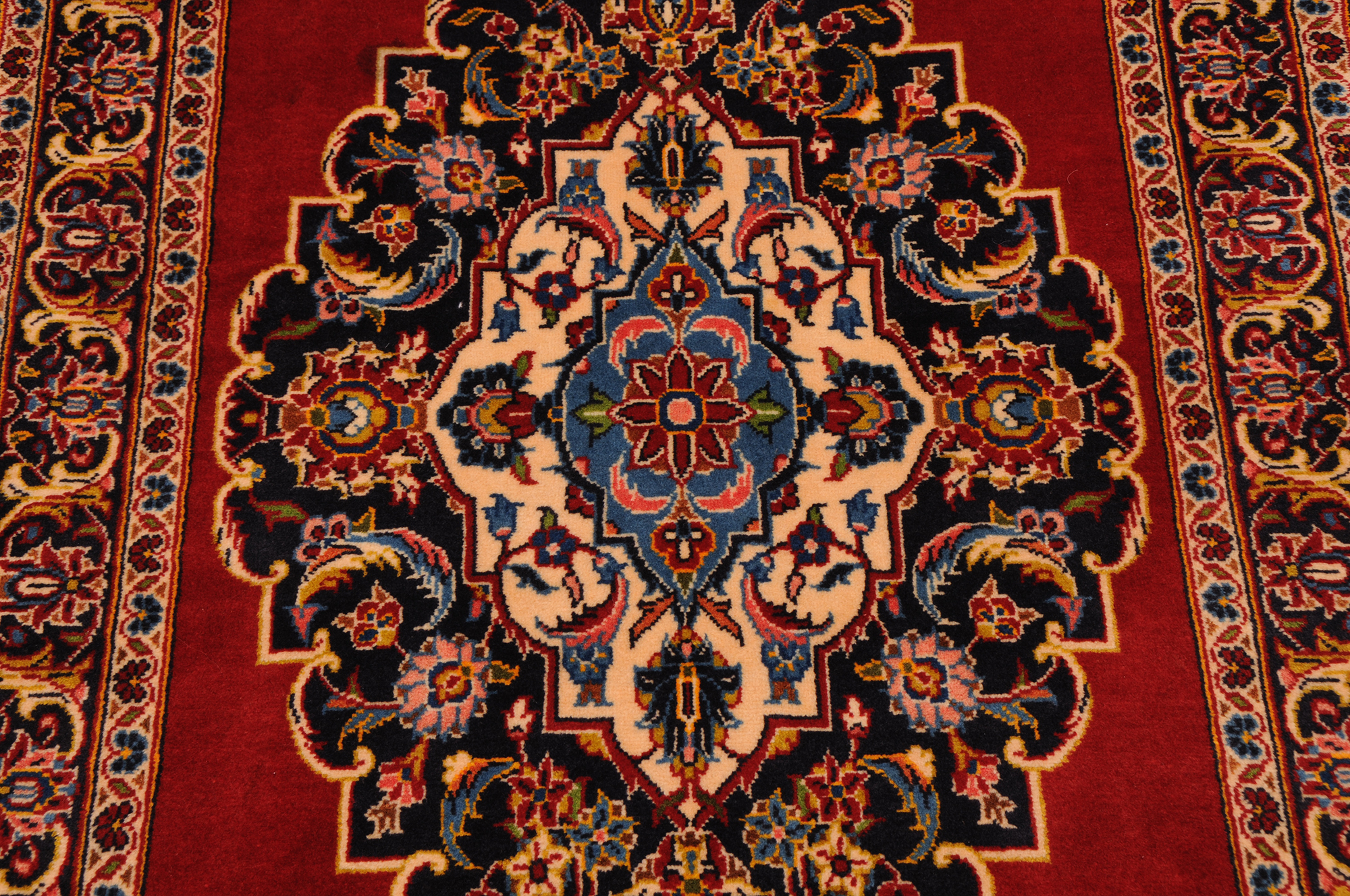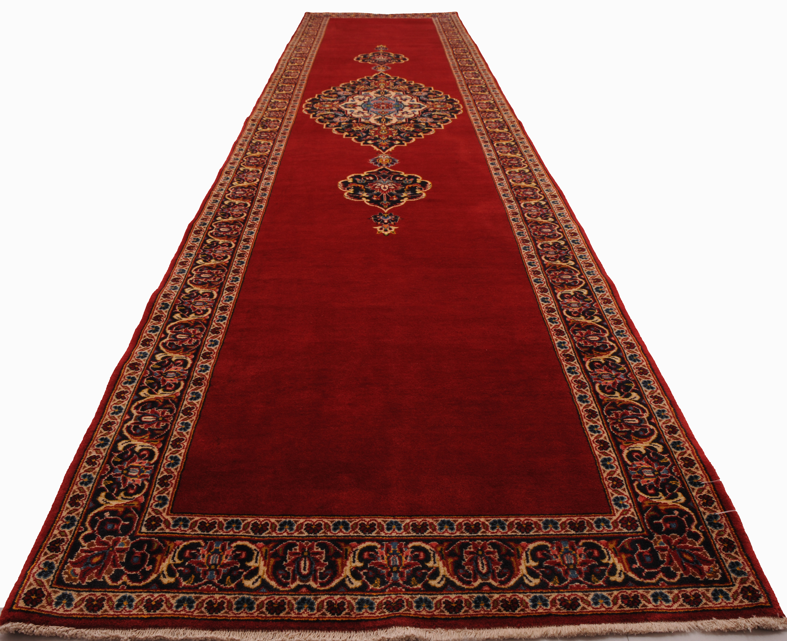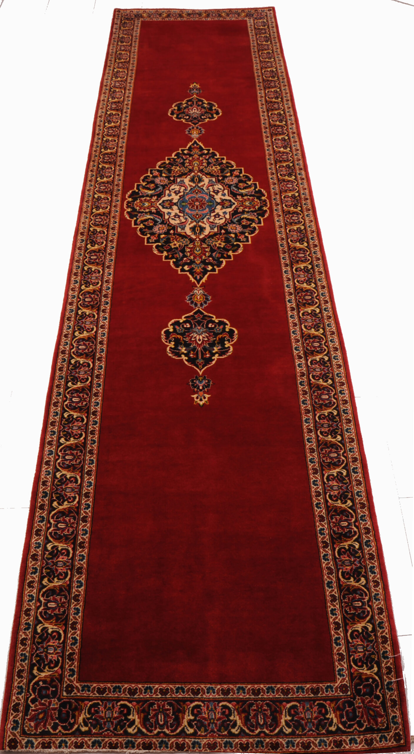 Hand Knotted Kashan rug with dimensions of 3’3″ x 16’2″. This rug has an aged appearance, estimated to be around 40-50 years old. The colors featured are red and blue on an open field. The rug has a density of approximately 196 knots per square inch (KPSI). Made from 100% wool with a high pile measuring 1/2″ to 5’8″. It also contains cotton.