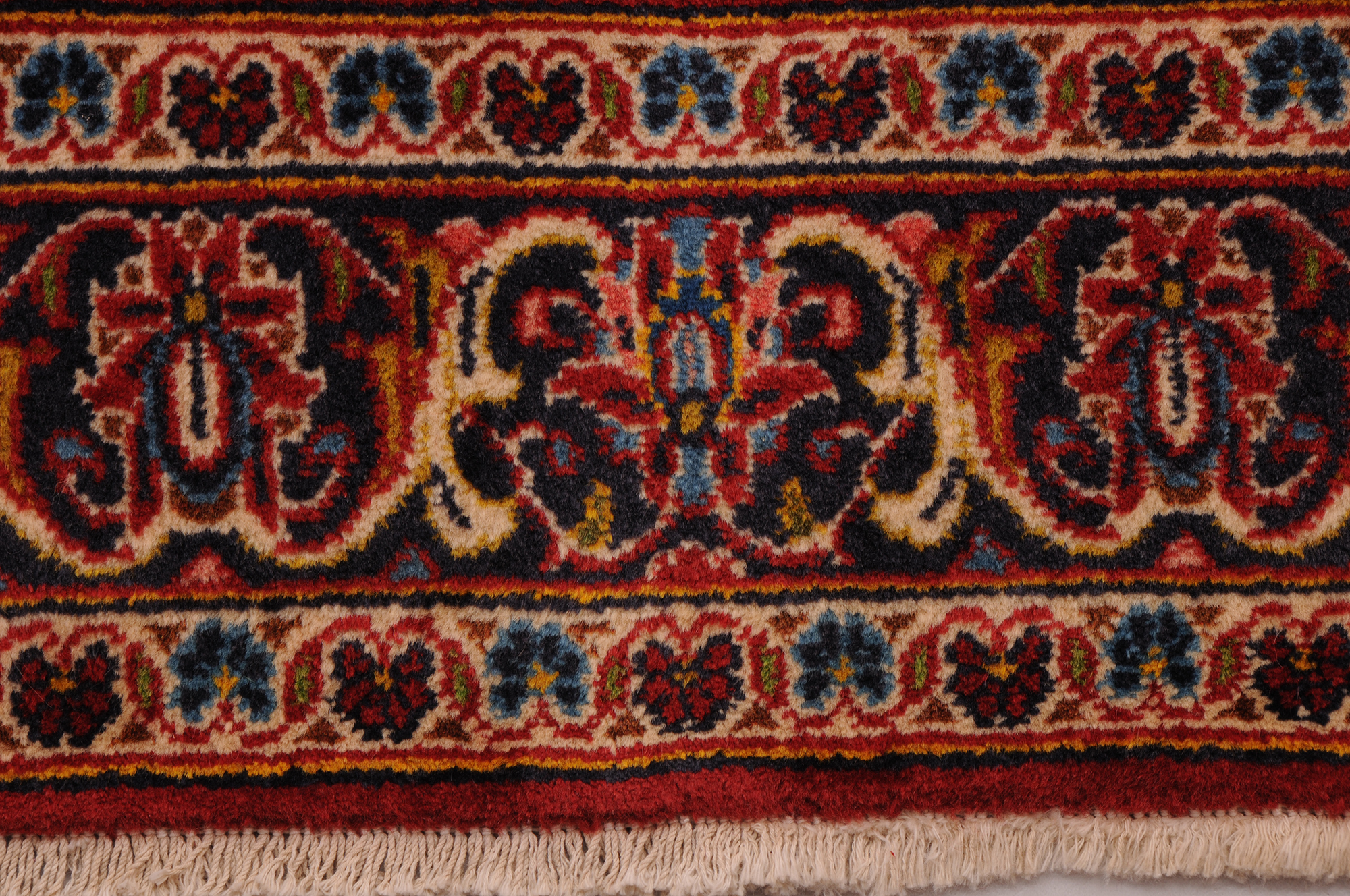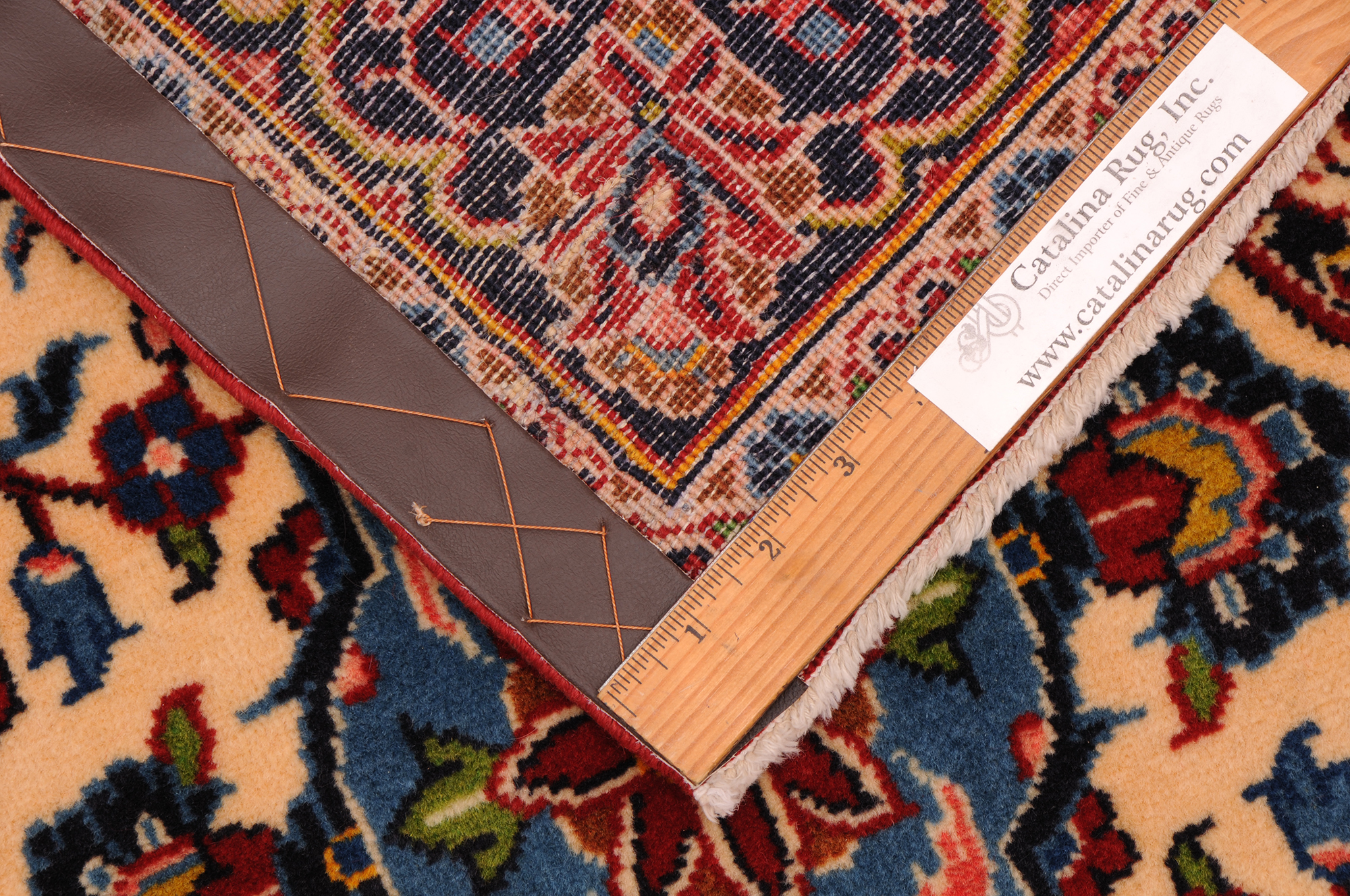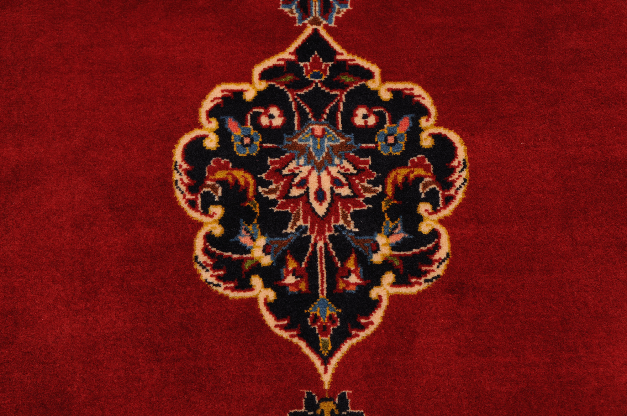 Hand Knotted Kashan rug with dimensions of 3’3″ x 16’2″. This rug has an aged appearance, estimated to be around 40-50 years old. The colors featured are red and blue on an open field. The rug has a density of approximately 196 knots per square inch (KPSI). Made from 100% wool with a high pile measuring 1/2″ to 5’8″. It also contains cotton.