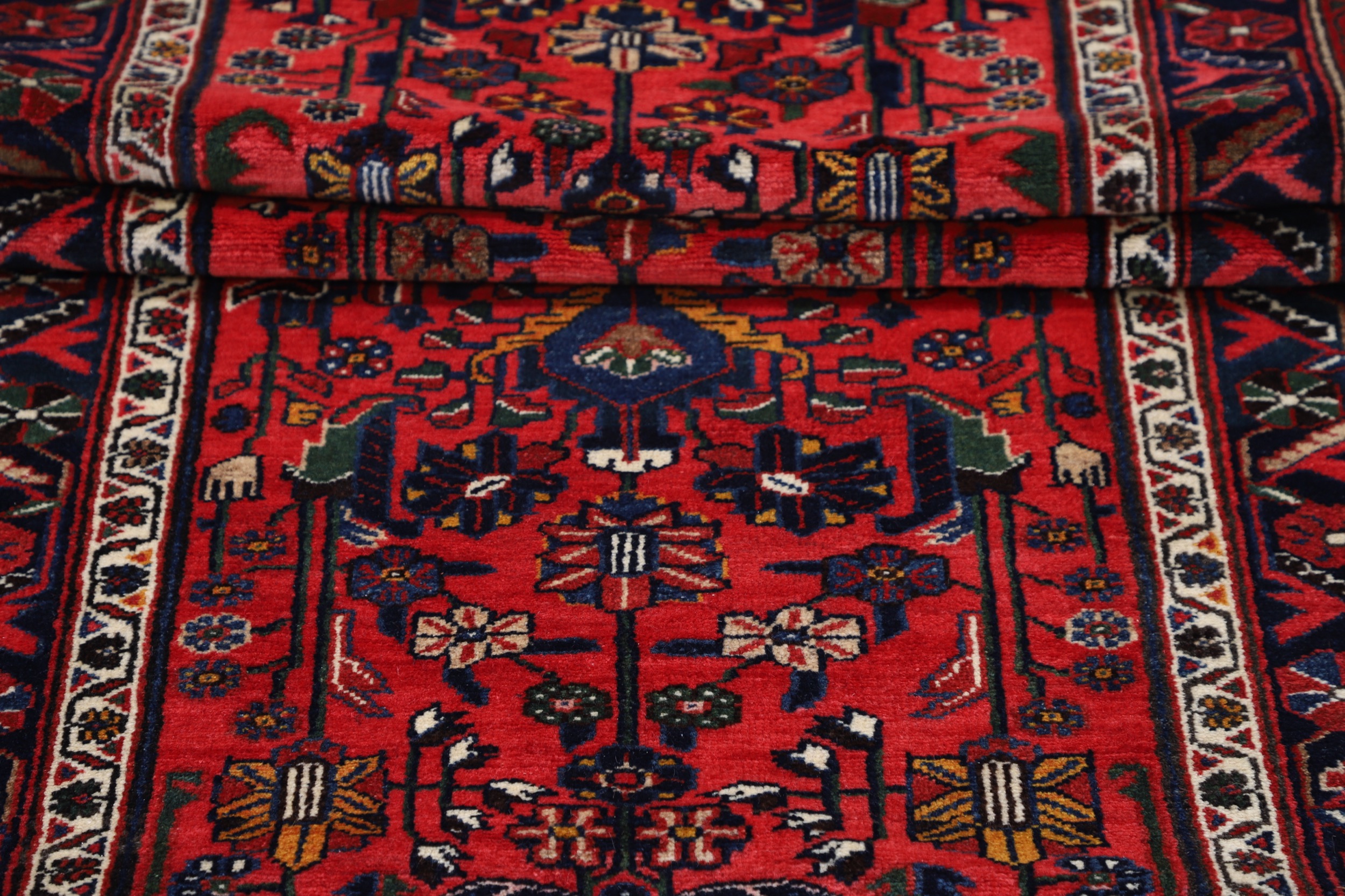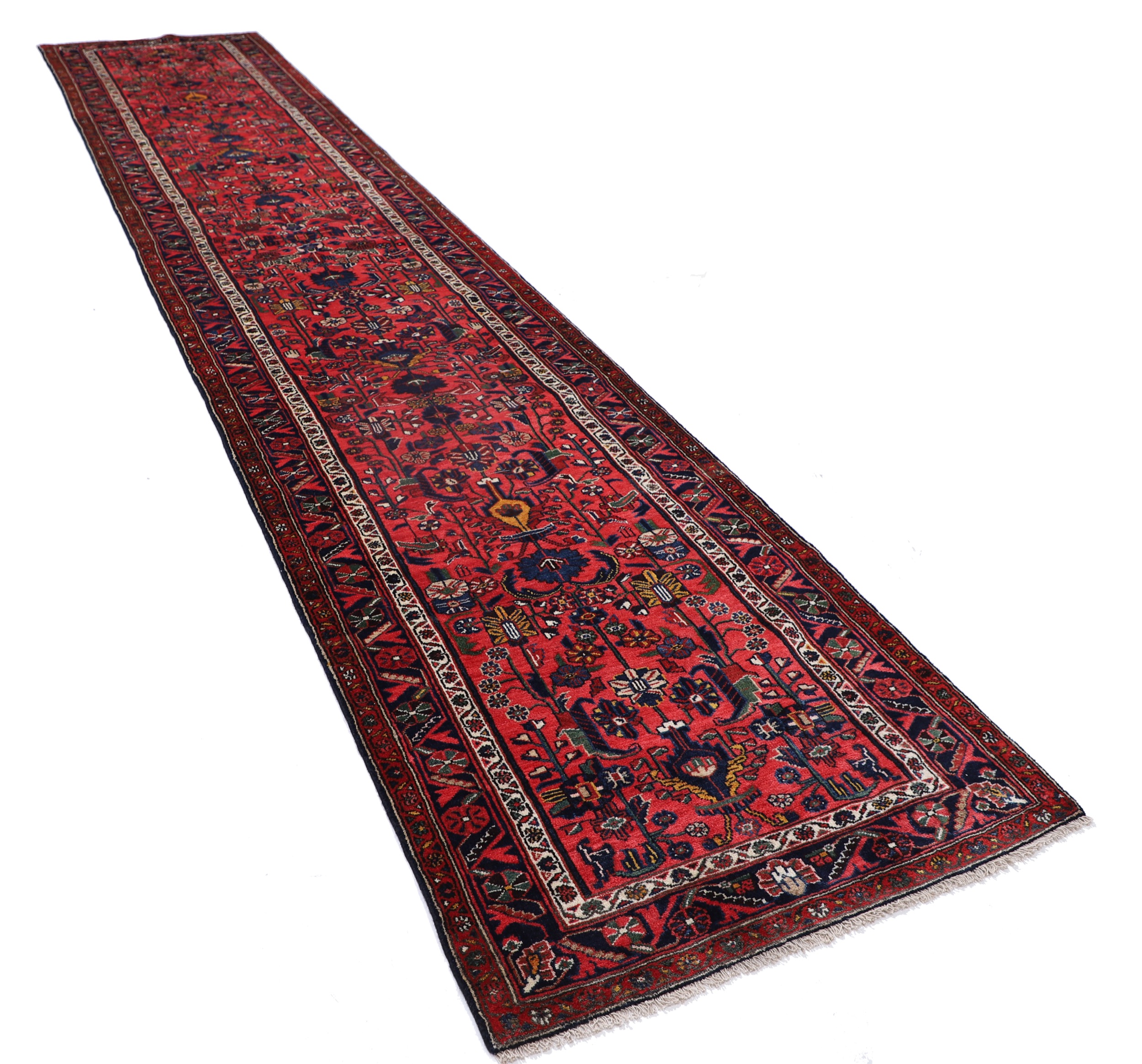 This aged Persian rug features an intricate floral design in rich red and blue hues. Hand knotted with 100% wool on a cotton base, this Mehraban rug boasts a medium pile height of 1/3″ – 3/8″ and a knot density of approximately 225 knots per square inch (KPSI). Measuring at 3’4″ x 16’10”, this stunning piece is sure to add warmth and depth to any room.