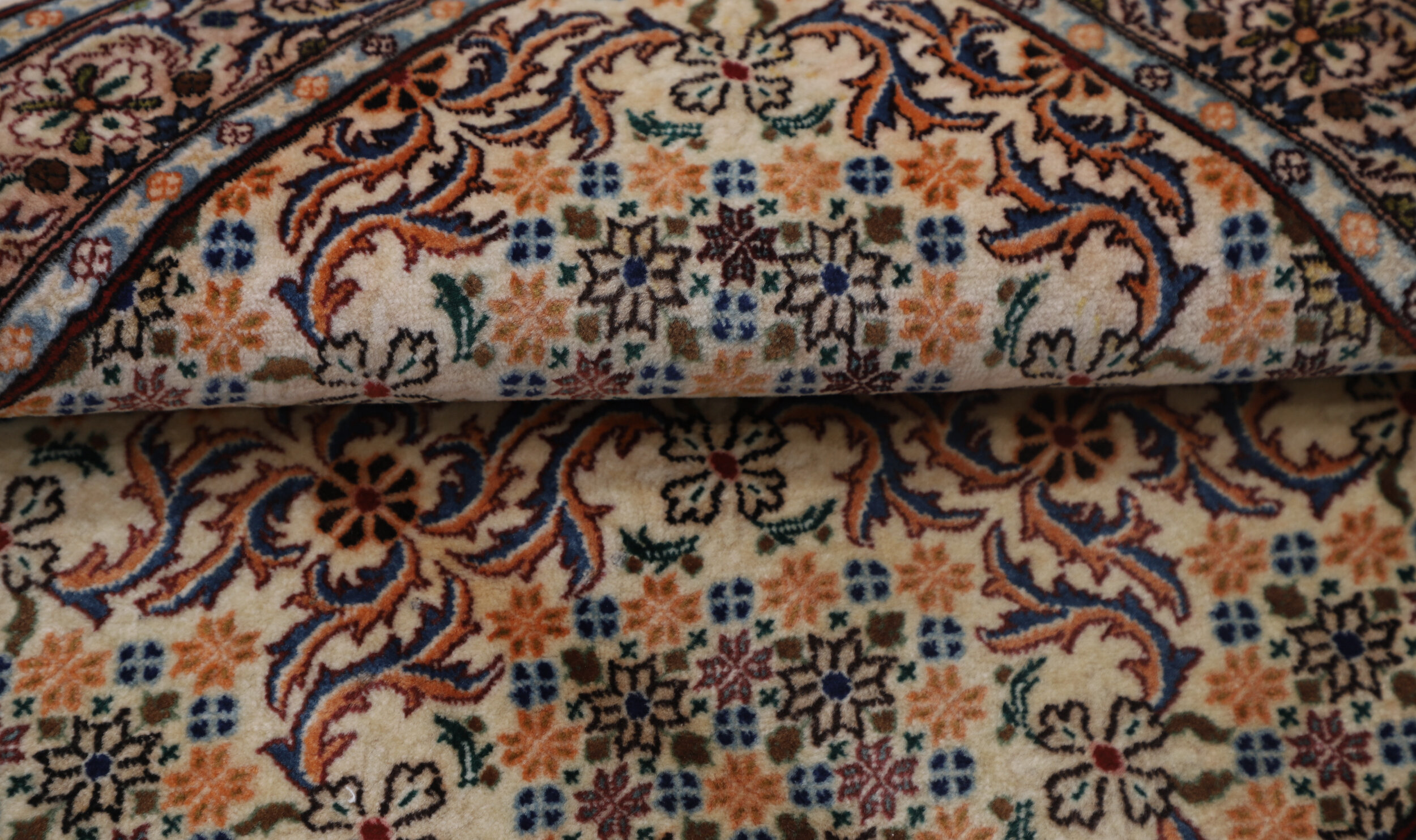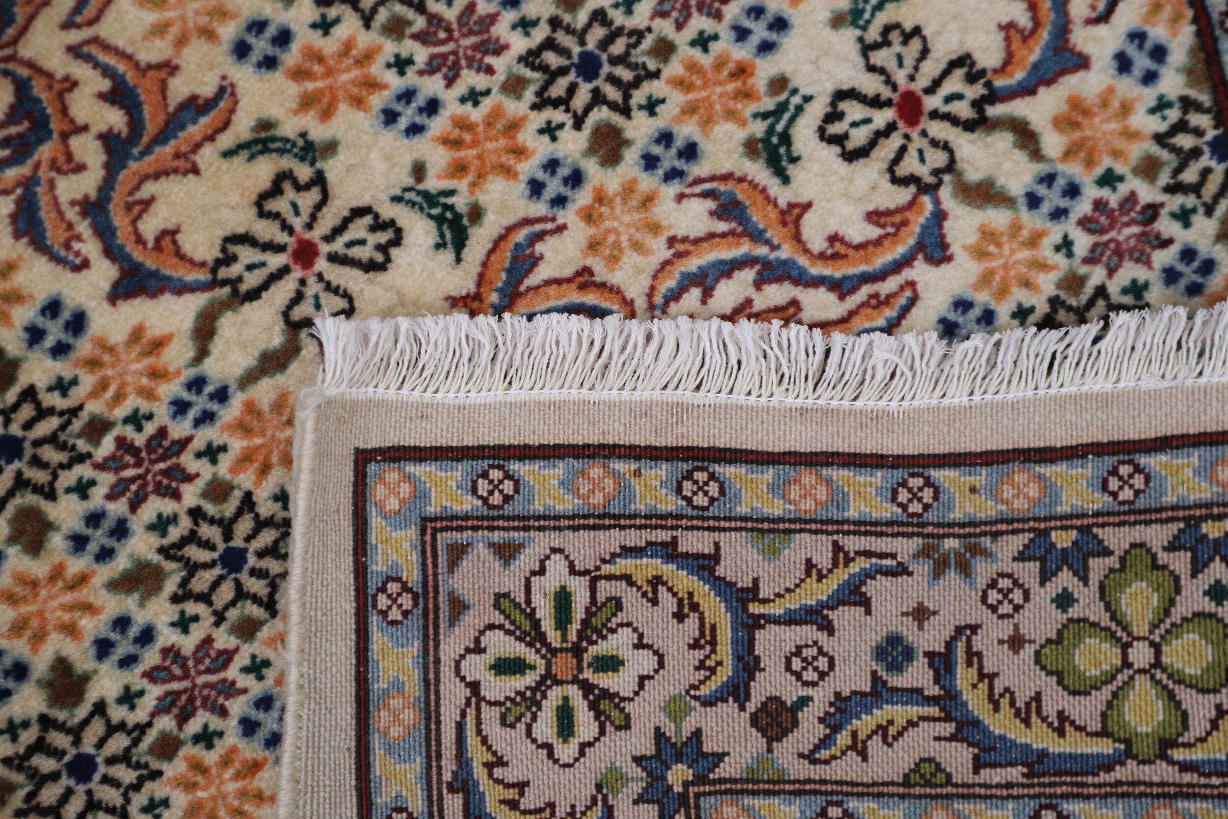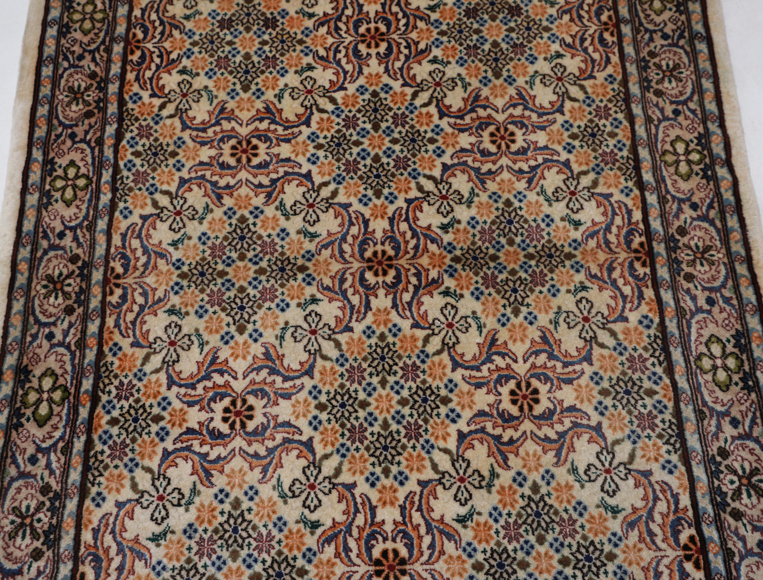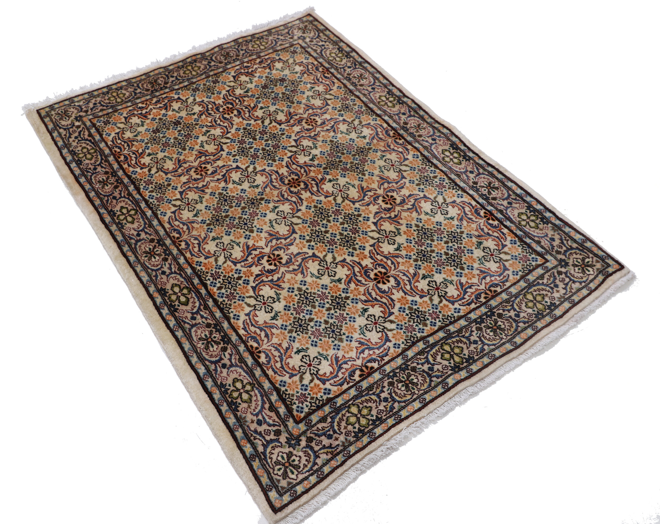 This exquisite Persian rug is a hand-knotted Sarouk with dimensions of 3’5″ x 4’10”. The rug features a beautiful blend of Peach and red colors, adorned with a Floral pattern. The rug is aged between 10-20 years and has a KPSI of approximately 256. It is made of 100% wool and cotton, and has a medium pile of 1/3″-3/8″. This unique rug is a perfect addition to any room and is sure to impress with its exceptional quality and intricate design.