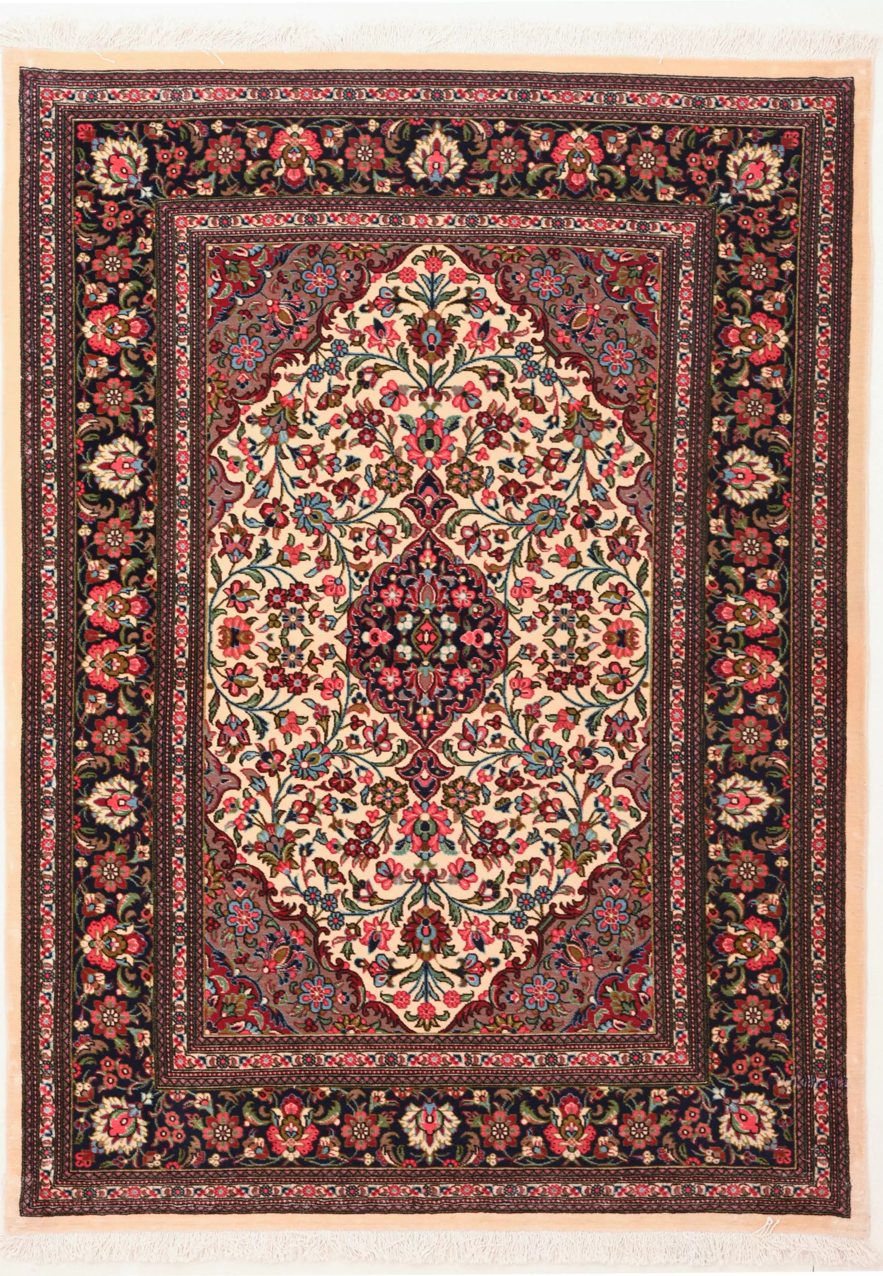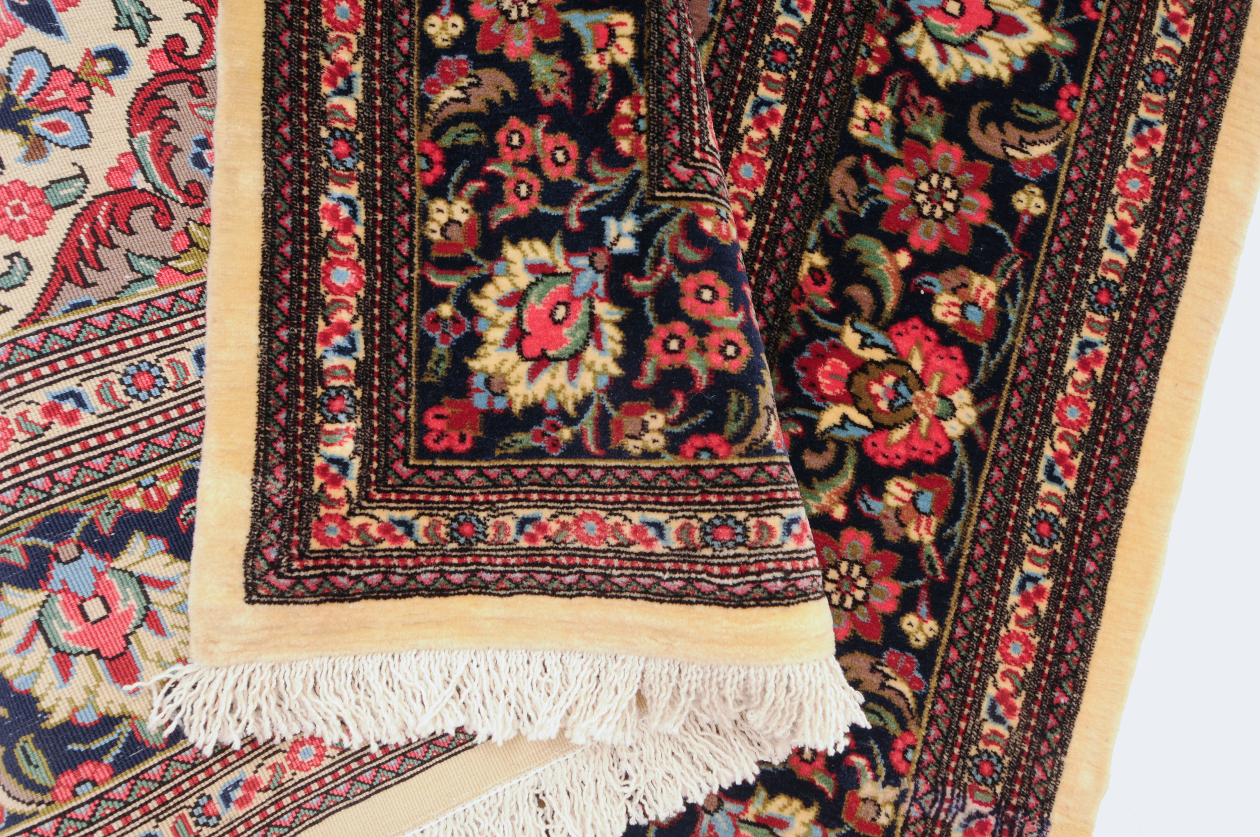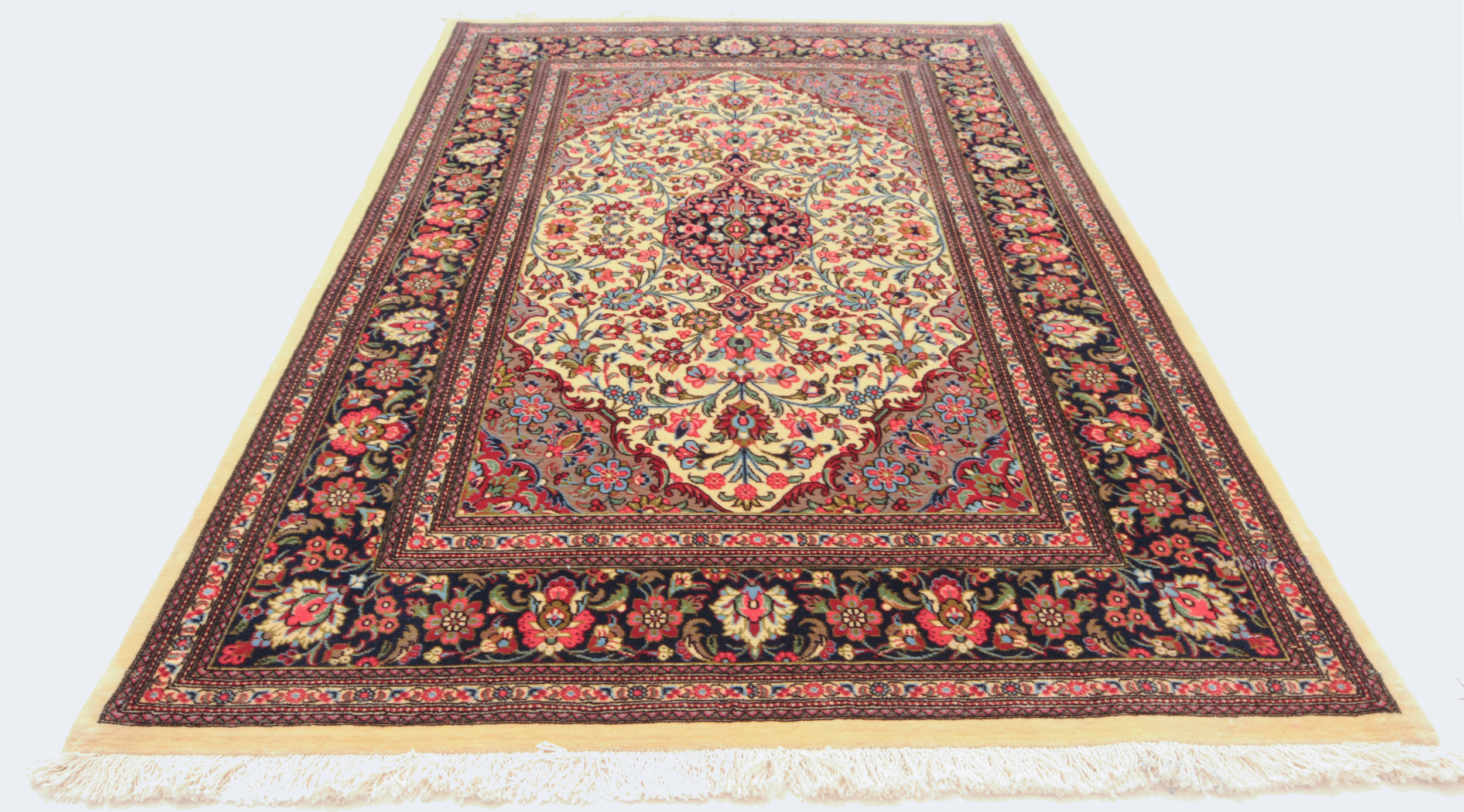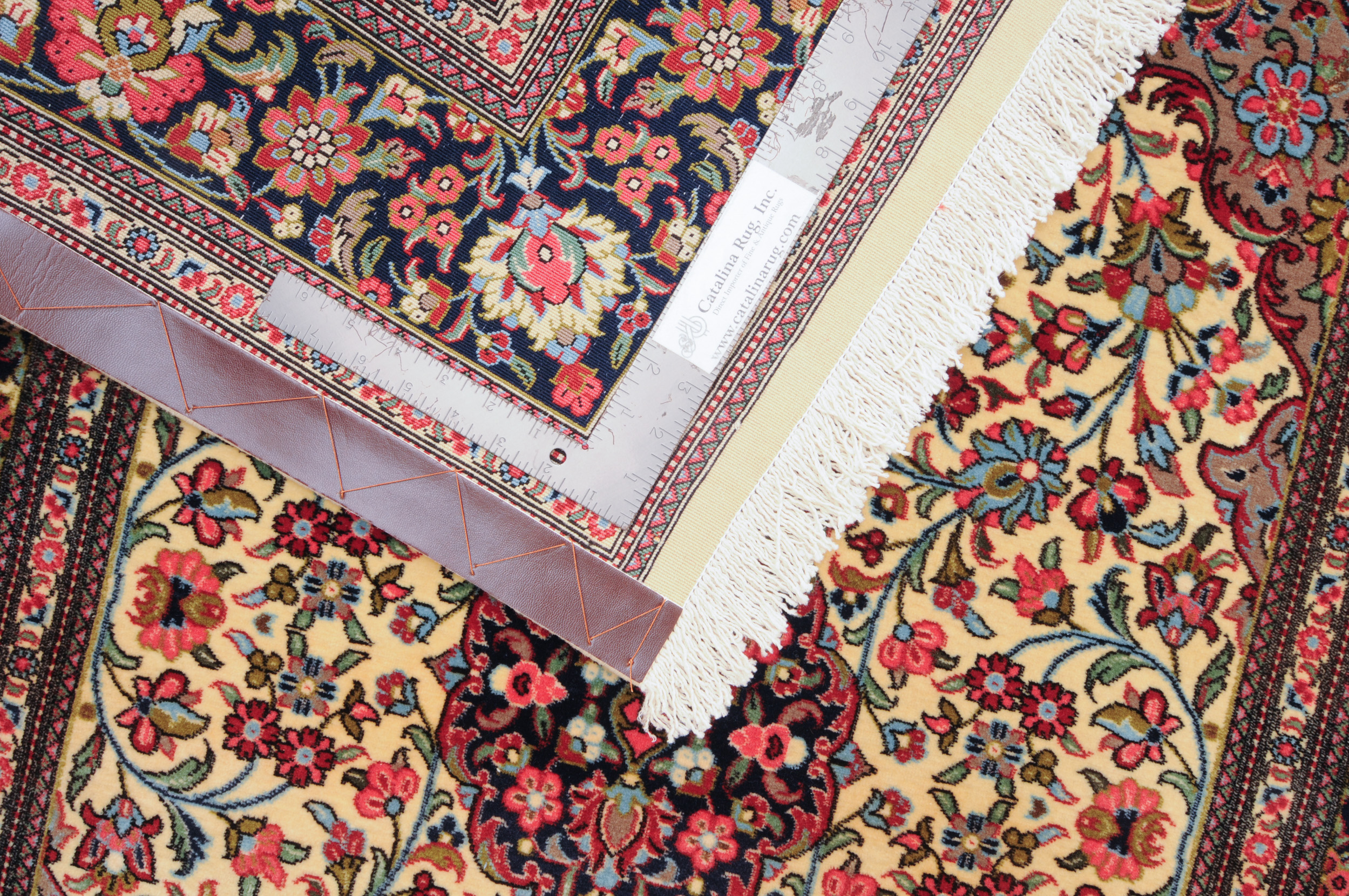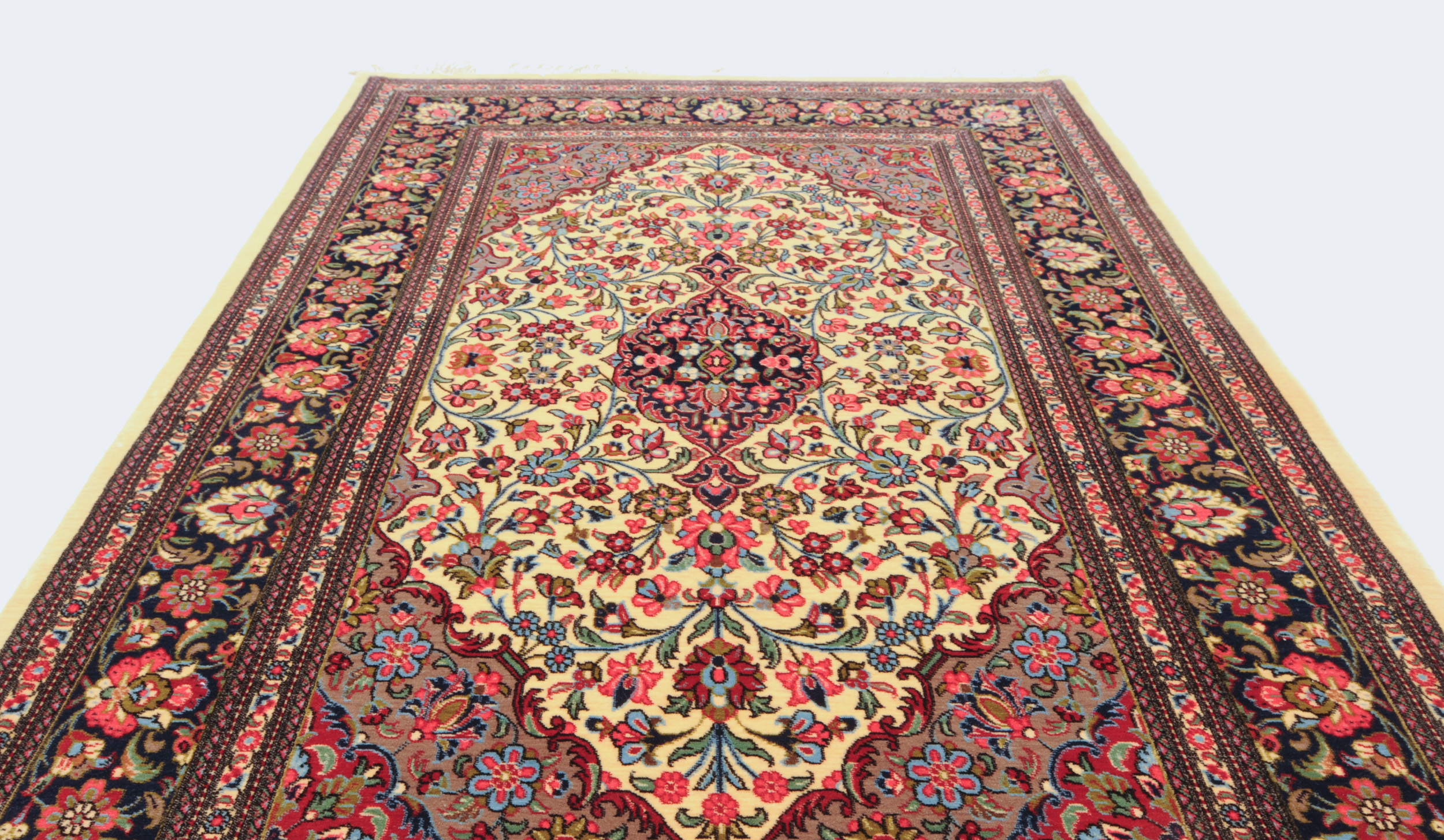 This Persian Rug is Hand Knotted with 100% Wool Pile and Cotton Foundation. This Rug has a Floral Design and its Main Colors are Beige, Blue, Red.