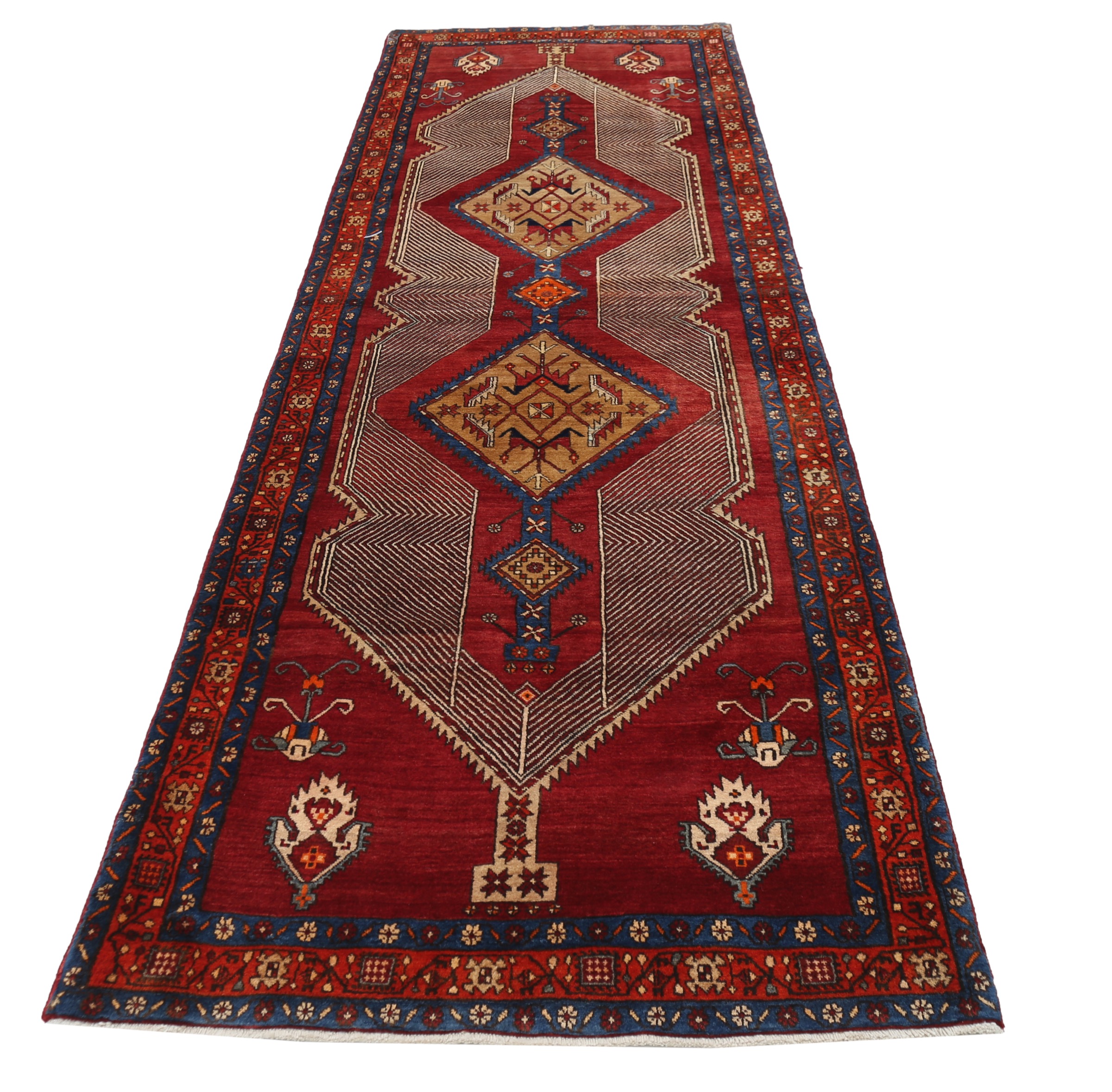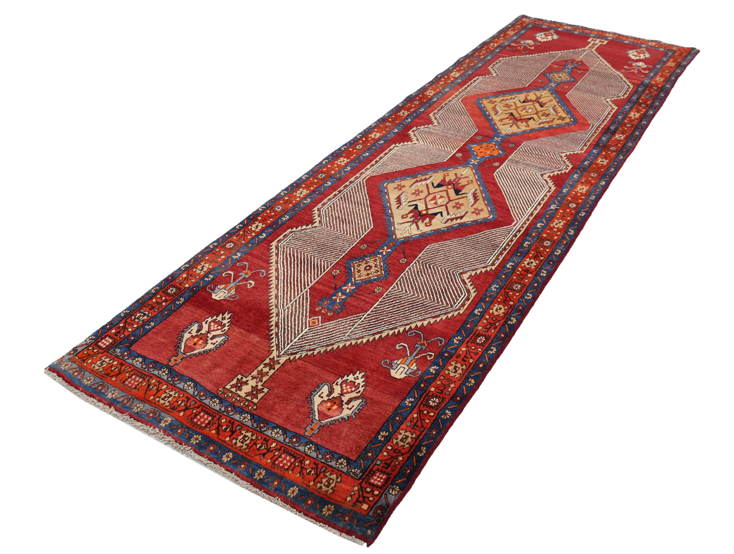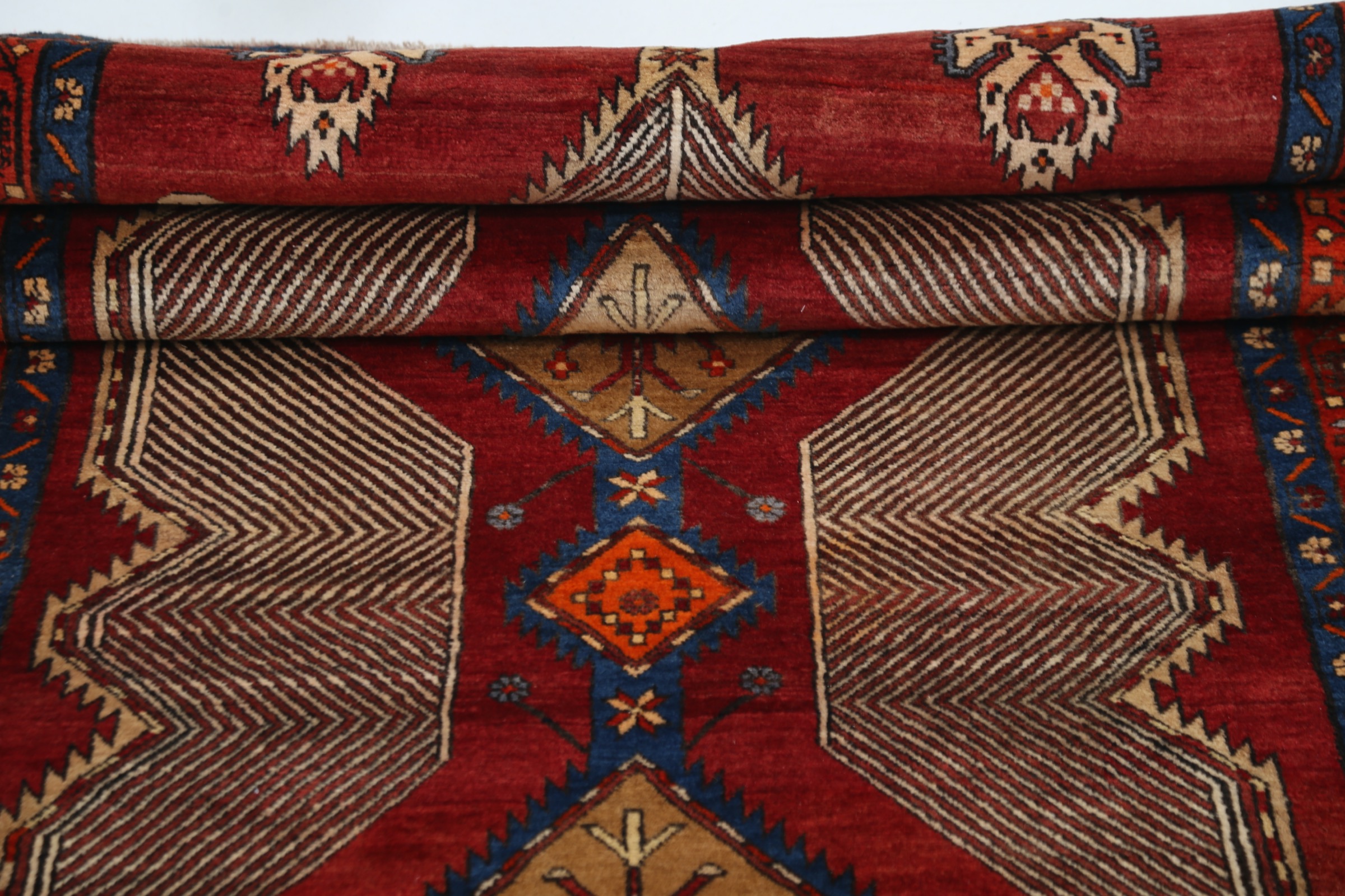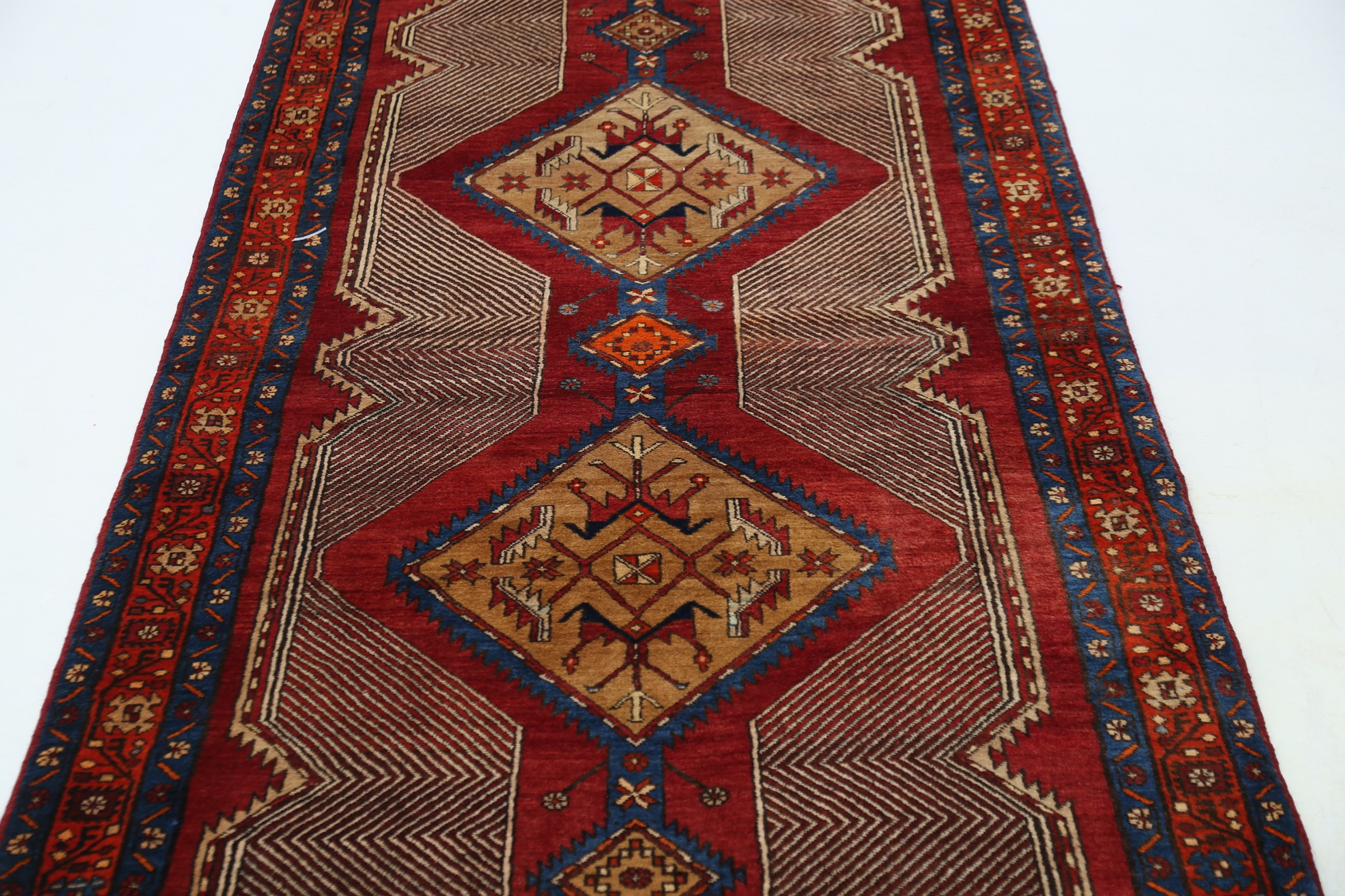 This Sarab rug has a Beige field with a Orange border, featuring a Geometrical design. Made with 100% Wool with Cotton foundation. It has knot density of 144 kpsi.