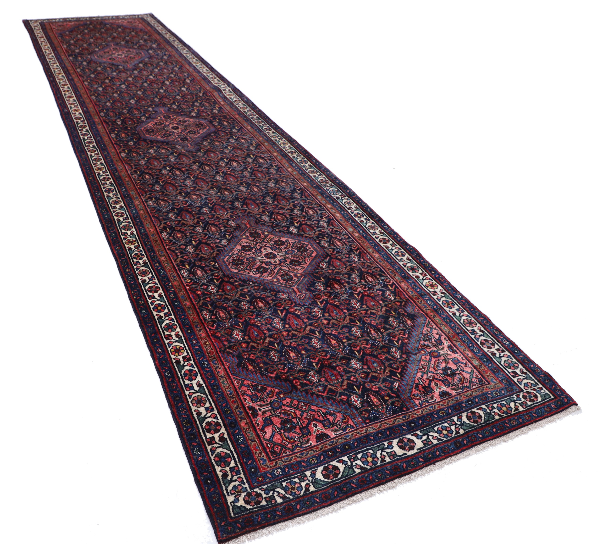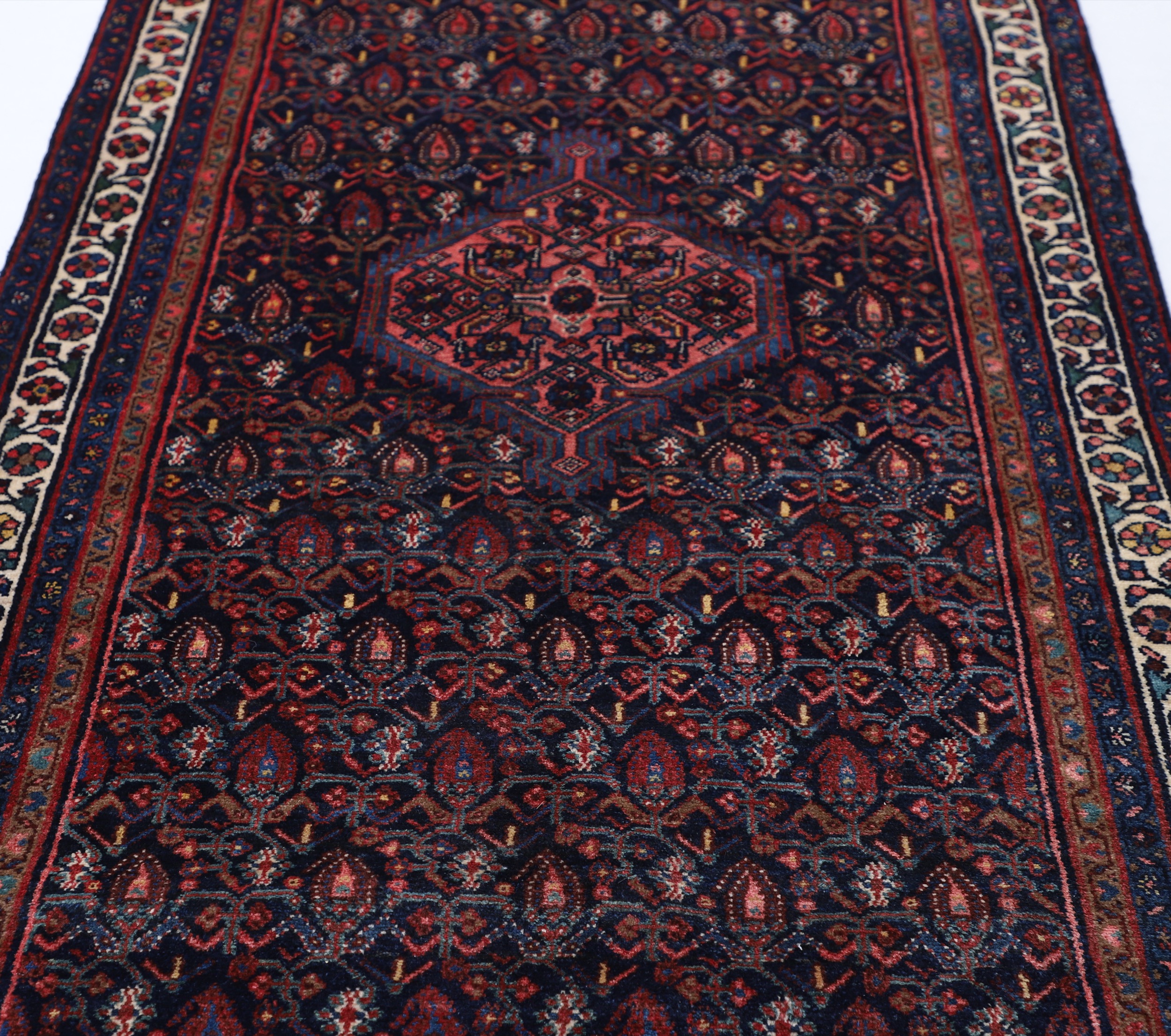 This vintage Persian rug is a Hand Knotted Mehraban measuring 4′ x 17’6″. Aged between 50-60 years, it features a beautiful Blue Beige Herati design with an approximate knot count of 196 KPSI. Made of 100% Wool, and Cotton, this rug has a medium pile measuring 1/3″-3/8″. It’s the perfect addition to any room, adding a touch of elegance and sophistication to your decor.