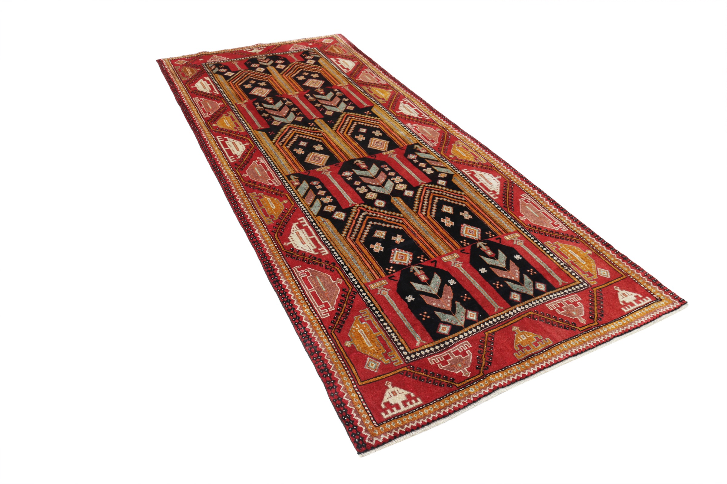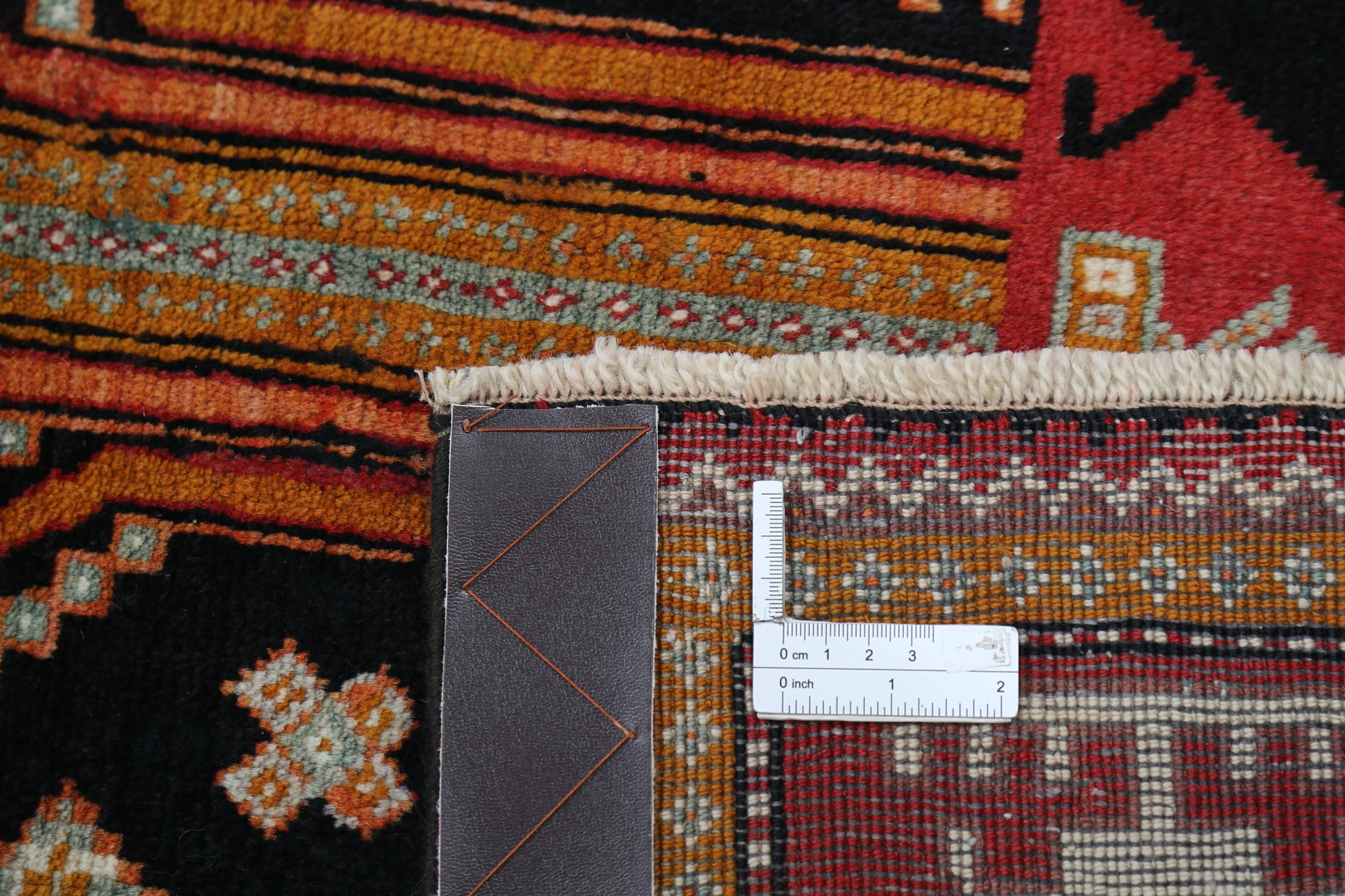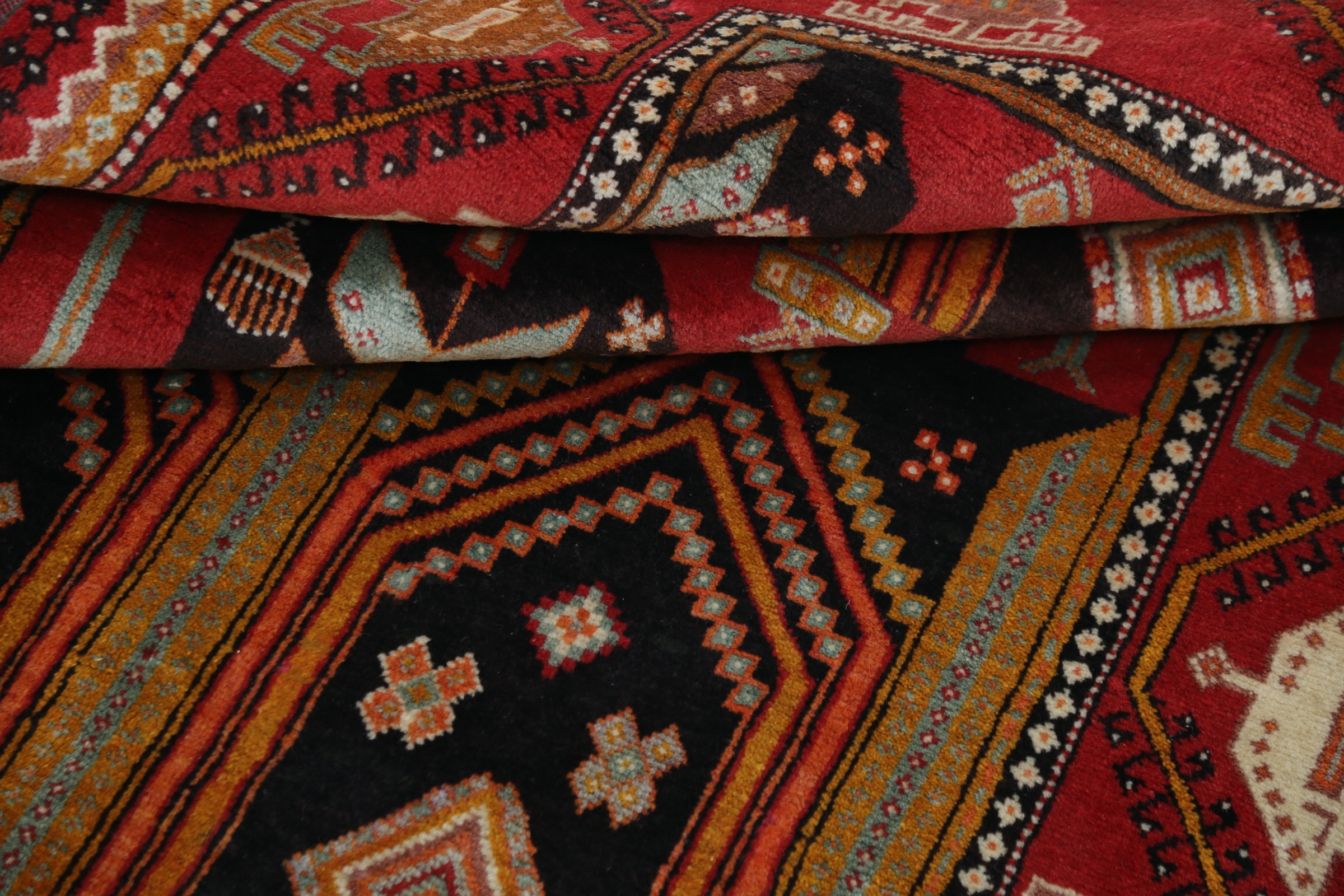 This Shiraz rug has a Black field with a Red border, featuring a Allover design. Made with 100% Wool with Cotton foundation. It has knot density of 144 kpsi.