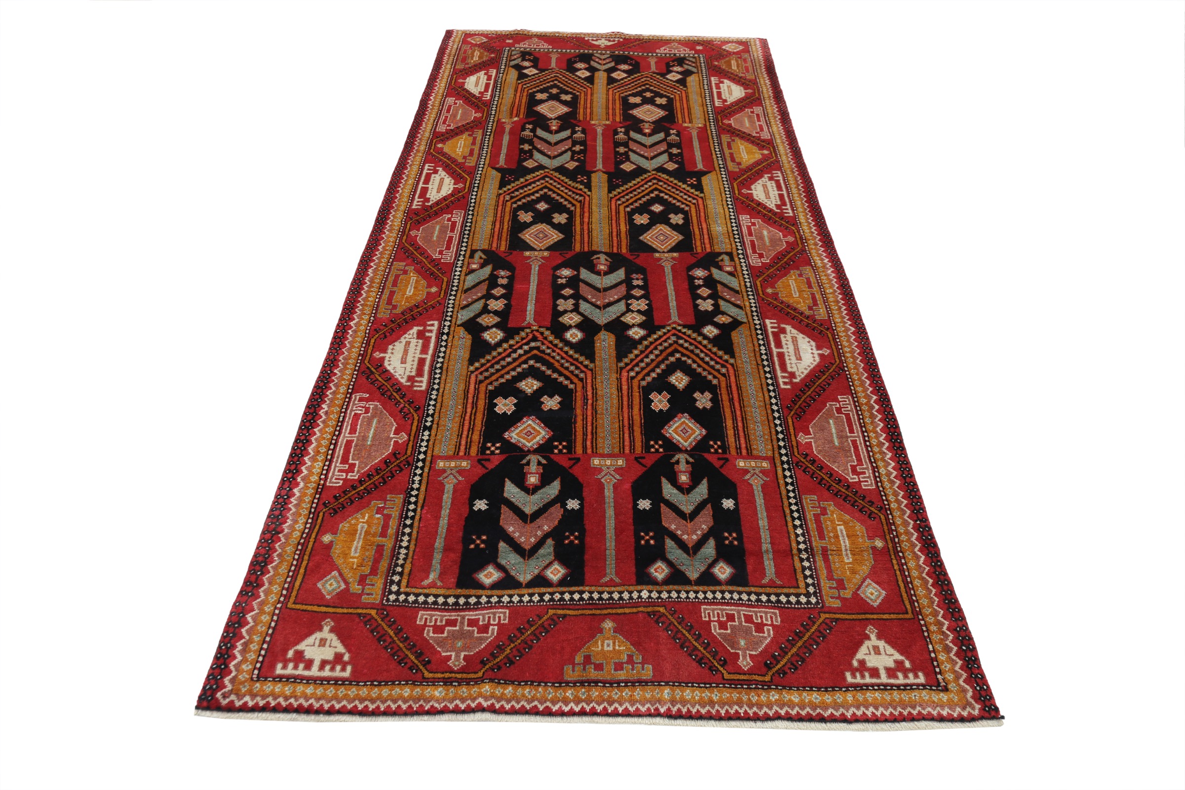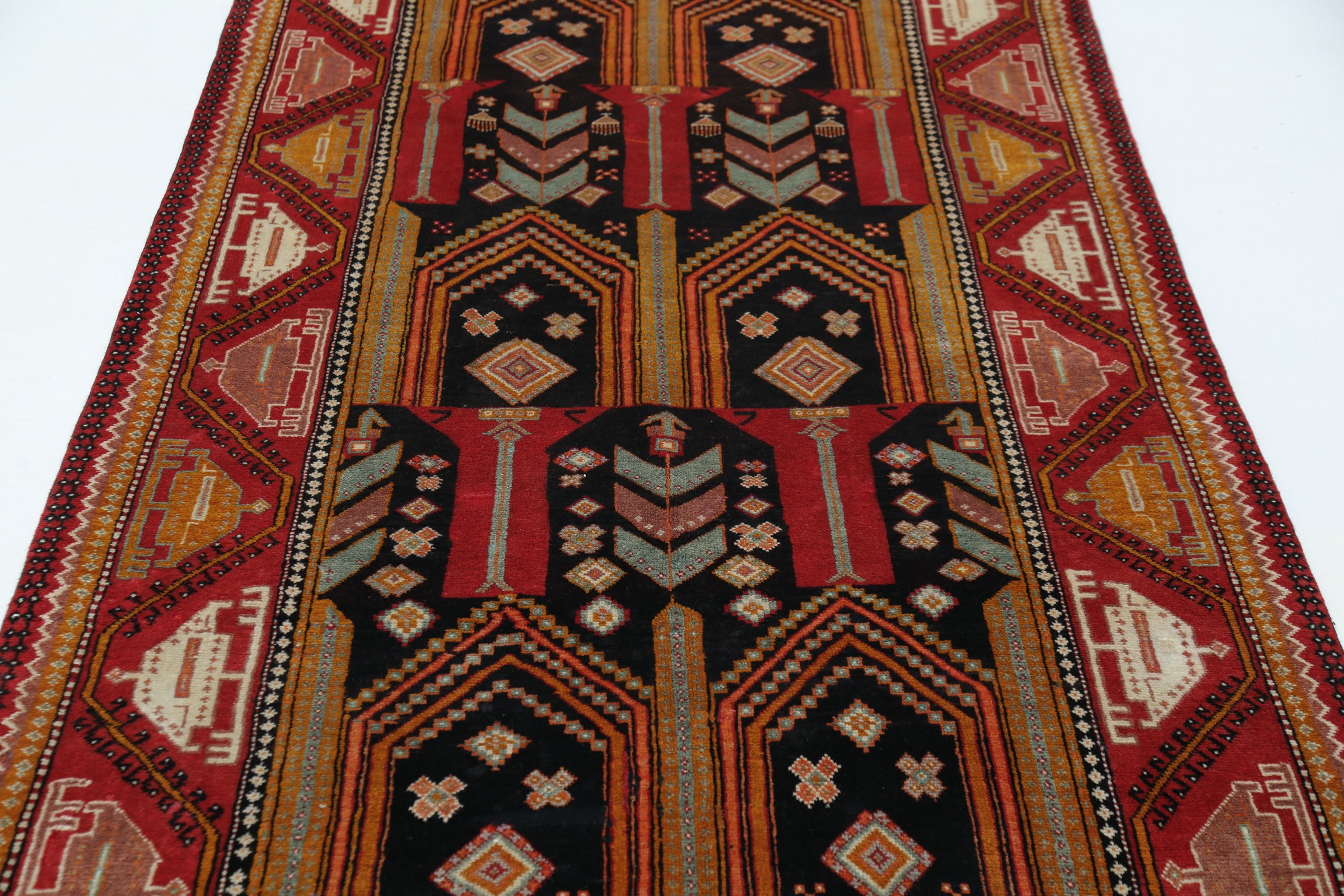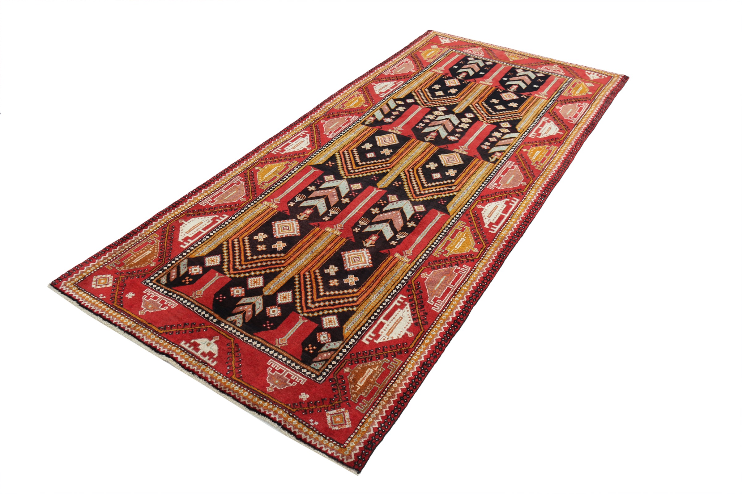 This Shiraz rug has a Black field with a Red border, featuring a Allover design. Made with 100% Wool with Cotton foundation. It has knot density of 144 kpsi.