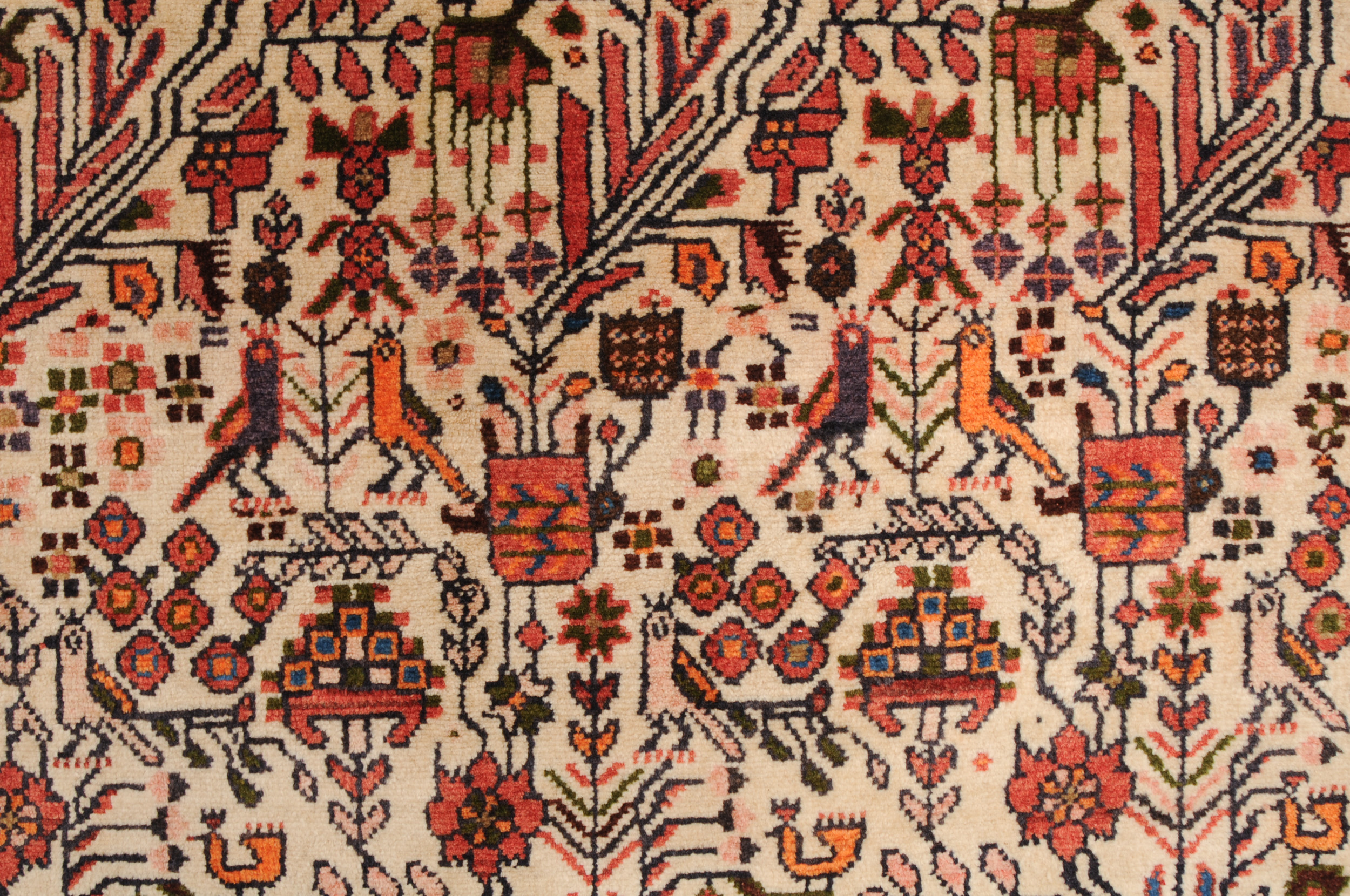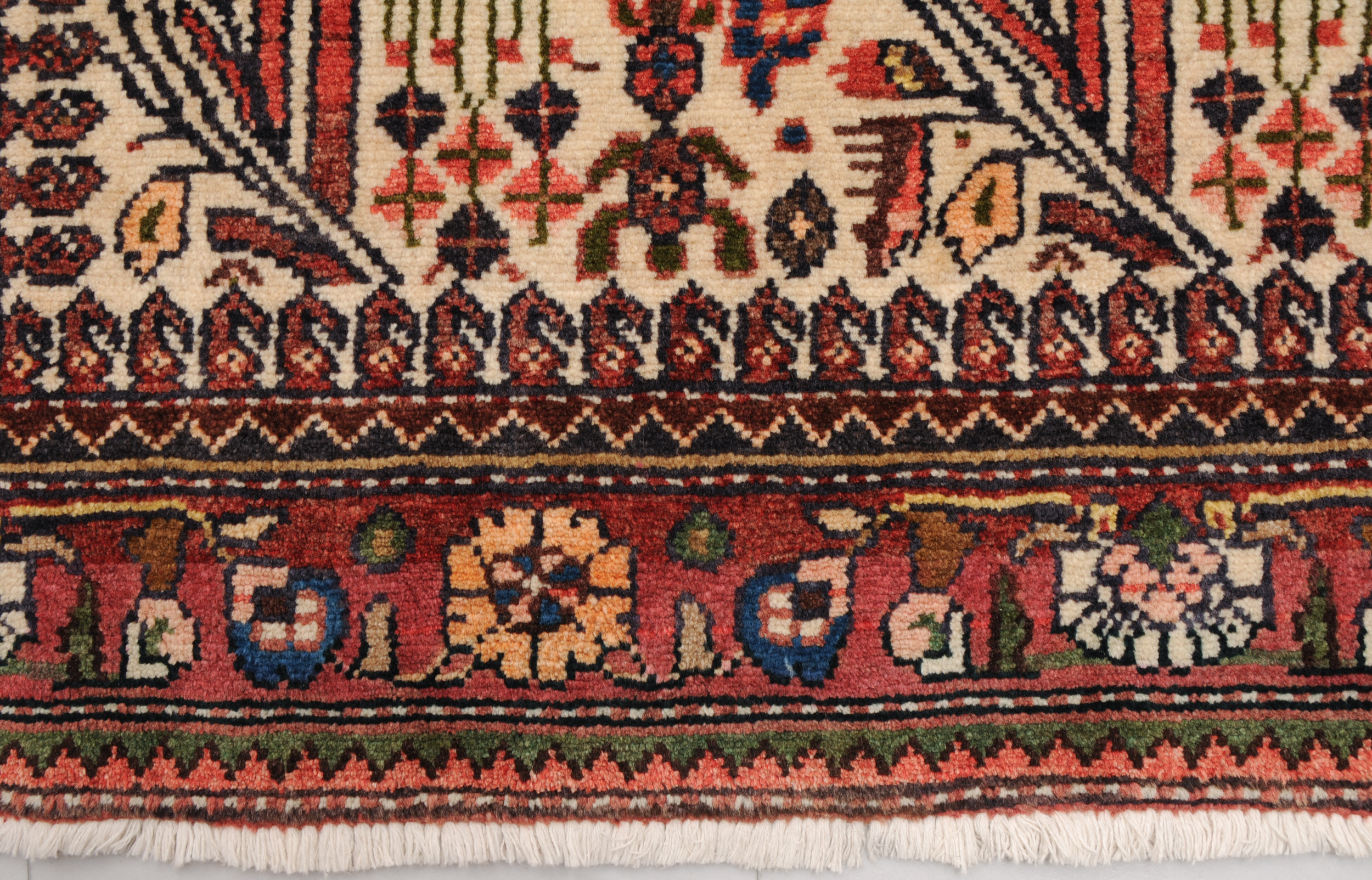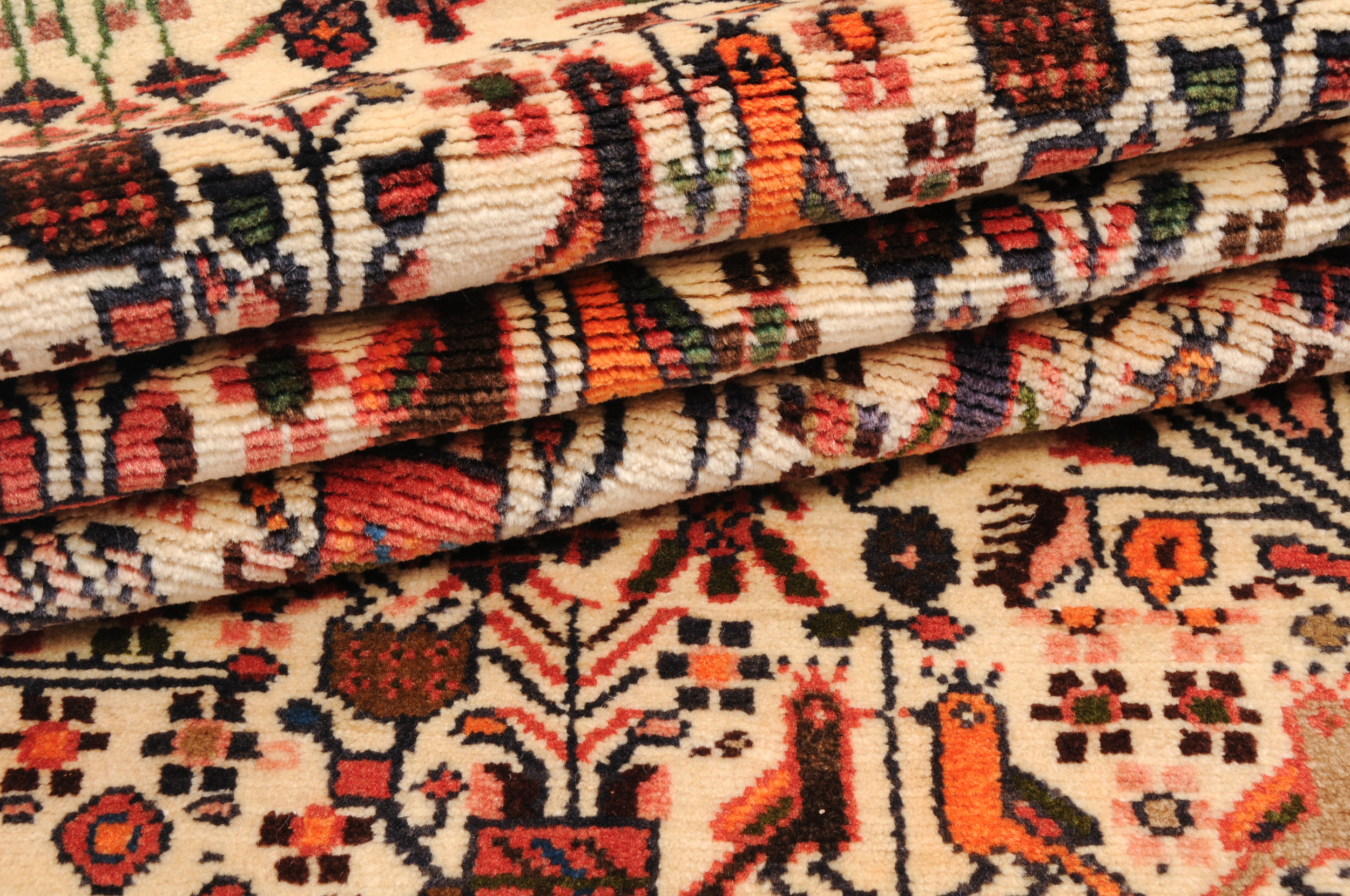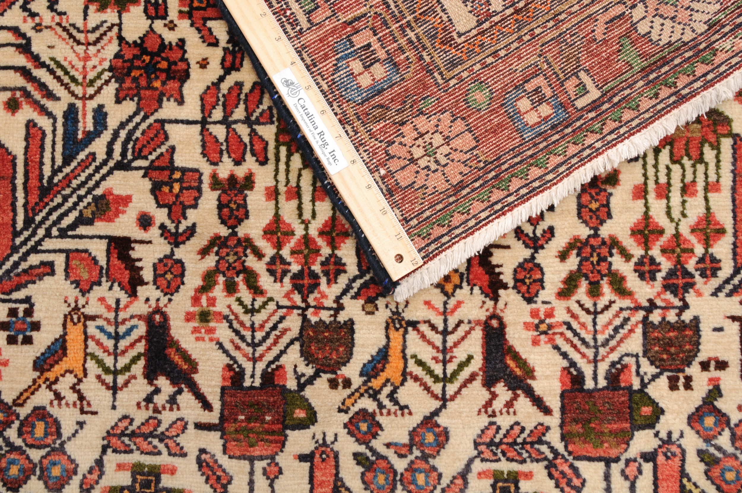 This Hamadan rug has Made with 100% Wool with Cotton foundation. The design is Brid and flowers the field color is Beige and the border is Blue. It has a knot density of 156 kpsi.