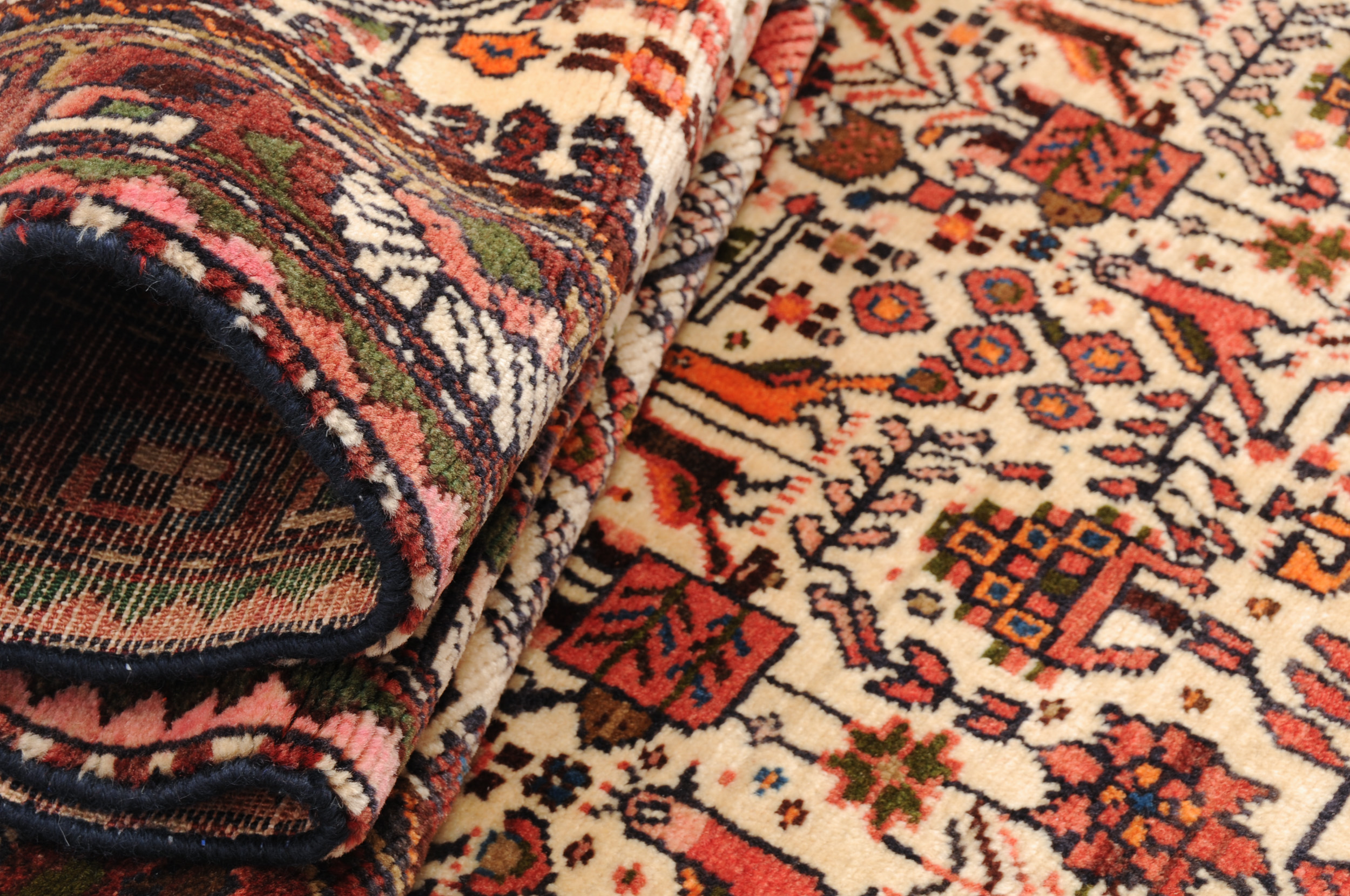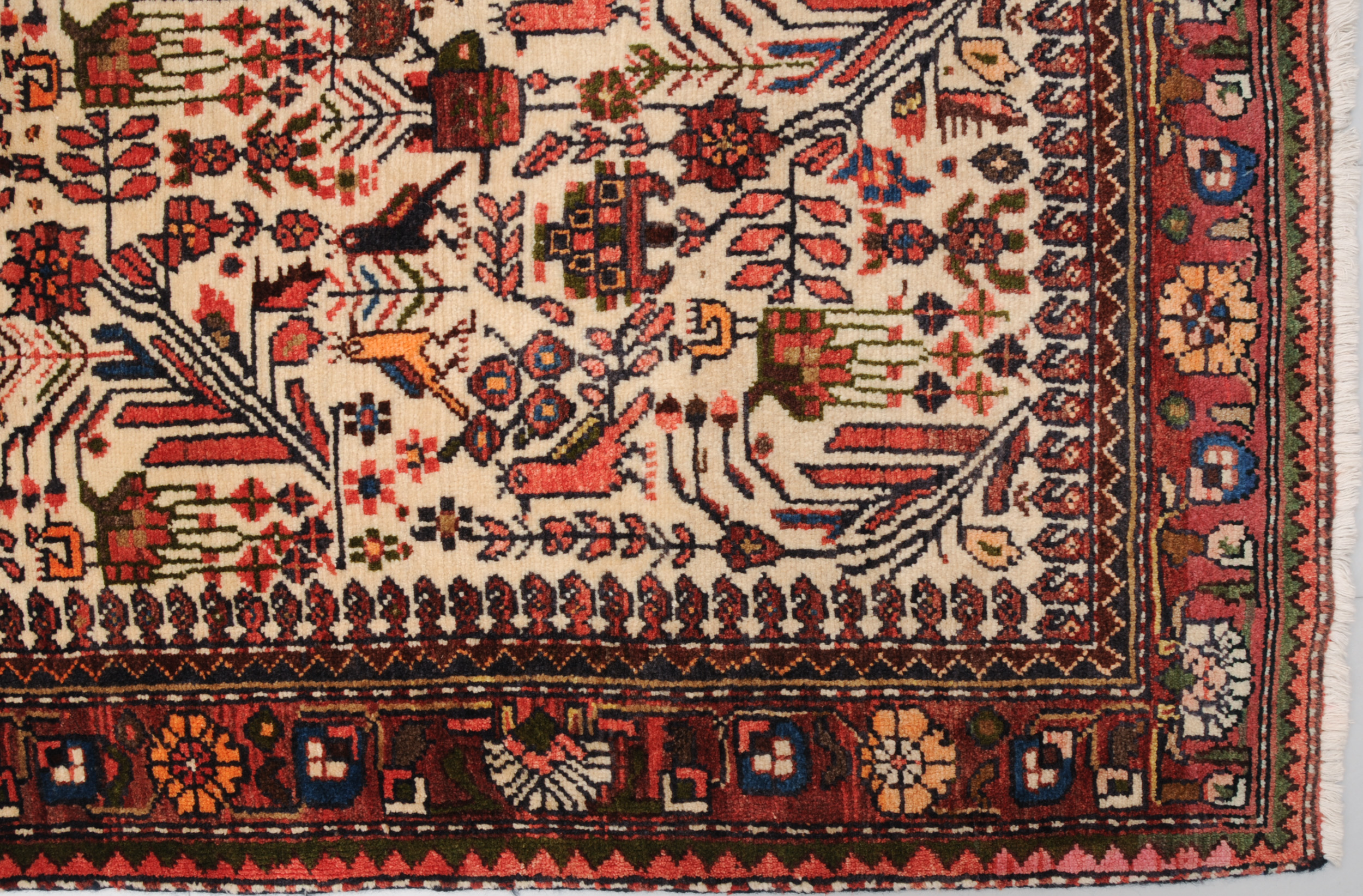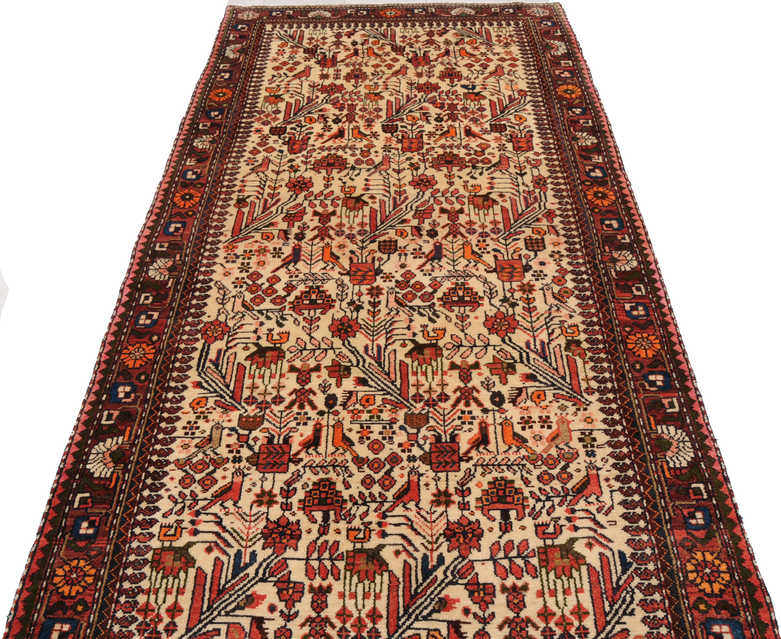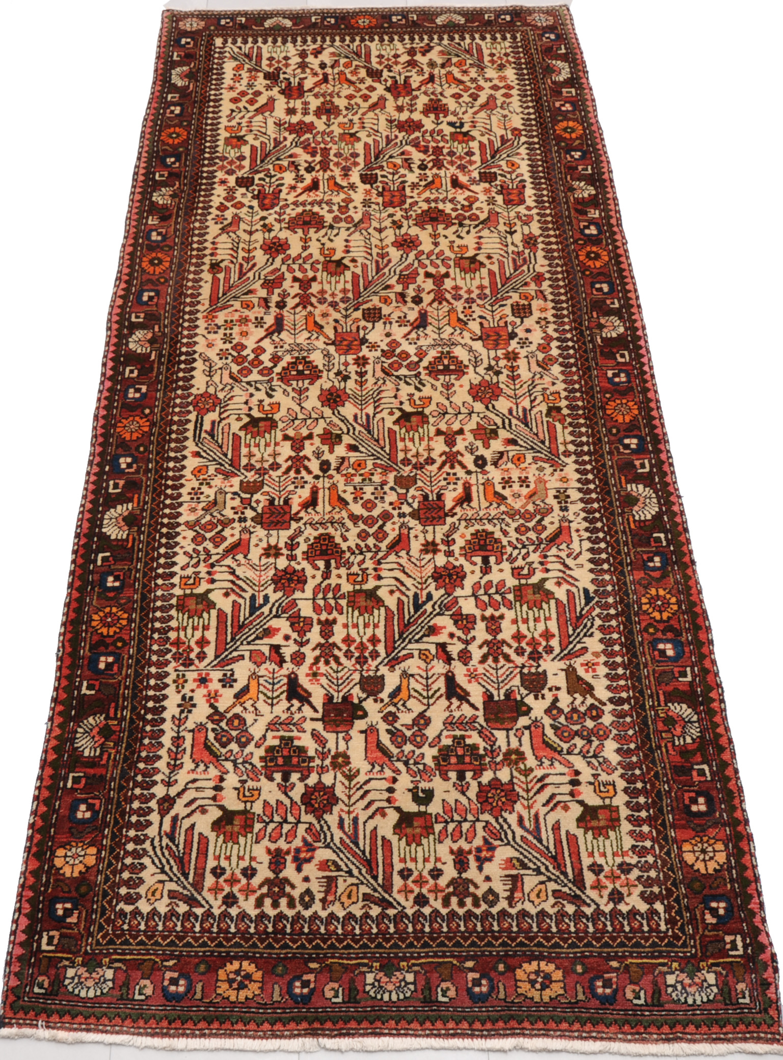 This Hamadan rug has Made with 100% Wool with Cotton foundation. The design is Brid and flowers the field color is Beige and the border is Blue. It has a knot density of 156 kpsi.