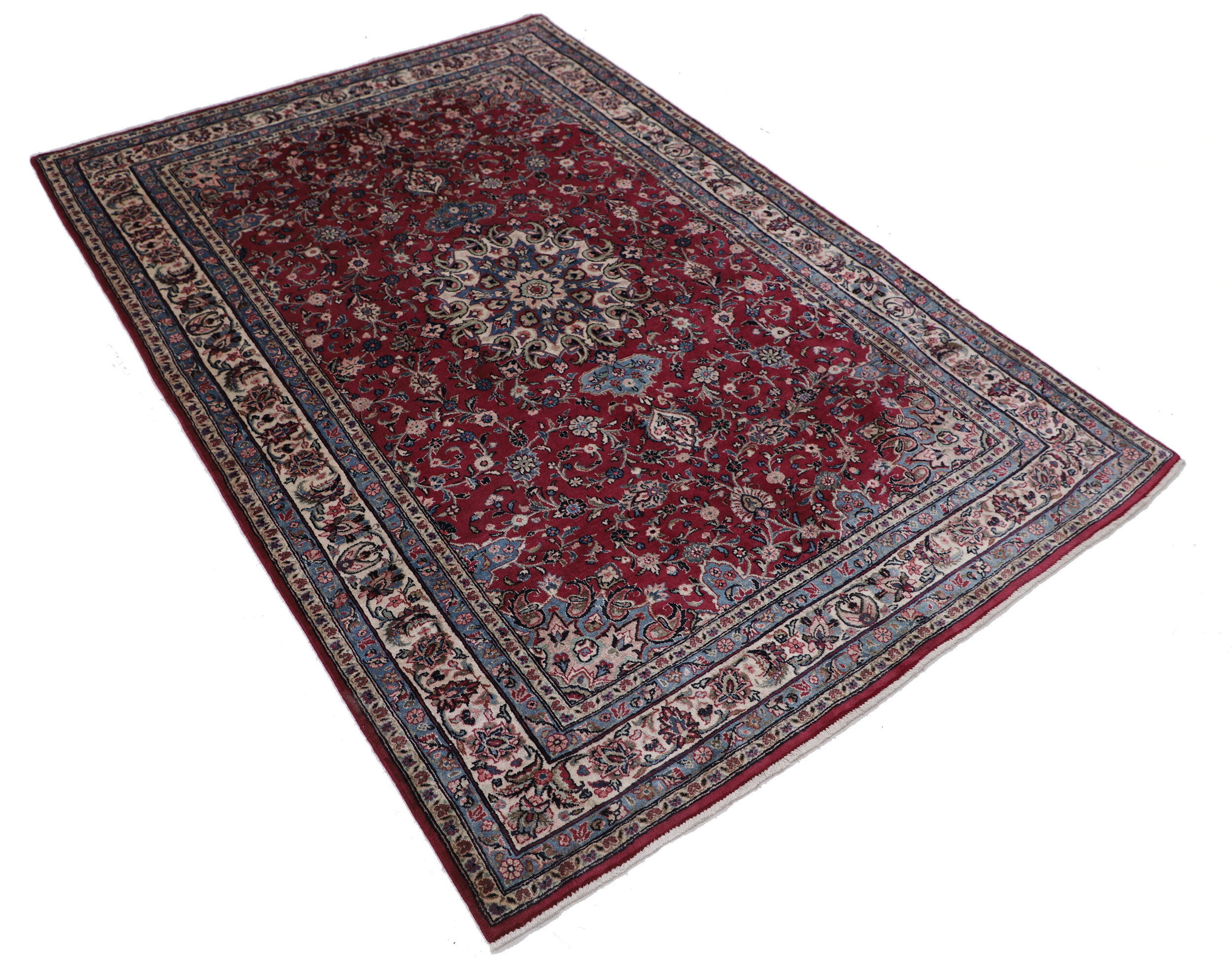 Hand-knotted in Hamadan, this Persian rug measures 4’6″ x 6’9″ and features a beautiful Red Blue Floral design. With an approximate of 324 knots per square inch (KPSI), this rug is made from 100% Wool with a medium pile height of 1/3″-3/8″. Aged between 50-60 years, it is a perfect blend of traditional craftsmanship and timeless elegance.