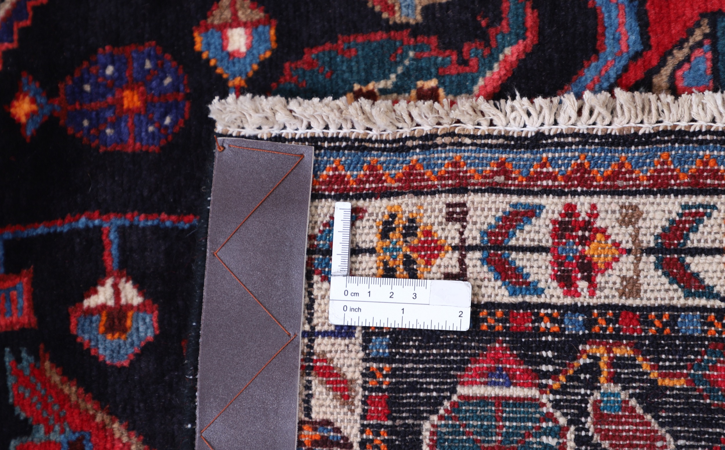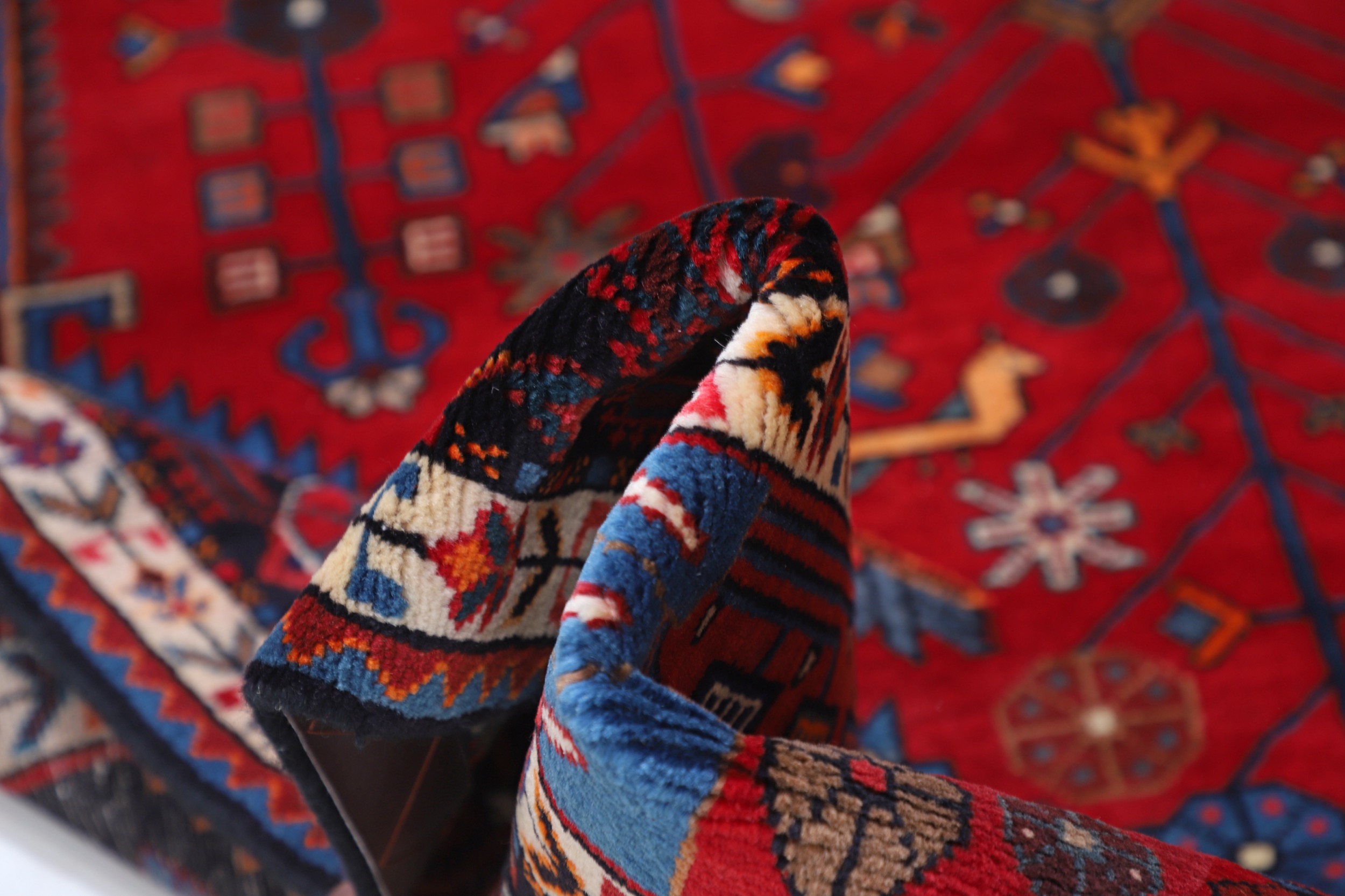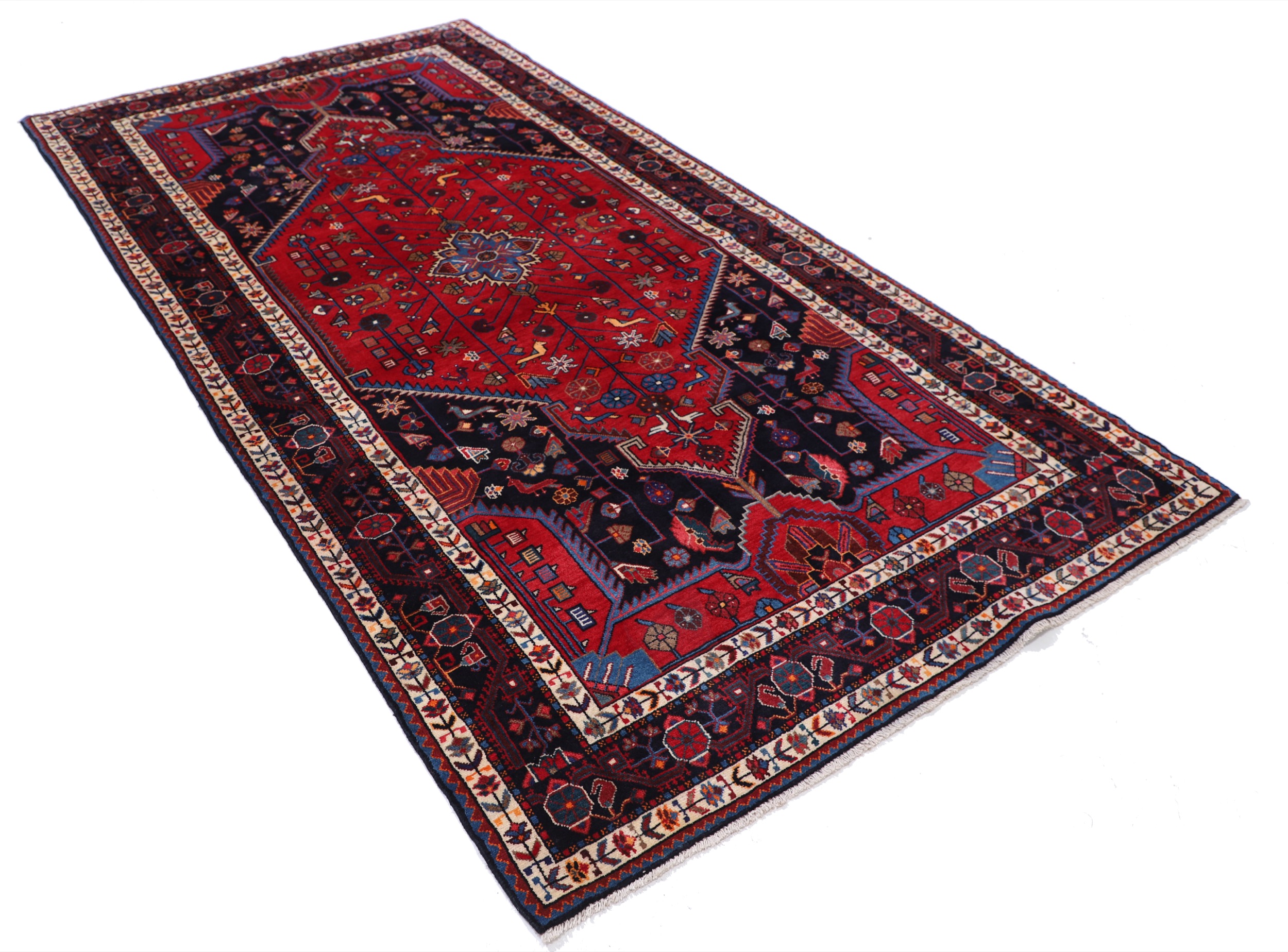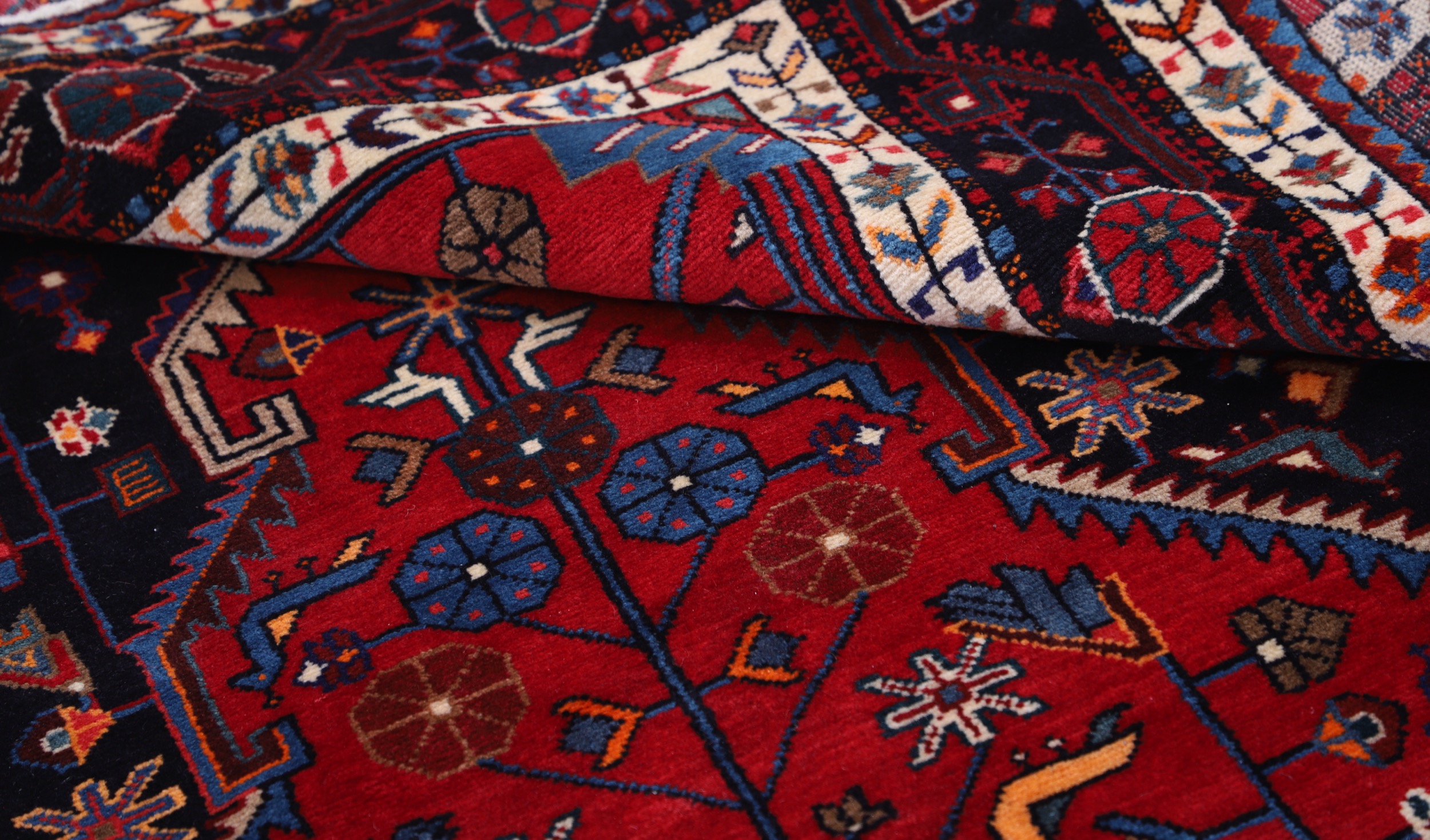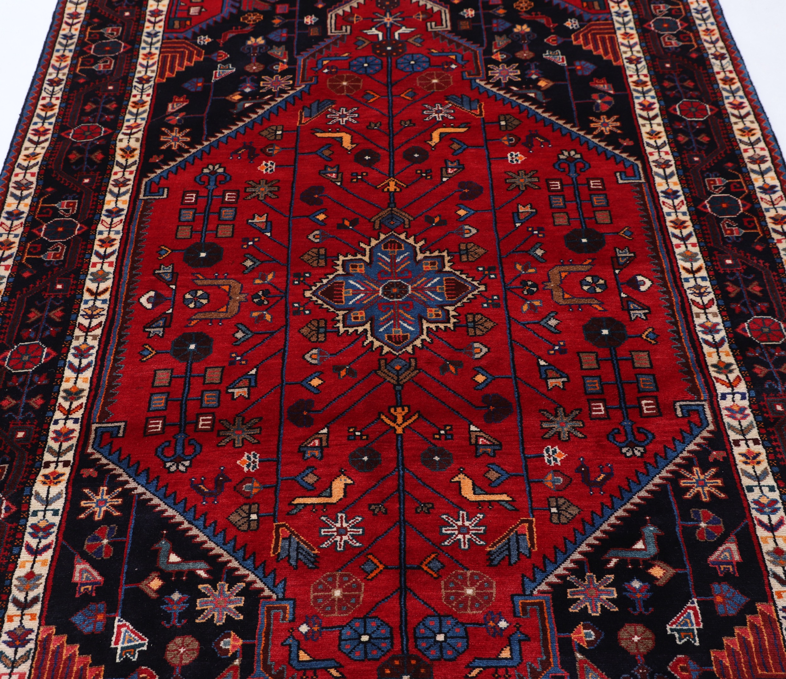 Hand Knotted Malayer Persian Rug, measuring 5’1″ x 10’1″, features an exquisite design in vibrant hues of red and blue. Crafted from 100% wool with a cotton foundation, this rug showcases a geometric pattern with a medium pile height of 1/3″-3/8″. With an estimated knot count of approximately 169 KPSI, this aged masterpiece, aged between 0-20 years, brings both elegance and durability to any space it graces.