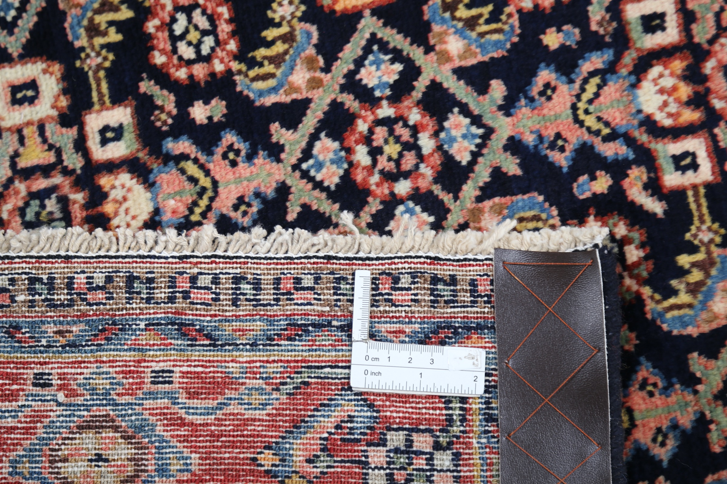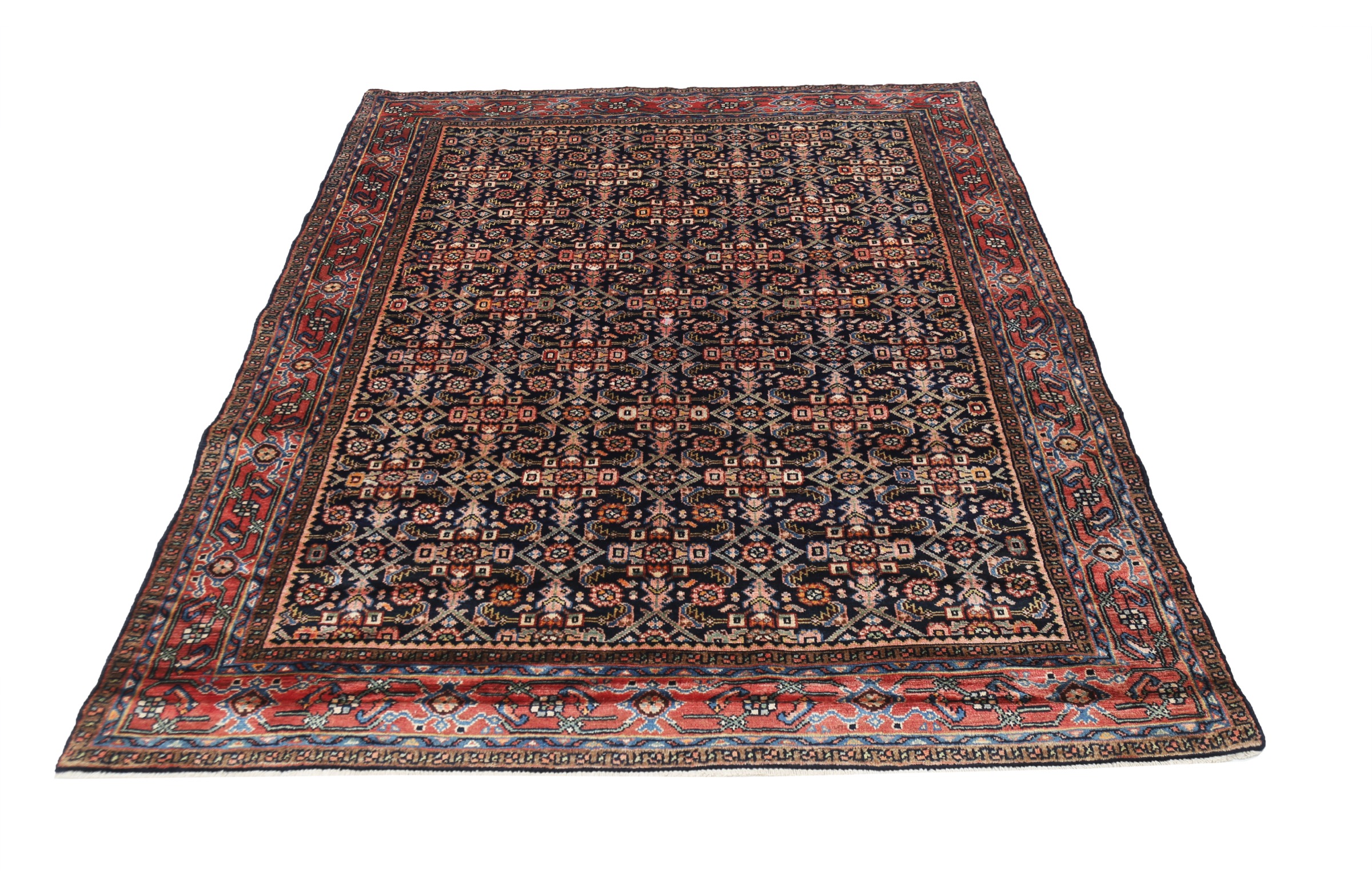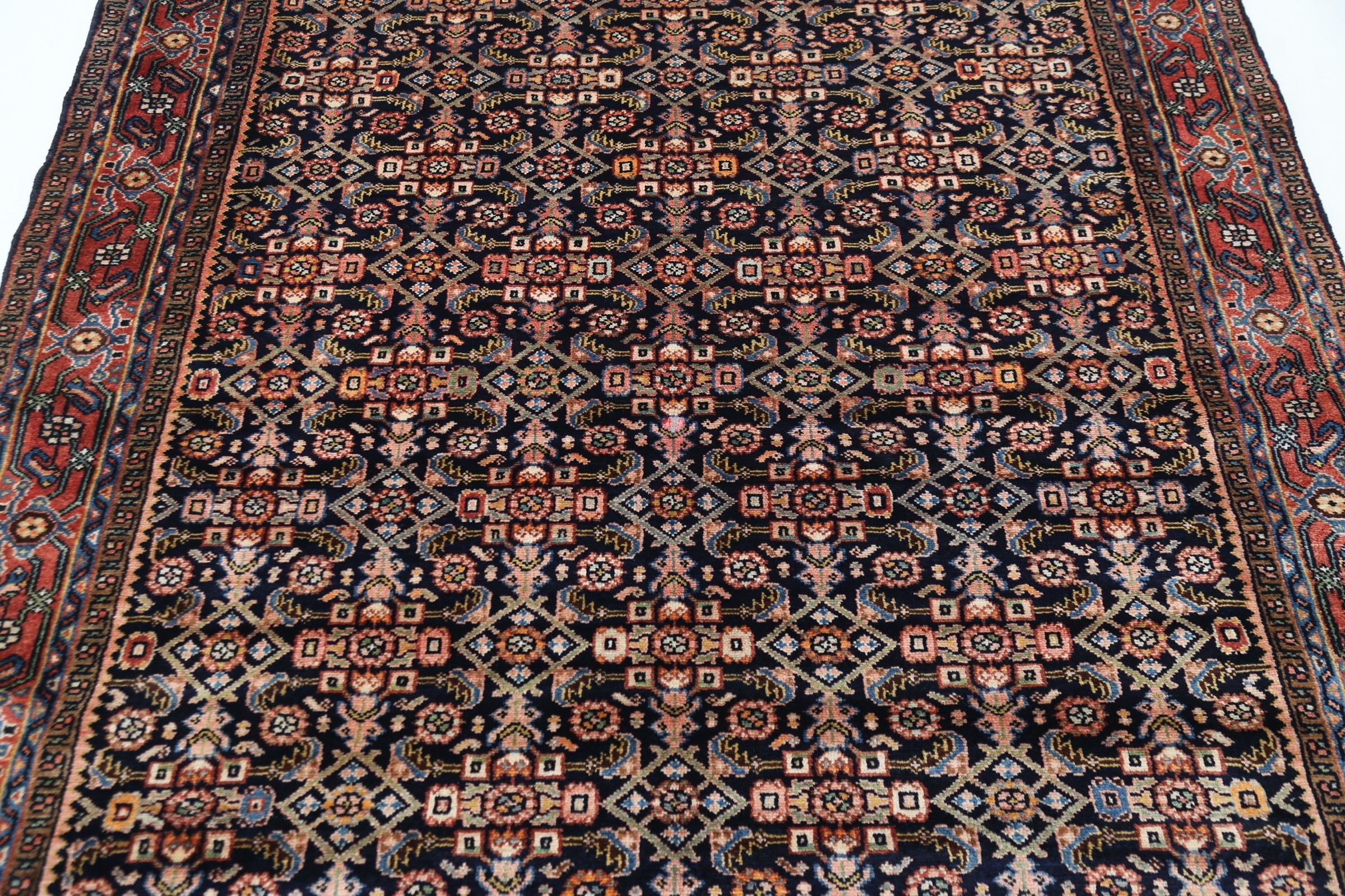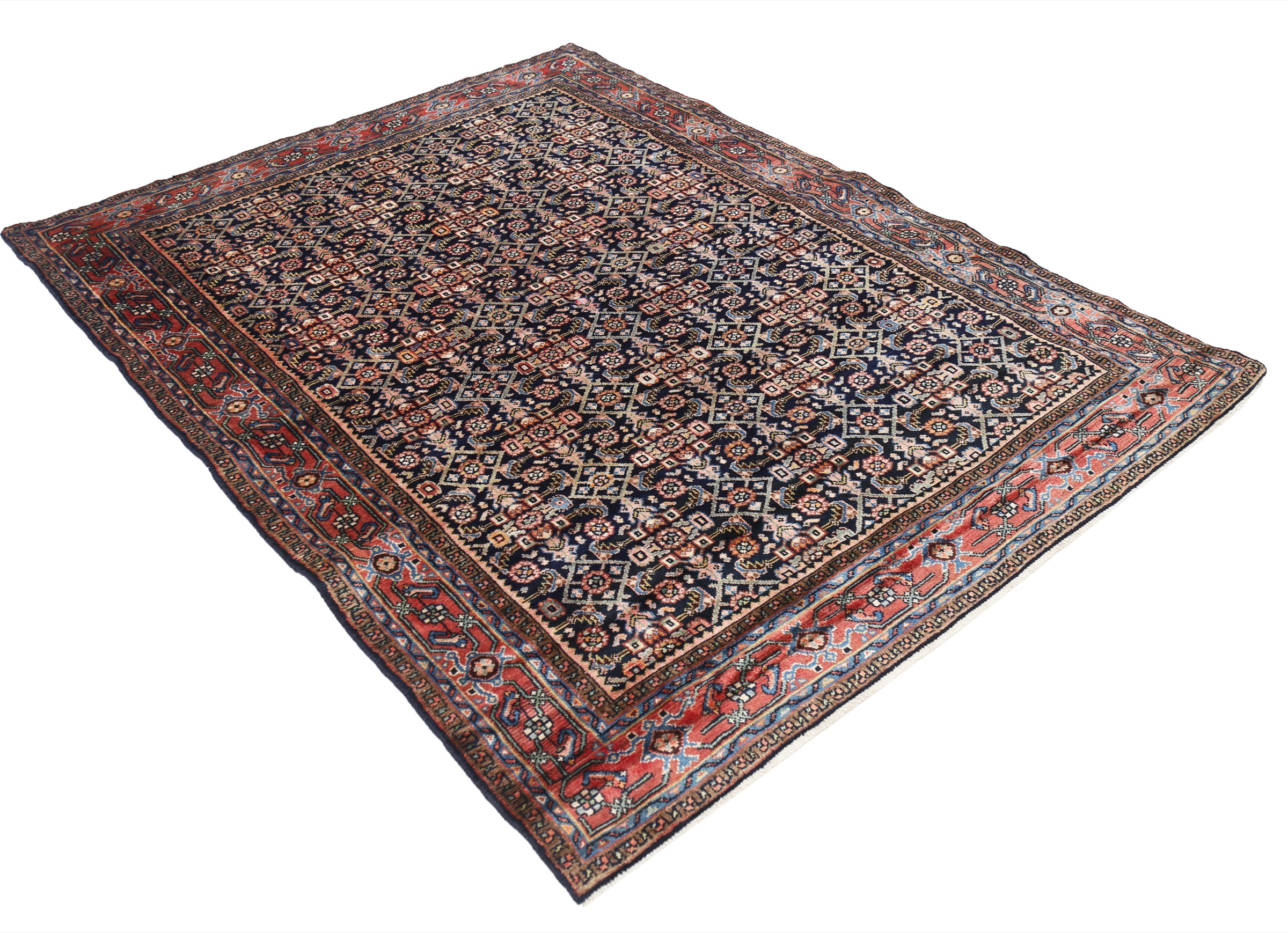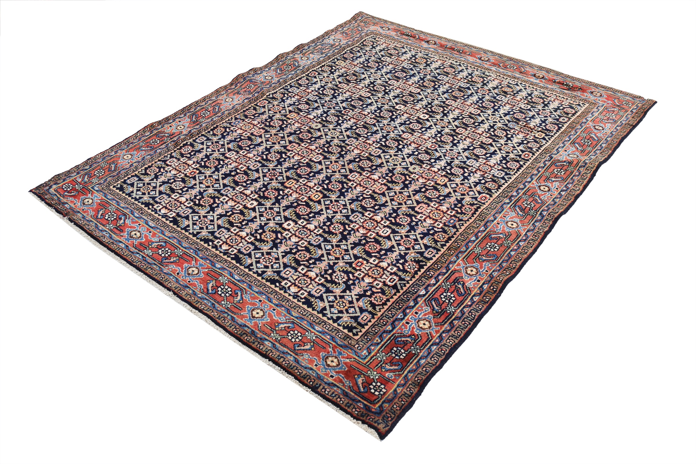This Sarouk rug has a Blue field with a Orange border, featuring a Herati design. Made with 100% Wool with Cotton foundation. It has knot density of 196 kpsi.
