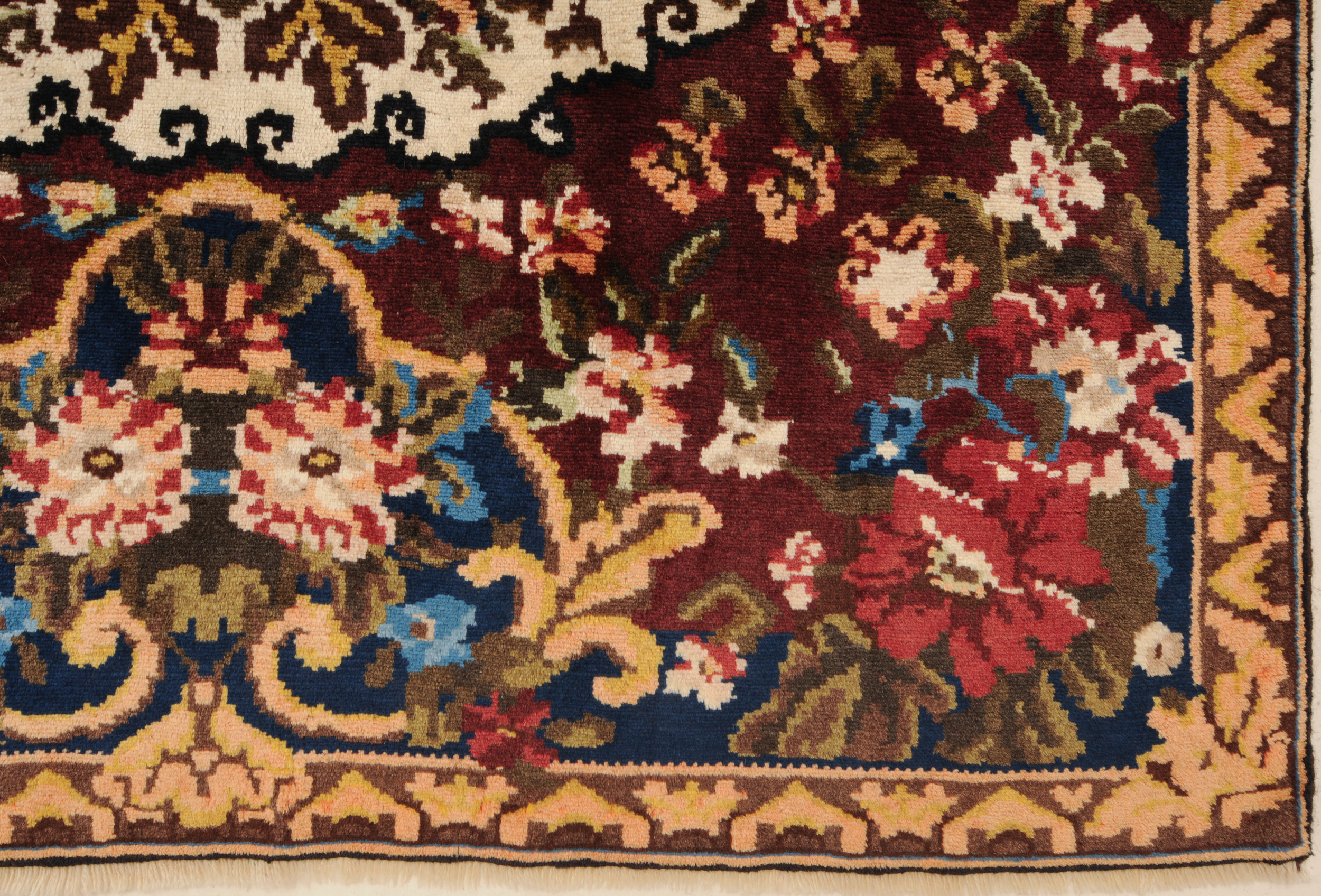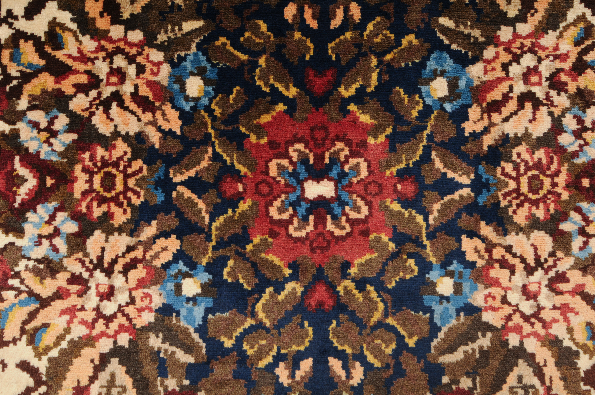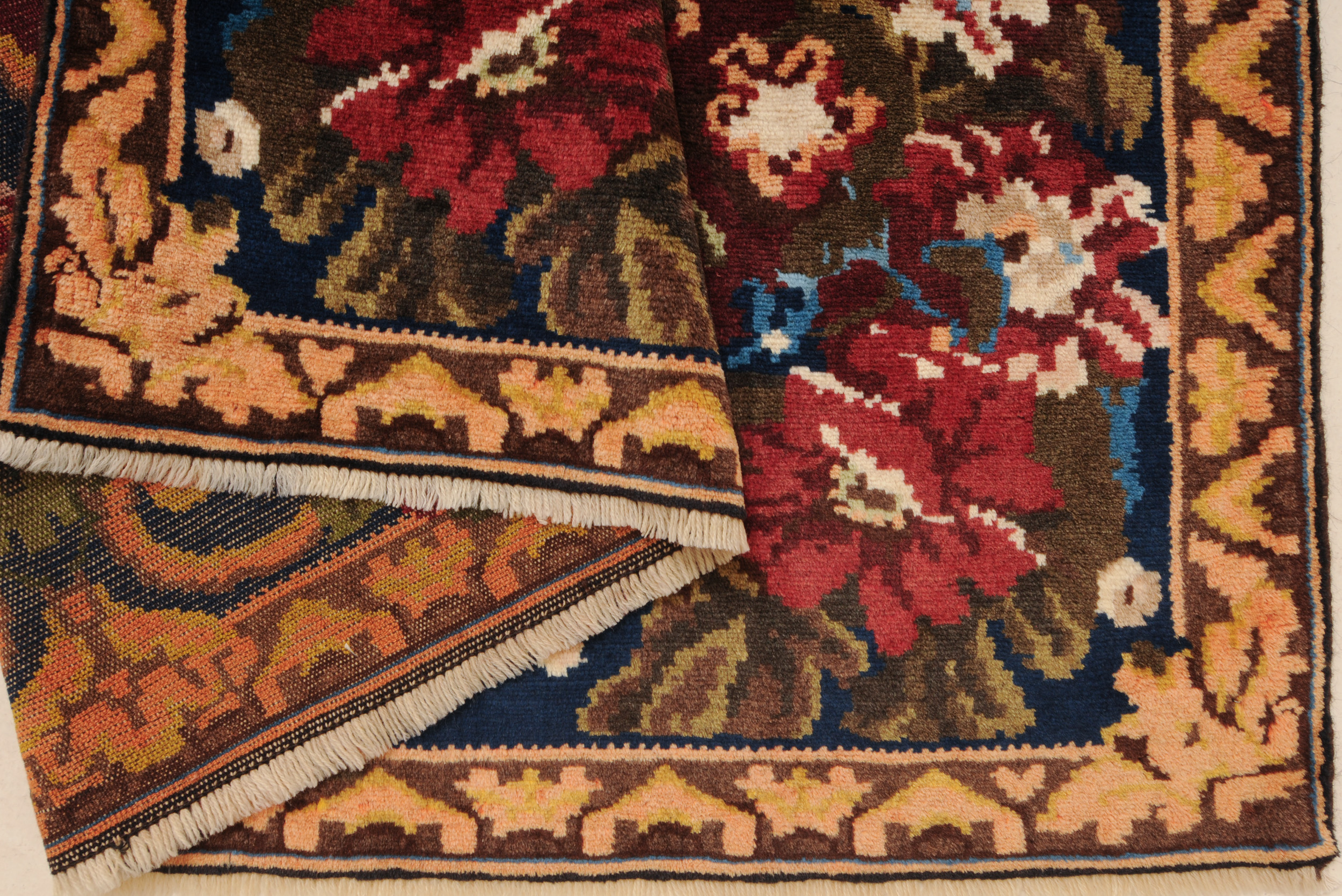 This Persian Rug is Hand Knotted with 100% Wool Pile and  Cotton Foundation. This Rug has a Floral Design and its Main colors are Blue, Brown and Beige.