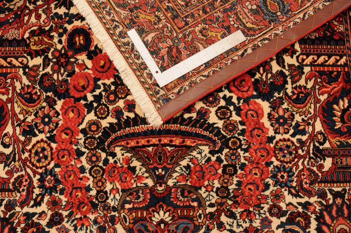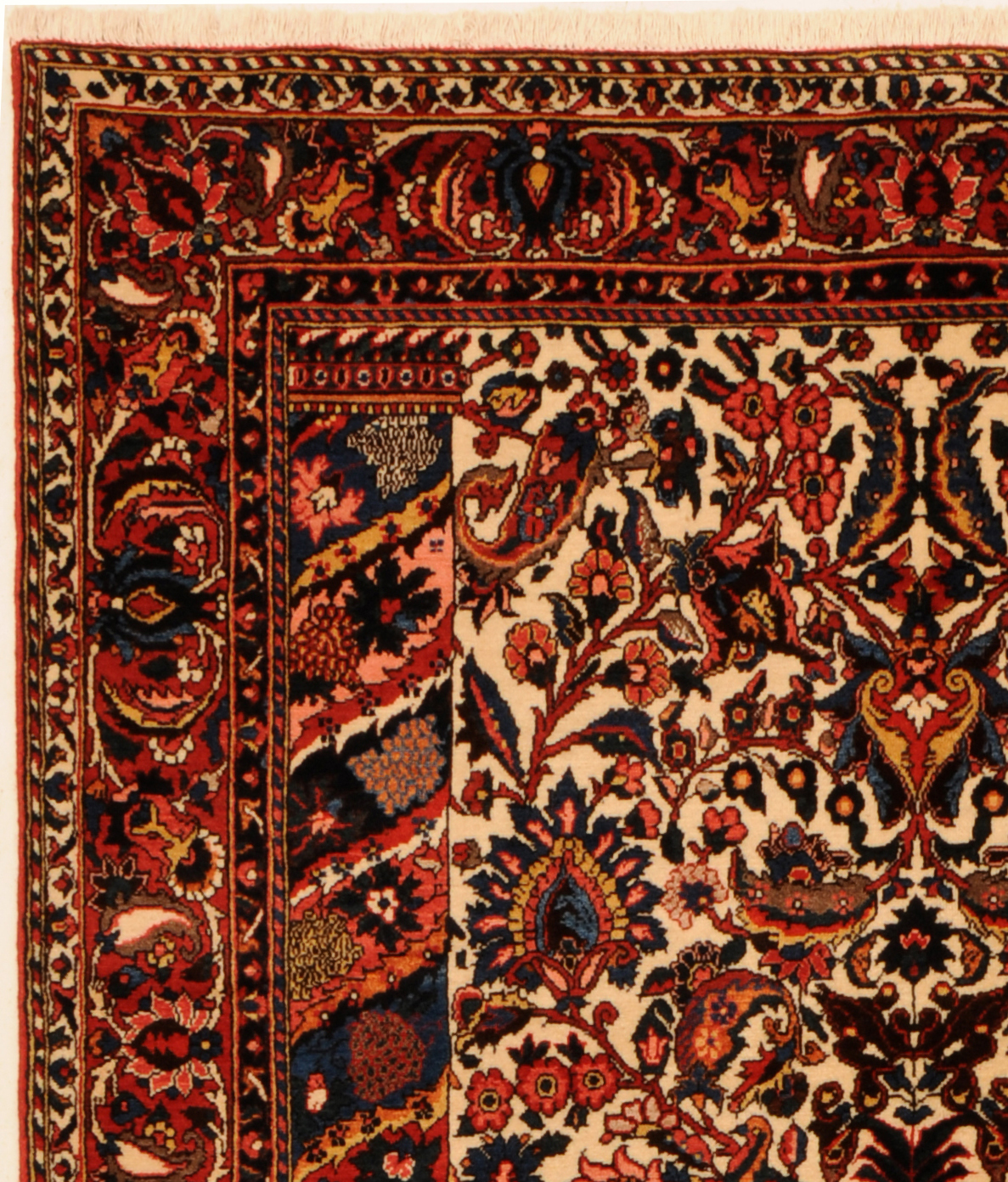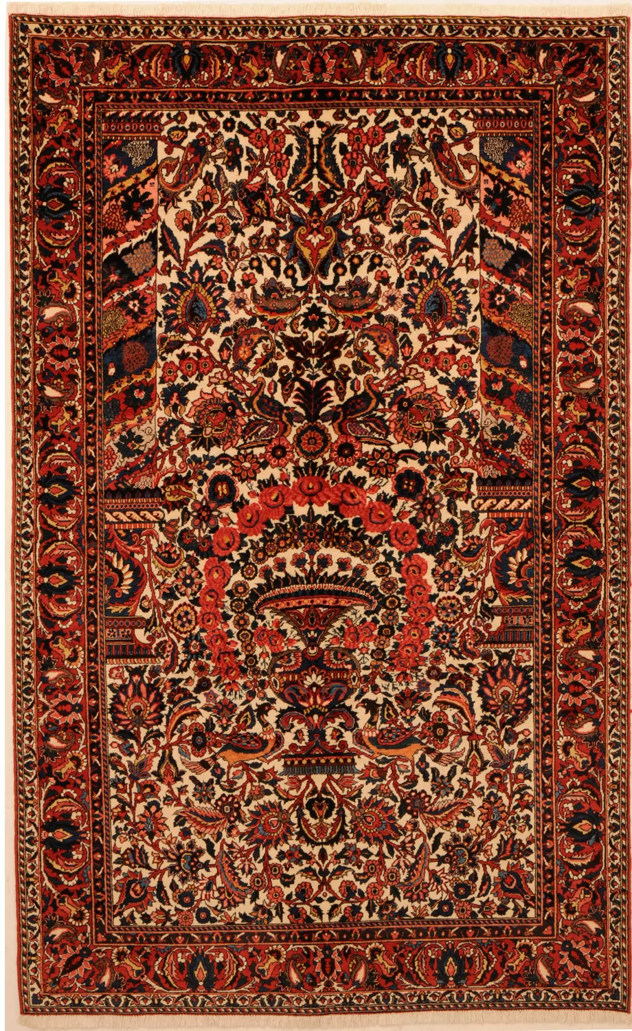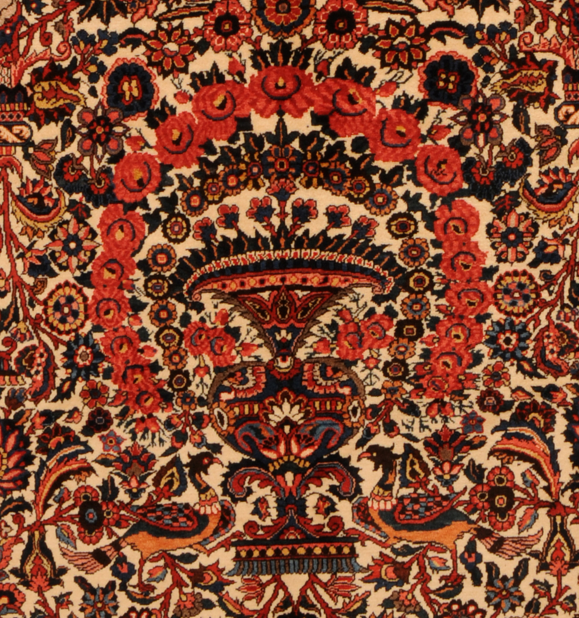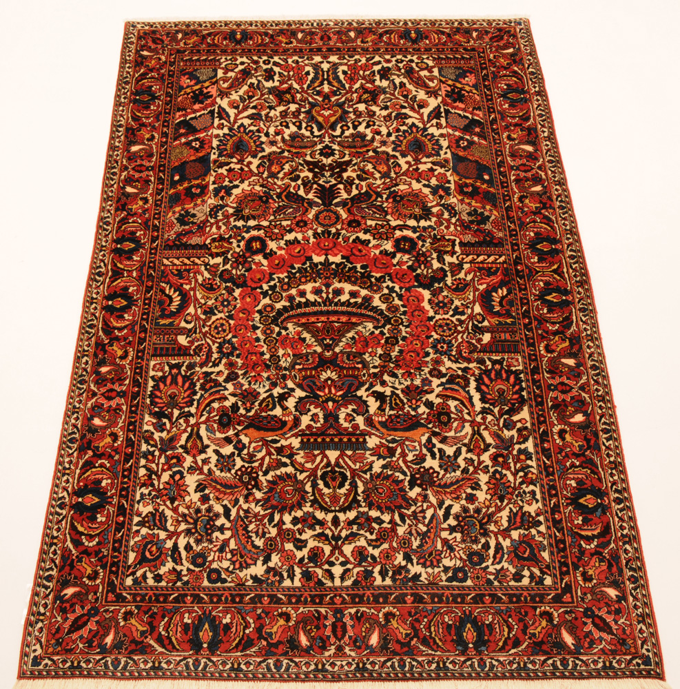 This Persian Rug is Hand Knotted with 100% Wool Pile and Cotton Foundation. This Rug has a Bird and Flower Design and its Main colors are Red, Blue, and Cream .