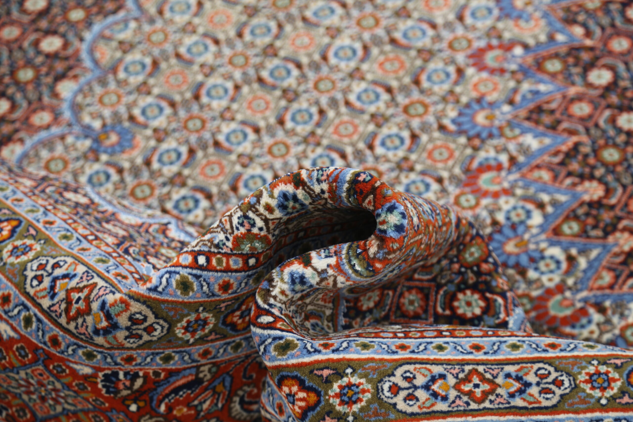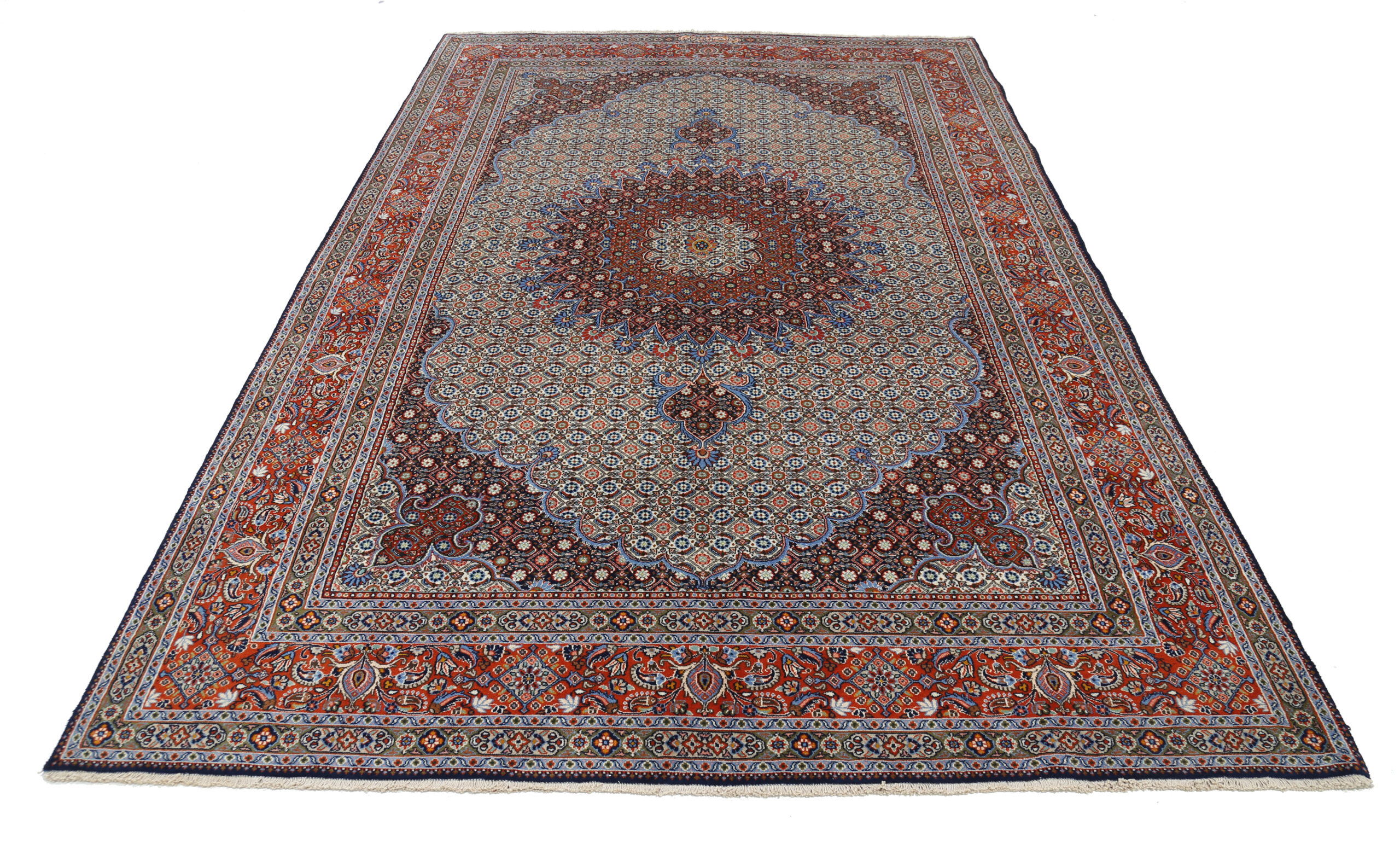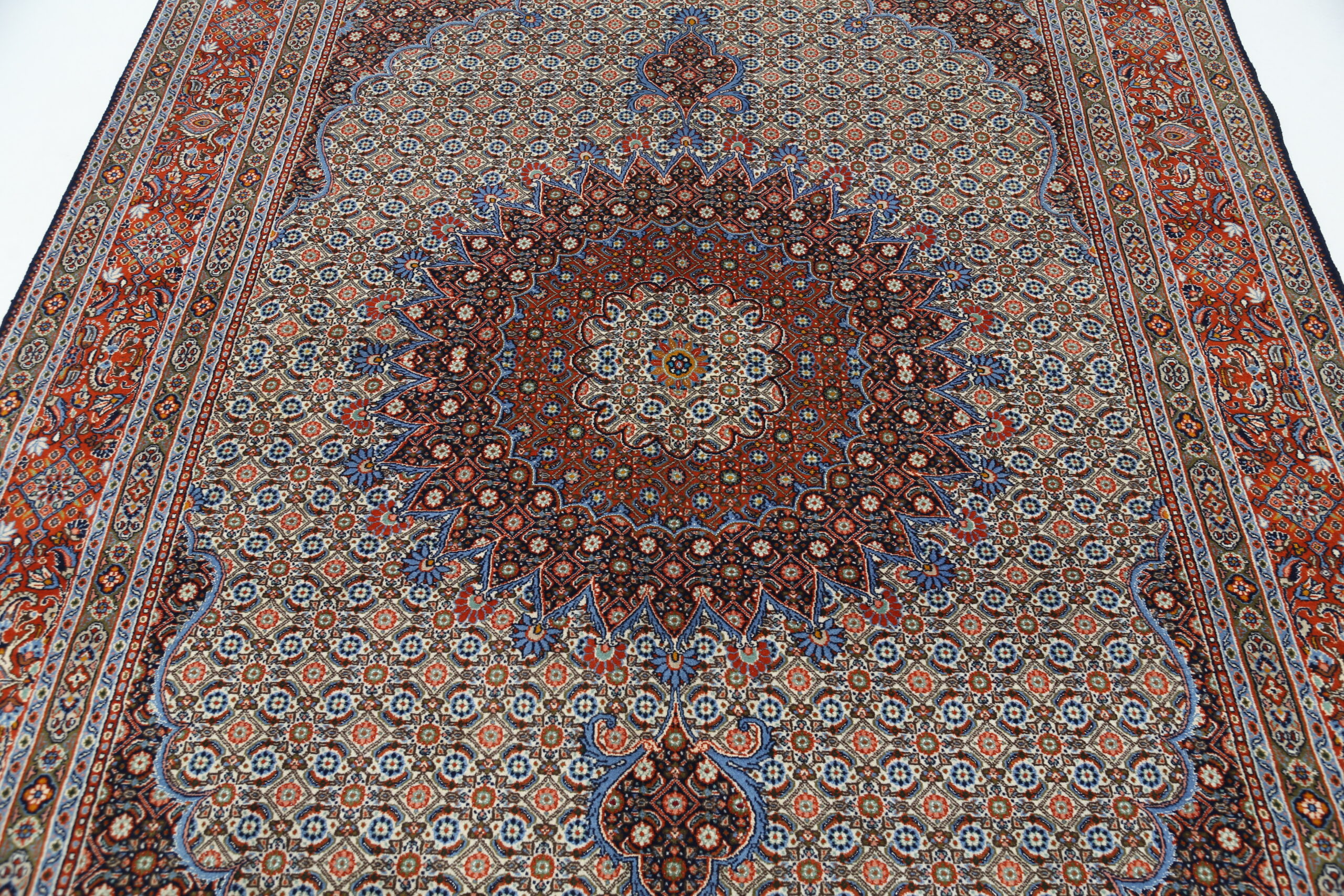 This Persian Moud rug features a beautiful rust color with blue, green, and orange accents. Made from 100% wool, it has a medium pile height of 1/3″-3/8″ and a knot density of approximately 324 KPSI. With its Herati design and beige background, this rug is perfect for adding warmth and style to any room. Measures 6’7″ x 10′.