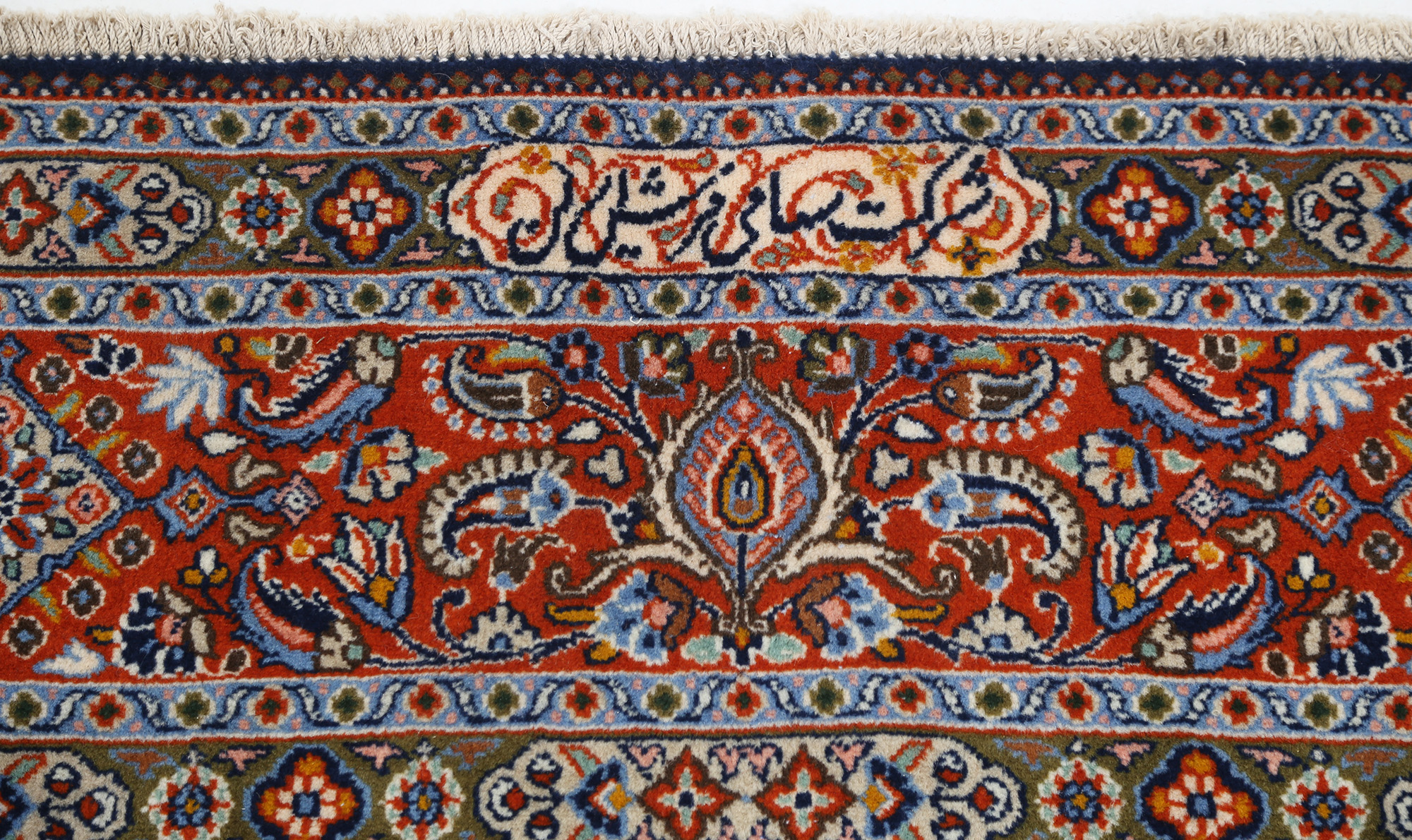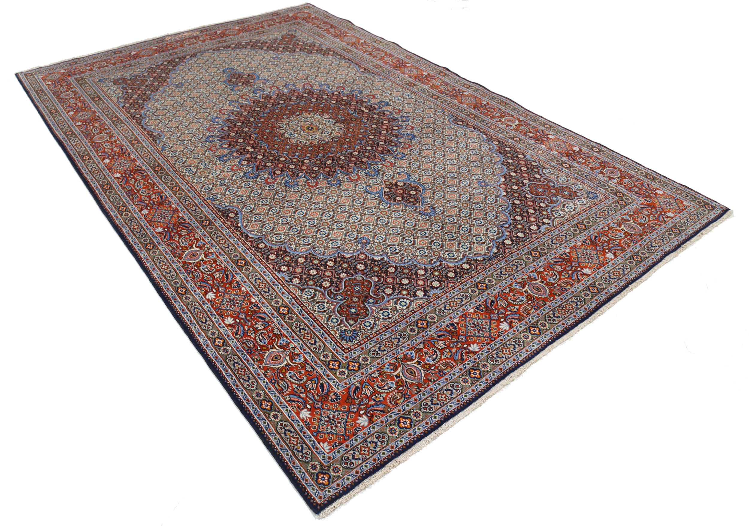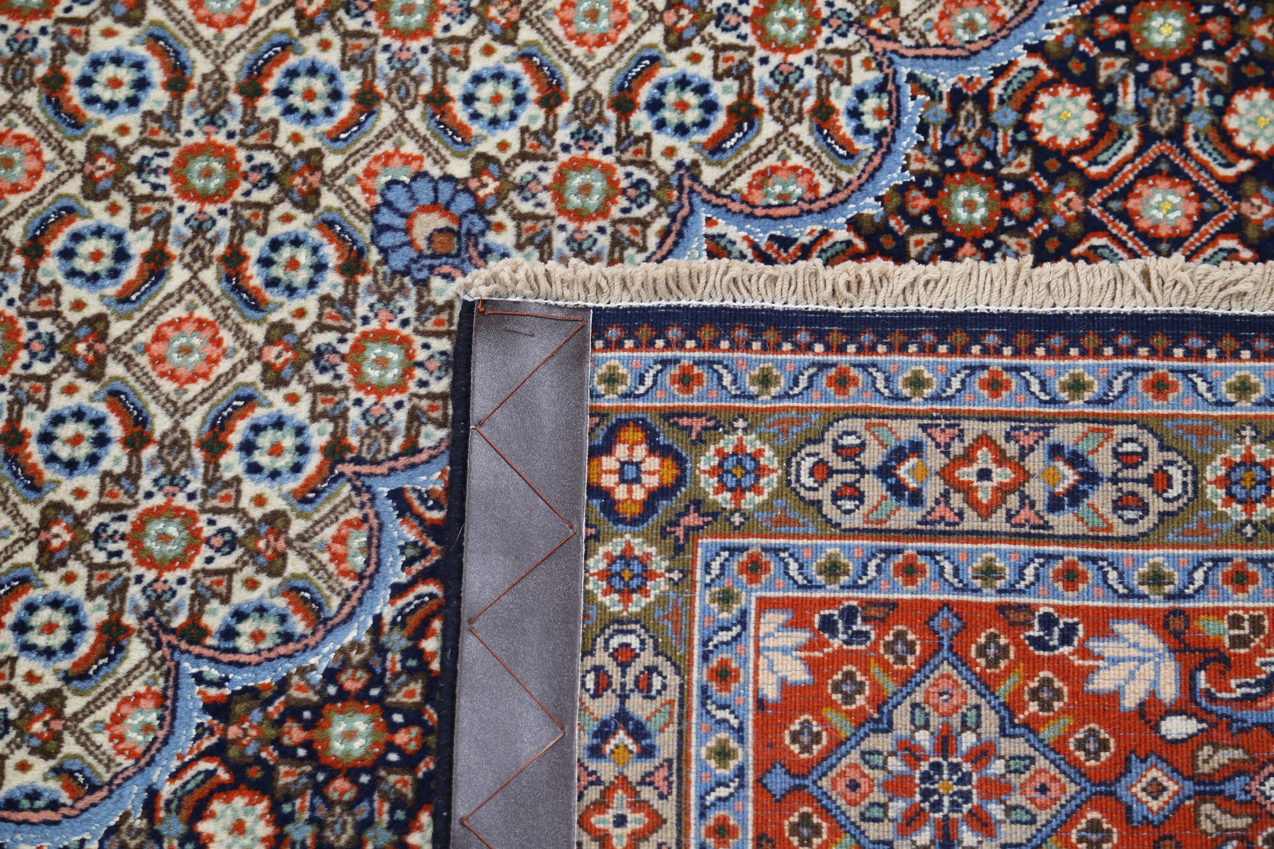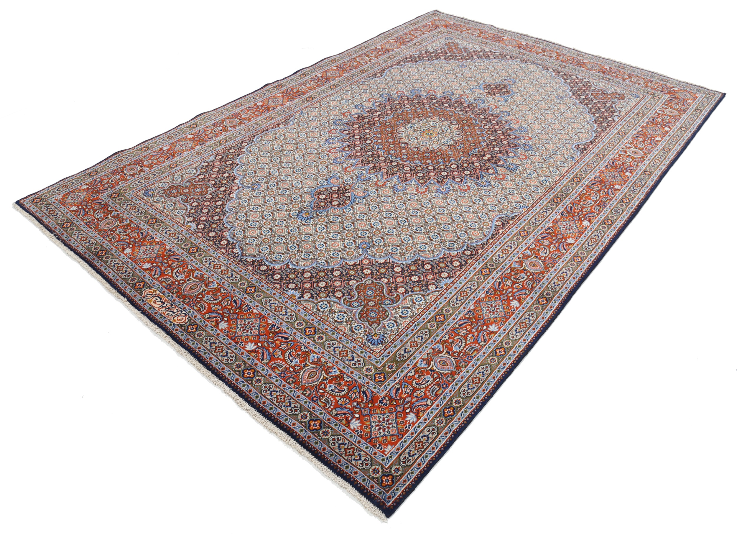 This Persian Moud rug features a beautiful rust color with blue, green, and orange accents. Made from 100% wool, it has a medium pile height of 1/3″-3/8″ and a knot density of approximately 324 KPSI. With its Herati design and beige background, this rug is perfect for adding warmth and style to any room. Measures 6’7″ x 10′.