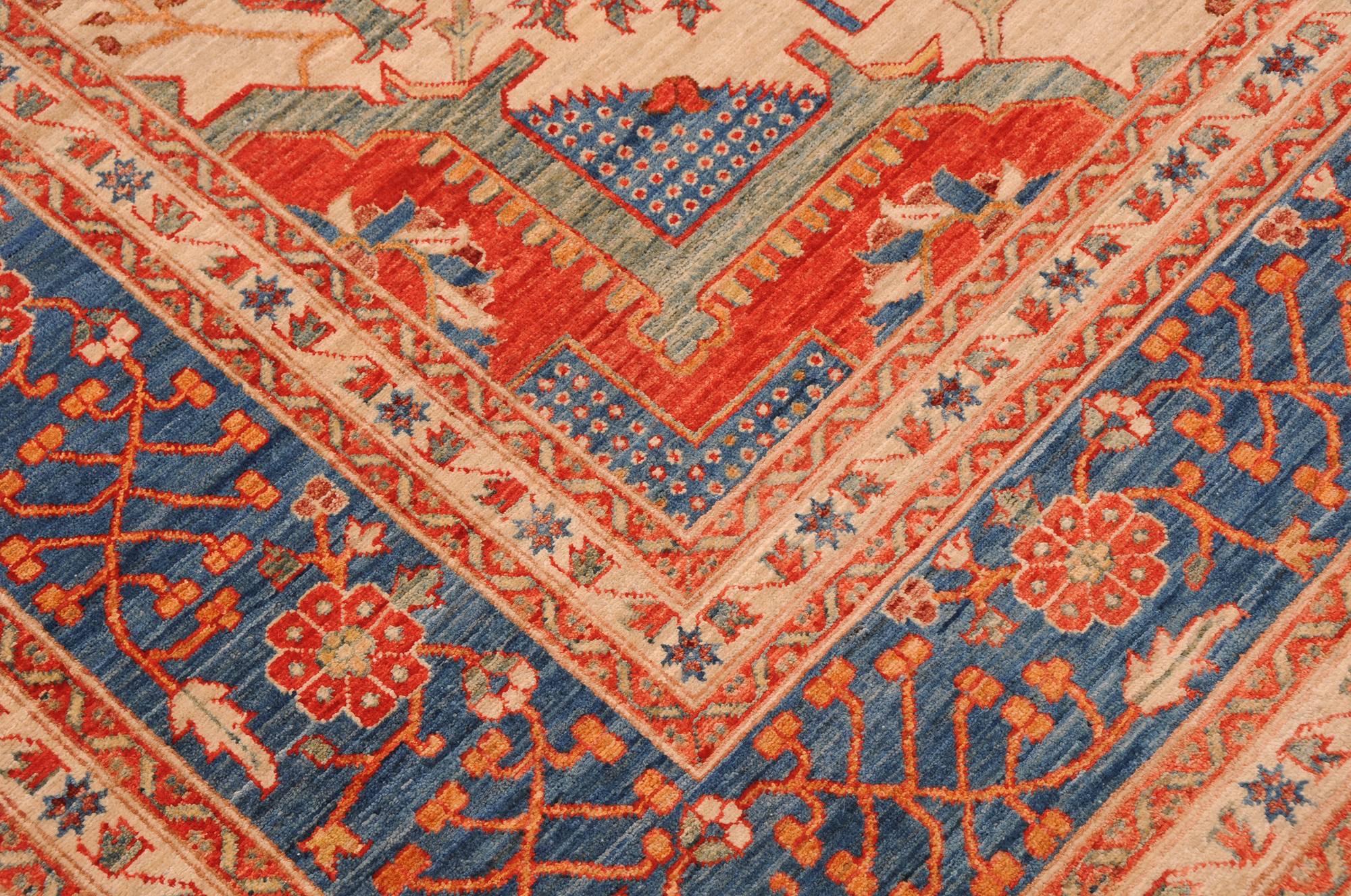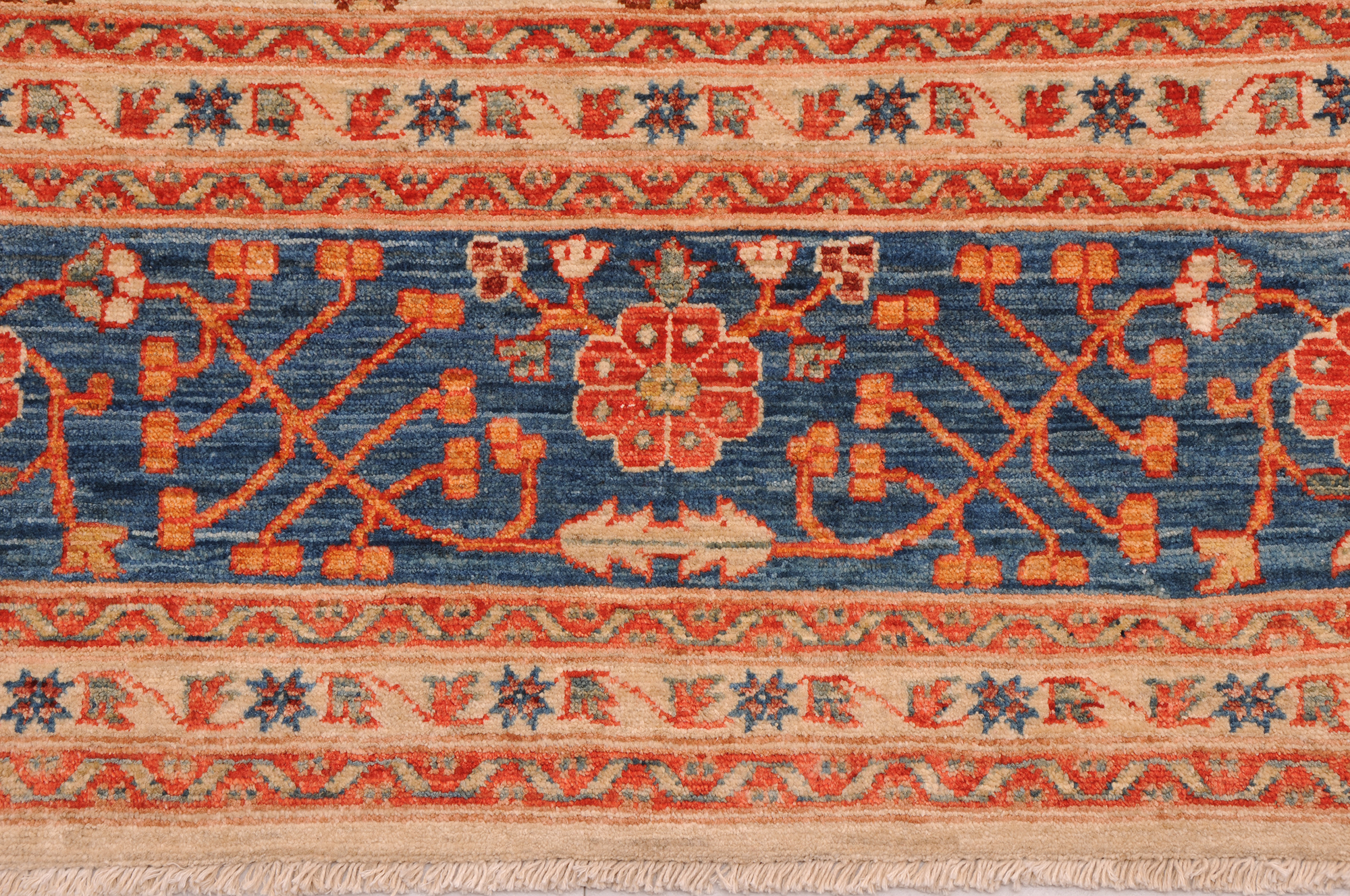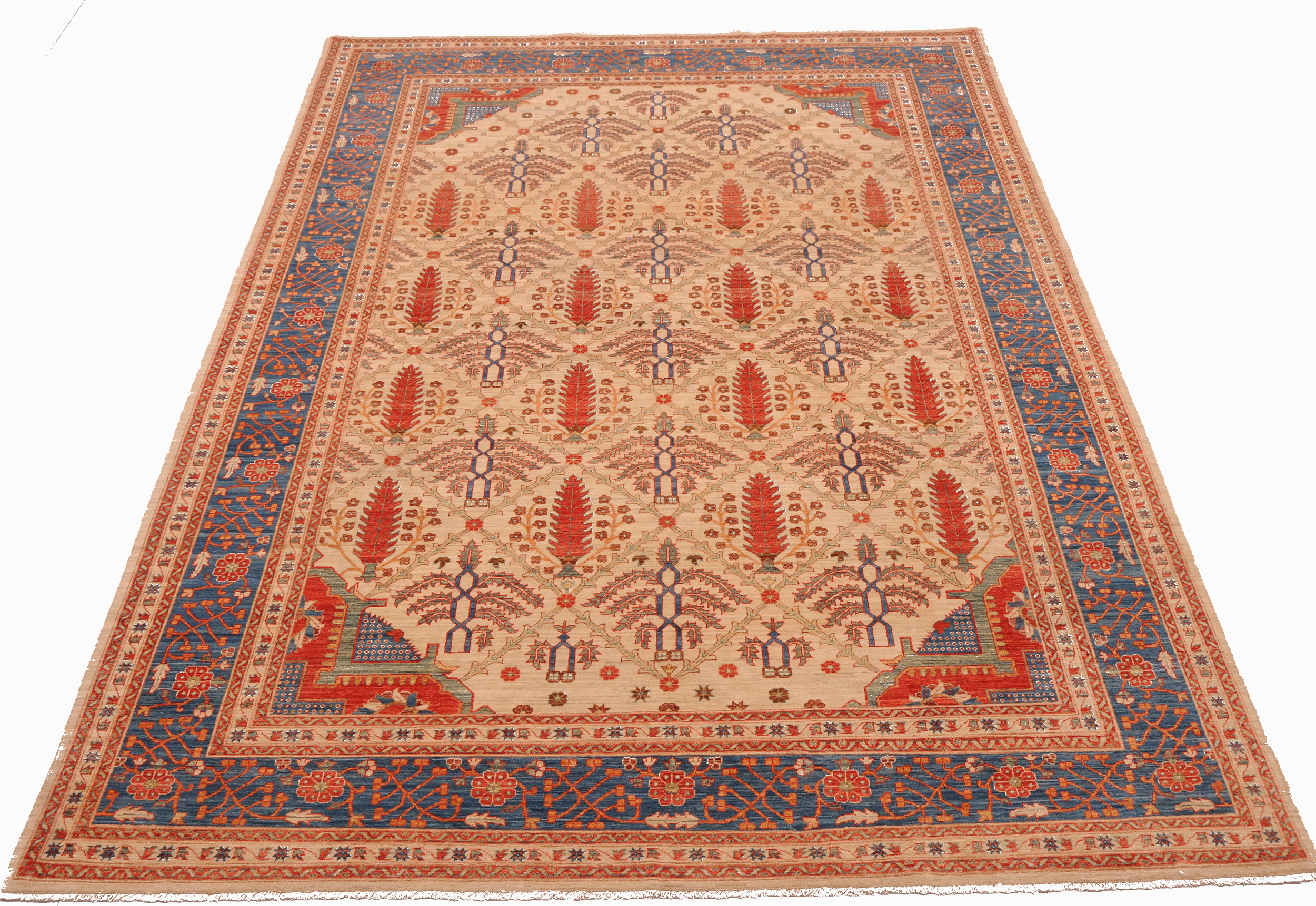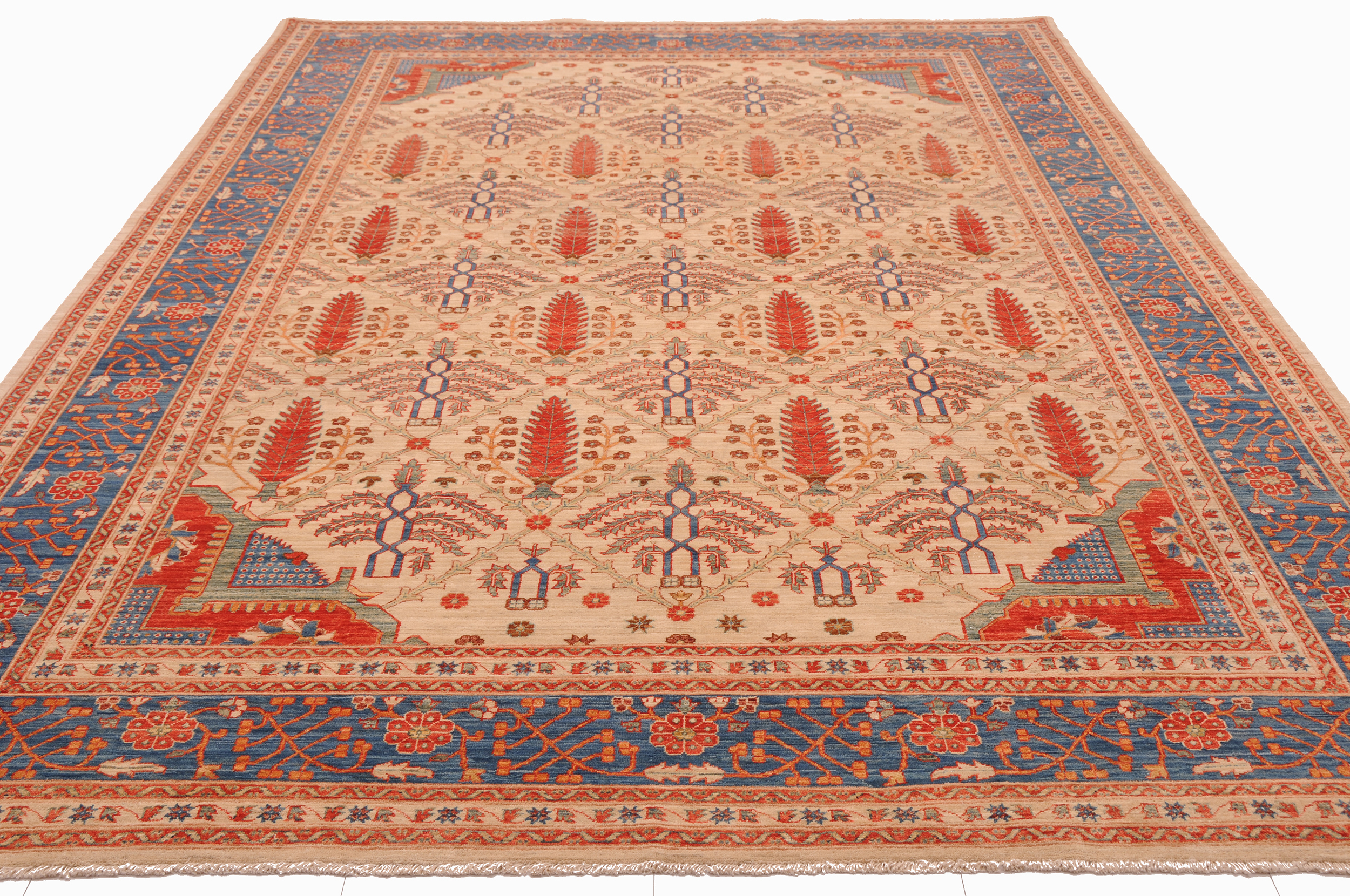 This Persian Rug is Hand Knotted with 100% Wool Pile and Cotton Foundation. This Rug has a Allover Design and its Main colors are Beige, Orange, and Blue.