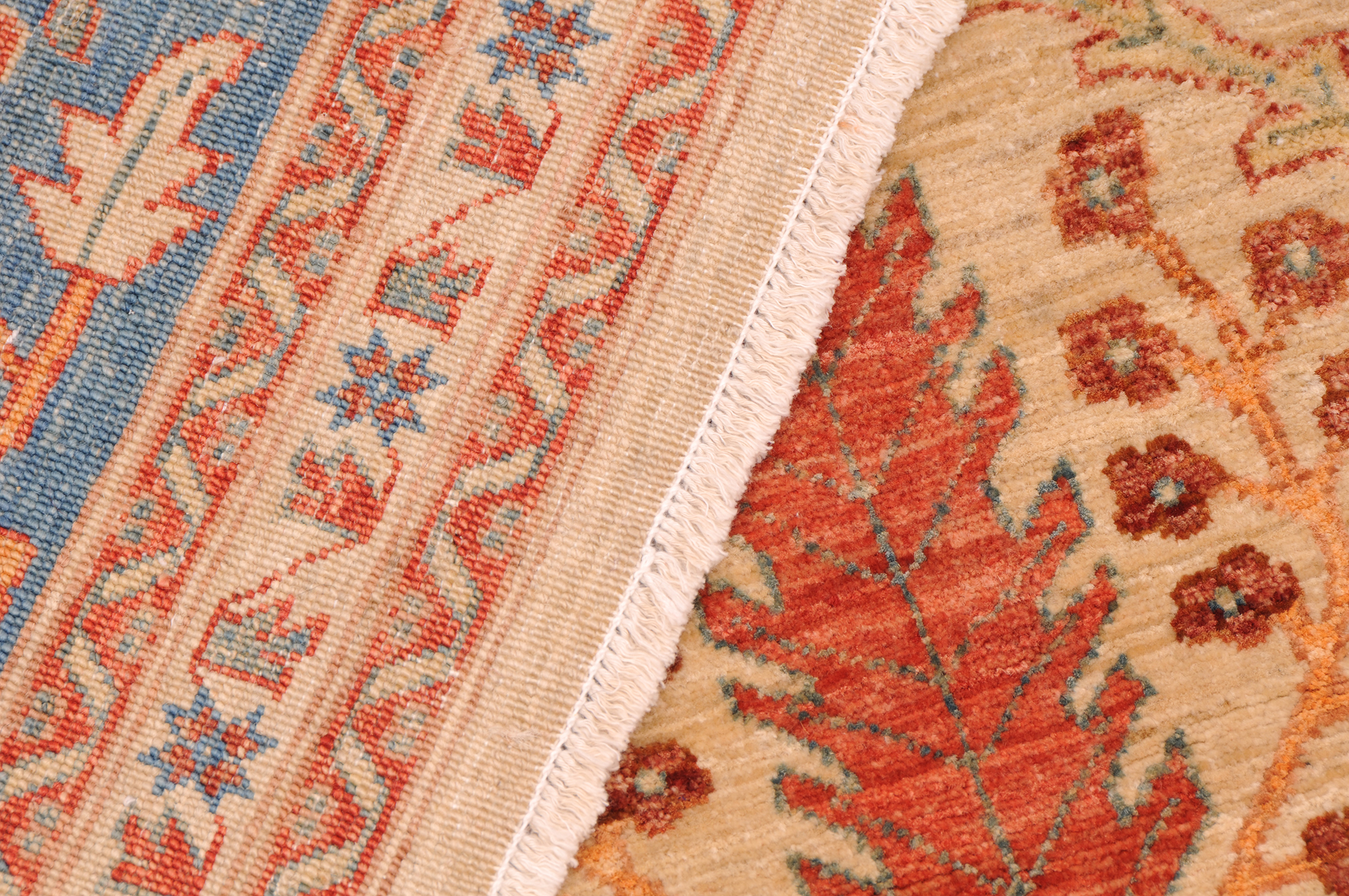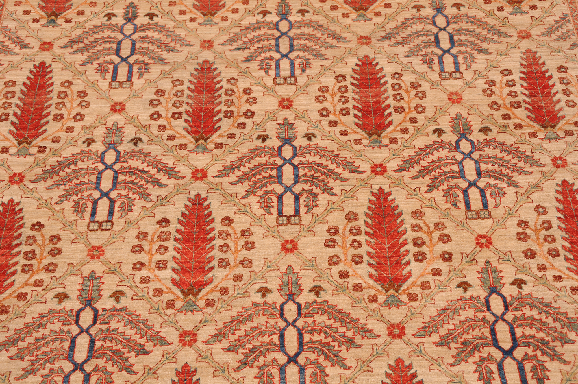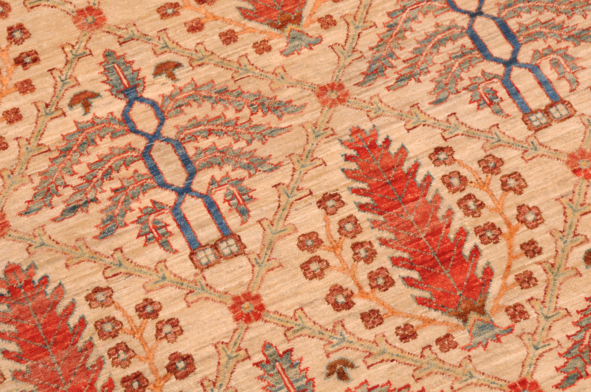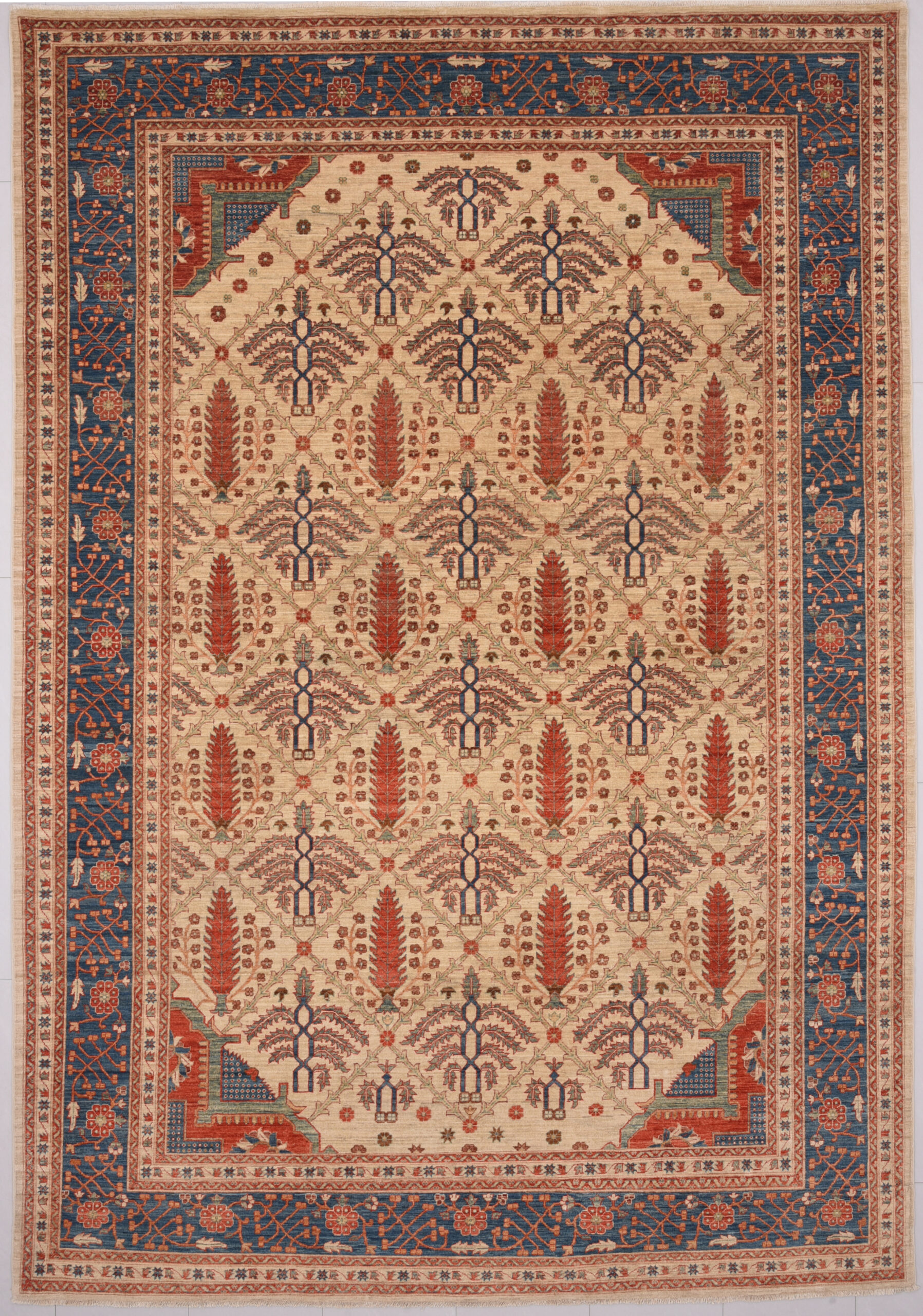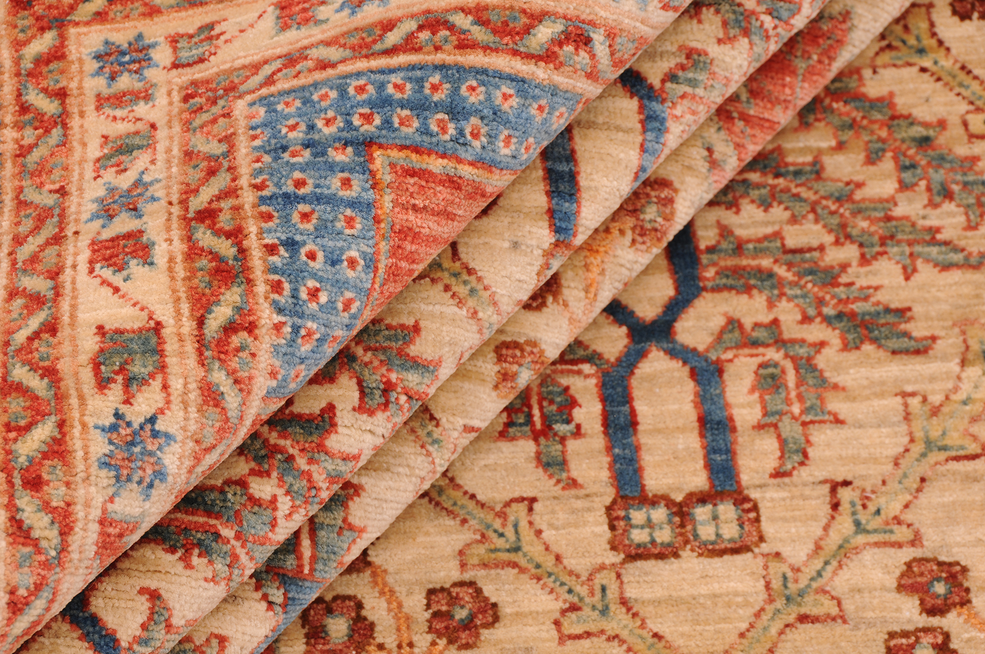 This Persian Rug is Hand Knotted with 100% Wool Pile and Cotton Foundation. This Rug has a Allover Design and its Main colors are Beige, Orange, and Blue.