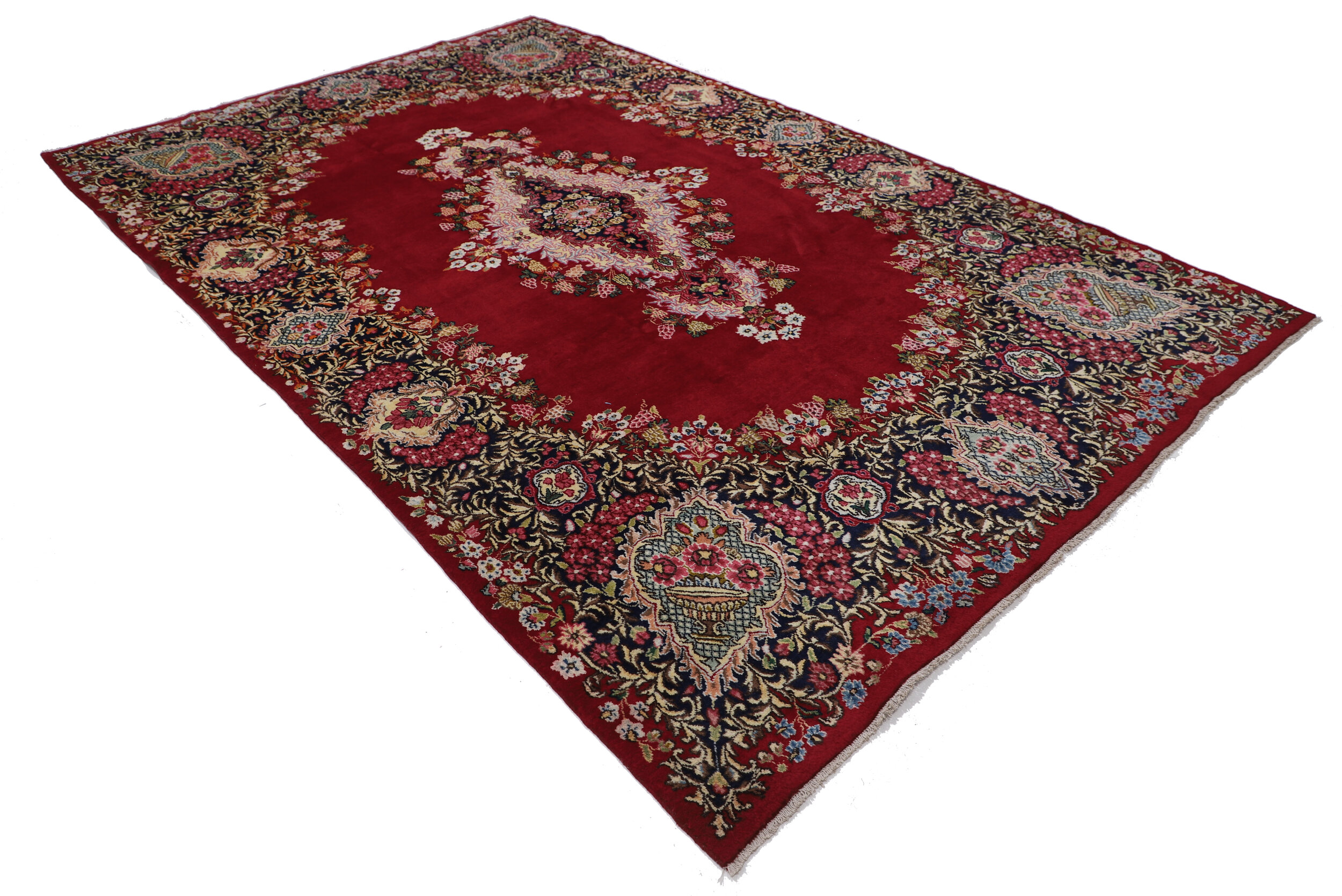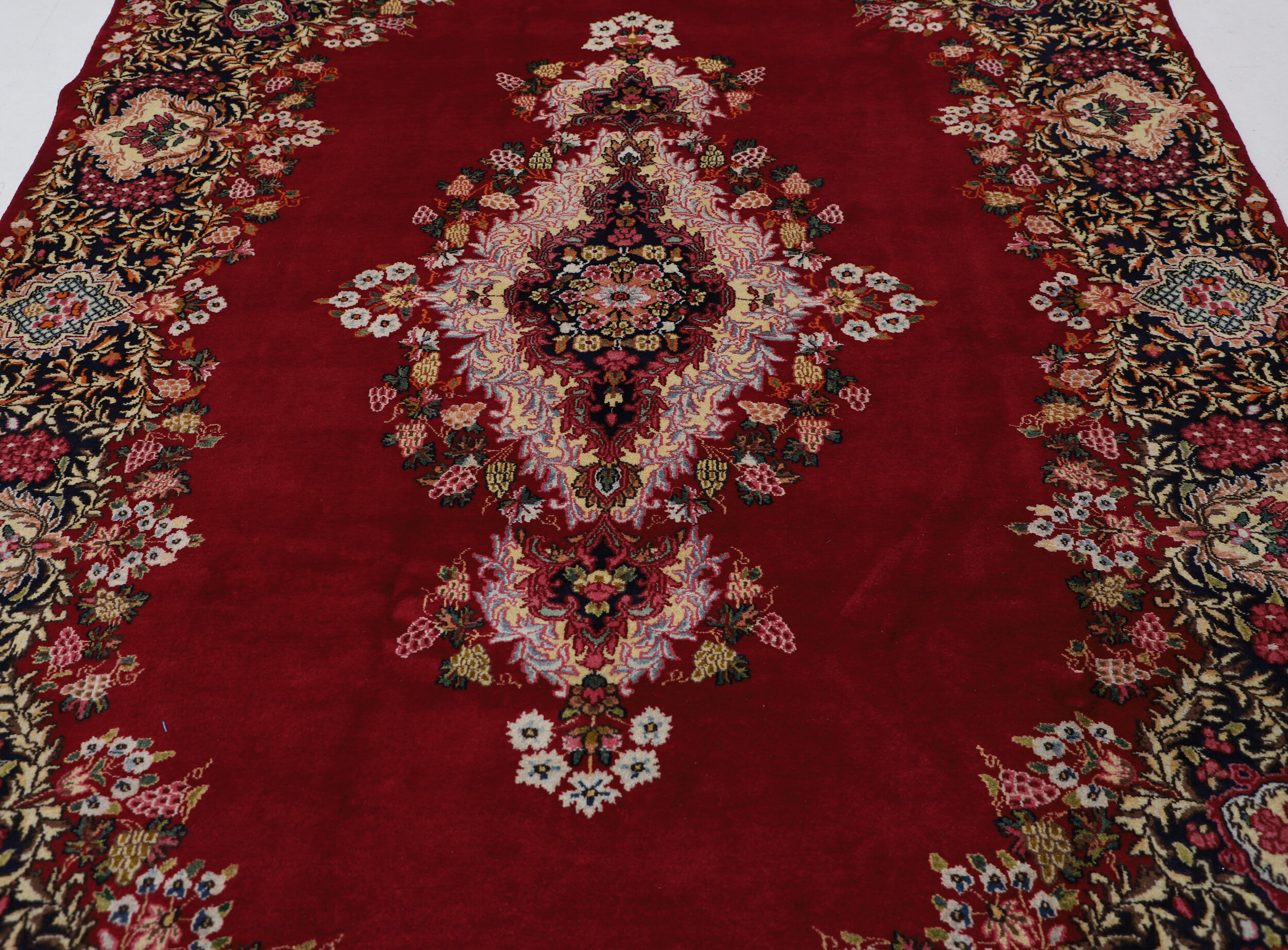 This 7′ x 11′ Kerman rug, hand-knotted in Persian, features a floral design. It is woven with Approx.289 KPS, showcasing a field in Red and a Blue border. The rug has a Medium Pile and a 100% Wool pile, and is in excellent condition.