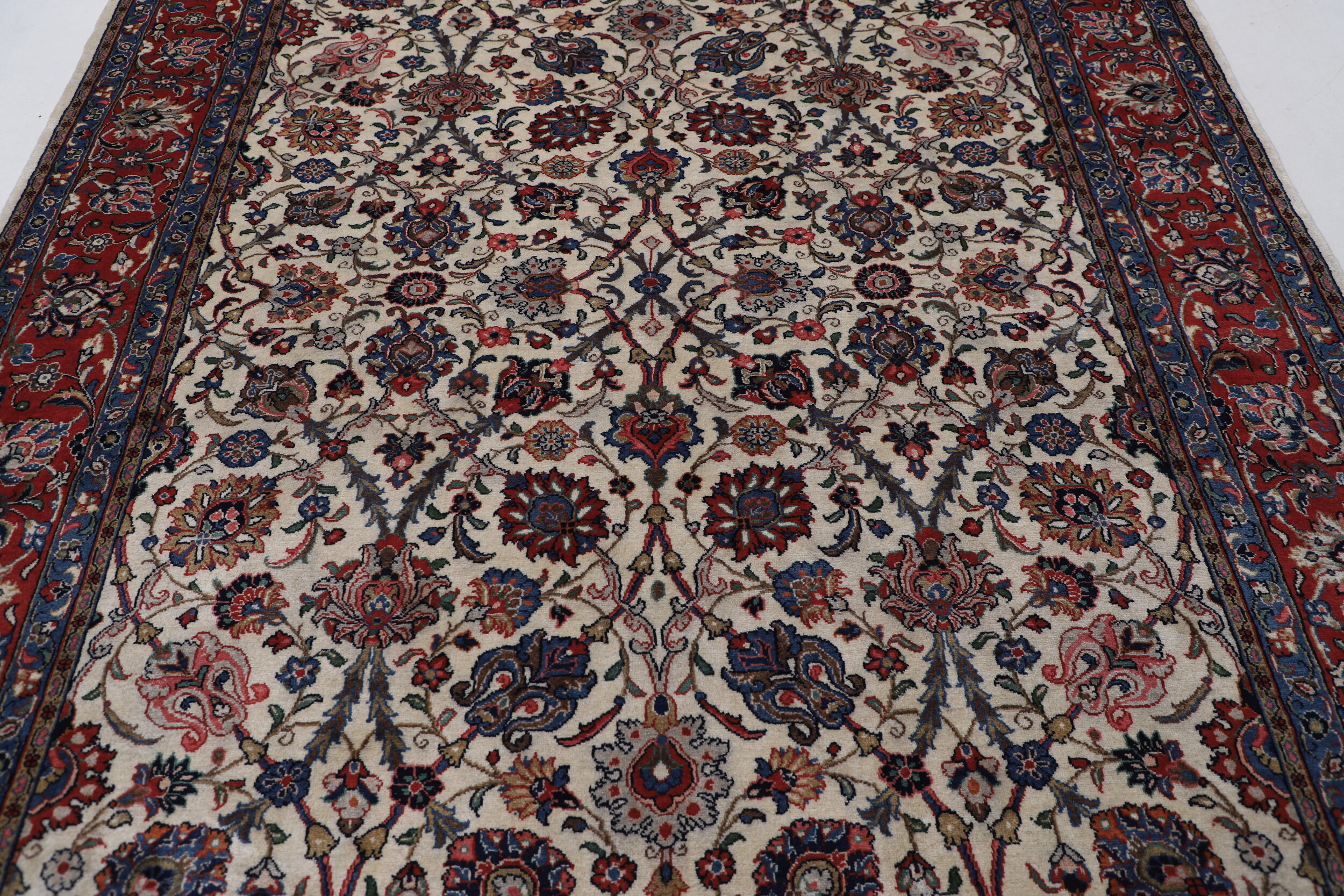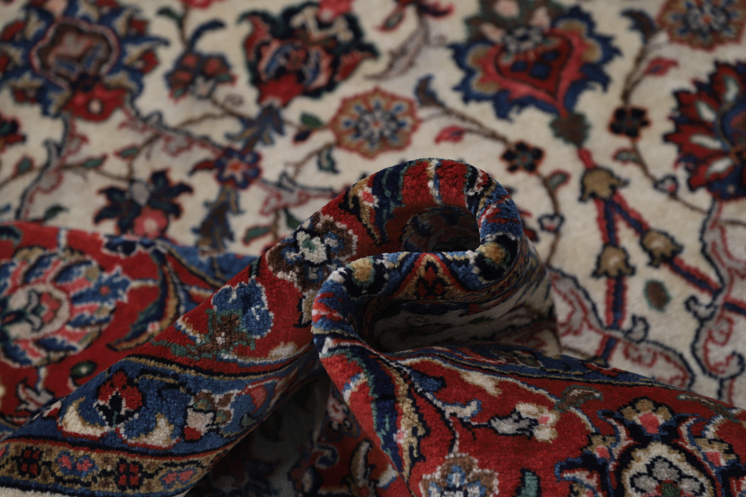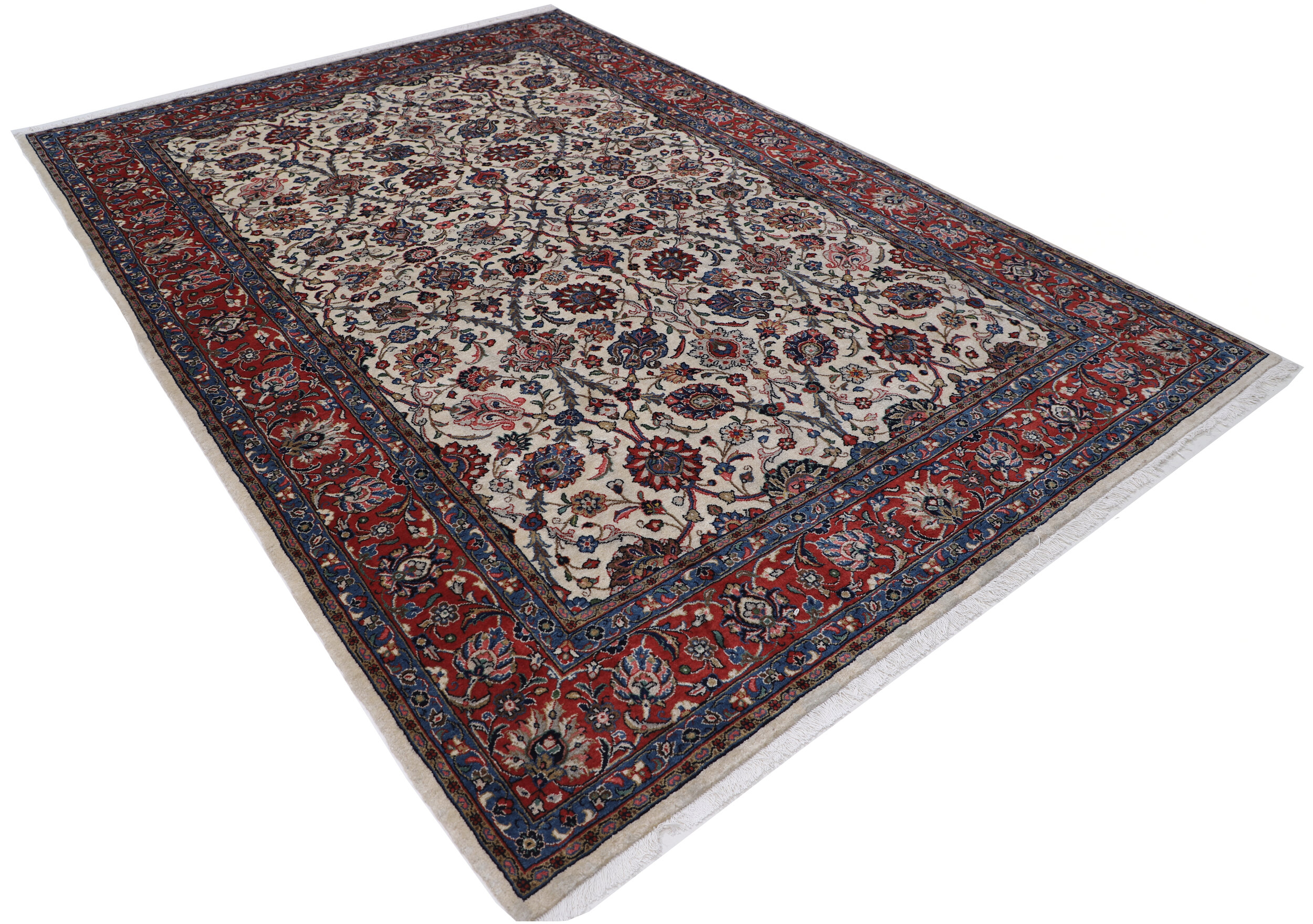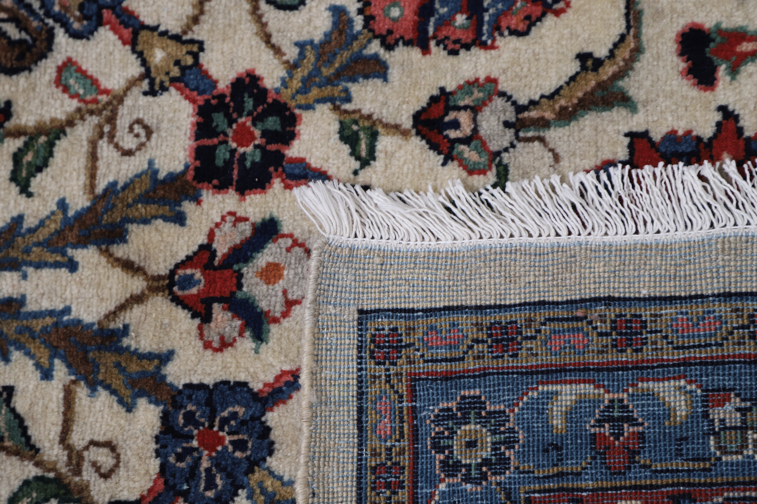 This Persian Rug is hand-knot with 100% Wool Pile and Cotton Foundation. This Rug has a Floral design, and its Main Colors are Blue, Beige, Red, Brown, and Peach.