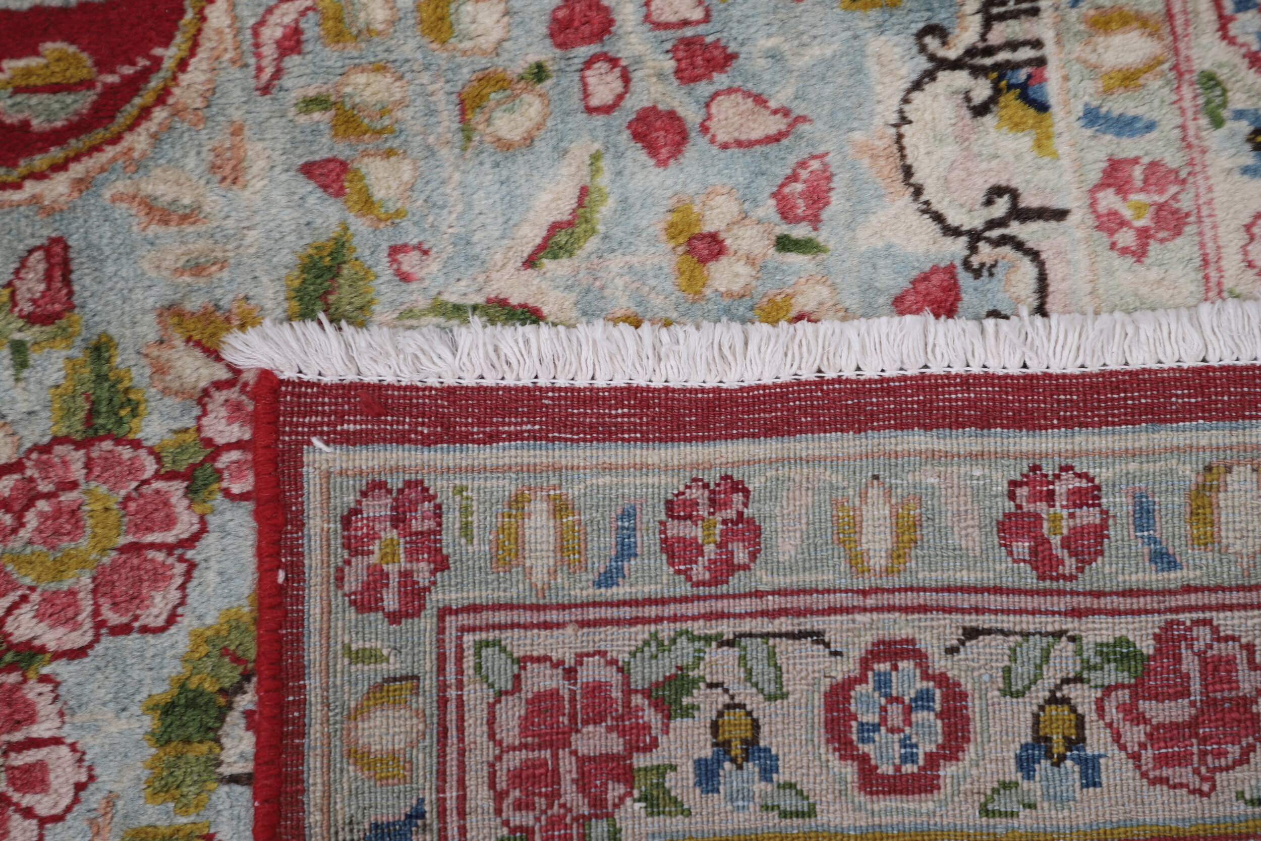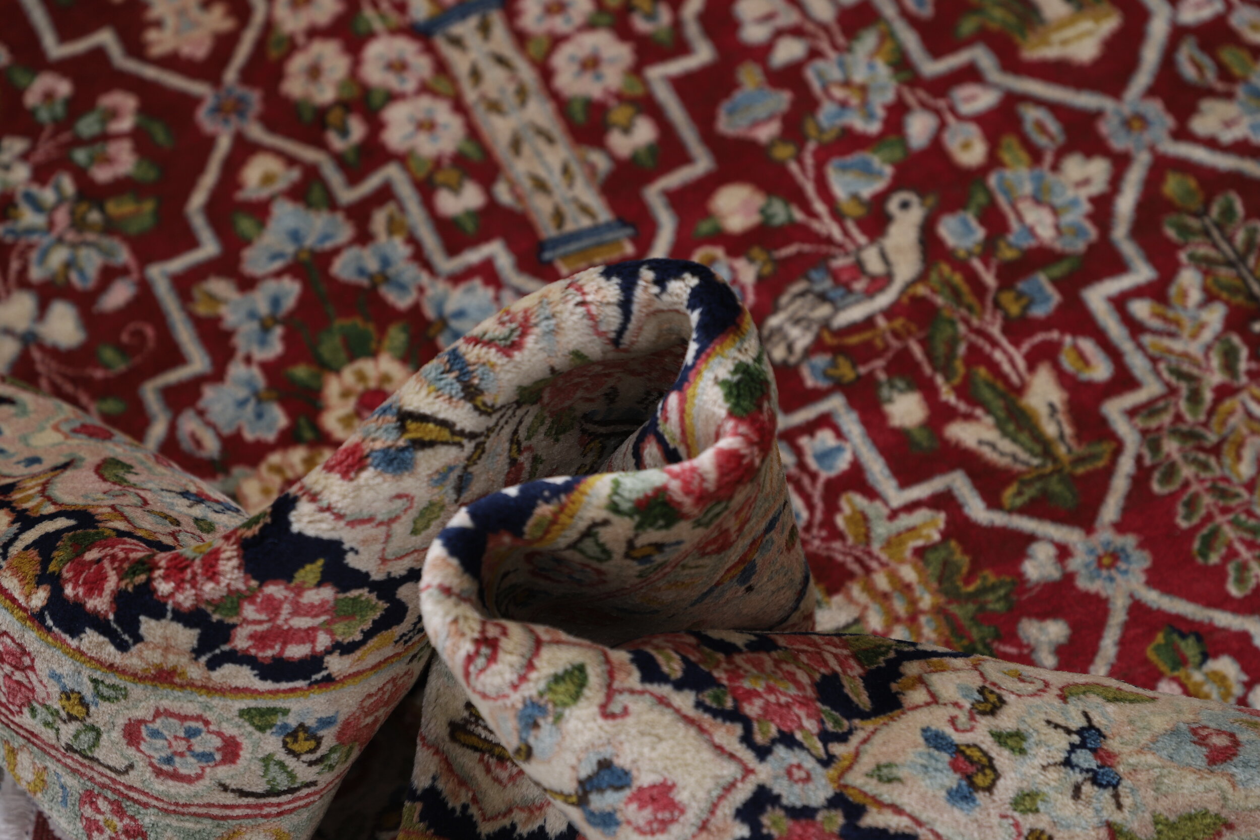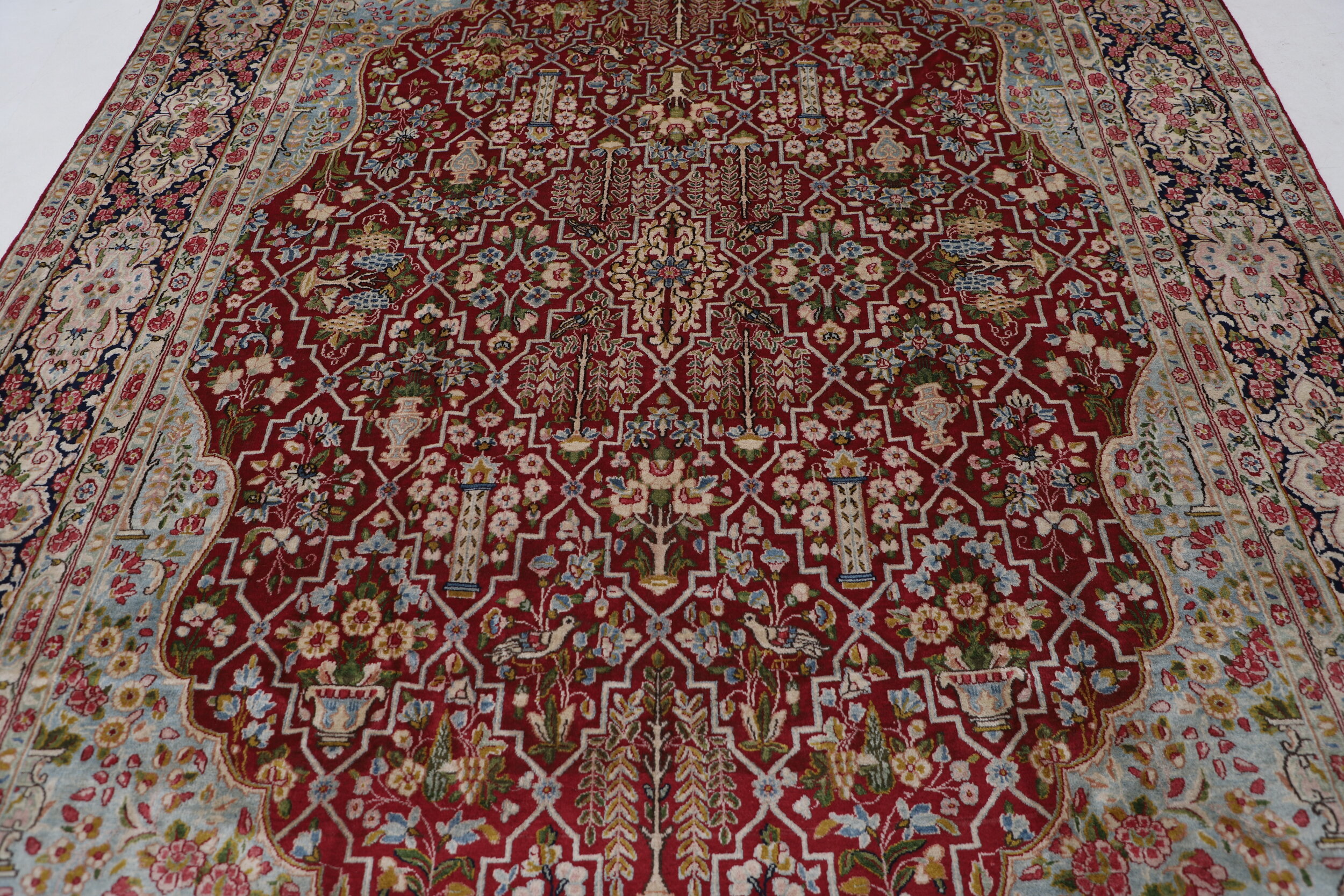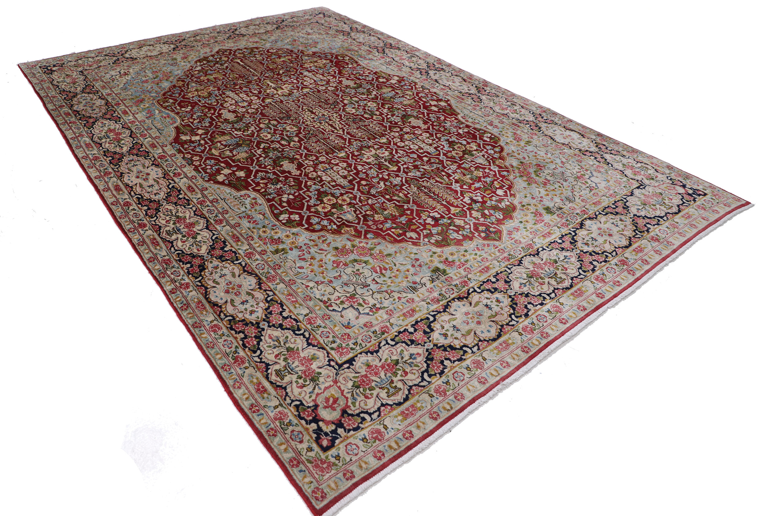 This 7’10” x 11’10” Kerman rug, hand-knotted in Persian, features a floral design. It is woven with Approx.289 KPS, showcasing a field in Red and a Blue border. The rug has a Medium Pile and a 100% Wool pile, and is in excellent condition.